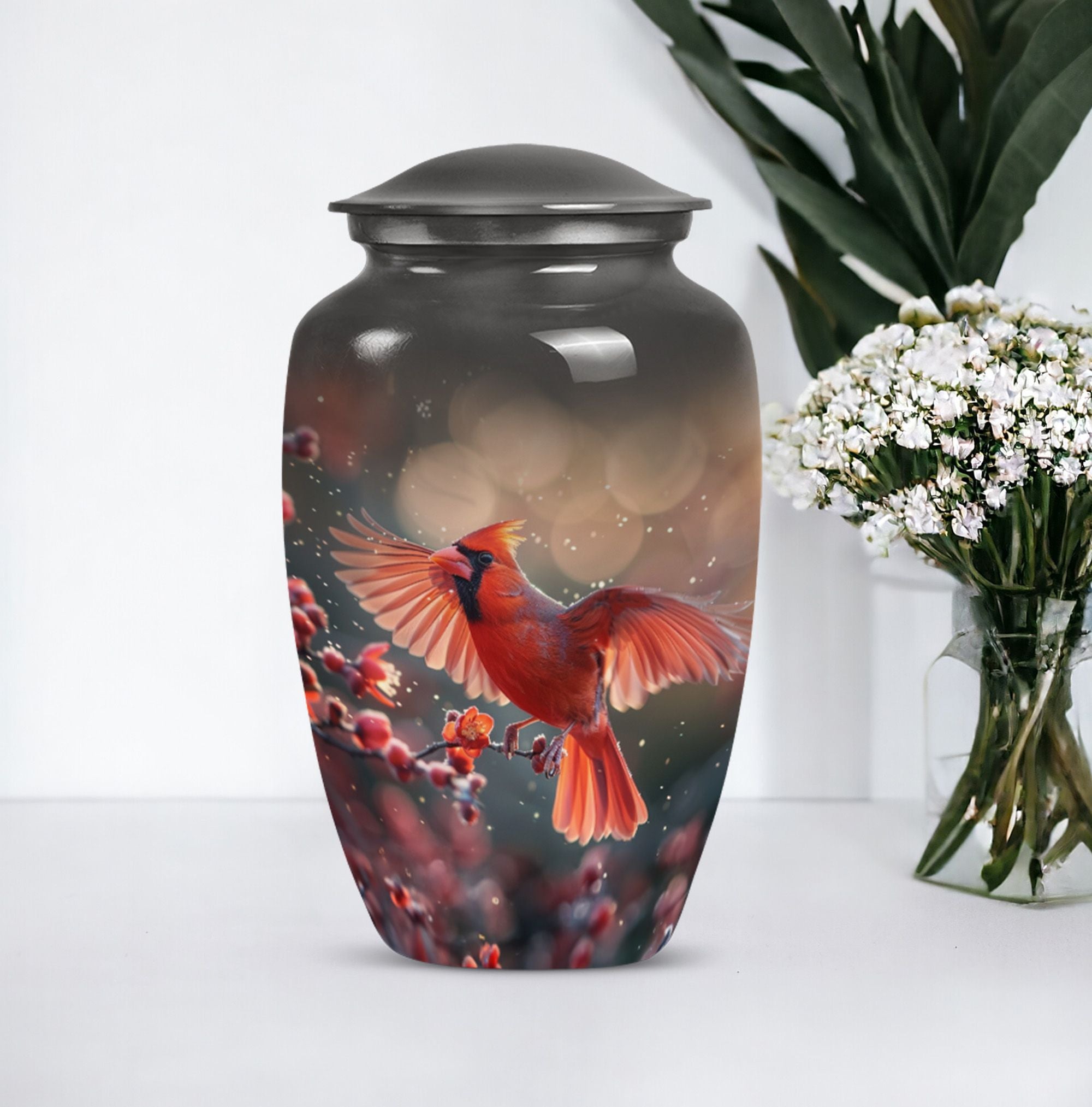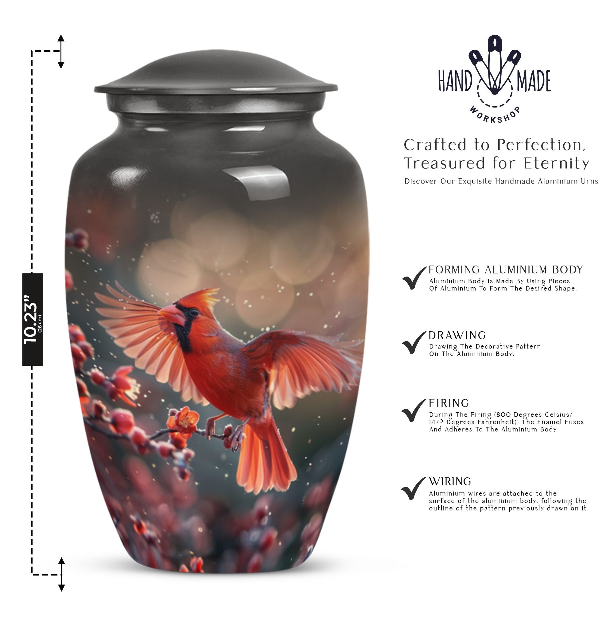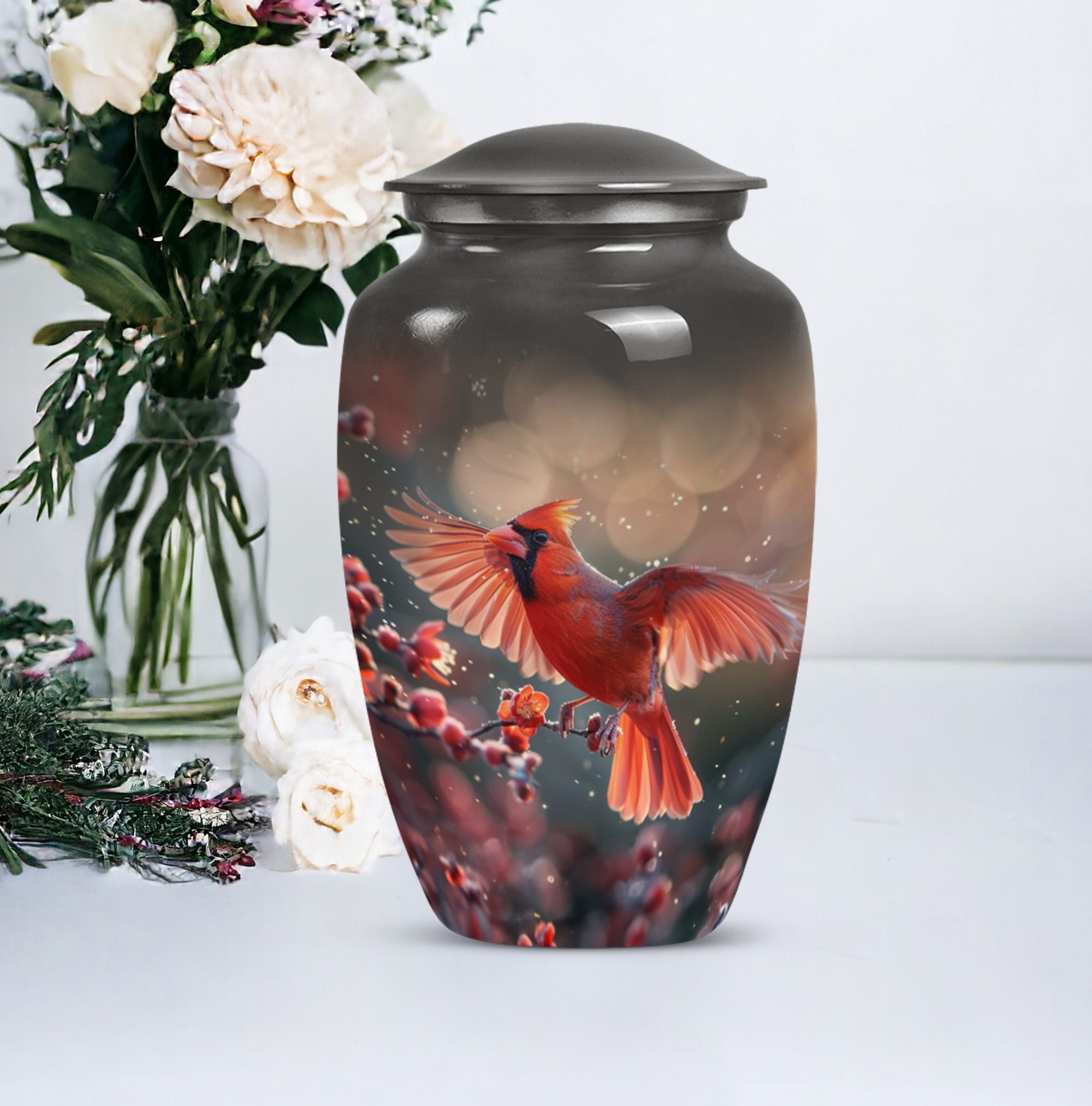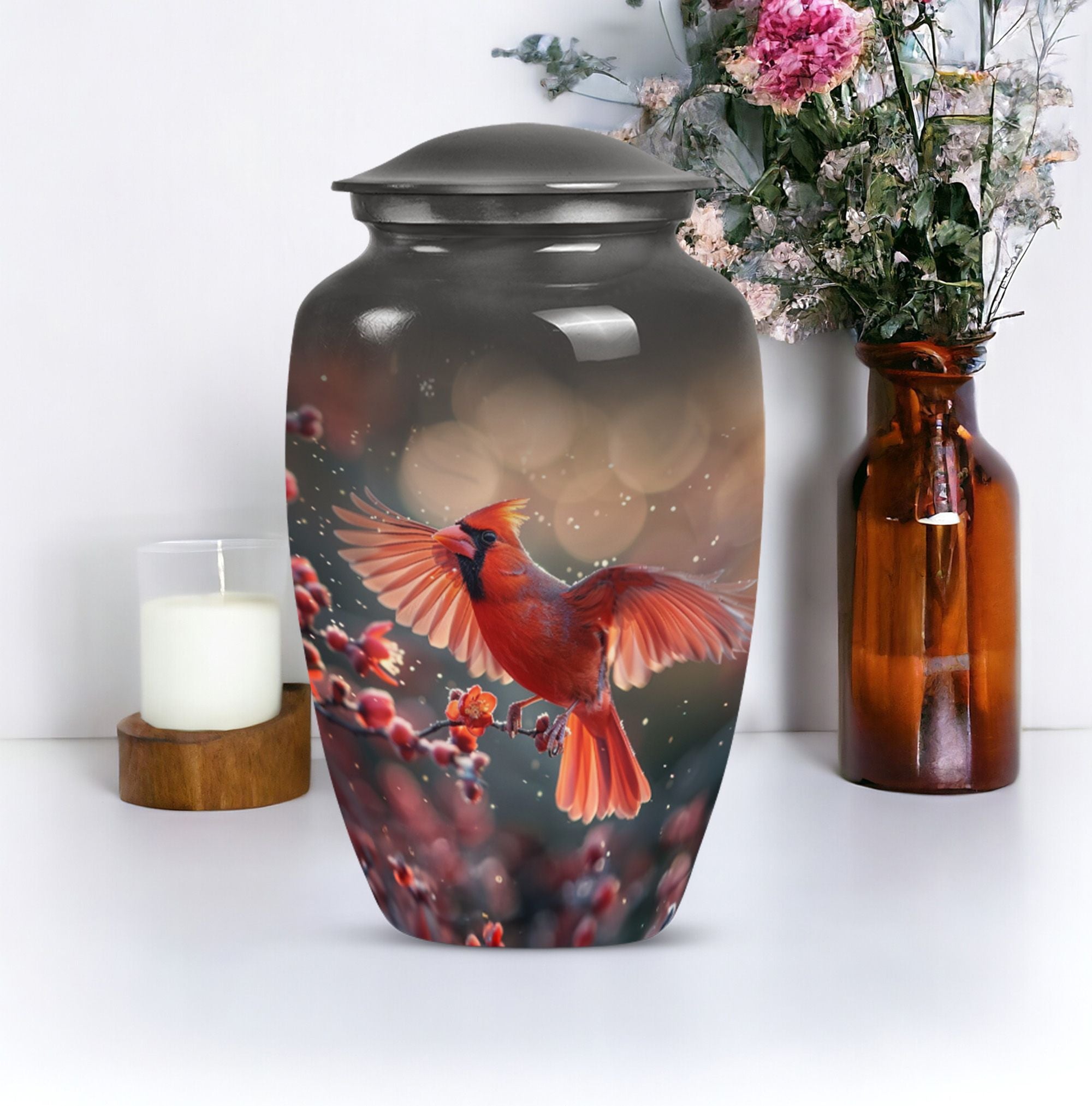 Immerse yourself in the tranquility and peace of the Cardinal Bird Urn, a perfect tribute to your beloved. Skilled craftsmanship in aluminium creates a dignified final resting place for cremation ashes, beautifully interpreted through a rich abstract theme. With the dramatic capacity of 200 cubic inches, this burial urn caters to adult human ashes, admitting a large volume yet maintaining a compact stature of 10 inches. Carrying a weight of 3.3 pounds, each piece comes with a velvet pouch to confidentially safeguard the ashes inside. The urn affords scope for personalization, proudly bearing engraved names to perpetuate memories. The Cardinal Bird Urn is not merely a cremation urn; it's a symbol of homage and love. Despite its timeless grace, it remains firmly entrenched in a modern context. Packed within its sleek form lies an ever-present reminder of your undying love. Heartfelt yet understated, it represents the perfect blend of form and function for your memorial ceremony supplies.