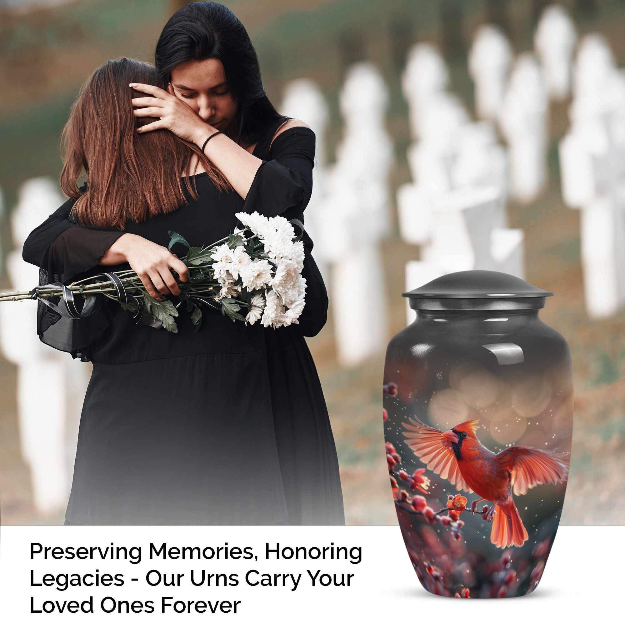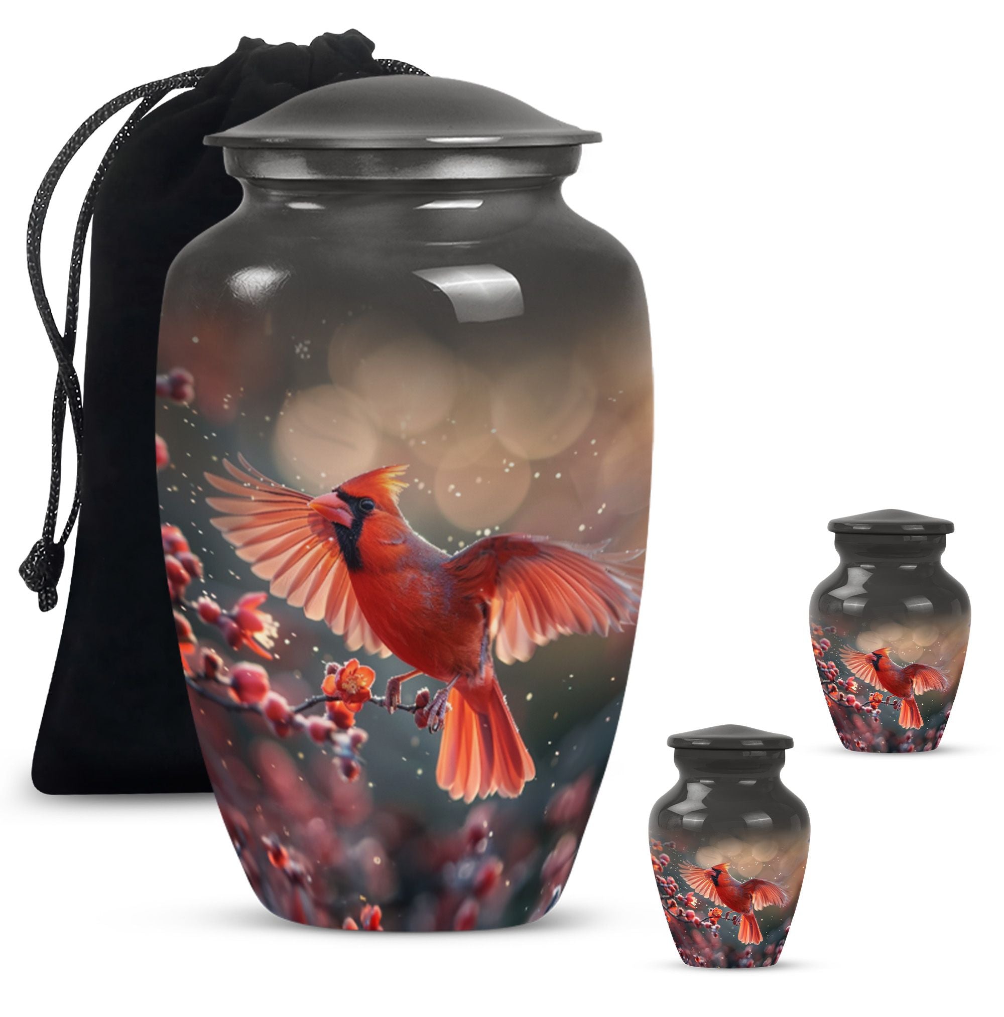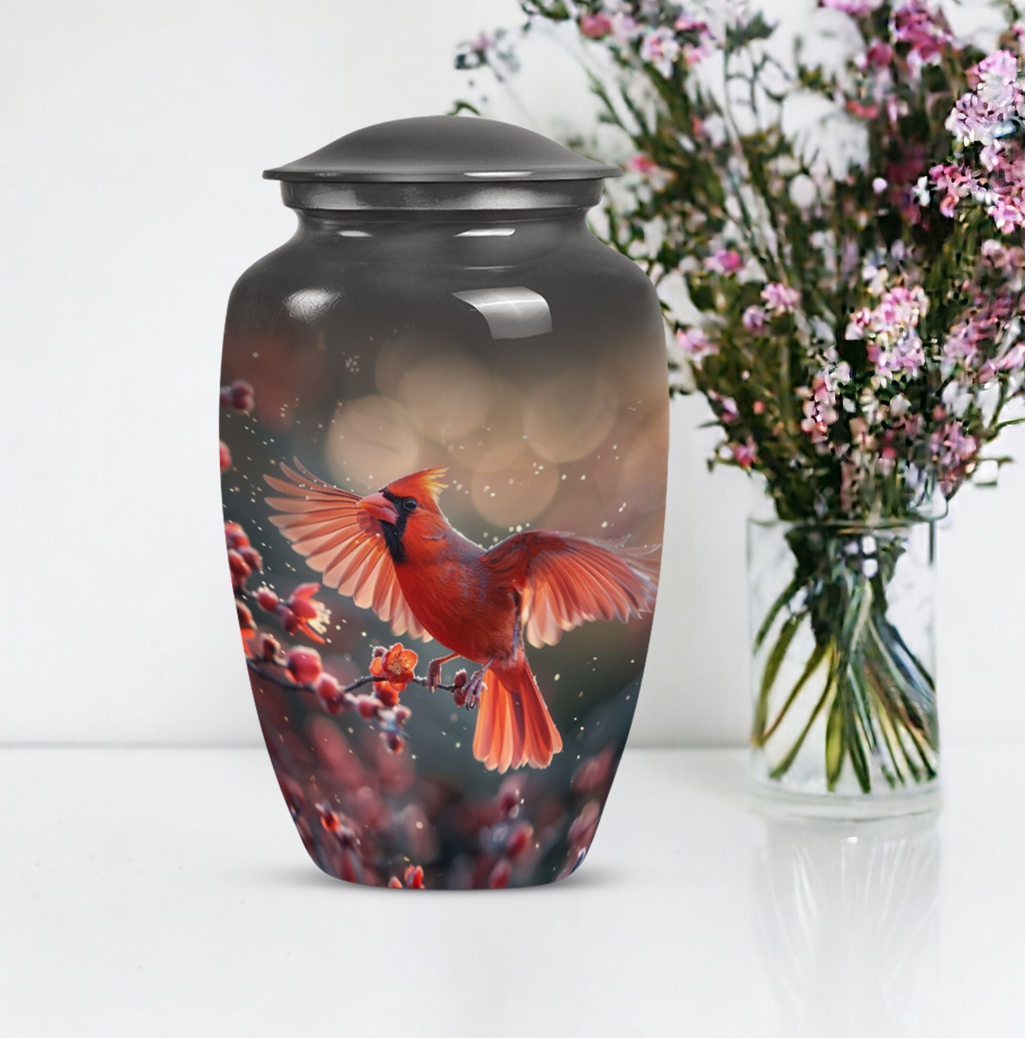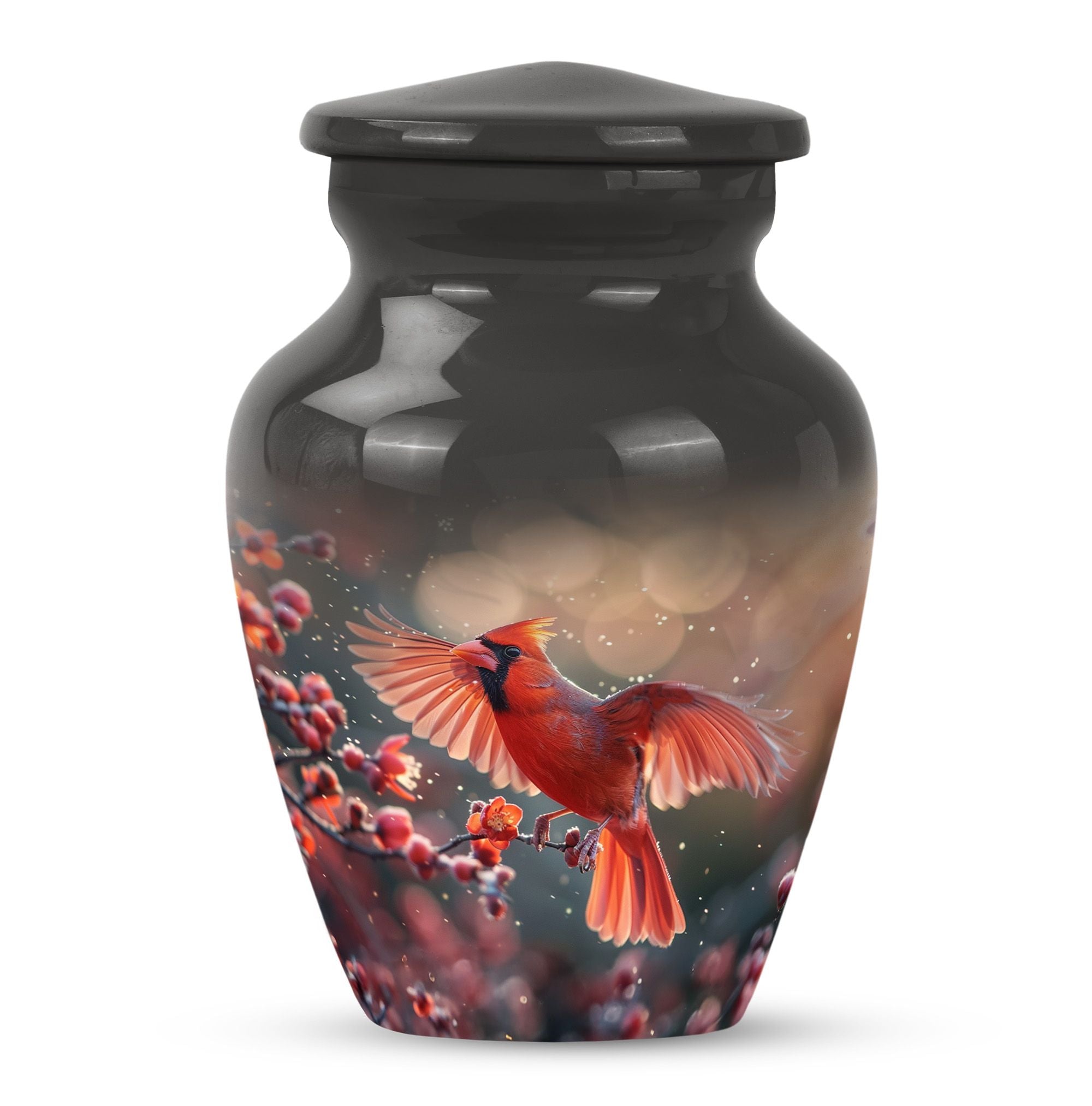 Immerse yourself in the tranquility and peace of the Cardinal Bird Urn, a perfect tribute to your beloved. Skilled craftsmanship in aluminium creates a dignified final resting place for cremation ashes, beautifully interpreted through a rich abstract theme. With the dramatic capacity of 200 cubic inches, this burial urn caters to adult human ashes, admitting a large volume yet maintaining a compact stature of 10 inches. Carrying a weight of 3.3 pounds, each piece comes with a velvet pouch to confidentially safeguard the ashes inside. The urn affords scope for personalization, proudly bearing engraved names to perpetuate memories. The Cardinal Bird Urn is not merely a cremation urn; it's a symbol of homage and love. Despite its timeless grace, it remains firmly entrenched in a modern context. Packed within its sleek form lies an ever-present reminder of your undying love. Heartfelt yet understated, it represents the perfect blend of form and function for your memorial ceremony supplies.