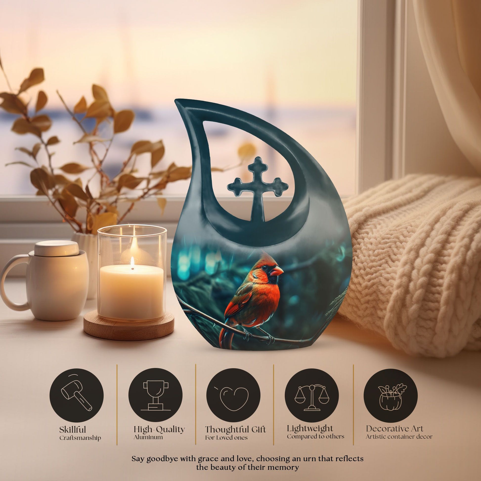 Expertly crafted from durable aluminium, this funeral urn – memorial urn features a detailed red cardinal design perched on soft floral patterns against a soothing background. Its craftsmanship combines strength and elegance, making it ideal for urns for human ashes male or as an adult female urn. The secure screw-top lid ensures ashes remain safe, while its timeless beauty makes it suitable for home memorials, display, or burial.