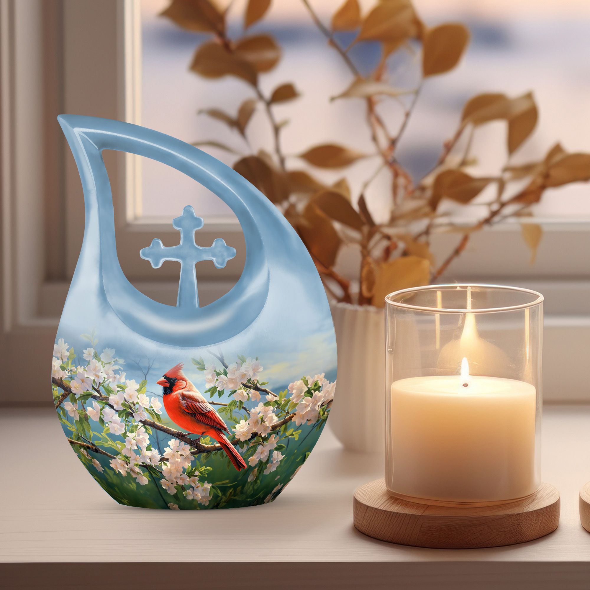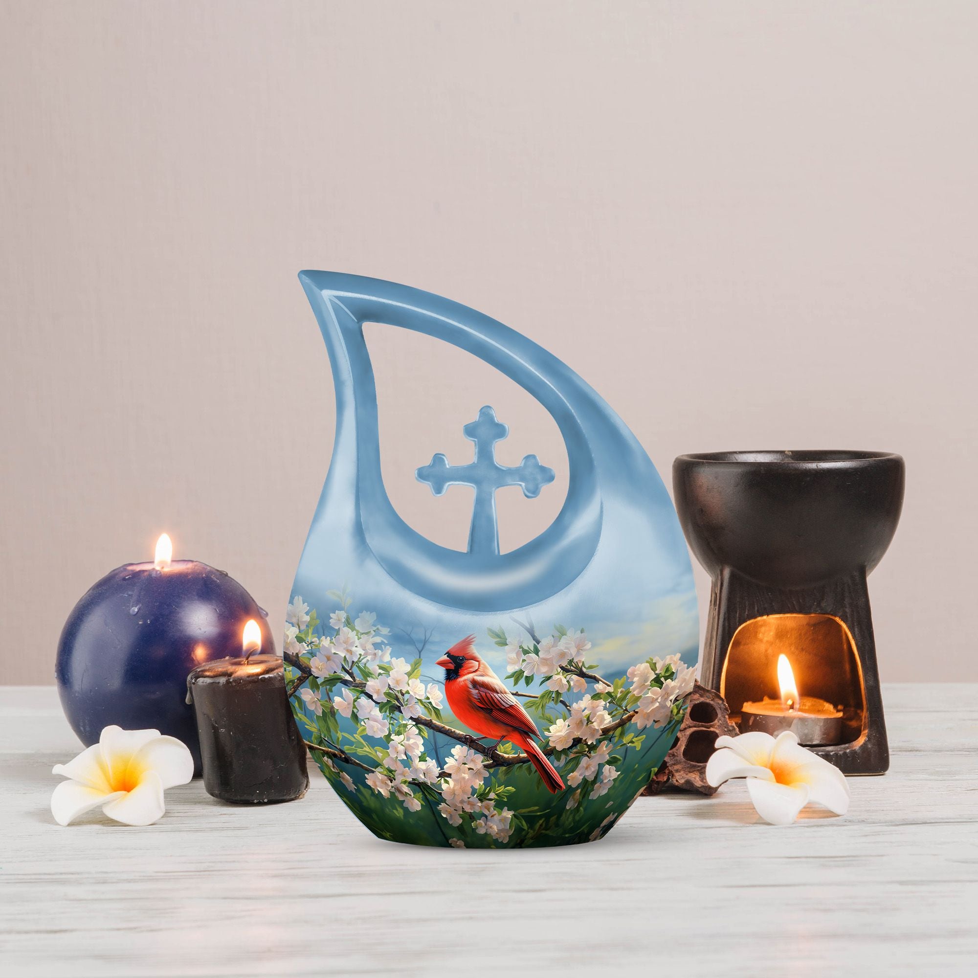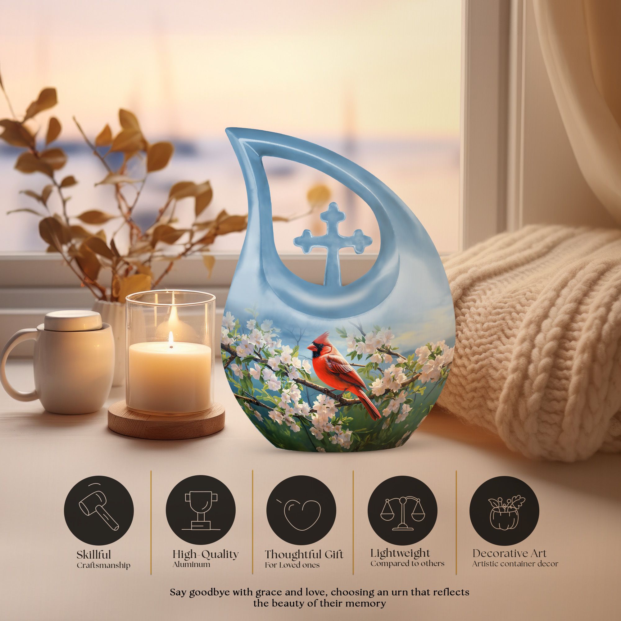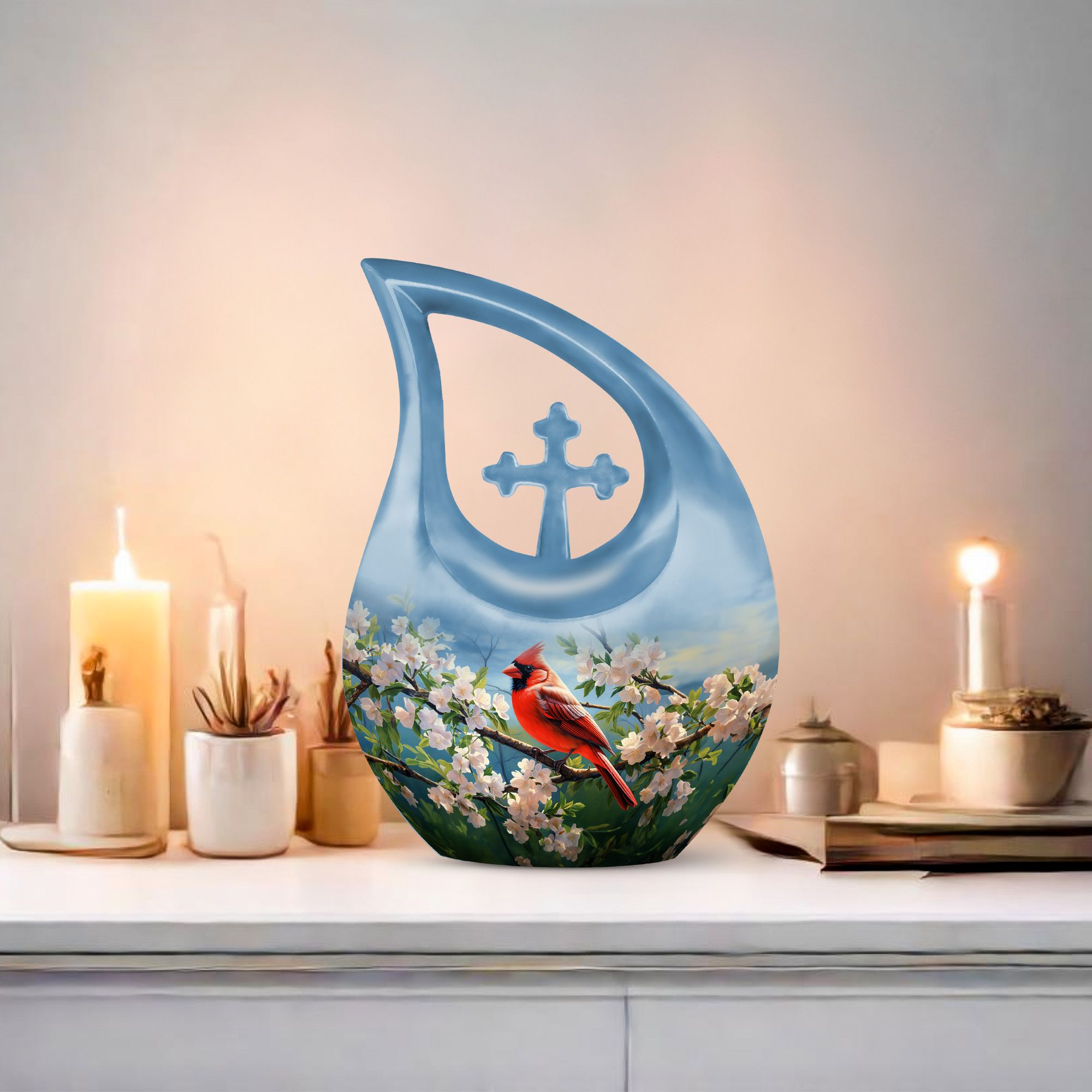 Meticulously crafted from premium aluminum, this urn showcases a serene red cardinal perched on a tree—an enduring symbol of love, hope, and spiritual presence. The smooth finish and thoughtful detailing create a refined look suitable for both home memorials and quiet remembrance spaces. Ideal for families seeking small urns for human ashes adult male, urns for human ashes adult female small size, or even a special urn for ashes adult male dad, it provides secure, lasting protection for your loved one’s ashes.