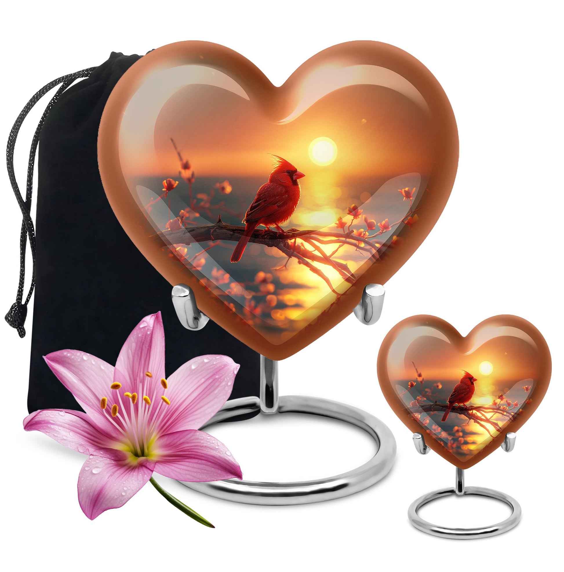 Immerse yourself in a serene remembrance of your loved ones with this exquisite Cardinal Bird Urn. This unique product, a paradigm of abstract art, measures a generous 10 inches in height, making it the perfect Large urn to hold up to 200 cubic inches of cherished memories. Crafted from sturdy aluminium, this urn carries a weight of 3.3 pounds, a testament to its solid make. Unlike conventional cremation urns, this one plays a dual role, serving as a charming addition to your living space, while silently whispering tales of the departed. The urn arrives with a plush velvet pouch, designed specifically to discreetly guard the ashes. Offering a unique Personalize feature, you can engrave the names of your loved ones, giving it a heartwarming personal touch. Keywords potential buyers may search for include burial ashes urn, cremation funeral urns, and urns for cremation ashes. Please note that the design of the urn is on ‘HEART URN’ and style caters to modern simplicity, evoking a sense of peace and calm in the midst of your memories.