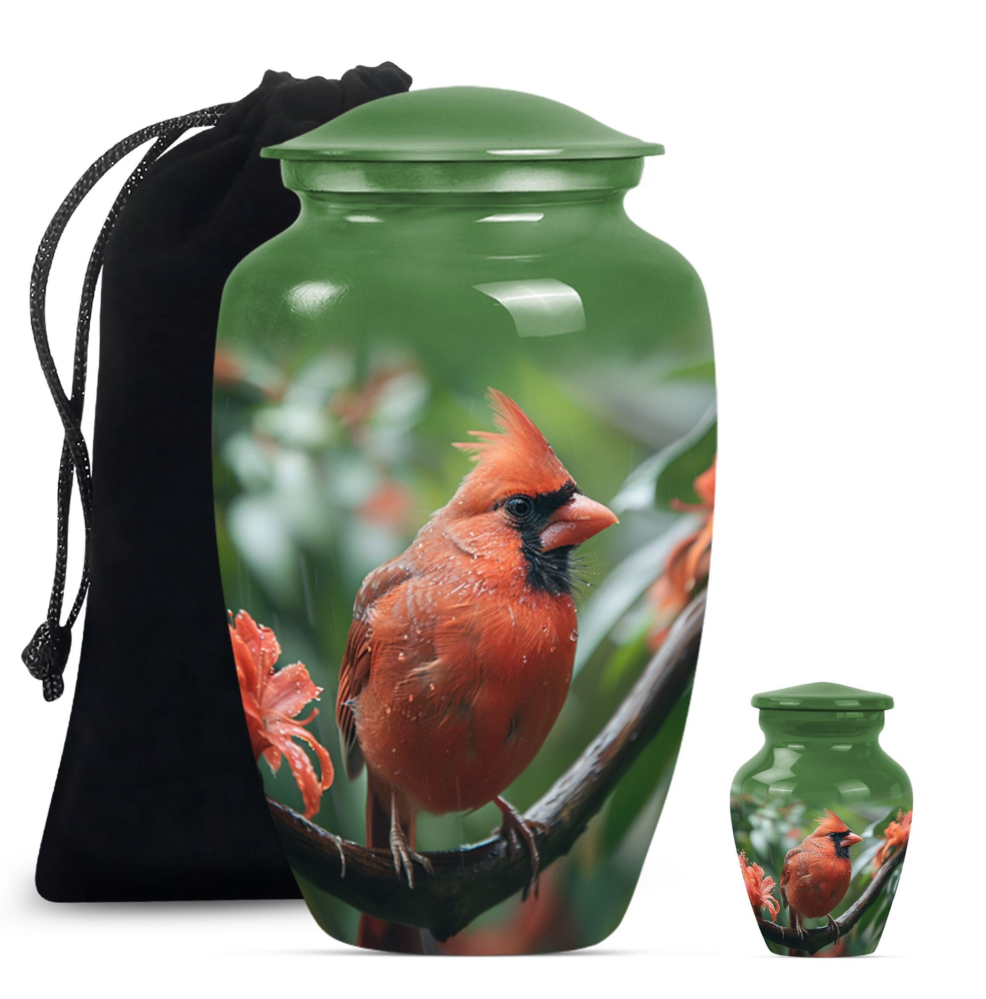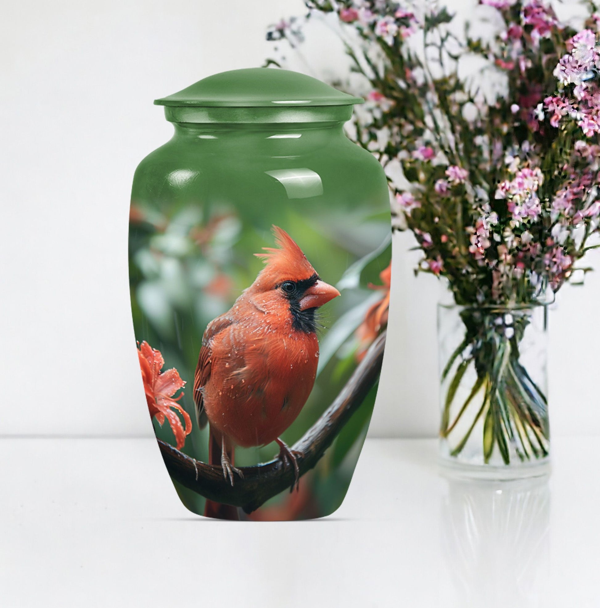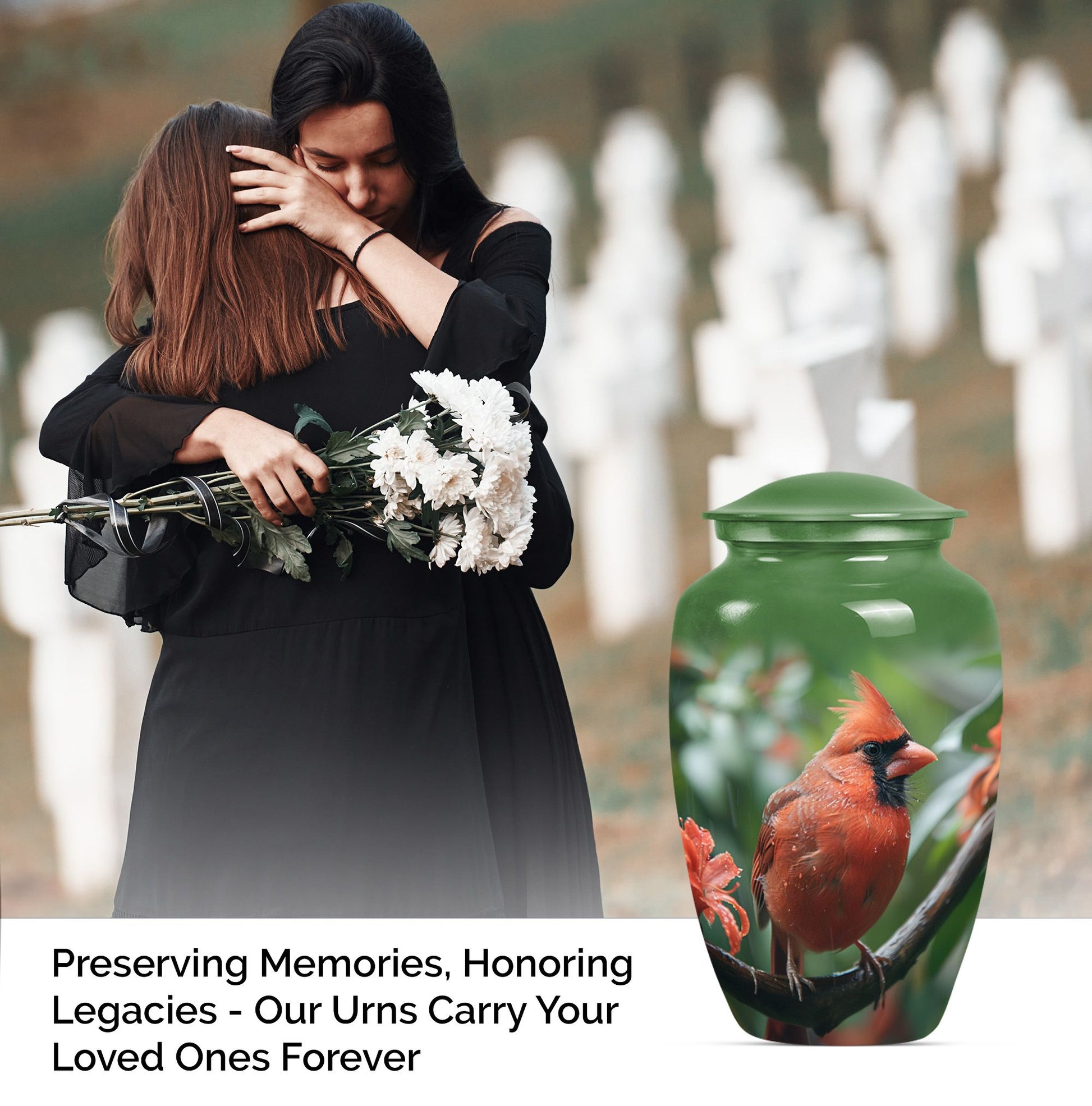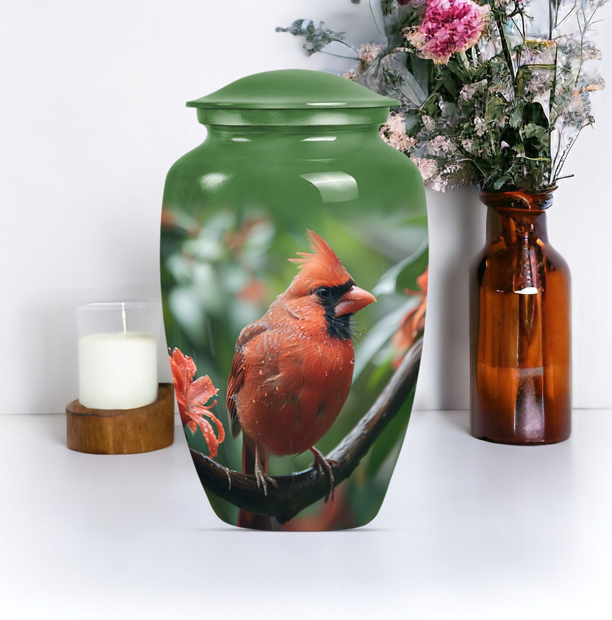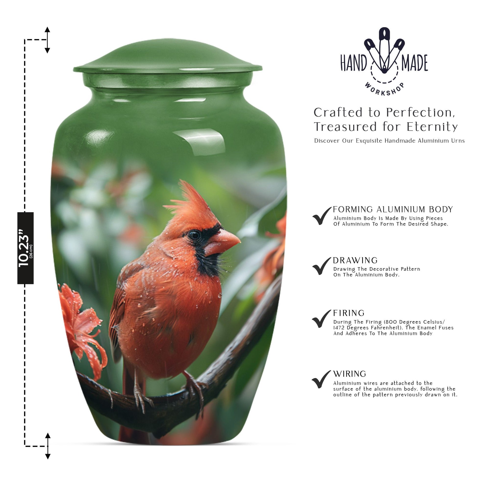 Enhance your memorial service with our gently crafted 'Cardinal Bird Urn', perfectly sized at 10 inches for an intentional and meaningful display. These funeral urns bear a touch of eternal tranquility while ensuring the safe containment of ashes, provided with a subtle velvet pouch. Despite its classic, sophisticated design, it brings an air of serenity to your ceremony. Cast from robust and durable aluminium, our respectful cremation urn weighs a solid 3.3 pounds, symbolizing the everlasting bond you keep with the unforgettable. The notable capacity of 200 cubic inches ensures space for adult human ashes, offering a fitting tribute to your loved ones. Perfectly for those searching for 'cremation urns for dad' or 'burial urns for cremation ashes'. Add a personal touch with our customization option: engrave names to bring a unique, personal feel to this truly essential memorial item. Our 'Wolf Howling' theme presents a design that honours the strength and resilience of your loved one.