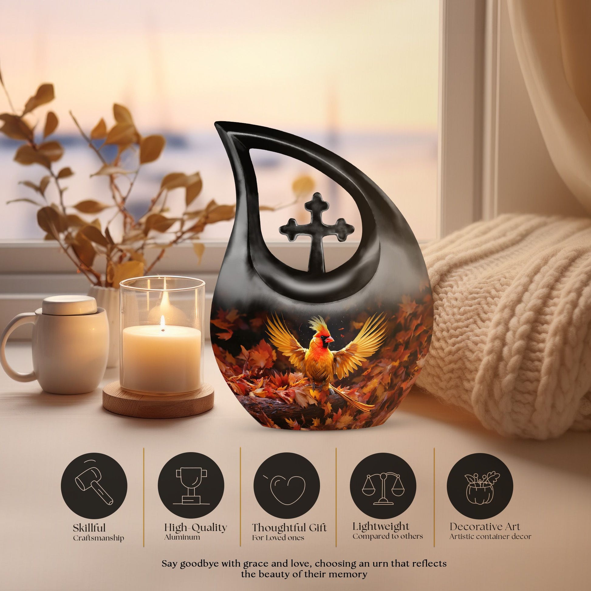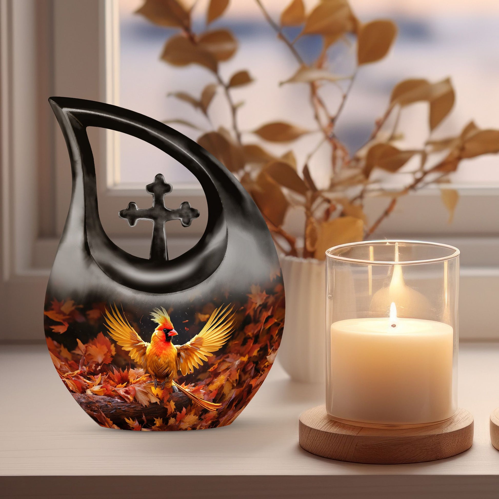 A symbol of eternal connection, the cardinal design brings solace and spiritual comfort, making this cremation urns large adult option a heartfelt tribute to someone deeply cherished.