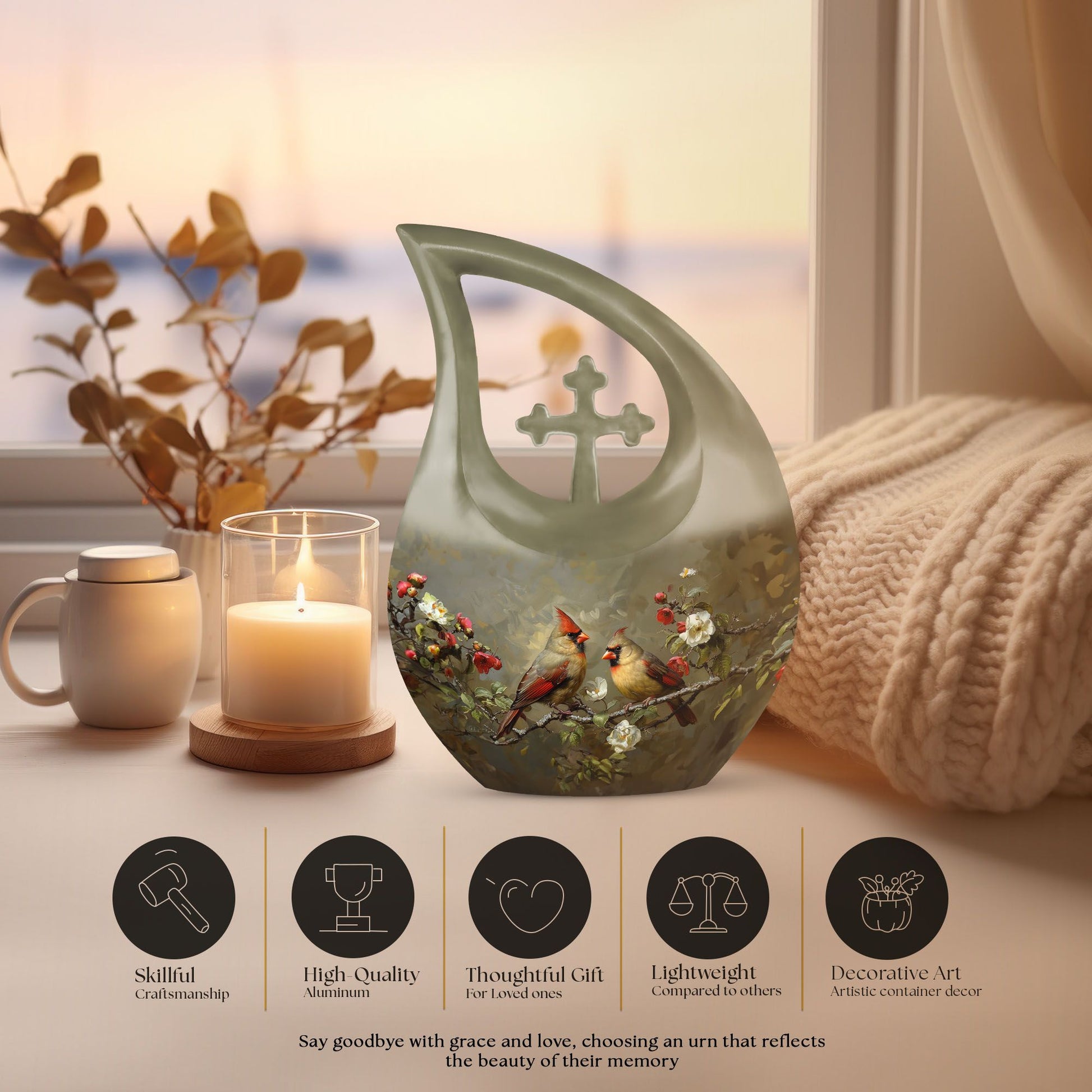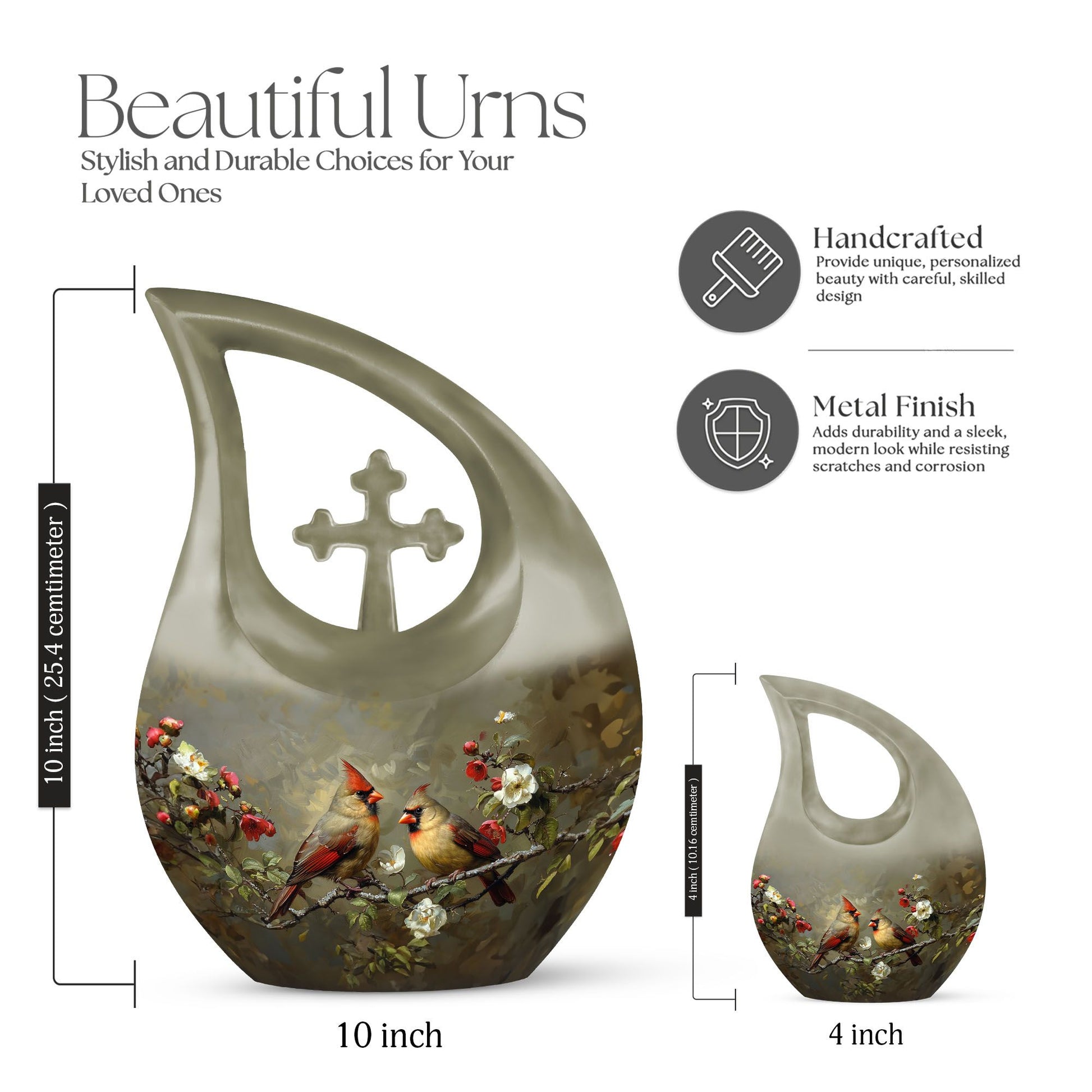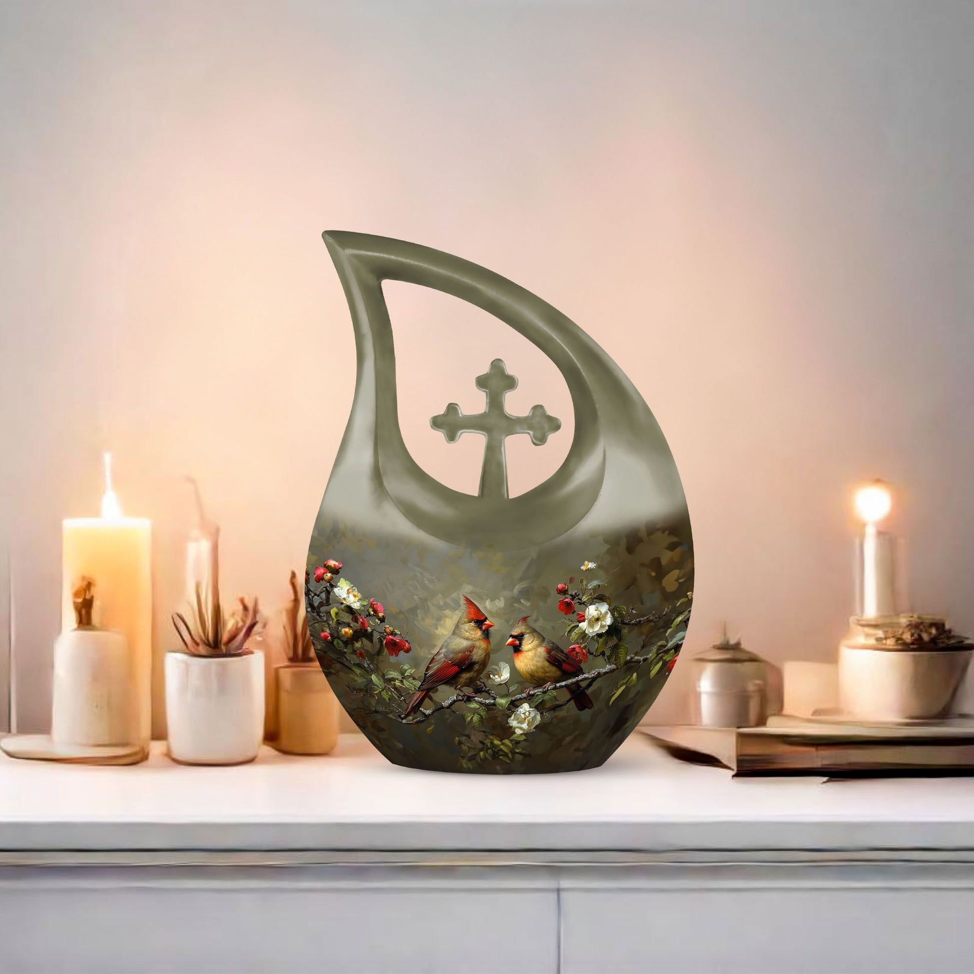Crafted from durable aluminum, this 10 inch urn features a beautiful red cardinal motif symbolizing guidance, hope, and spiritual presence. Its secure screw-top lid ensures reliable protection whether used as a home display or selected as one of the adult urns women, urns women human ashes, or a memorial piece that reflects both strength and tenderness. Its artistry and craftsmanship also make it ideal for families seeking ashes keepsake women or simply wishing to honor a loved one with one of the most beautiful urns women.
