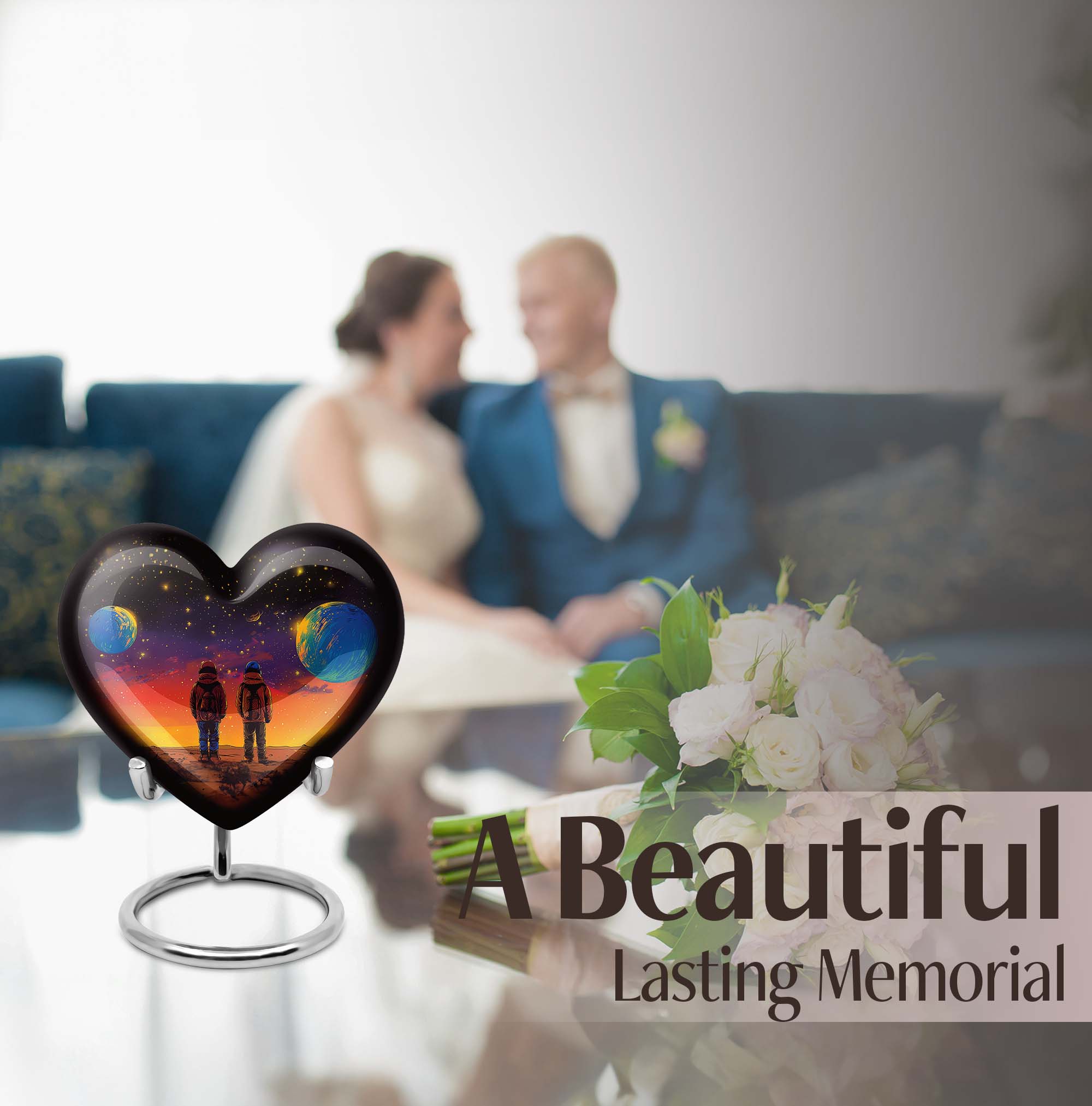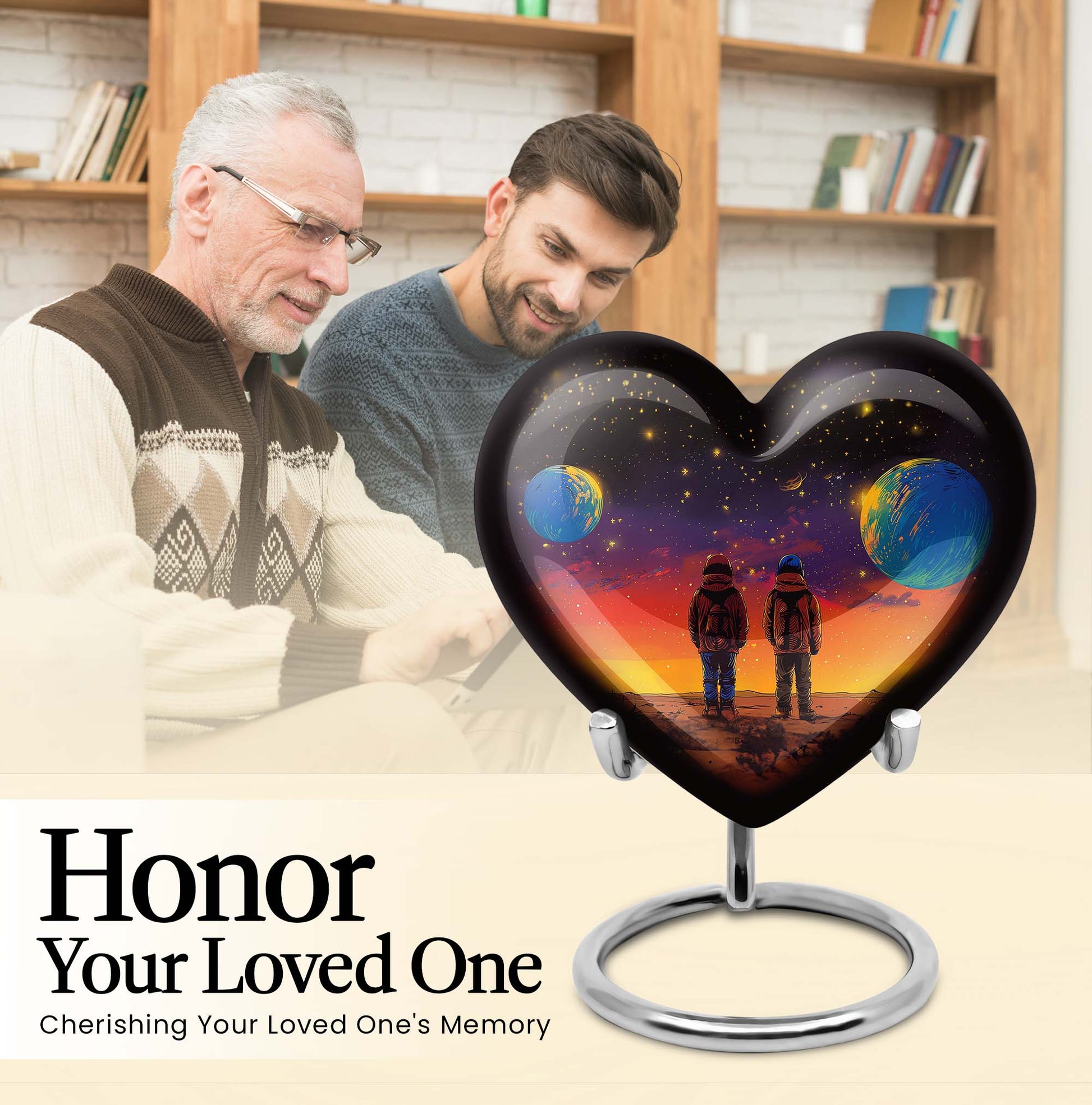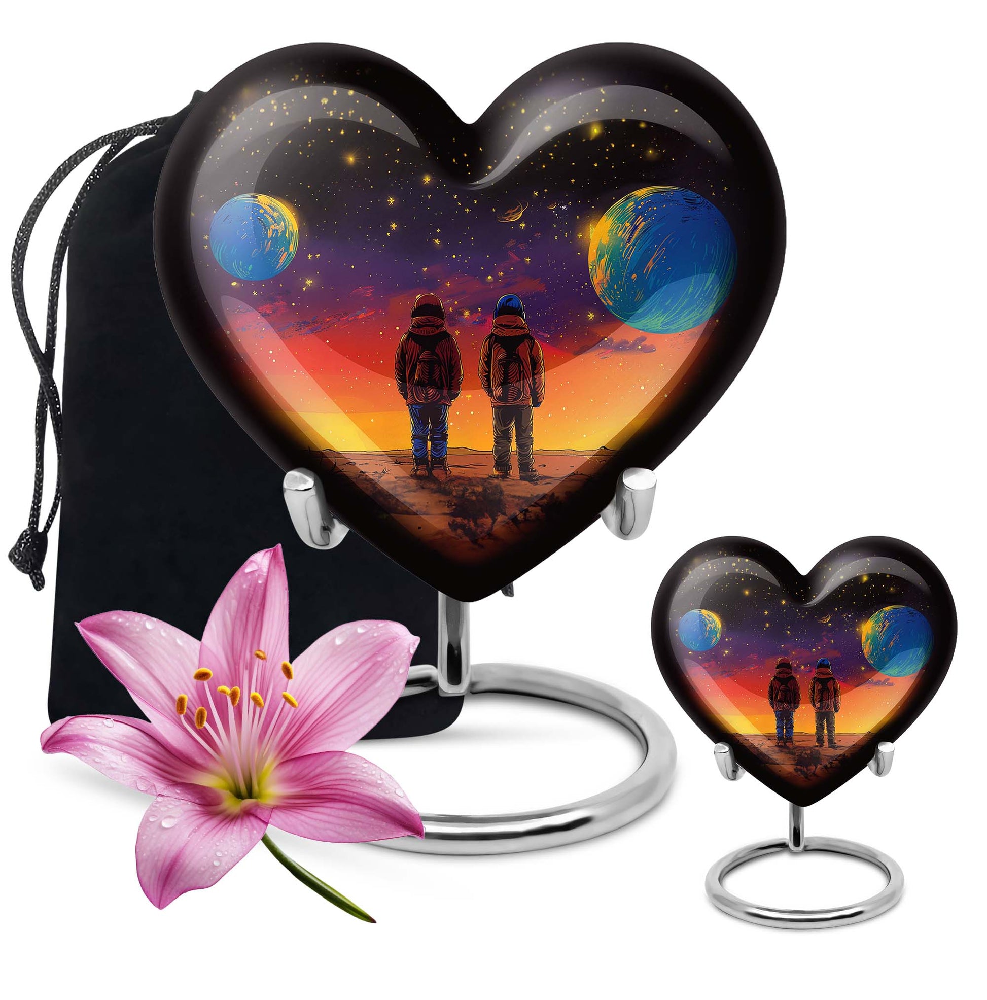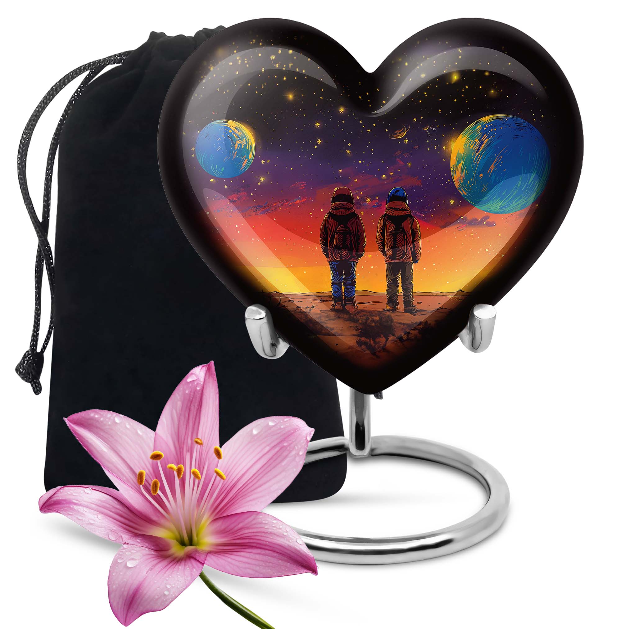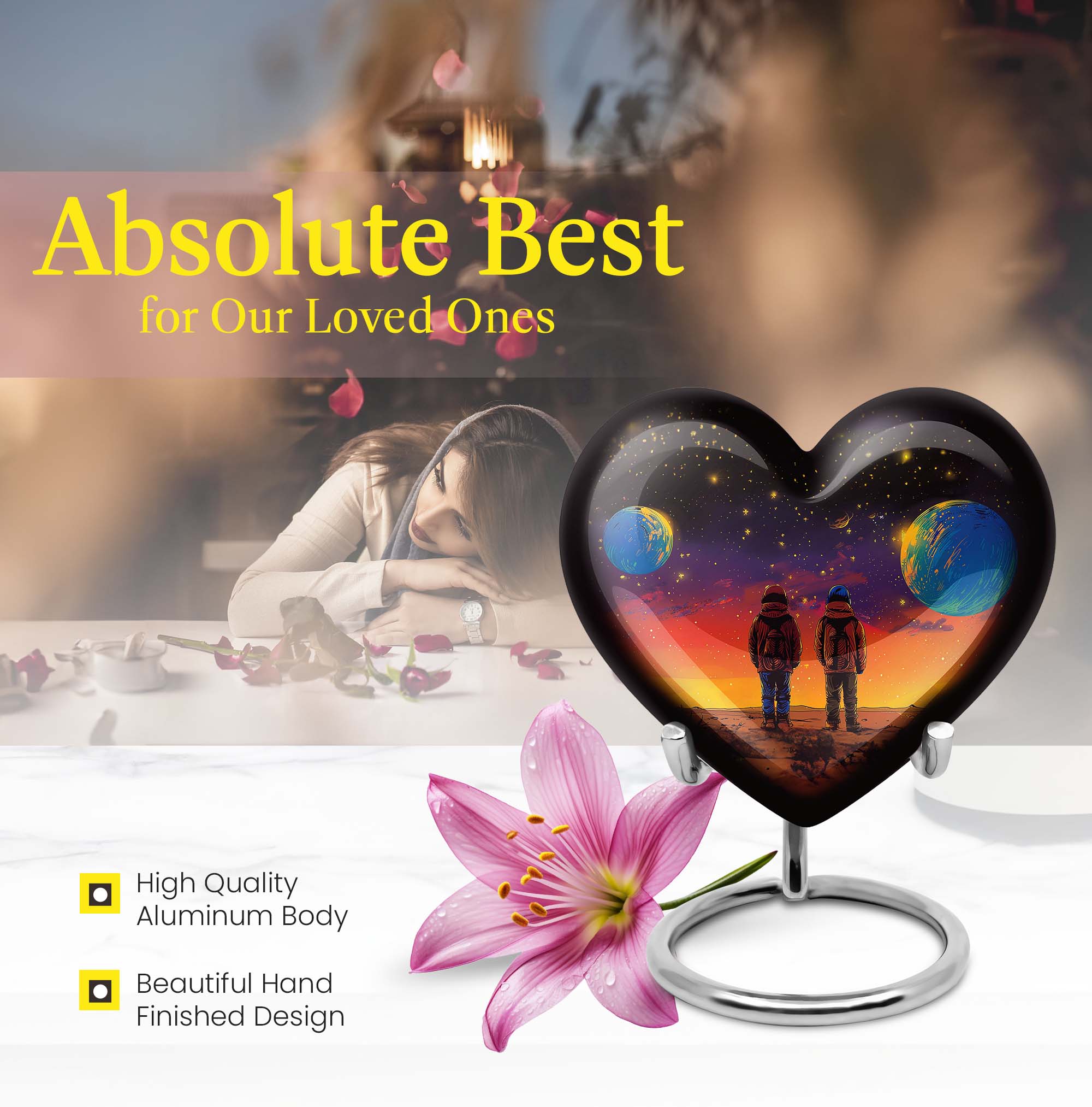 Honor the everlasting bond between siblings with our unique 'brother and sister Urn'. This heart-shaped burial ash urn showcases a distinctive abstract theme, radiating a sense of calm and closure. Crafted from durable aluminum, it stands sturdy at 10 inches height and weighs 3.3 pounds. This cremation urn has a capacity to hold around 200 cubic inches of remains. Apart from being a large urn, we offer a special touch of personalization; you can engrave names to make it more meaningful. Fitting in the memorial ceremony supplies category, this urn comes with a velvet pouch to serve as a dignified containment for the ashes of your beloved ones. Opt for our trusty Heart Urn, specifically designed for adult human ashes, to preserve memories as timeless as the ties that bind us. Remember, our product is not just a cremation urn, it's a testament to a bond that transcends life itself.