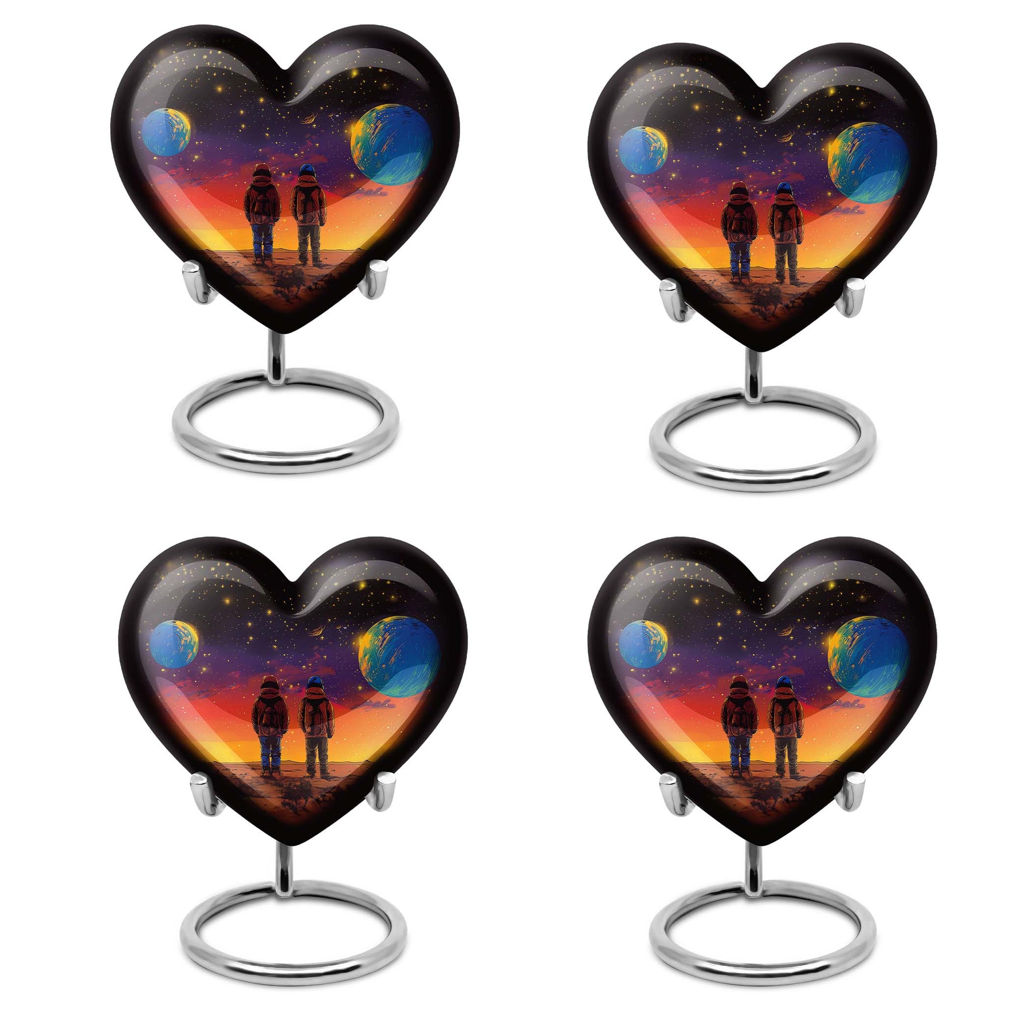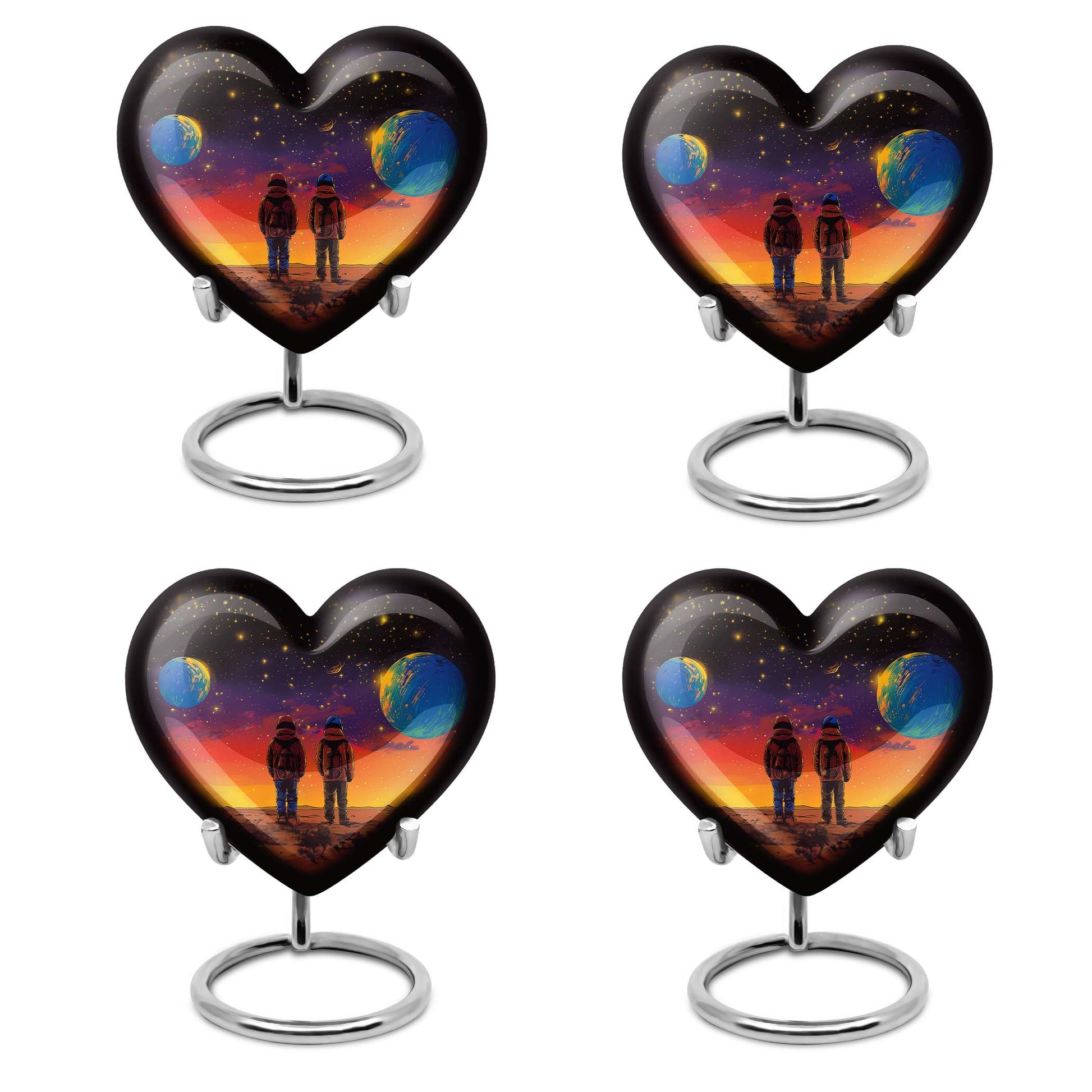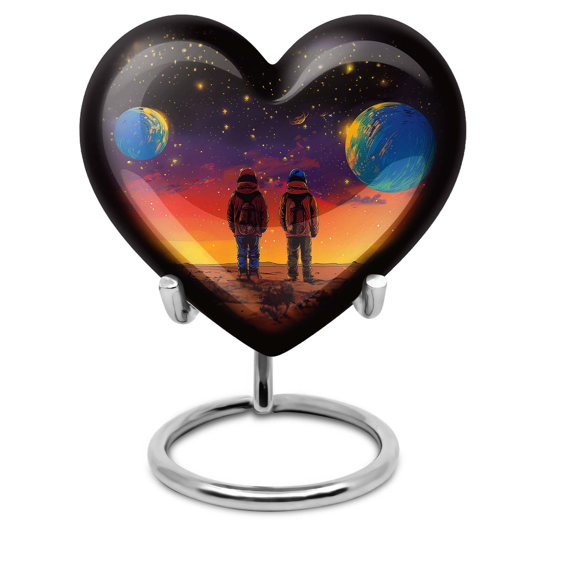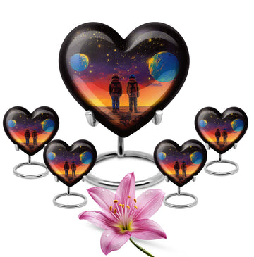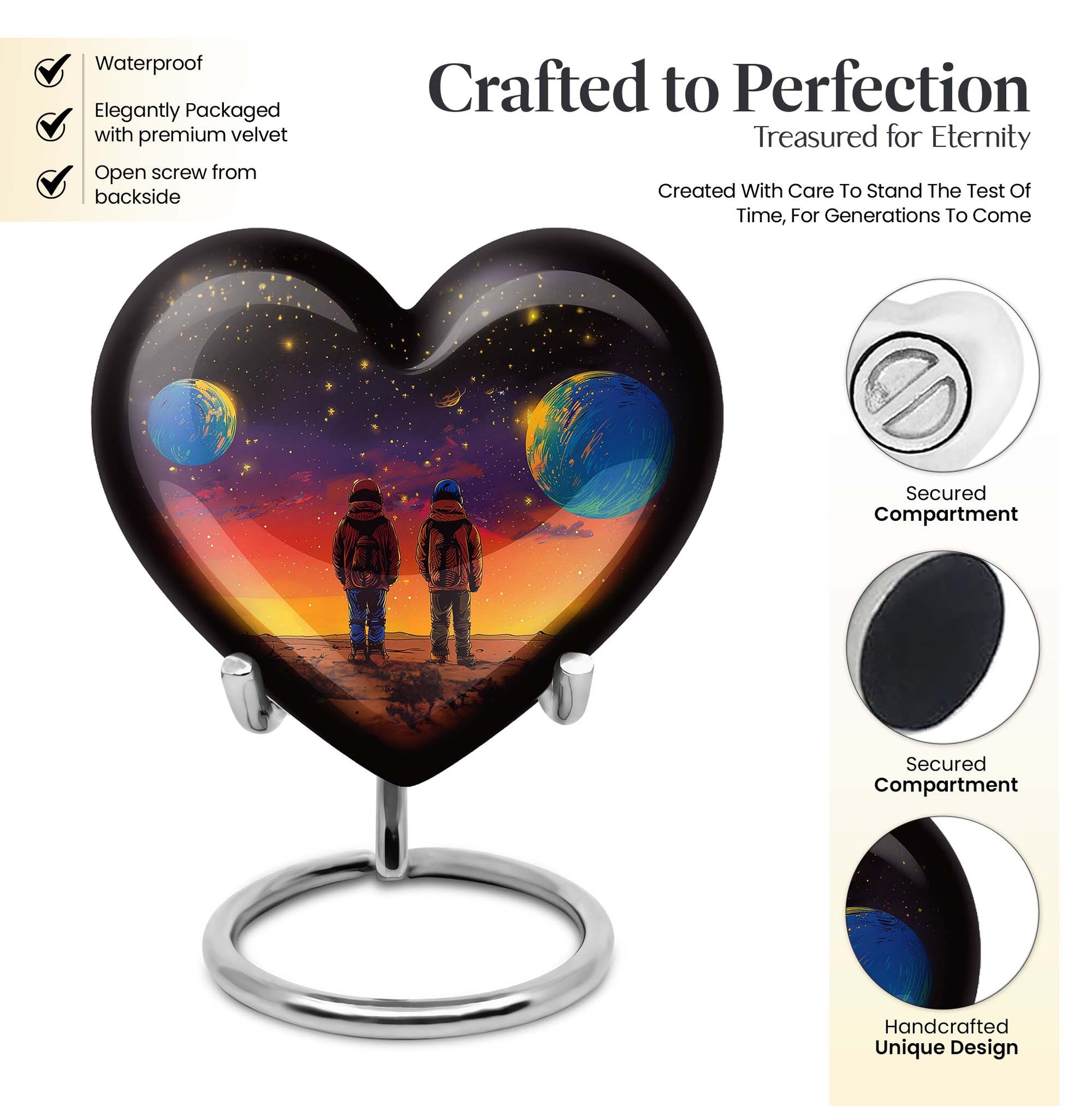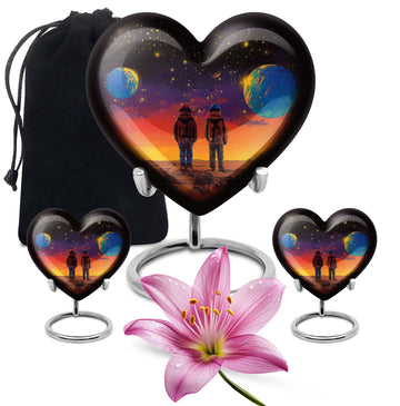 Honor the everlasting bond between siblings with our unique 'brother and sister Urn'. This heart-shaped burial ash urn showcases a distinctive abstract theme, radiating a sense of calm and closure. Crafted from durable aluminum, it stands sturdy at 10 inches height and weighs 3.3 pounds. This cremation urn has a capacity to hold around 200 cubic inches of remains. Apart from being a large urn, we offer a special touch of personalization; you can engrave names to make it more meaningful. Fitting in the memorial ceremony supplies category, this urn comes with a velvet pouch to serve as a dignified containment for the ashes of your beloved ones. Opt for our trusty Heart Urn, specifically designed for adult human ashes, to preserve memories as timeless as the ties that bind us. Remember, our product is not just a cremation urn, it's a testament to a bond that transcends life itself.