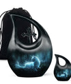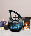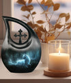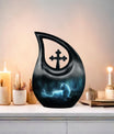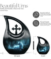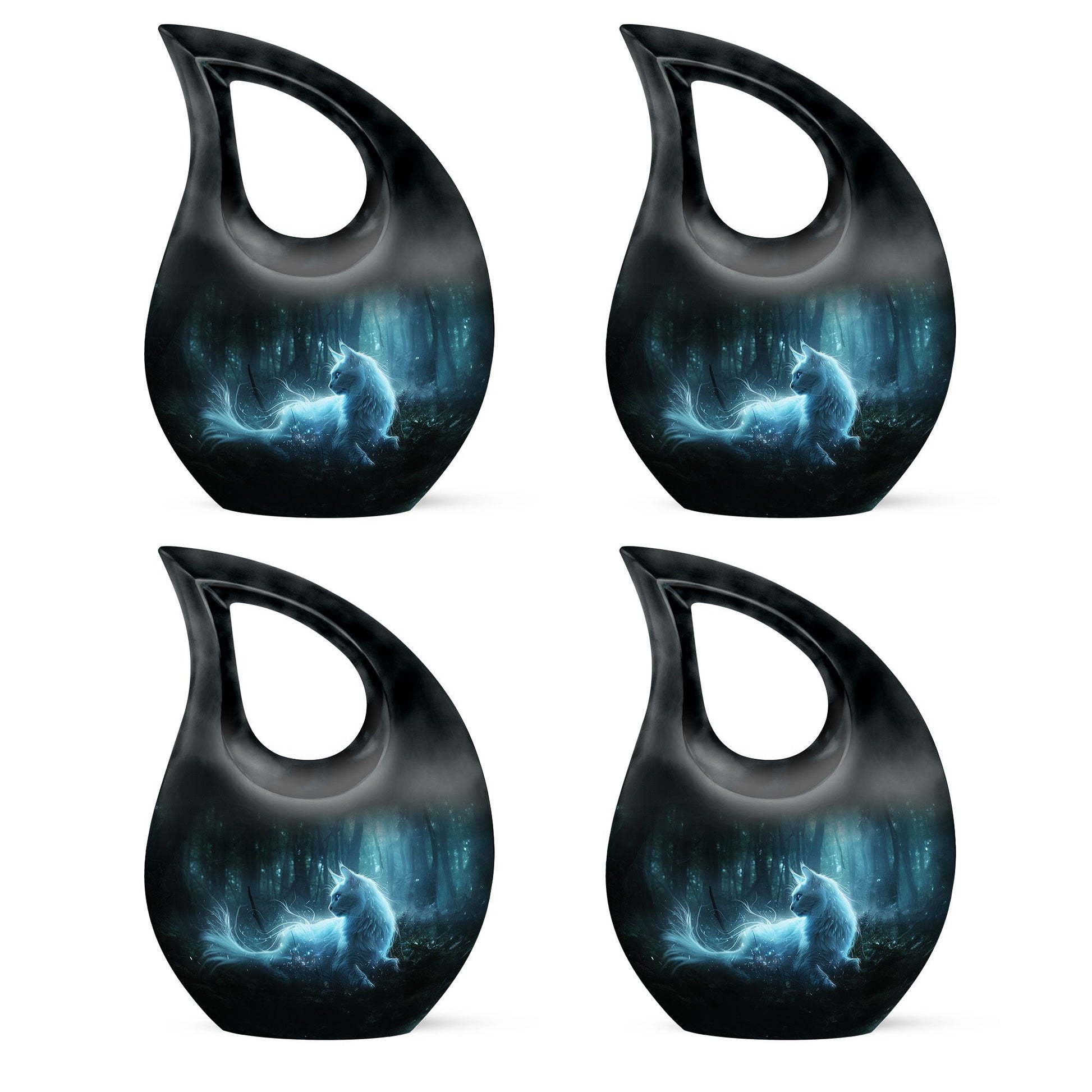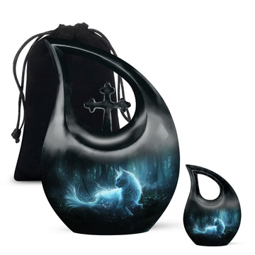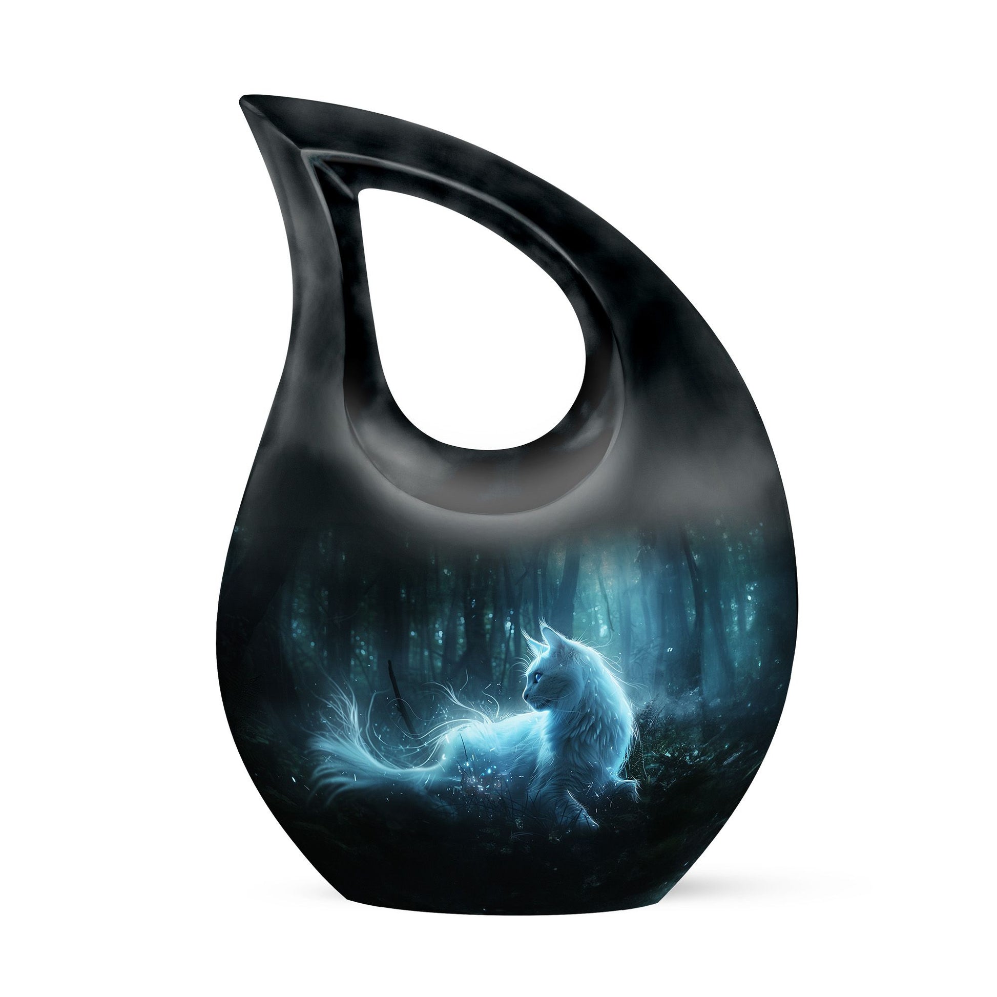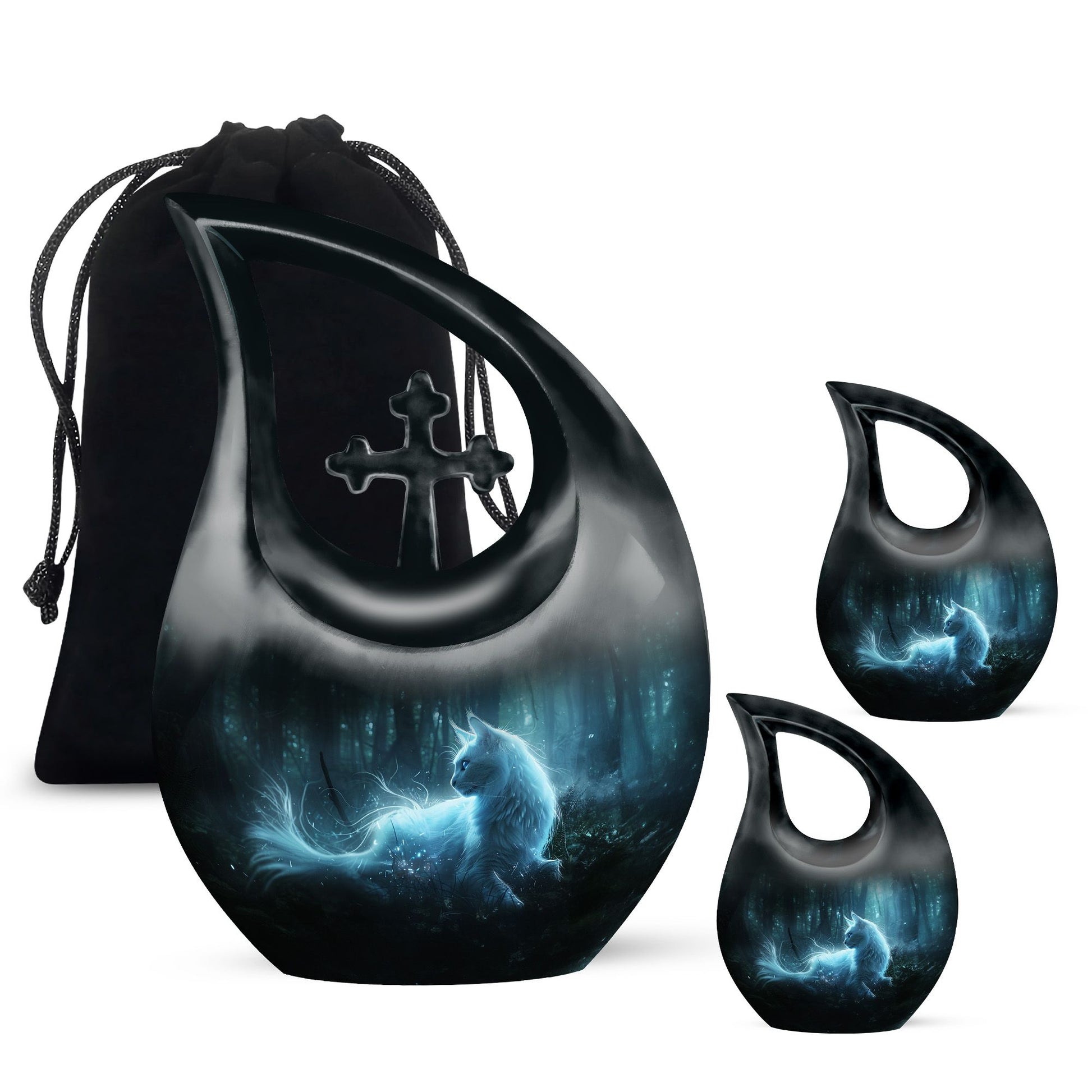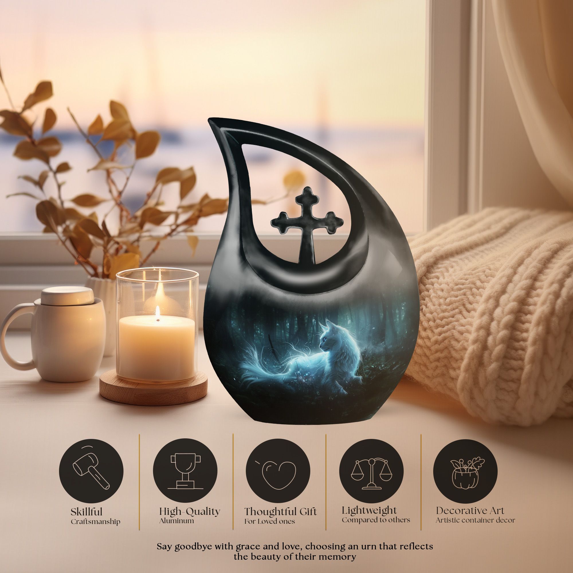 Cherish the memory of your feline friend with our Cat Urn, an affordable cremation and burial option. This large urn, embodied by an aluminium structure, carries the weight of your love without being burdensome at just 3.3 pounds. Its size of 10 inches stands as a dignified tribute to your beloved pet. This unique urn lends an aura of serenity with its 'Cross Drop' theme. Crafted with attention to detail, it has a capacity to accommodate up to 200 cubic inches of ash. Your urn package comes with a velvet pouch, respectfully containing the ashes of your treasured companion. Add a touch of personal affection with our customization option, allowing you to engrave names for that special connection. It's more than just an urn, it's a 'memorial urn', a tangible reminder of your cat's precious life. This urn, an 'ash keepsake' serves as a fitting tribute. Its biodegradable nature adds an eco-friendly touch, embodying our commitment to the preservation of nature. Keep the memory alive with this exquisite memorial piece.