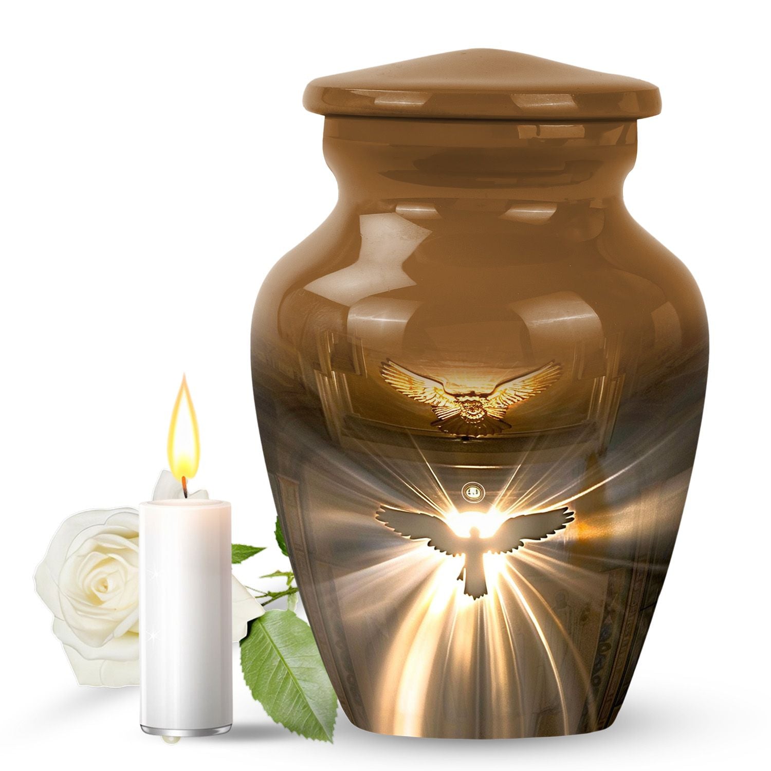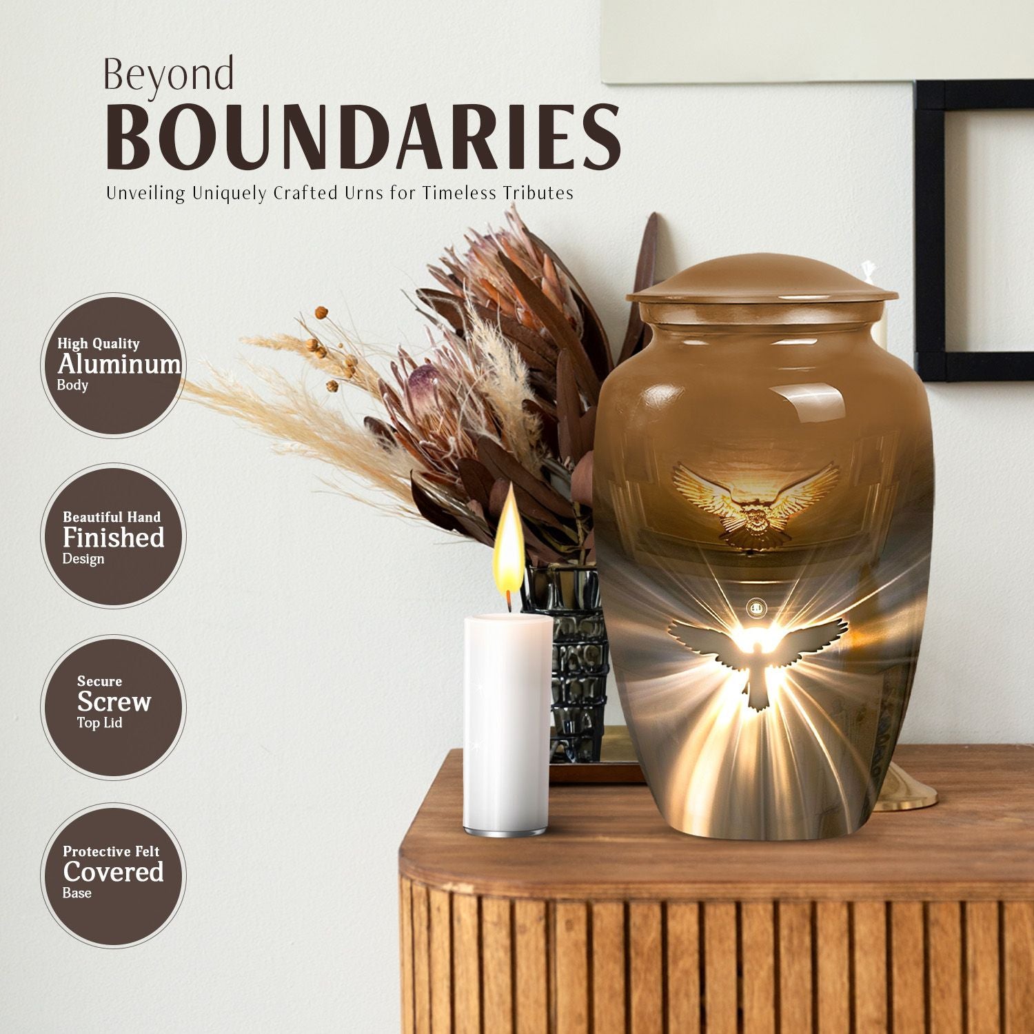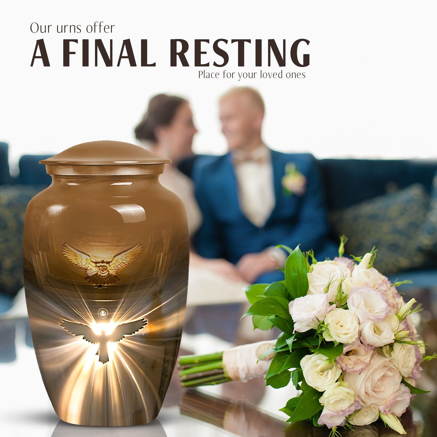 An exceptional commemoration, this 10-inch catholic urn honors your loved ones in a beautifully sculpted, classic urn form. Made from sturdy, high-quality aluminium, this large urn surpasses mediocrity with an abstract theme that speaks volumes in character. Offered in a size suitable to hold approximately 200 cubic inches of ash, our burial funeral urn is gently weighted at a mere 3.3 pounds, making transitions from indoor mantels to in-ground burial sites easy to manage. Painstakingly designed to accommodate adult ashes and fitting for both men and women, our cremation urn comes inclusive with a velvet pouch for a dignified containment of your loved one's ashes. To further create an endearing legacy, customize this earnest cremation urn with engraved names of the departed. This urn's uniqueness is heightened by less common terminology like 'earn cremation' and 'metal urns for burial in ground', strategically selected keywords in line with prevalent trends. Truly a profound embodiment of memorial ceremony supplies.
