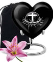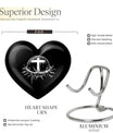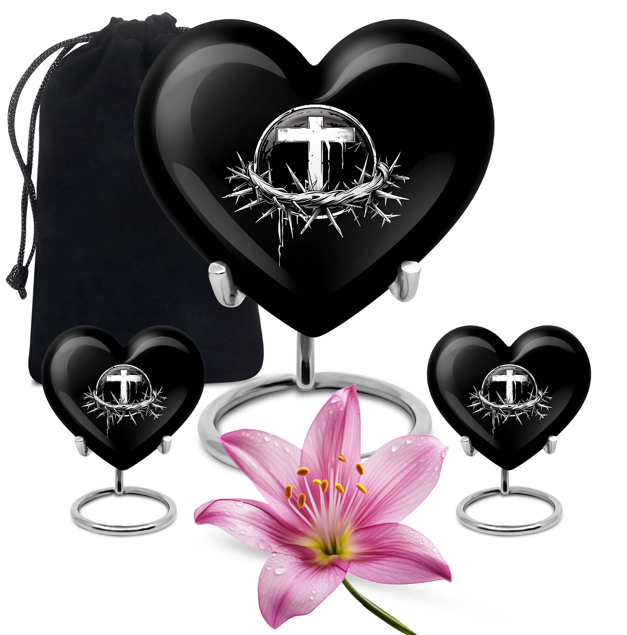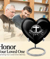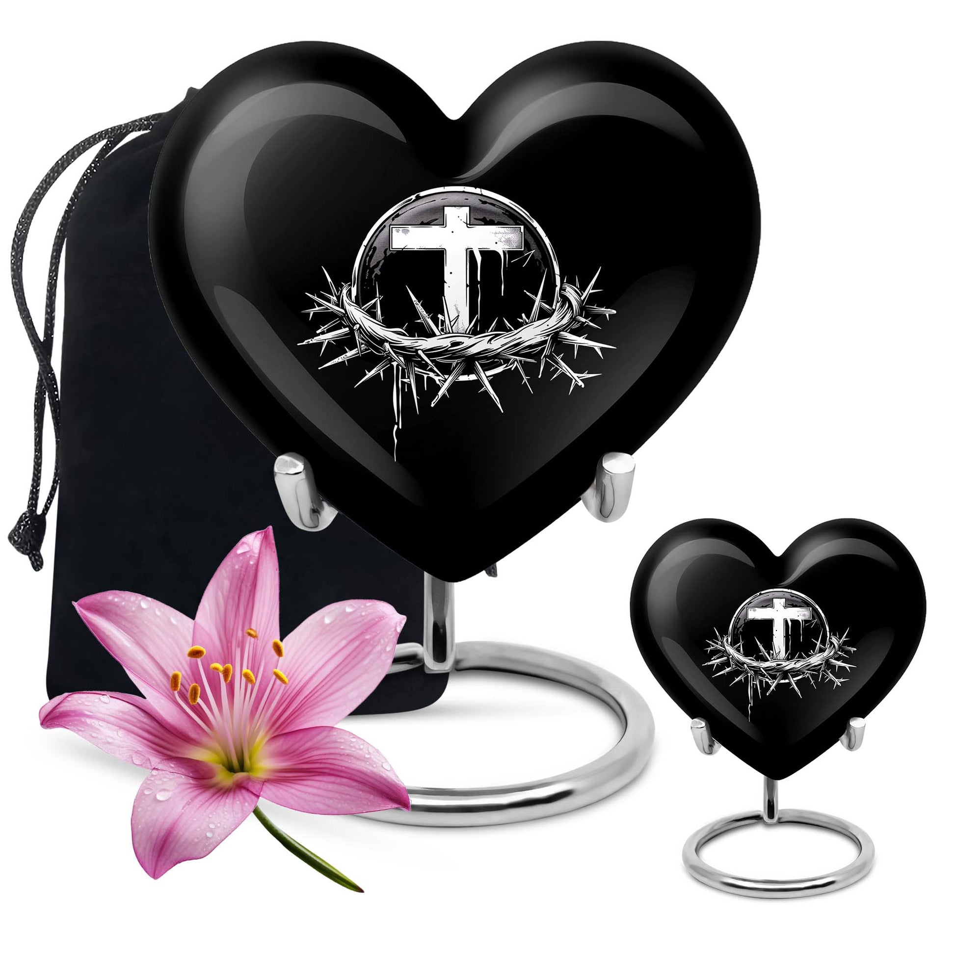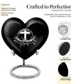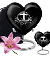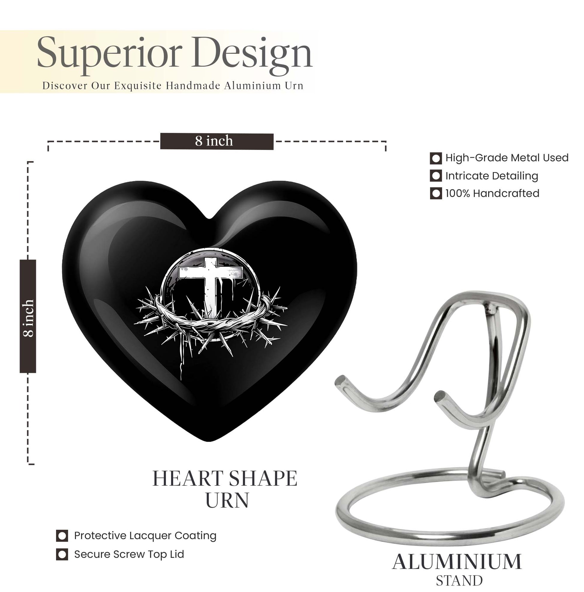 Treasure the memory of your loved ones with our exquisite and tastefully designed 10-inch catholic urn. This large urn, crafted from premium aluminum, showcases an abstract theme symbolizing the immortality of the spirit. Its heart-shaped embodiment serves as an undying memento of your unbroken love. Weighing 3.3 pounds and strategically sized to 200 cubic inches in size, it perfectly holds the ashes, promising years of durability. This funeral ash urn promises the unique personal touch you seek; customize it with engraved names to make it truly special. Added to the package is a soft velvet pouch for containment of ashes, adding an extra layer of respect and honor for your loved one's remains. Invest in this superior quality cremation urn, a perfect mix of emotion and elegance. This unique, metal urn for adult human ashes is not just an urn, but a tribute filled with love and respect. This product is ideal for those looking for 'Memorial urn for mom ashes,' 'urn human ash urns,' or 'Unique urns'.
