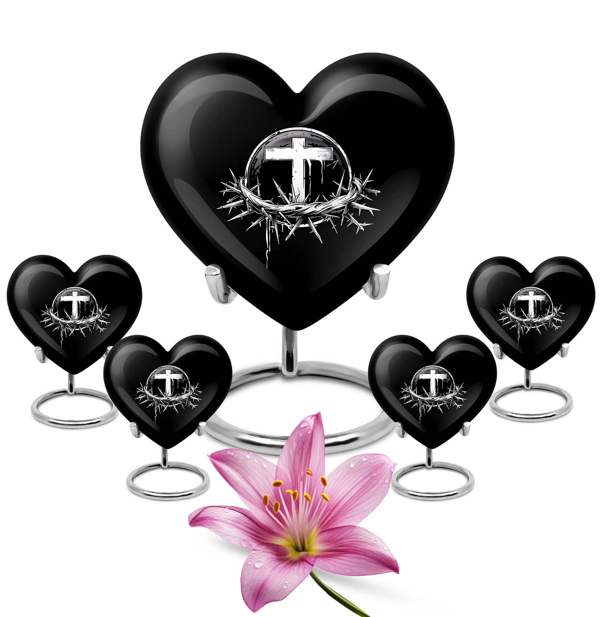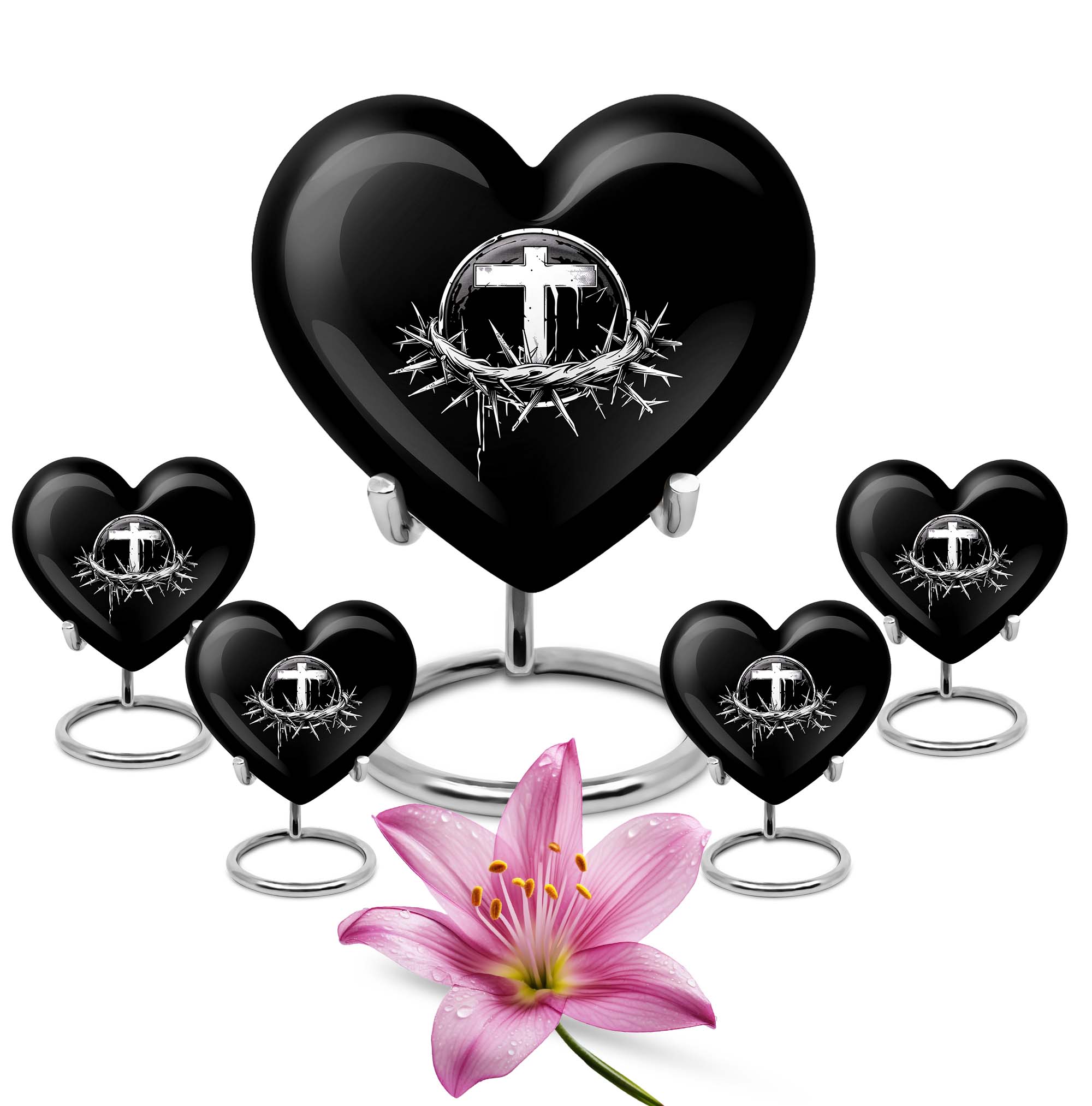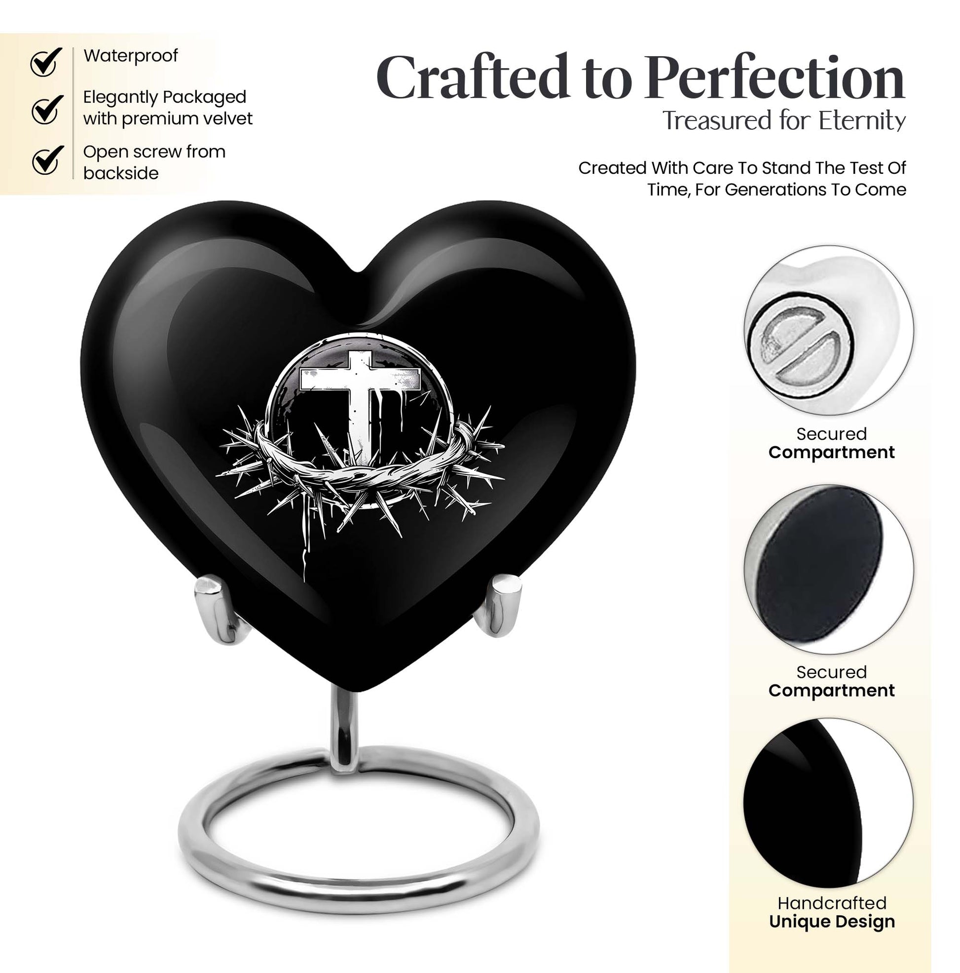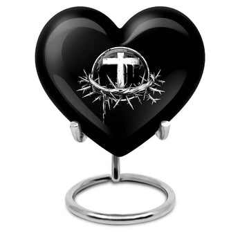 Treasure the memory of your loved ones with our exquisite and tastefully designed 10-inch catholic urn. This large urn, crafted from premium aluminum, showcases an abstract theme symbolizing the immortality of the spirit. Its heart-shaped embodiment serves as an undying memento of your unbroken love. Weighing 3.3 pounds and strategically sized to 200 cubic inches in size, it perfectly holds the ashes, promising years of durability. This funeral ash urn promises the unique personal touch you seek; customize it with engraved names to make it truly special. Added to the package is a soft velvet pouch for containment of ashes, adding an extra layer of respect and honor for your loved one's remains. Invest in this superior quality cremation urn, a perfect mix of emotion and elegance. This unique, metal urn for adult human ashes is not just an urn, but a tribute filled with love and respect. This product is ideal for those looking for 'Memorial urn for mom ashes,' 'urn human ash urns,' or 'Unique urns'.