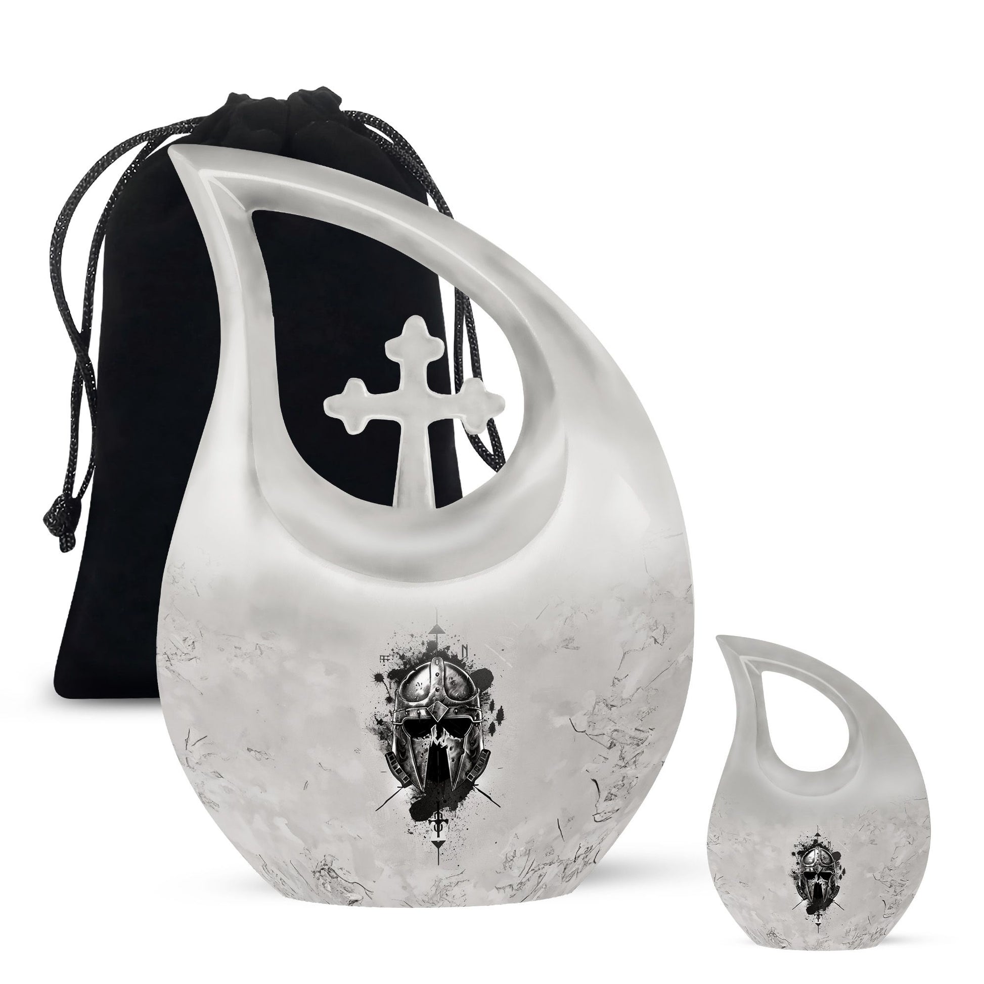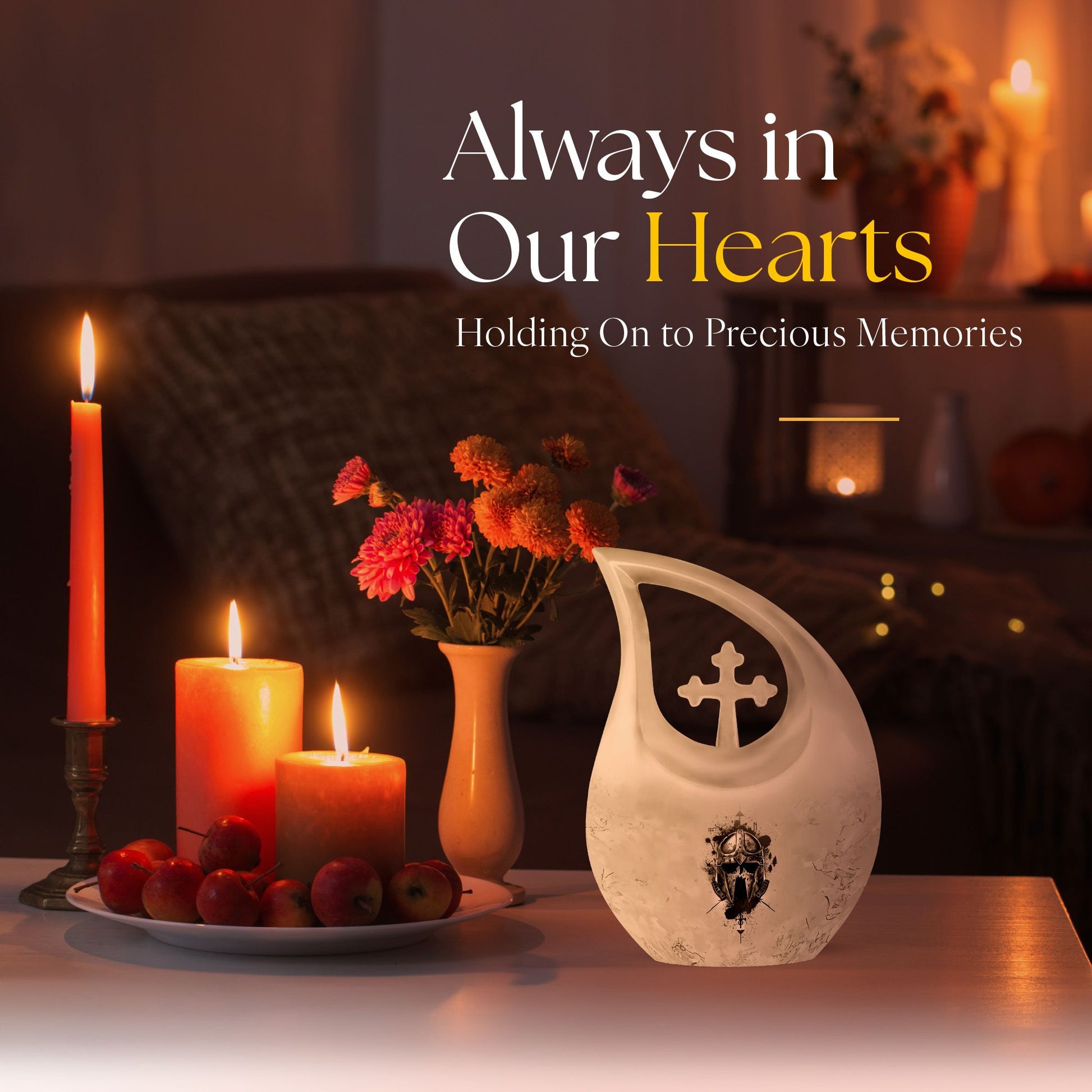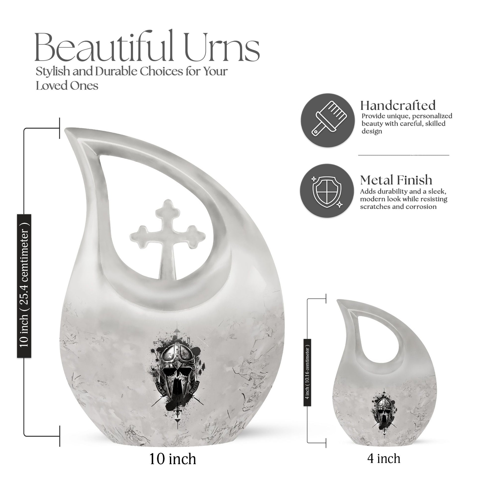 Honor the cherished memories of your departed loved ones with this beautifully crafted 10-inch Catholic Urn. Precision manufactured from high-quality aluminium, this substantial urn vase weighs 3.3 pounds and is compatible with a capacity of 200 cubic inches - ample space for commemorating our departed plurality. The theme resonates a Catholic aura, specifically featuring a Cross Drop design that shows respect and profound love for your passed beloved. Along with the urn, a velvet pouch is included in the package for containment of ashes, offering a discreet and respectful storage solution. The urn also allows for personalization; engrave the names of your beloved onto it, making it an enduring symbol of remembrance. Perfectly balancing the notions of temporary and timeless, this urn is a poignant choice that seamlessly integrates into the memorial ceremonies. Relevant searches: memorial urns, keepsake urns for human ashes, small urns for human ashes, biodegradable urn, cremation urns for burial, large urns.