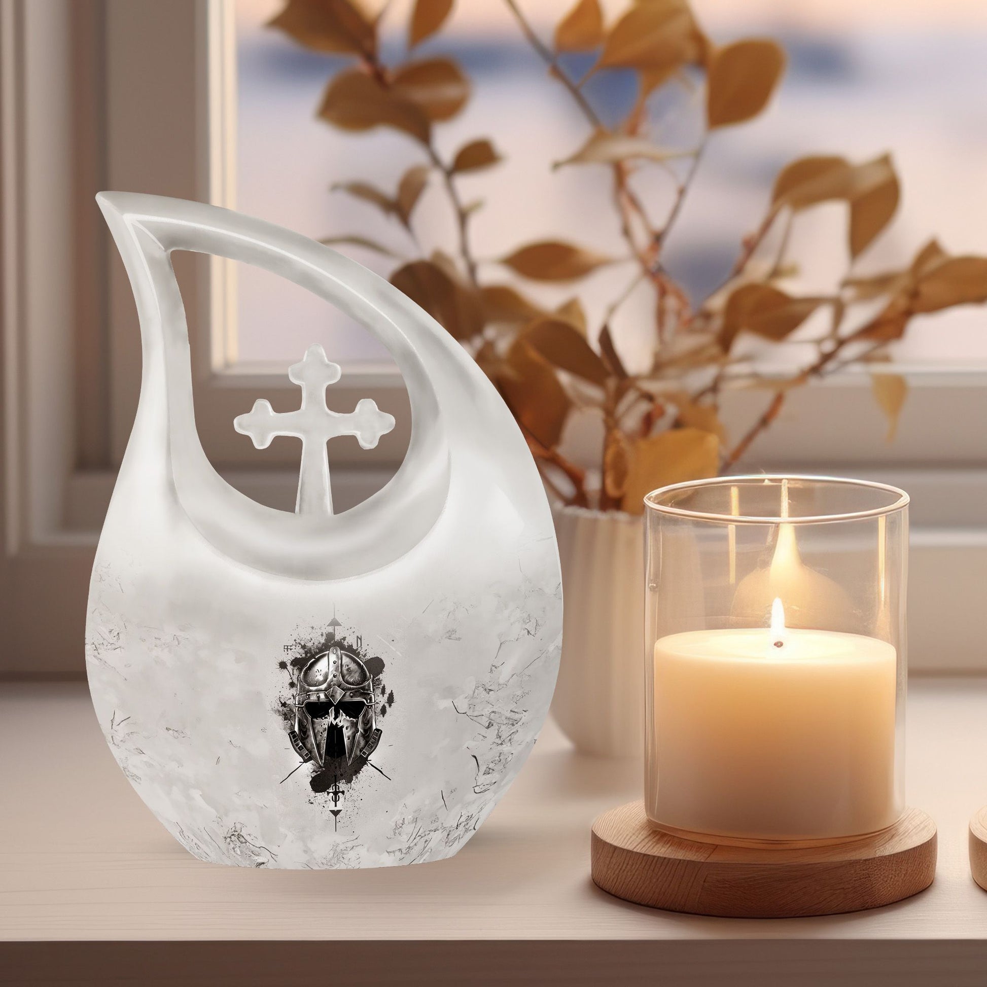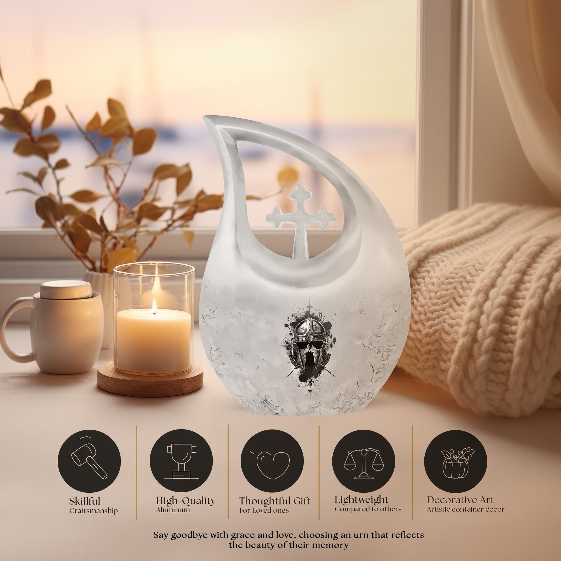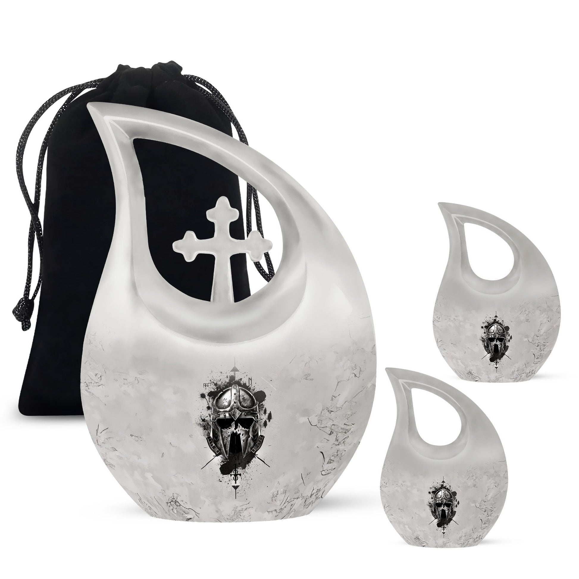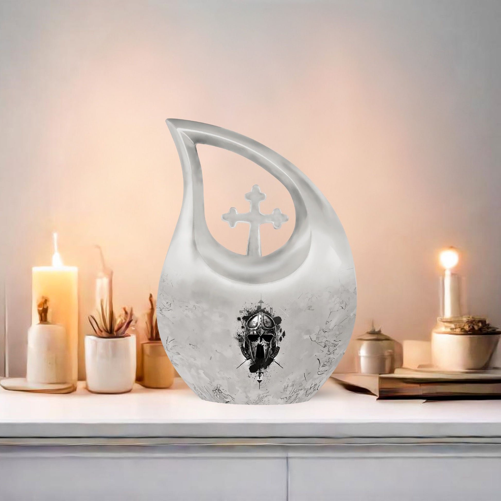 Honor the cherished memories of your departed loved ones with this beautifully crafted 10-inch Catholic Urn. Precision manufactured from high-quality aluminium, this substantial urn vase weighs 3.3 pounds and is compatible with a capacity of 200 cubic inches - ample space for commemorating our departed plurality. The theme resonates a Catholic aura, specifically featuring a Cross Drop design that shows respect and profound love for your passed beloved. Along with the urn, a velvet pouch is included in the package for containment of ashes, offering a discreet and respectful storage solution. The urn also allows for personalization; engrave the names of your beloved onto it, making it an enduring symbol of remembrance. Perfectly balancing the notions of temporary and timeless, this urn is a poignant choice that seamlessly integrates into the memorial ceremonies. Relevant searches: memorial urns, keepsake urns for human ashes, small urns for human ashes, biodegradable urn, cremation urns for burial, large urns.