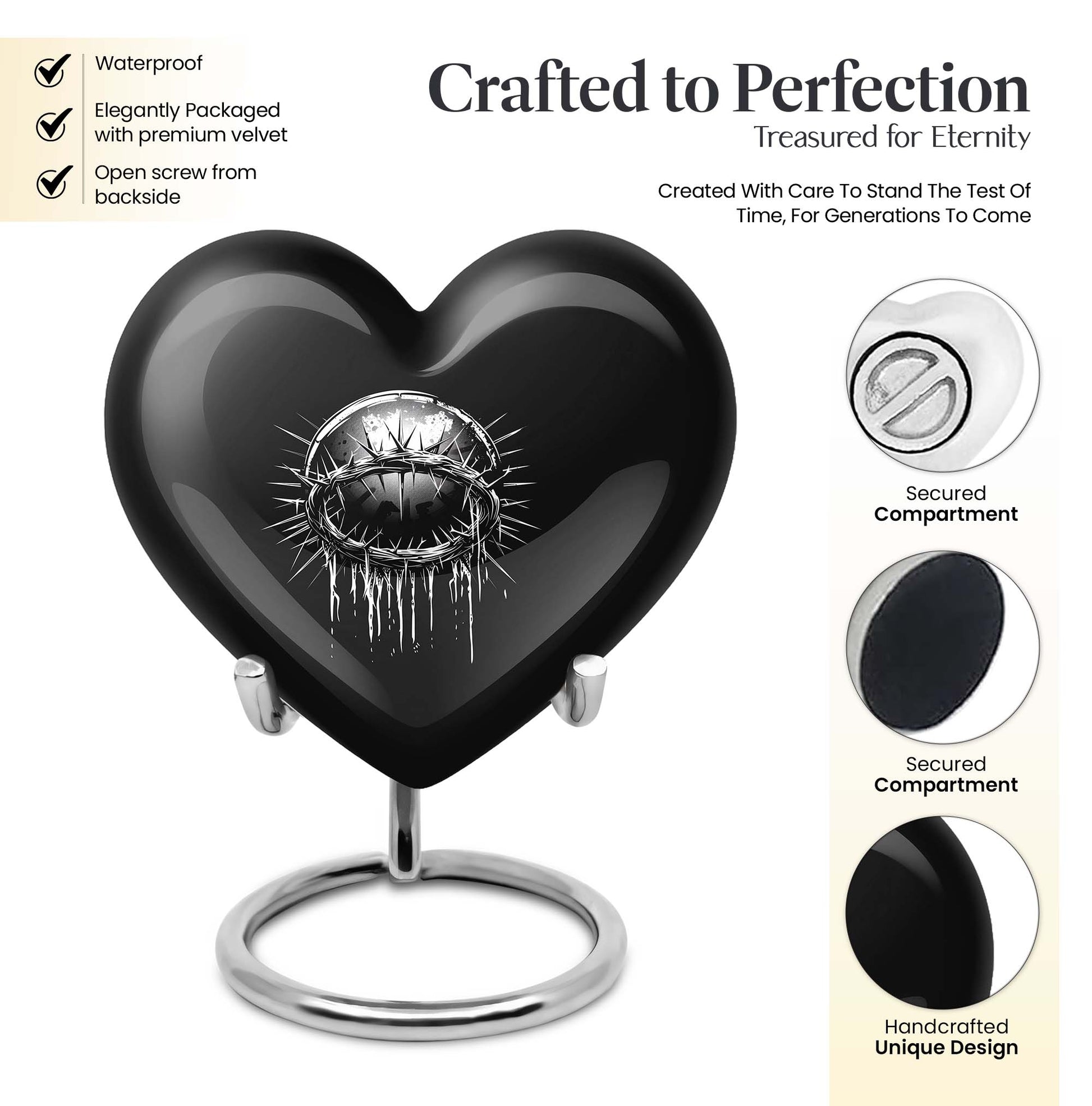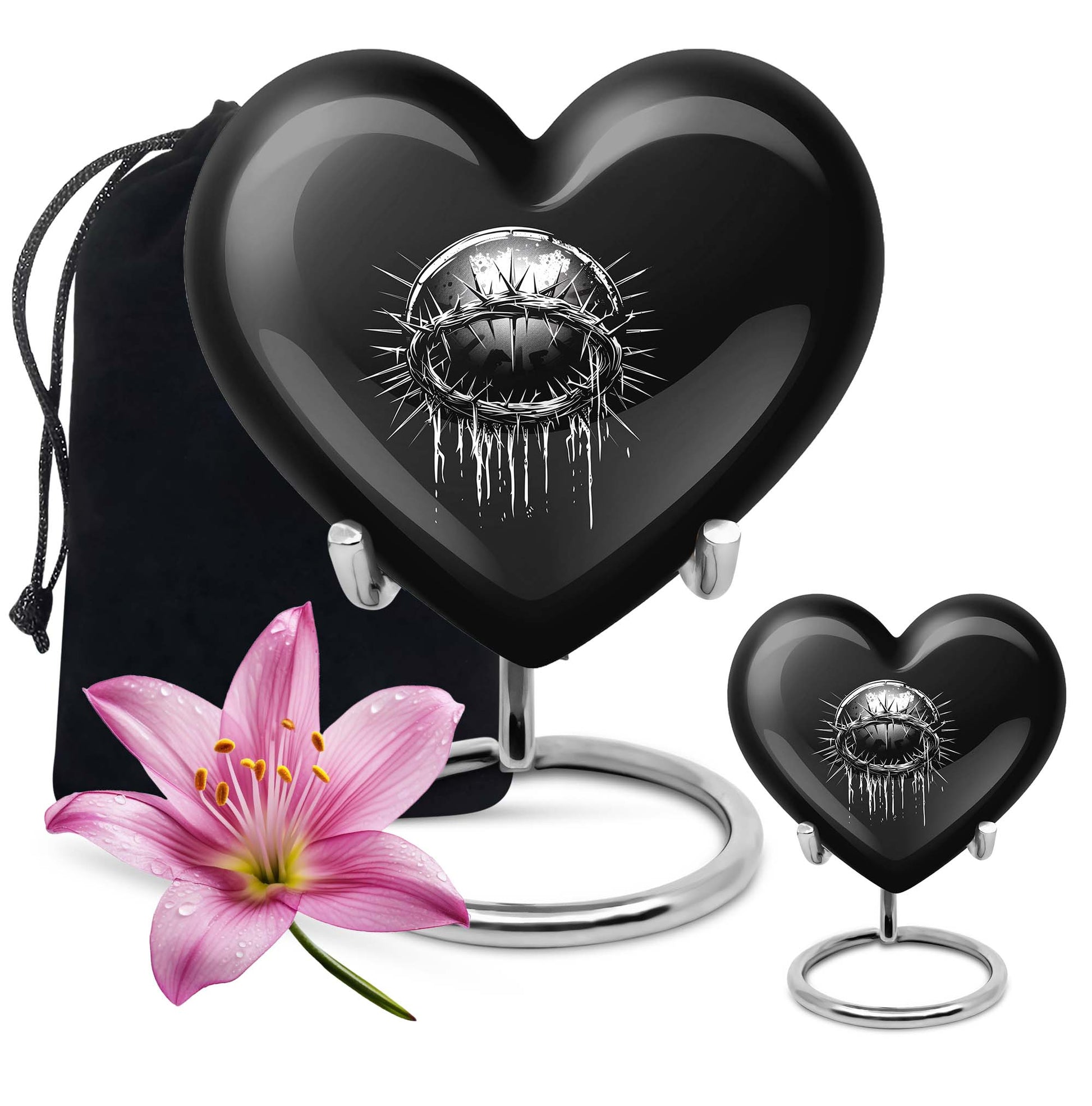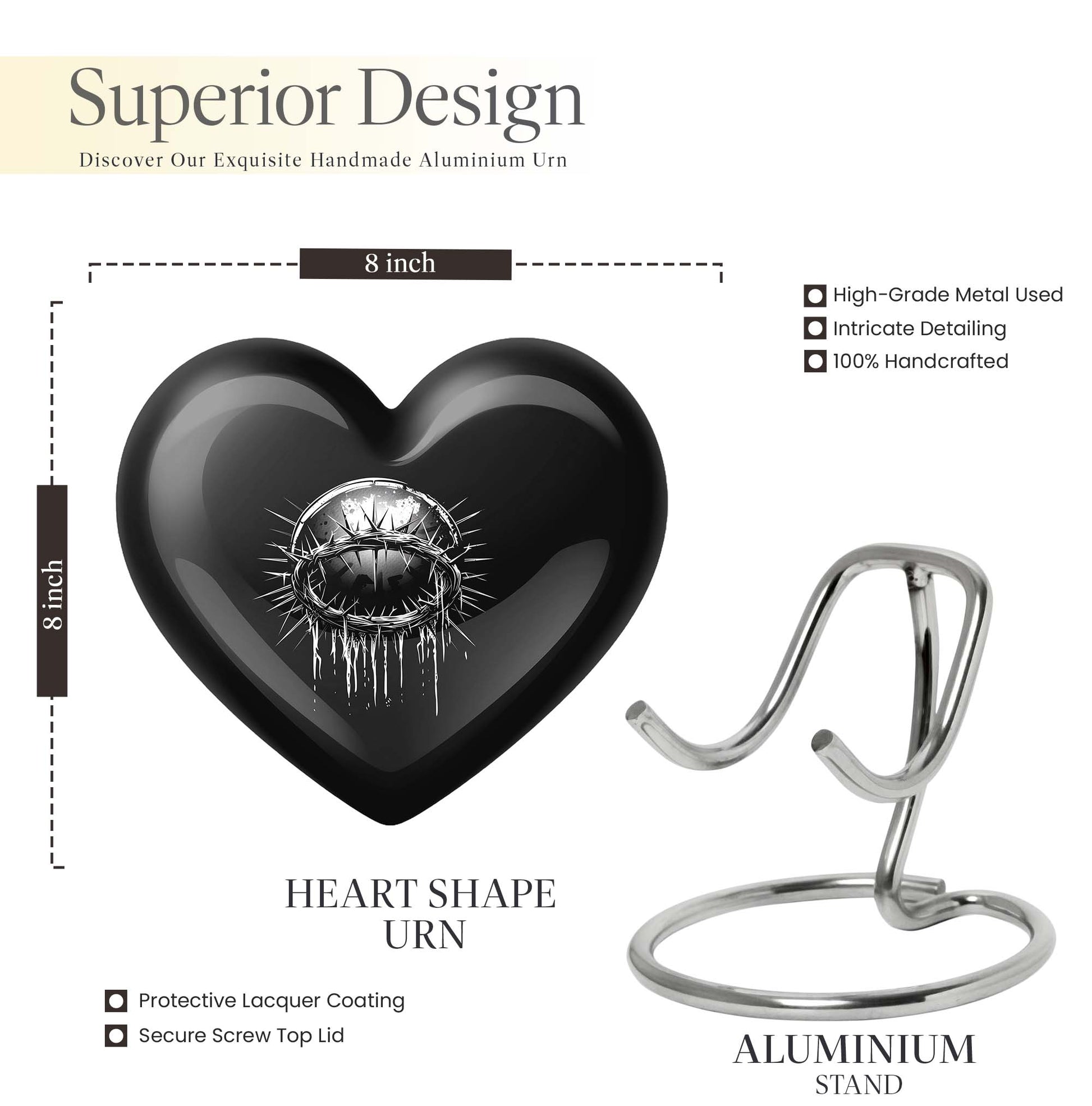 A profoundly symbolic, deeply personal item, this Large 10-inch Catholic Urn is an extraordinary tribute to your departed loved ones. Fashioned from durable aluminium, this Memorial Funeral Urn for ashes weighs a sturdy 3.3 pounds, capable of preserving a memory of up to 200 cubic inches. With a heart urn design, the abstract theme adds a touch of spiritual charm. This cremation urn comes in a protective velvet pouch to securely keep ashes. What sets this urn apart is its ability to be personalized - you can engrave your beloved's name, making it an eternal mark of love and respect. Designed for those seeking unique urns for human ashes, or decorative urns for cremation ashes of parents or other family members, this product offers a dignified final resting place. By choosing our urn, you're choosing an emblem of everlasting love and an enduring symbol of your devotion.