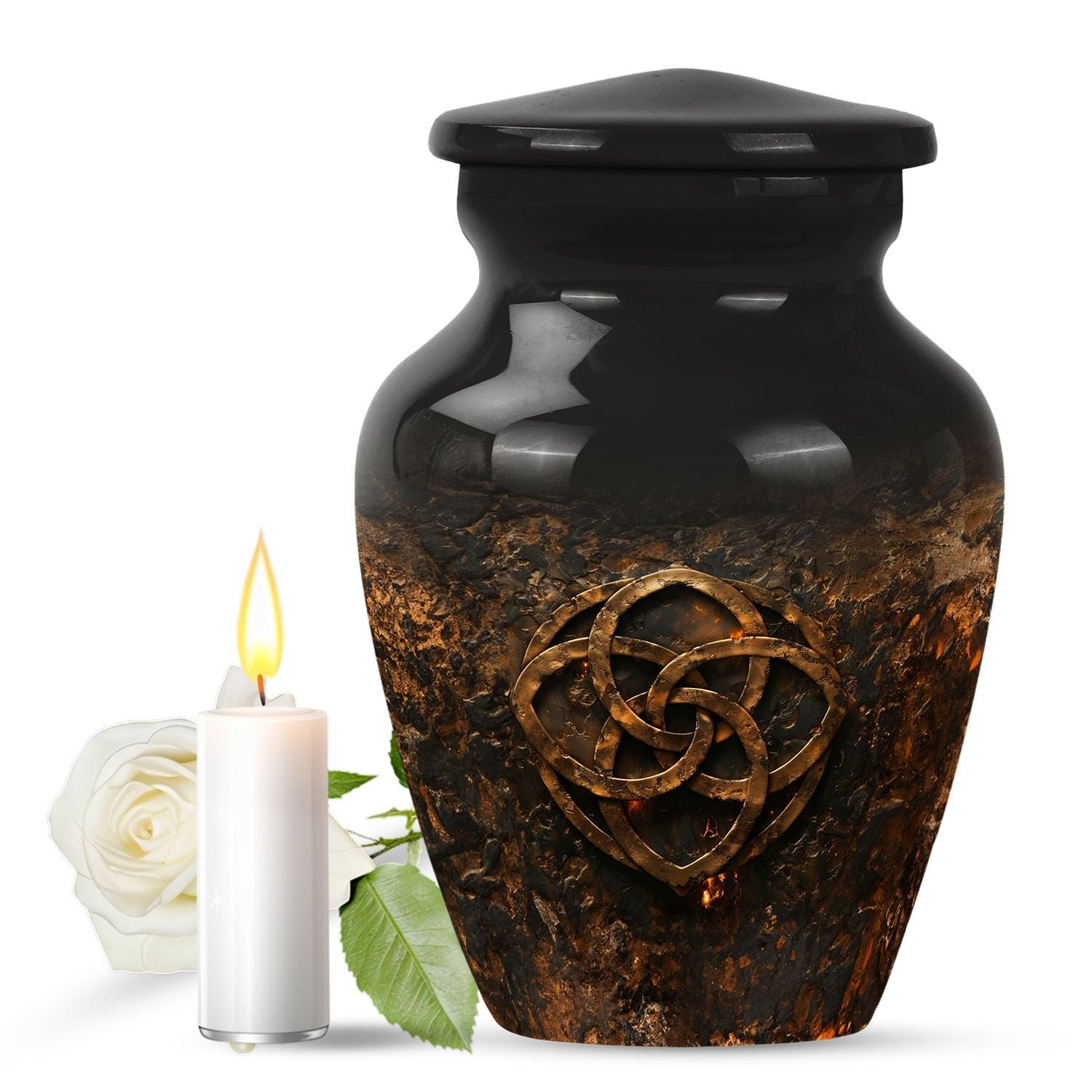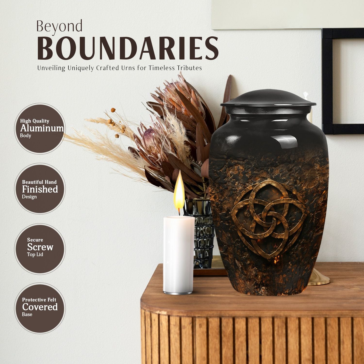Celebrate the heavenly journey of your loved ones with this exquisite Catholic Urn. Designed for those in search of funeral cremation urns for women, this 10-inch, elegant memorial urn defines dignity at its best in the poignant occasion. Weighing a sturdy 3.3 pounds, the capacity of this abstract-themed urn is 200 cubic inches, adept for retaining the cherished remains of your dear. Crafted from resilient aluminium, this urn displays an abstract theme that resonates the sublime journey of life and beyond. Personalize this large urn with engraved names, adding a heartfelt tribute to your loved ones. Its dimensions are 10 inches in height, with a structurally stable urn-shape, making it a lasting keepsake. Included is a soft velvet pouch, upholding the ashes safely, further underlining the memorial's sanctity. For those seeking distinctly unique funeral urns for adult ashes, look no further than this dignified, endearing tribute option.