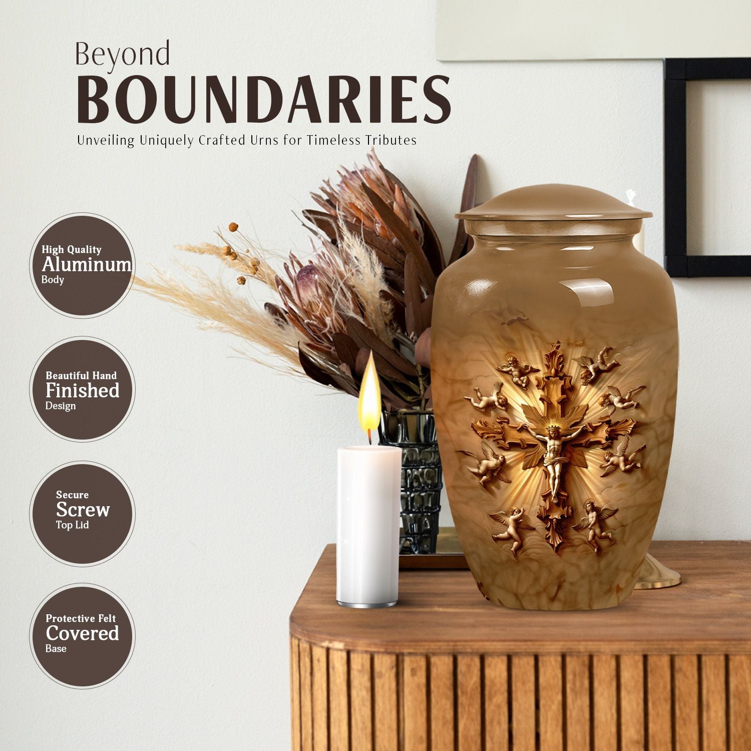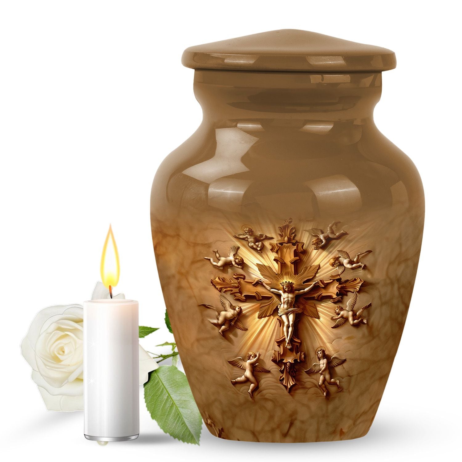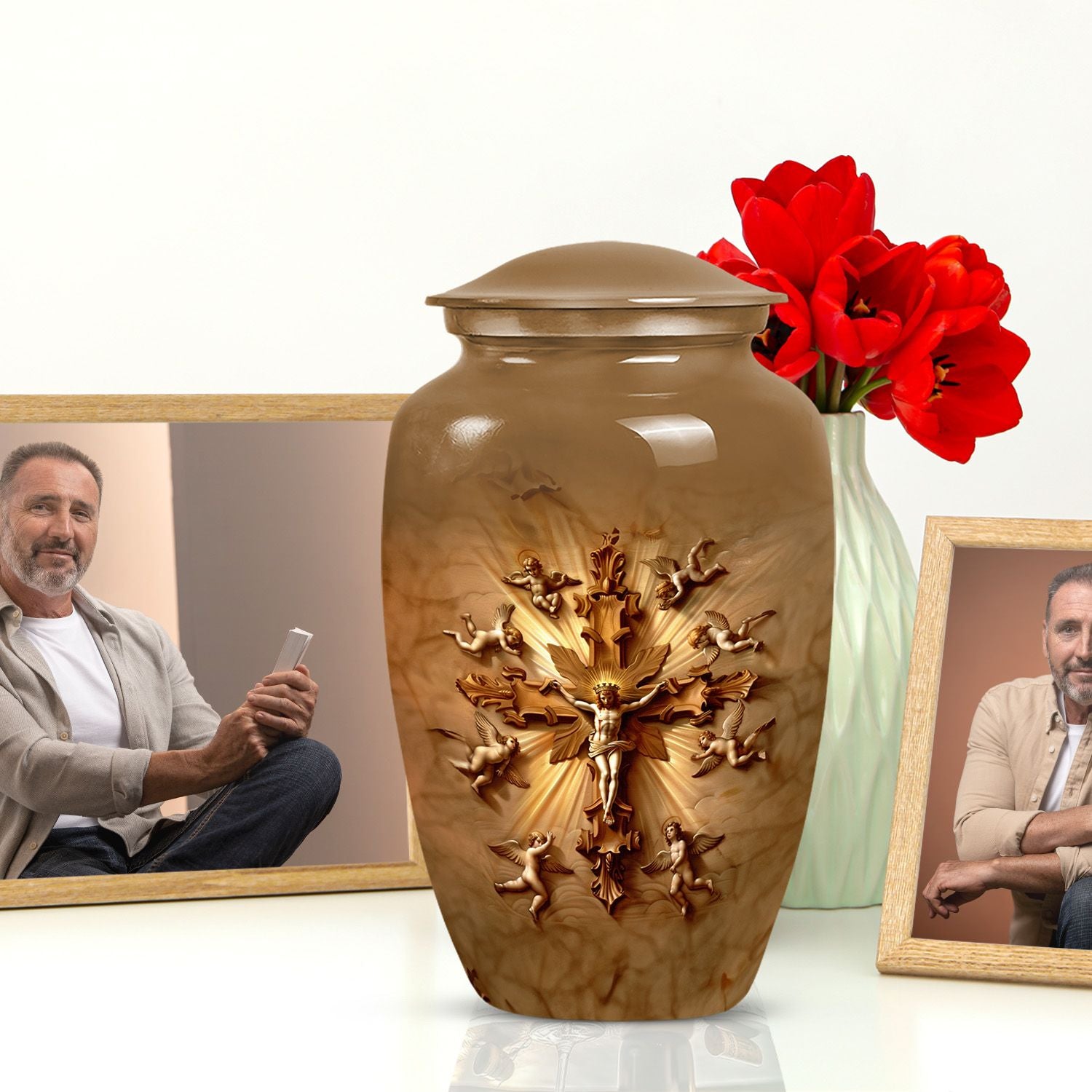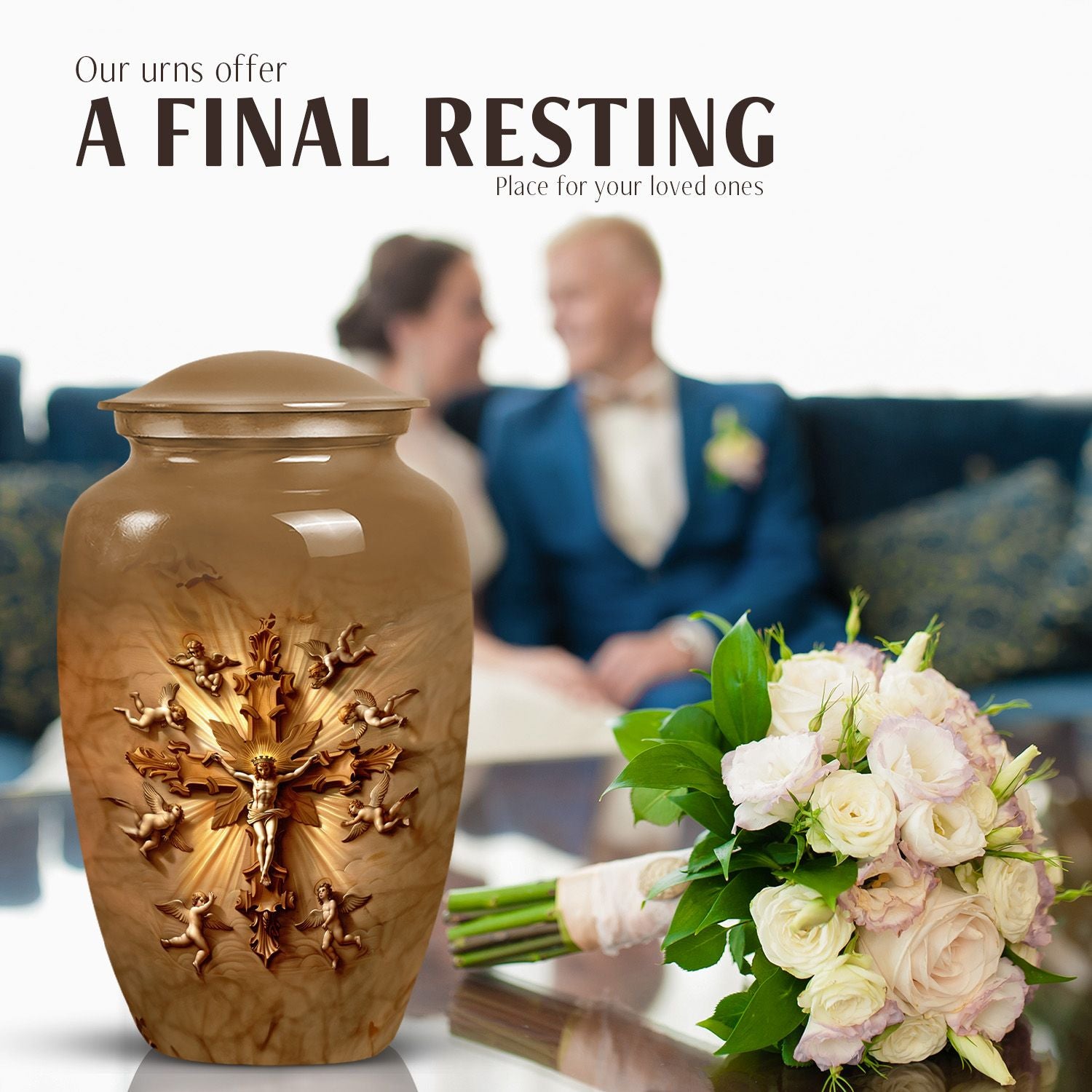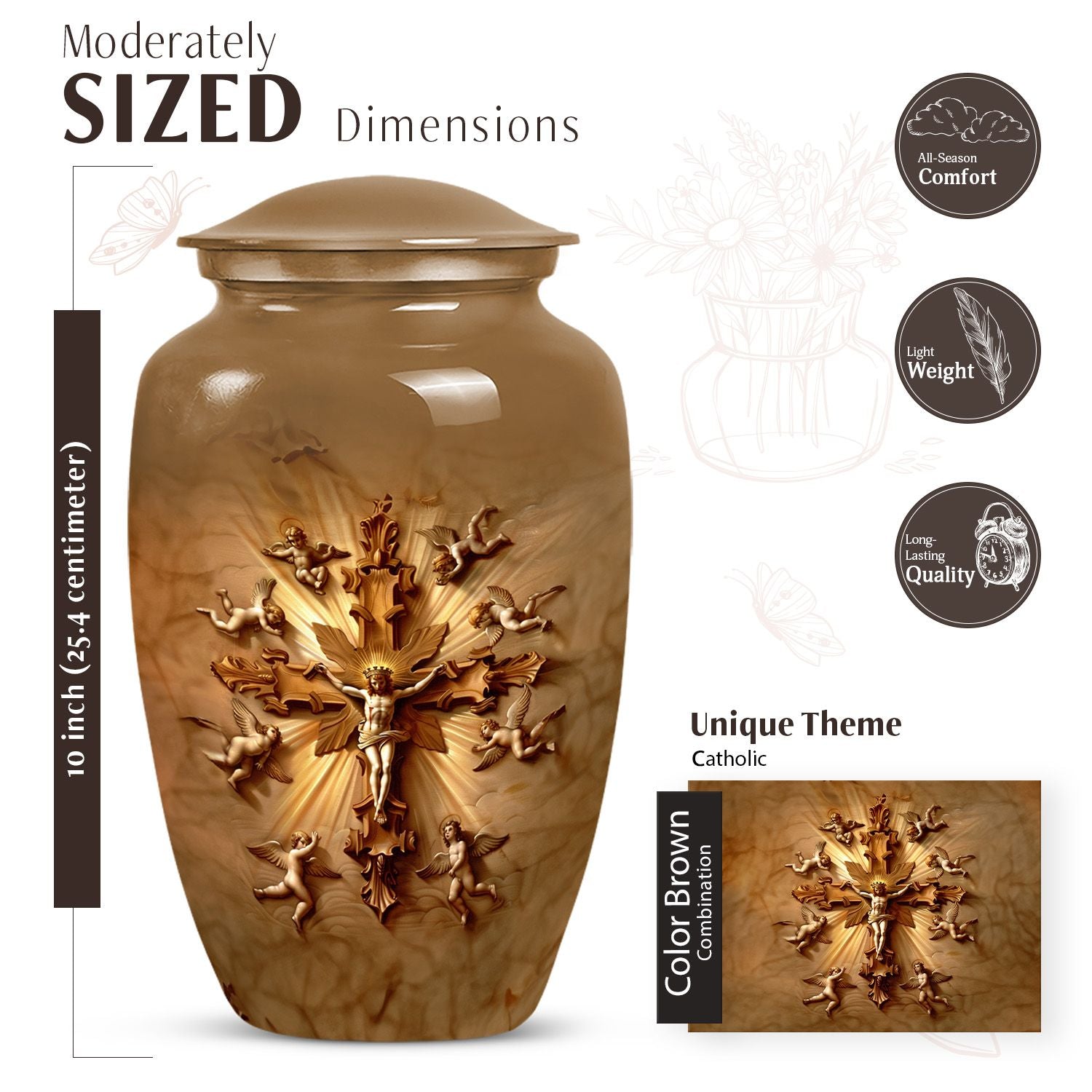 Experience the comfort and tranquility that comes with our meticulously crafted 10-inch Catholic Urn, a standout product in our range of funeral adult urns for human ashes. A timeless reflection of sophistication, this Classic Urn is made from high-quality aluminium. With a weight of just 3.3 pounds, and dimensions standing at a significant 10 inches in height, our urn ensures secure containment of up to 200 cubic inches volume of your loved one's remains. The urn arrives with a complimentary velvet pouch, perfect for keeping the ashes secure and well-preserved. To make your memorial tribute even more special, we offer the option to personalize your urn with engraved names. Exhibiting an abstract theme, this urn is designed particularly for those seeking large urns. Our product is an ideal choice for those searching for memorial forever urns, urn human women, urns for mom, or funeral urns for ashes. Please note, design attributes are not part of this description.