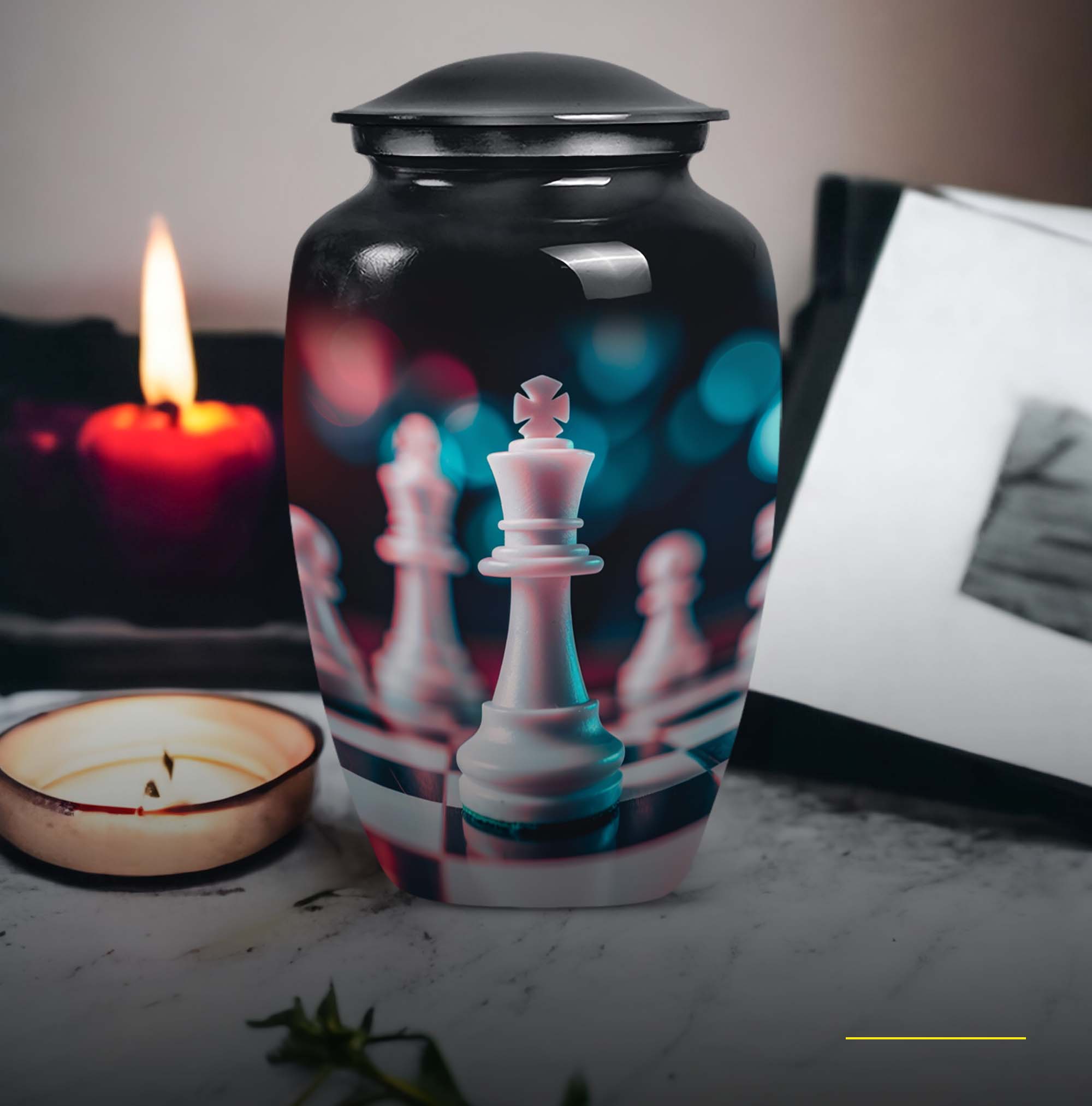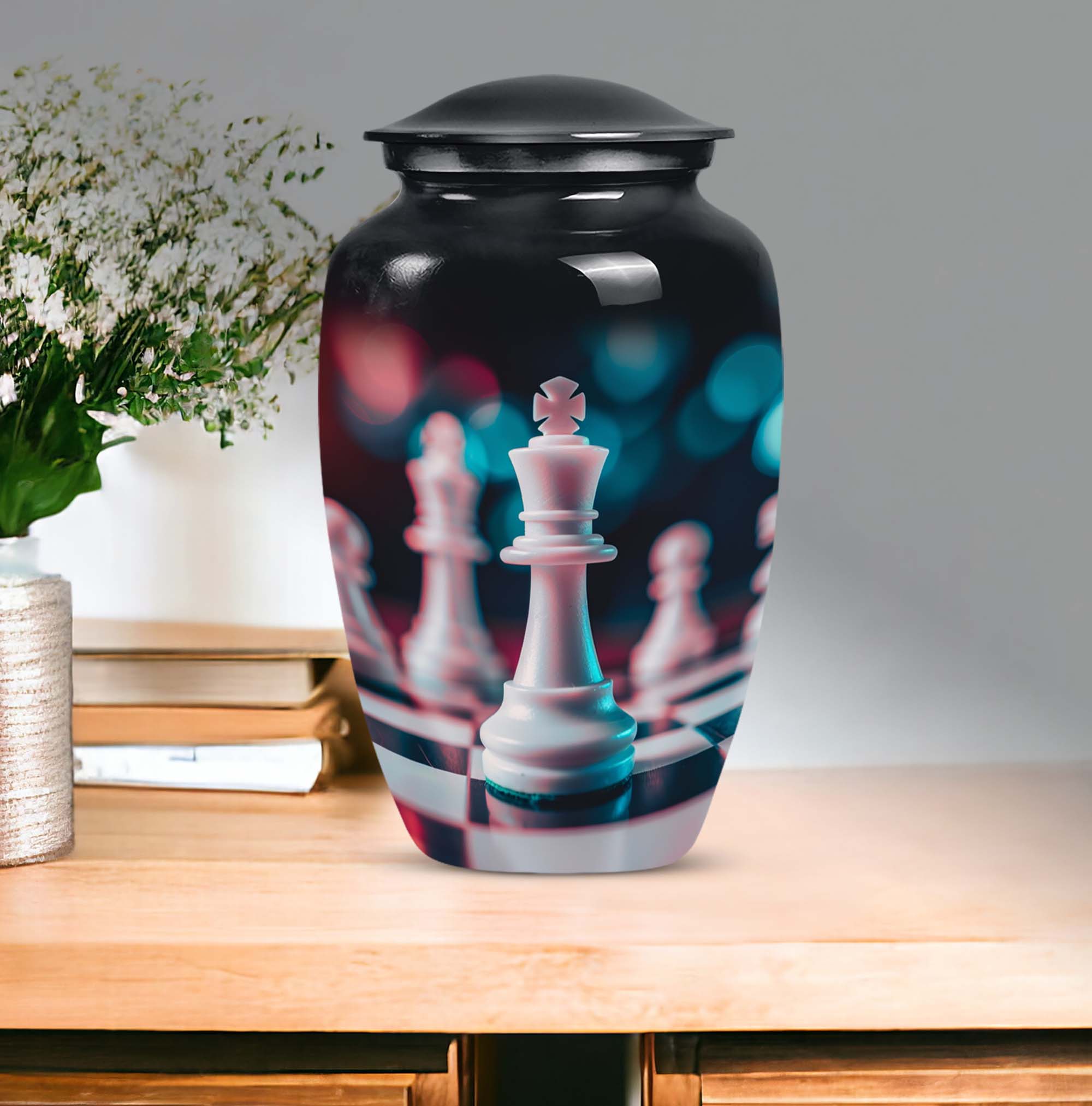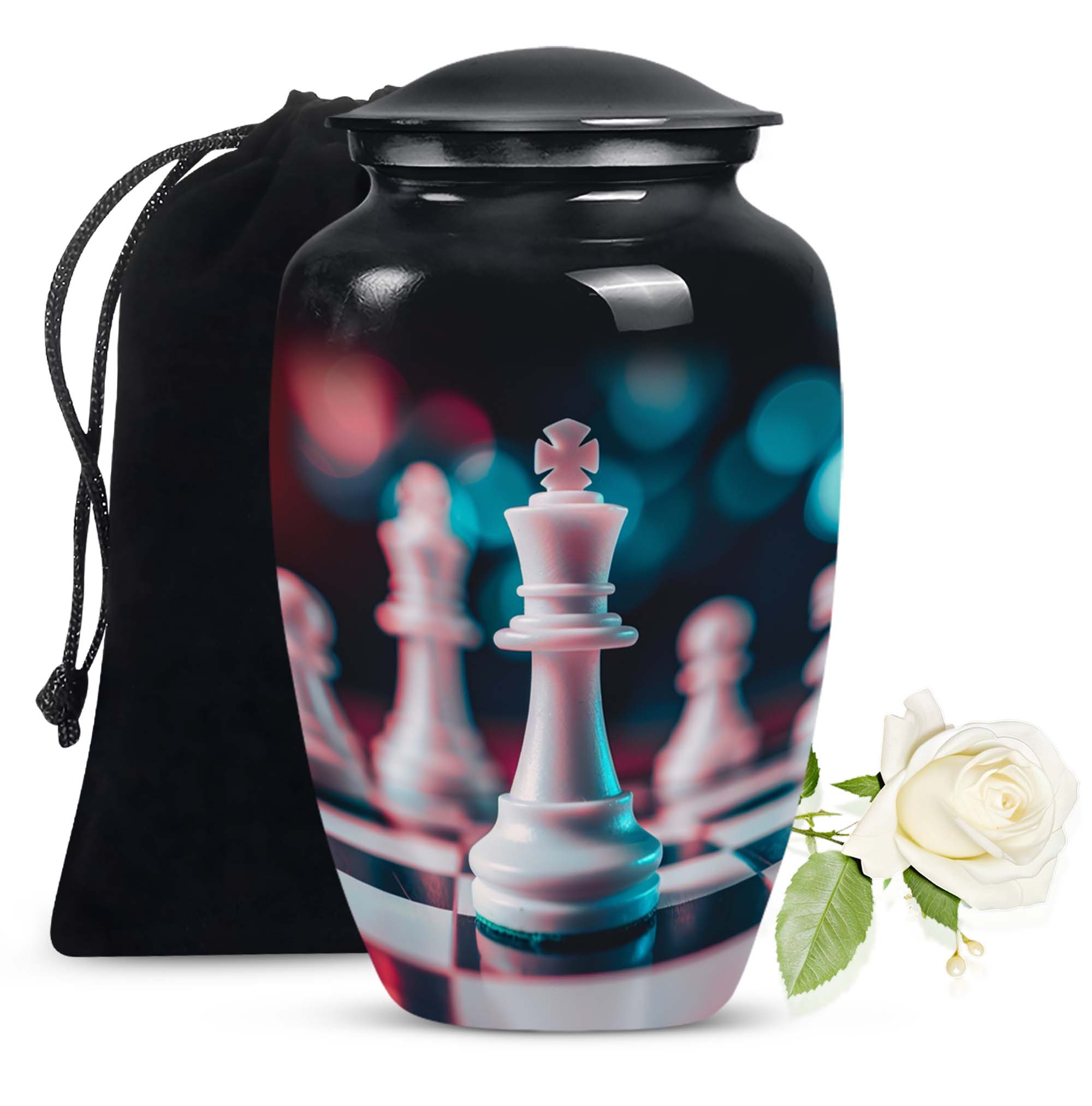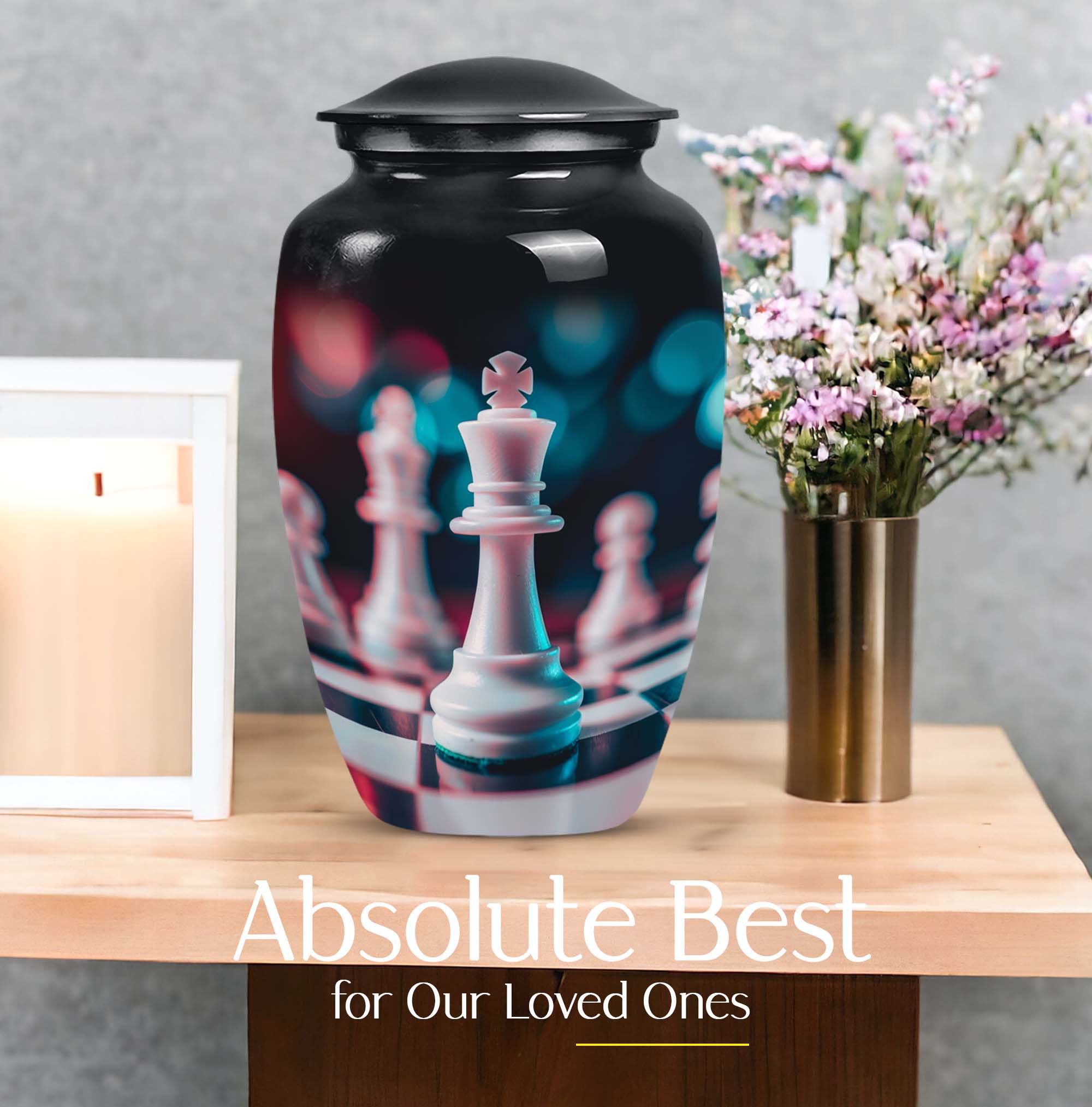 Honor your loved one's memory with our personalized 'Chess Urn.' This unique 10-inch high urn is made from durable Aluminium and carries a weight of 3.3 pounds. Its size accommodates up to 200 cubic inches of ashes, suitable for adults and seniors. The chess-themed design is a tribute to the game's strategic and timeless nature, reflecting the qualities of your treasured one. This beautifully crafted large urn comes with a velvet pouch for dignified containment and safekeeping of the remains. Apart from its striking visual appeal, this Chess Urn offers an optional customization feature. You can personalize it with engraved names, adding an intimate touch to this memorial keepsake. This cremation urn makes a fitting tribute to your beloved one, reflecting their unique personality and life. Whether you are searching for 'funeral urns for mom' or 'urns for female,' our Chess Urn stands as a unique option, inviting you to remember and cherish those wonderful memories.