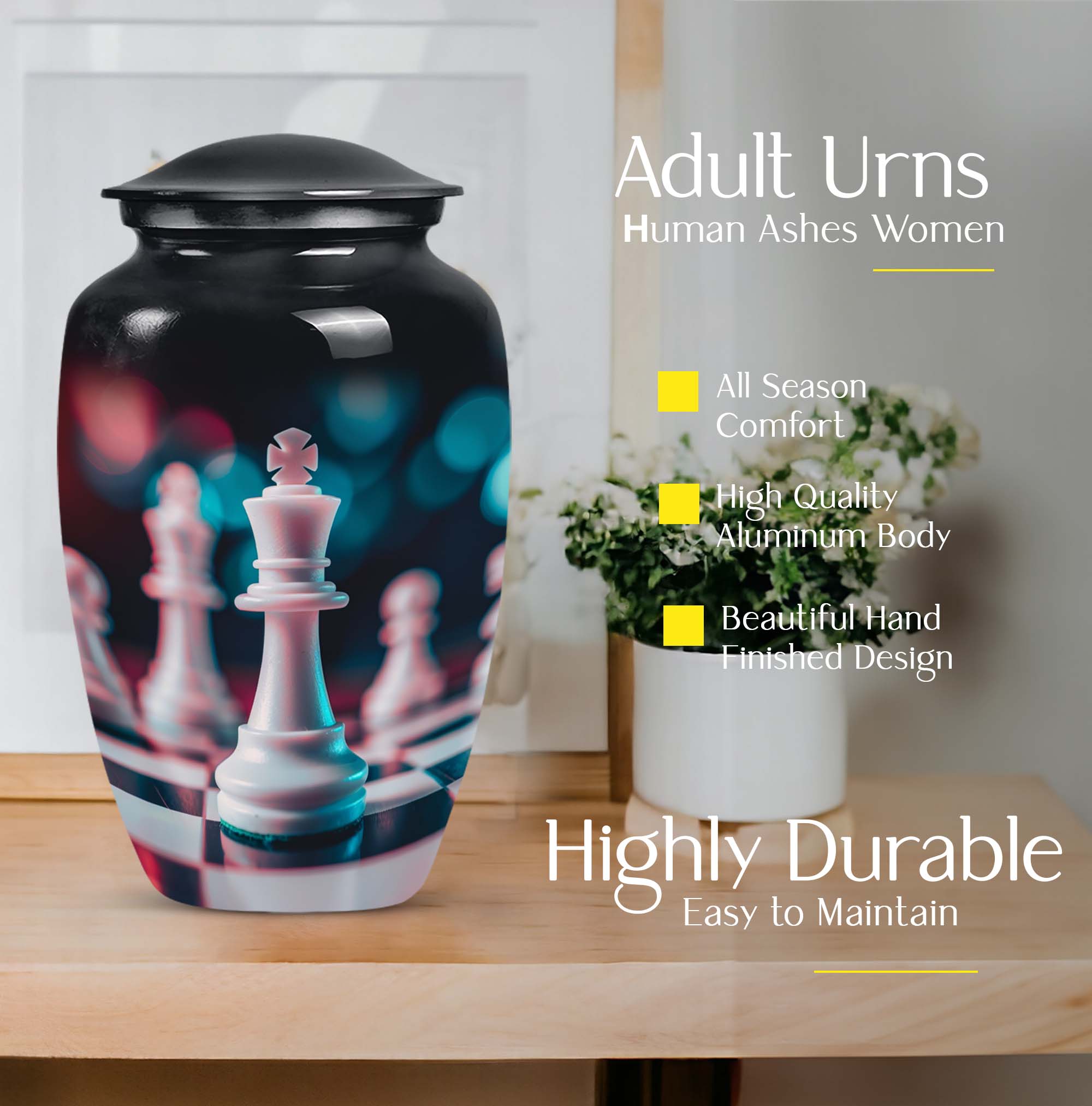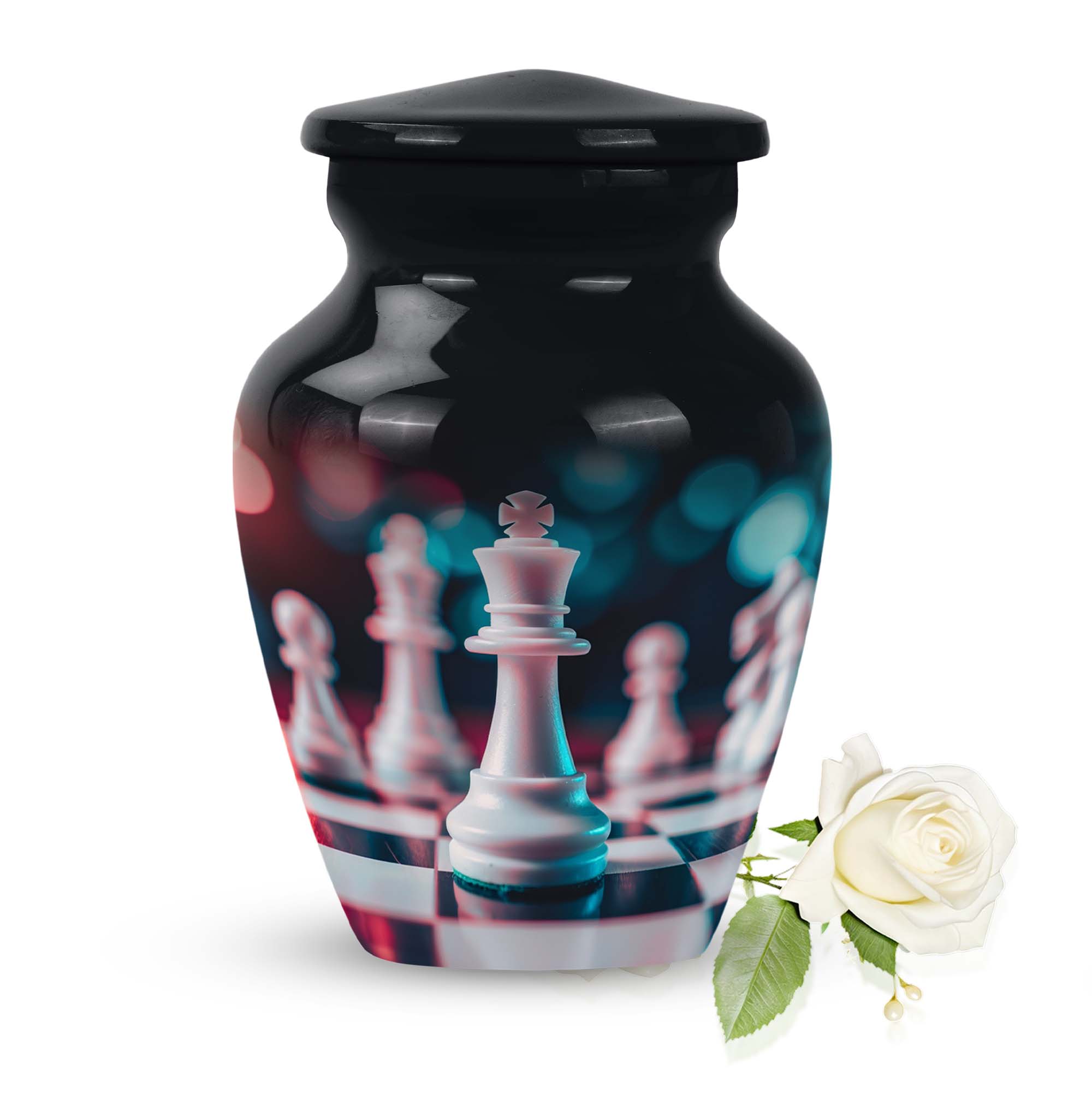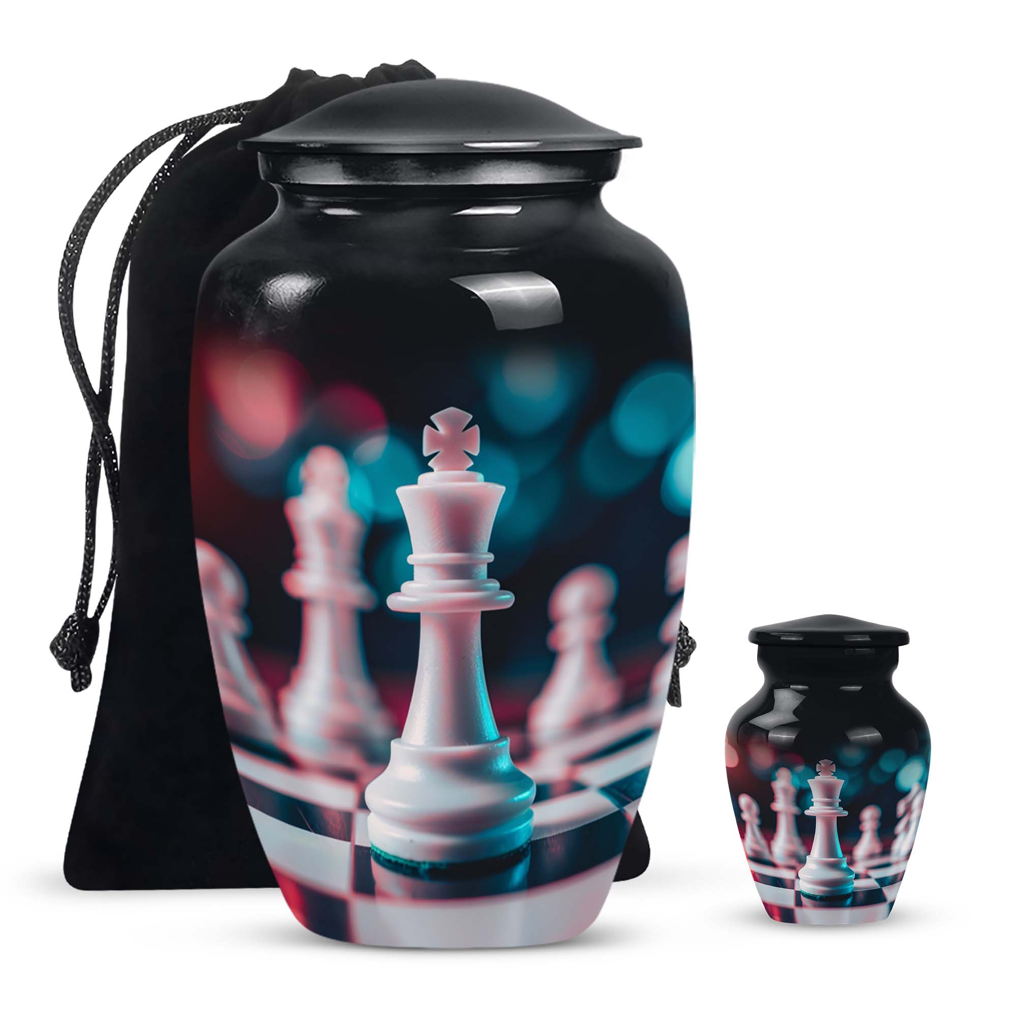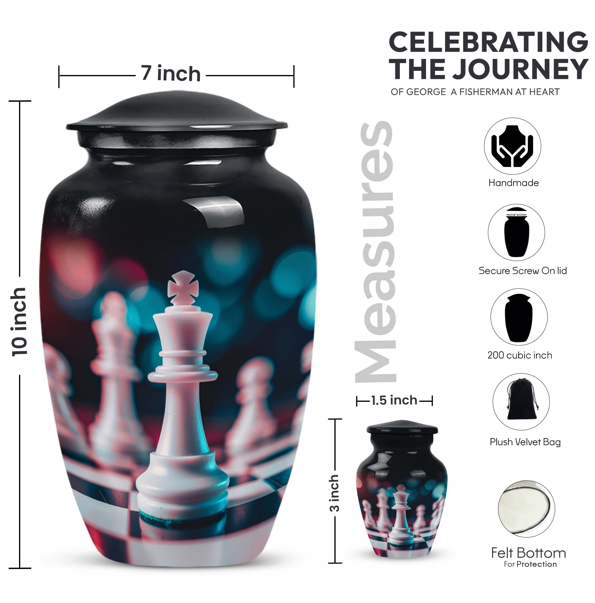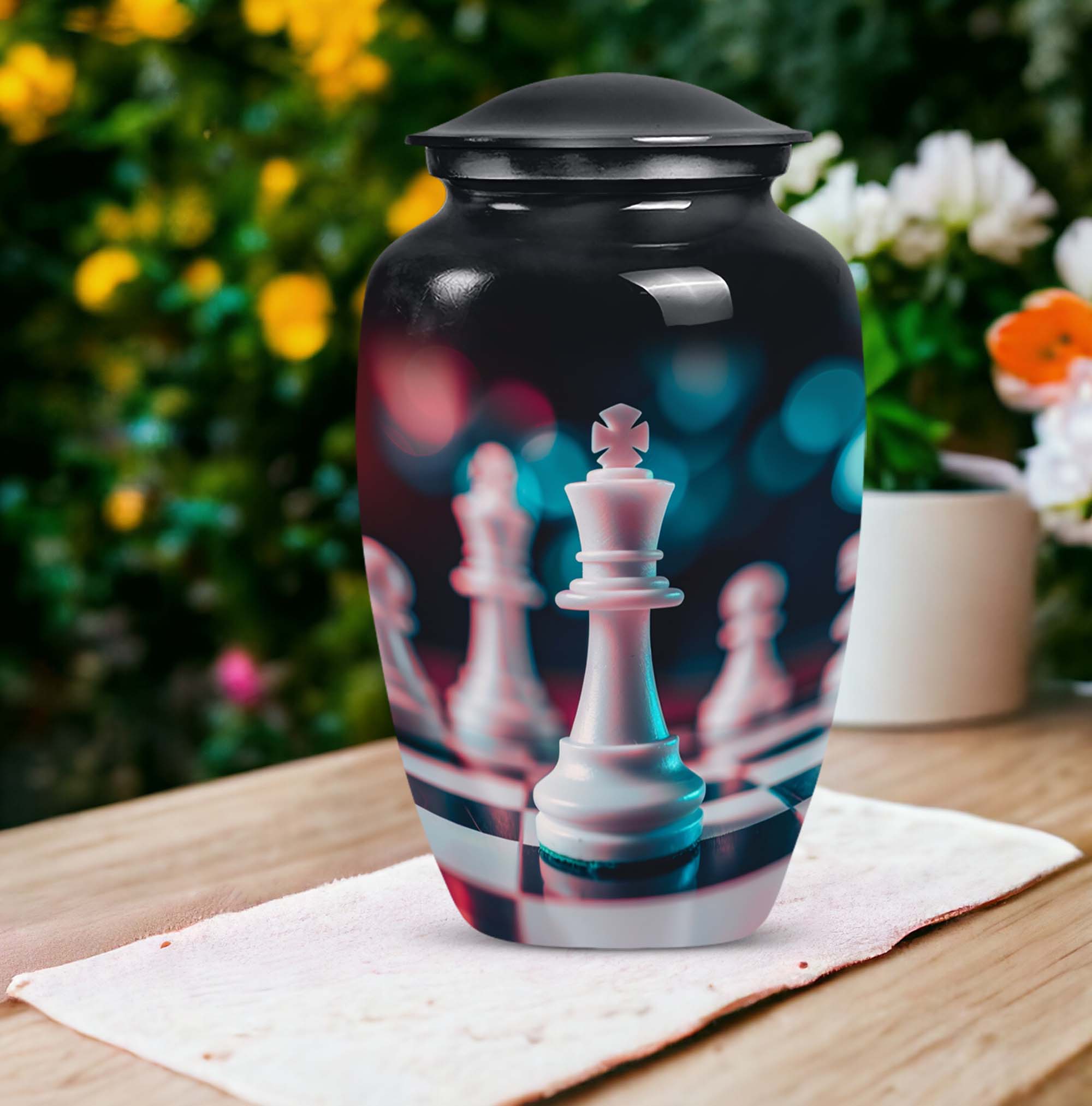 Honor your loved one's memory with our personalized 'Chess Urn.' This unique 10-inch high urn is made from durable Aluminium and carries a weight of 3.3 pounds. Its size accommodates up to 200 cubic inches of ashes, suitable for adults and seniors. The chess-themed design is a tribute to the game's strategic and timeless nature, reflecting the qualities of your treasured one. This beautifully crafted large urn comes with a velvet pouch for dignified containment and safekeeping of the remains. Apart from its striking visual appeal, this Chess Urn offers an optional customization feature. You can personalize it with engraved names, adding an intimate touch to this memorial keepsake. This cremation urn makes a fitting tribute to your beloved one, reflecting their unique personality and life. Whether you are searching for 'funeral urns for mom' or 'urns for female,' our Chess Urn stands as a unique option, inviting you to remember and cherish those wonderful memories.