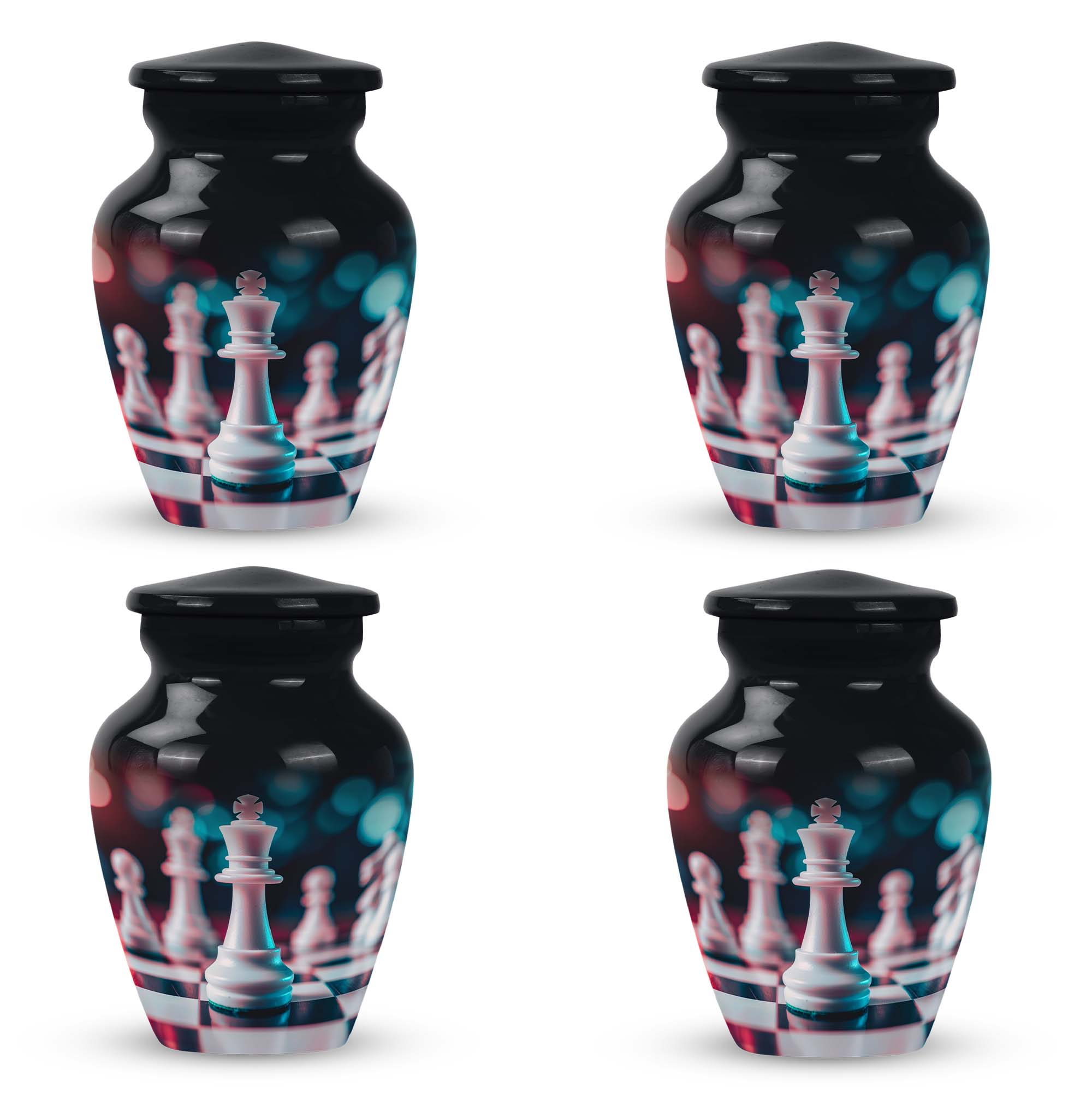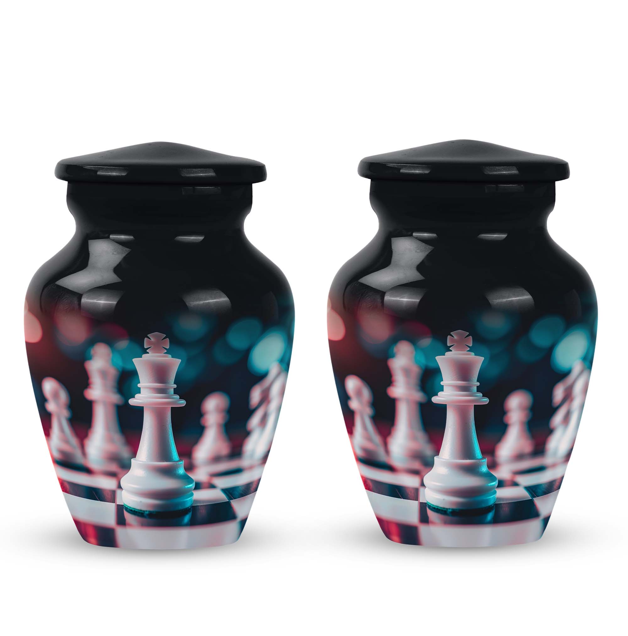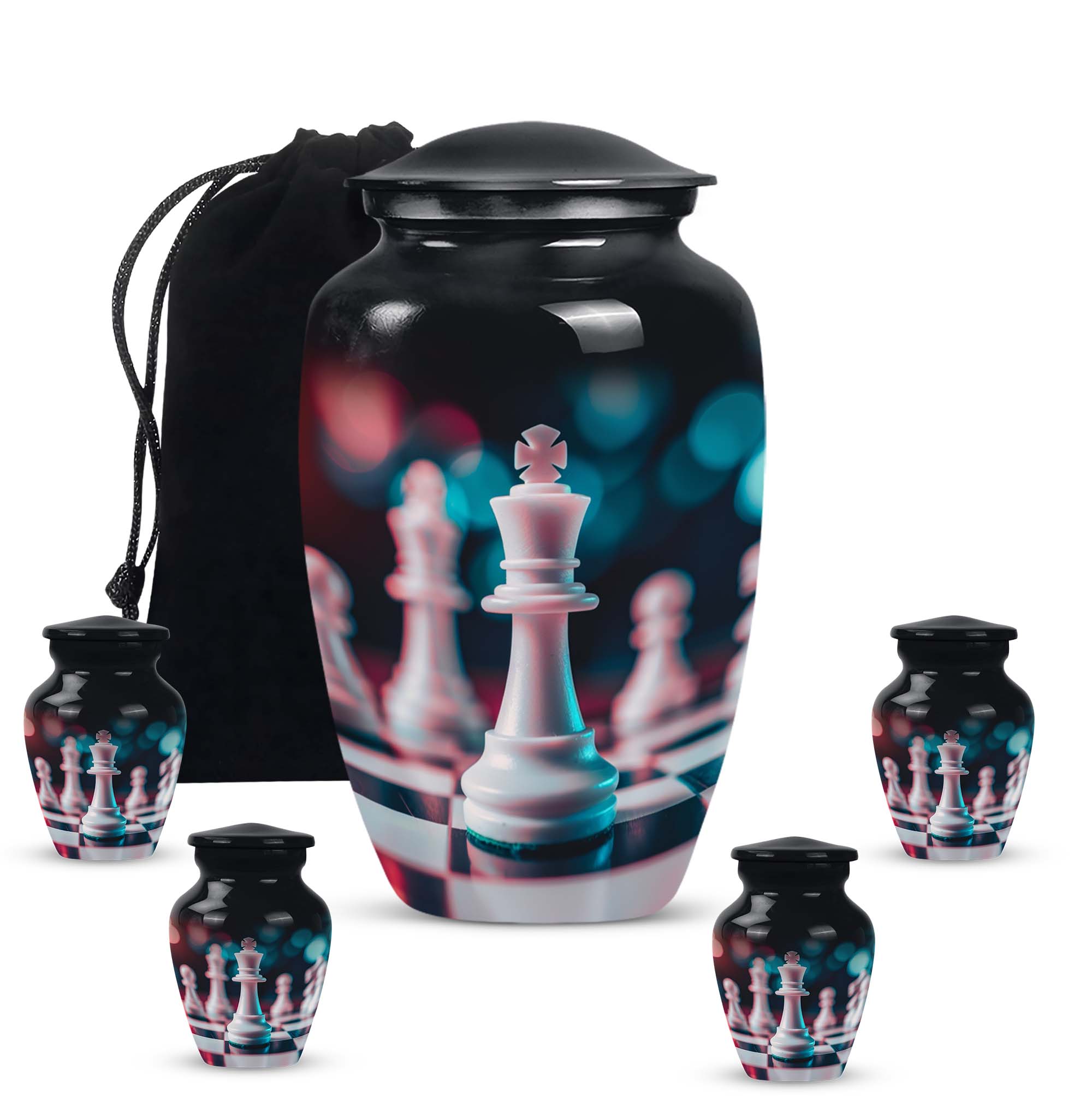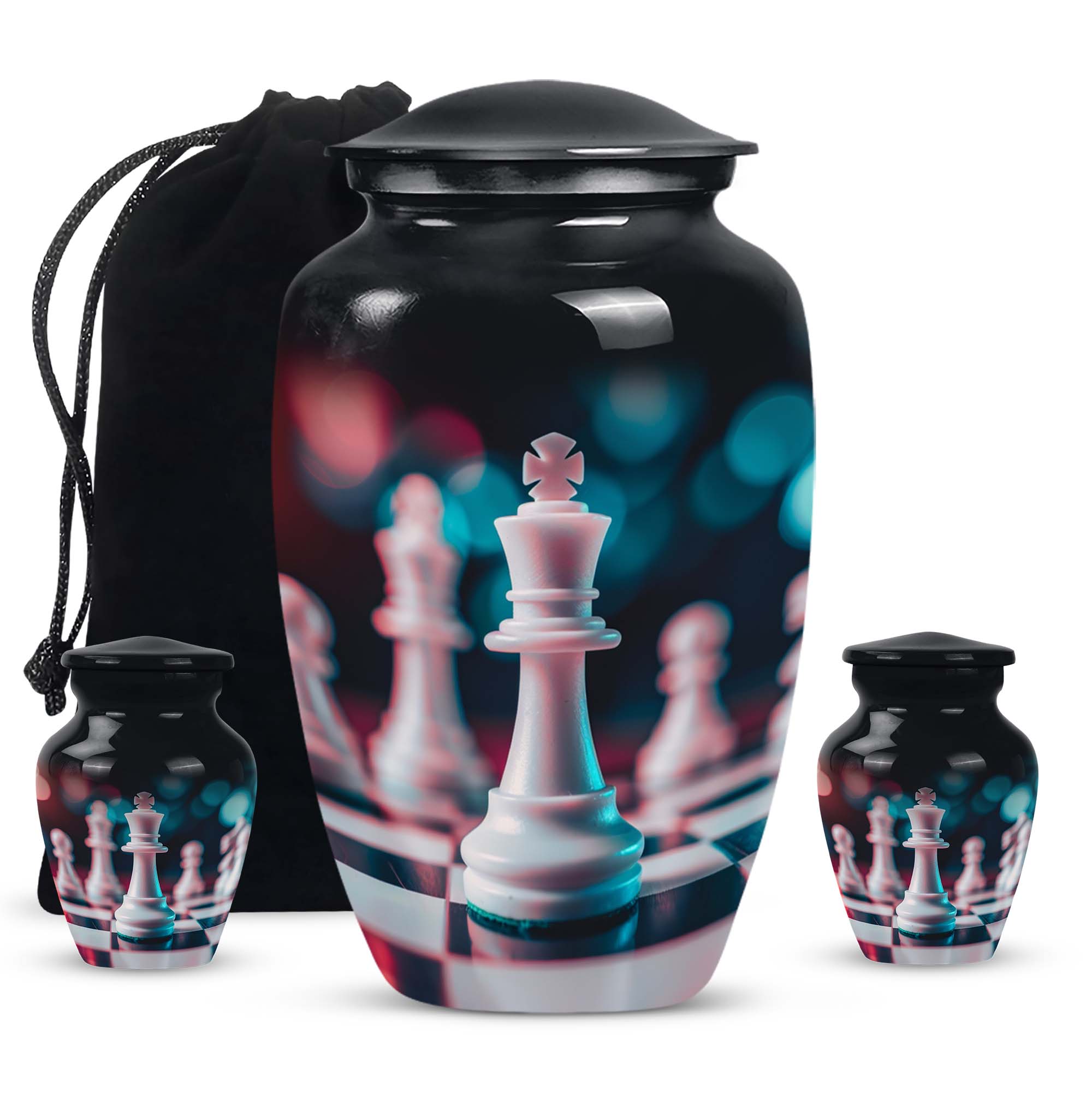 Honor your loved one's memory with our personalized 'Chess Urn.' This unique 10-inch high urn is made from durable Aluminium and carries a weight of 3.3 pounds. Its size accommodates up to 200 cubic inches of ashes, suitable for adults and seniors. The chess-themed design is a tribute to the game's strategic and timeless nature, reflecting the qualities of your treasured one. This beautifully crafted large urn comes with a velvet pouch for dignified containment and safekeeping of the remains. Apart from its striking visual appeal, this Chess Urn offers an optional customization feature. You can personalize it with engraved names, adding an intimate touch to this memorial keepsake. This cremation urn makes a fitting tribute to your beloved one, reflecting their unique personality and life. Whether you are searching for 'funeral urns for mom' or 'urns for female,' our Chess Urn stands as a unique option, inviting you to remember and cherish those wonderful memories.