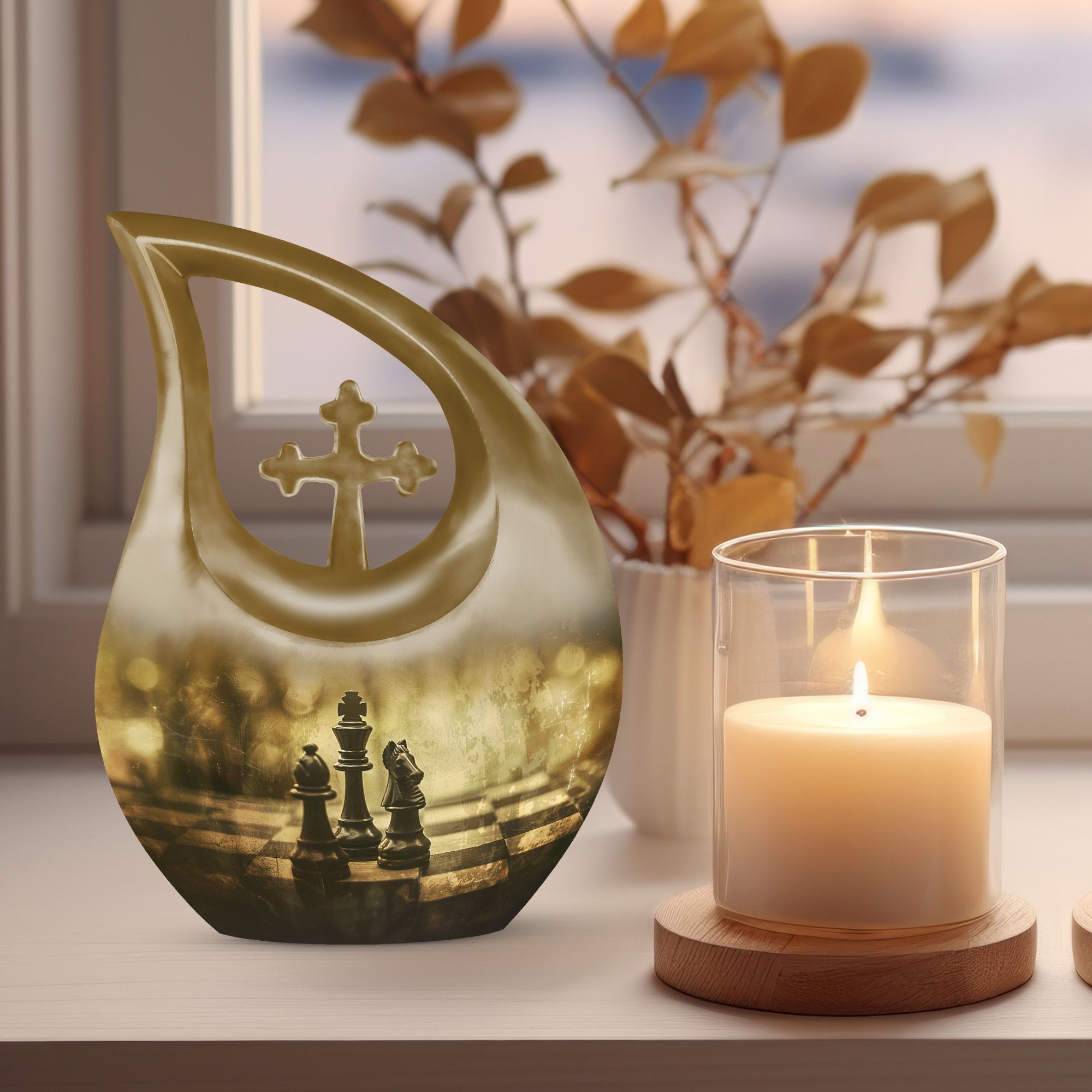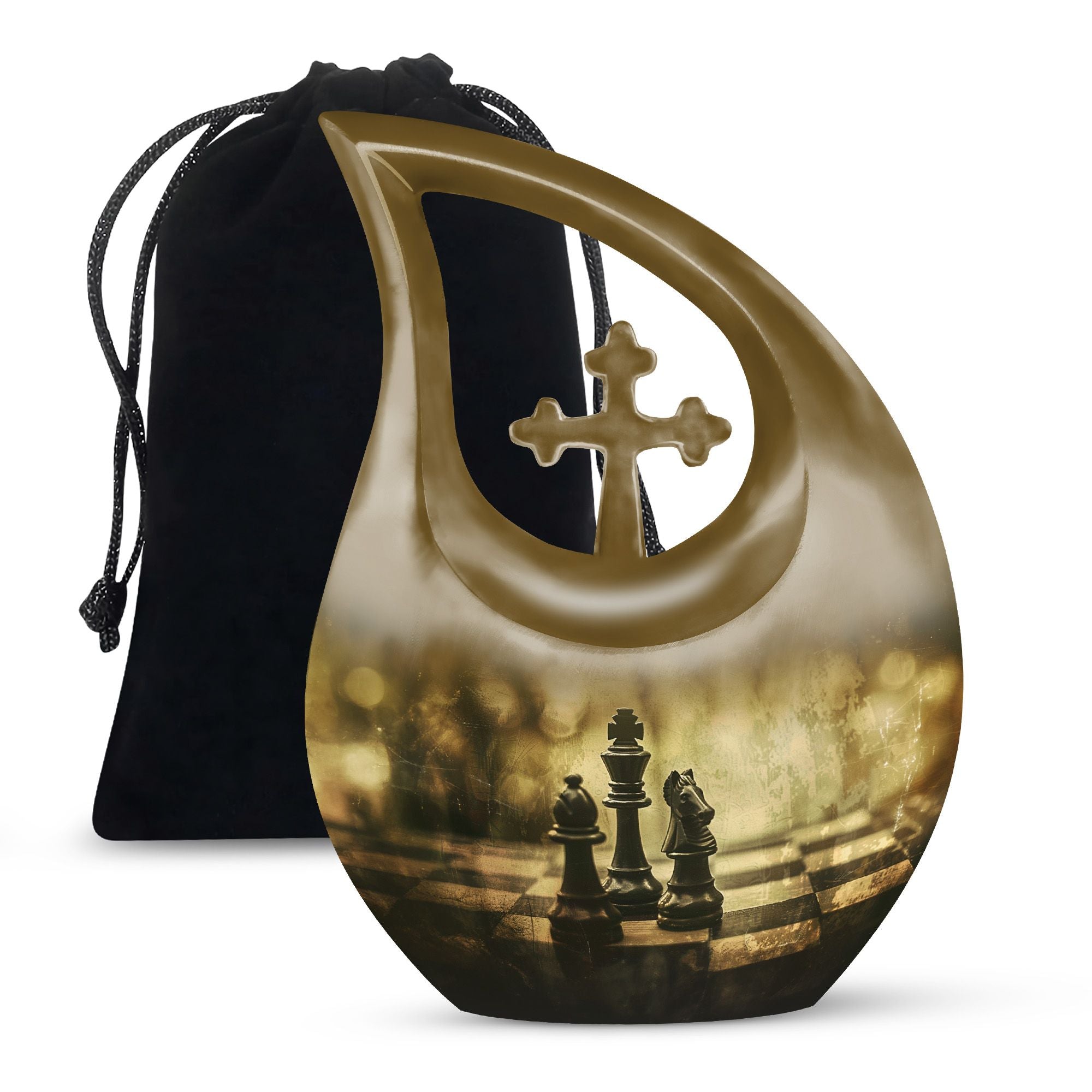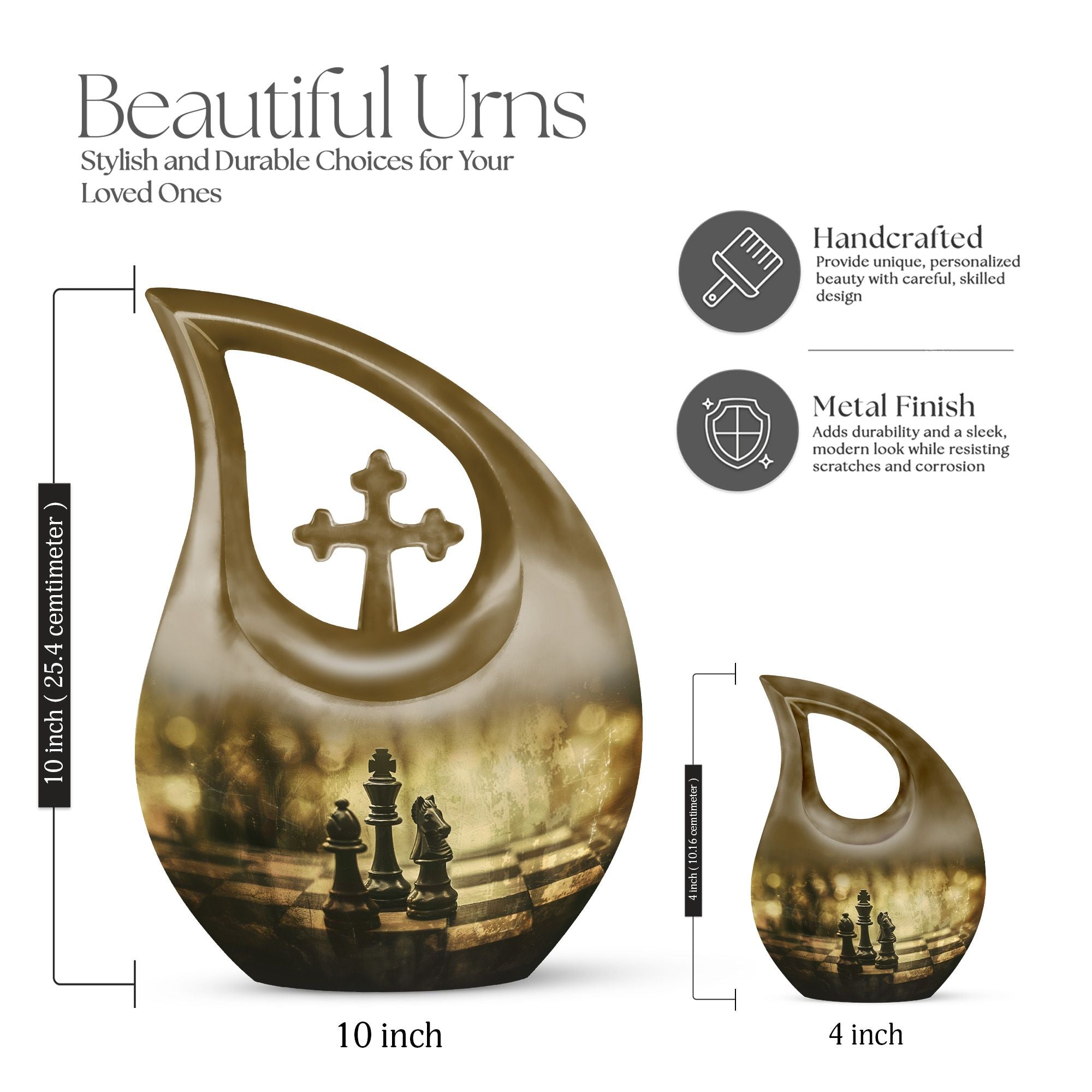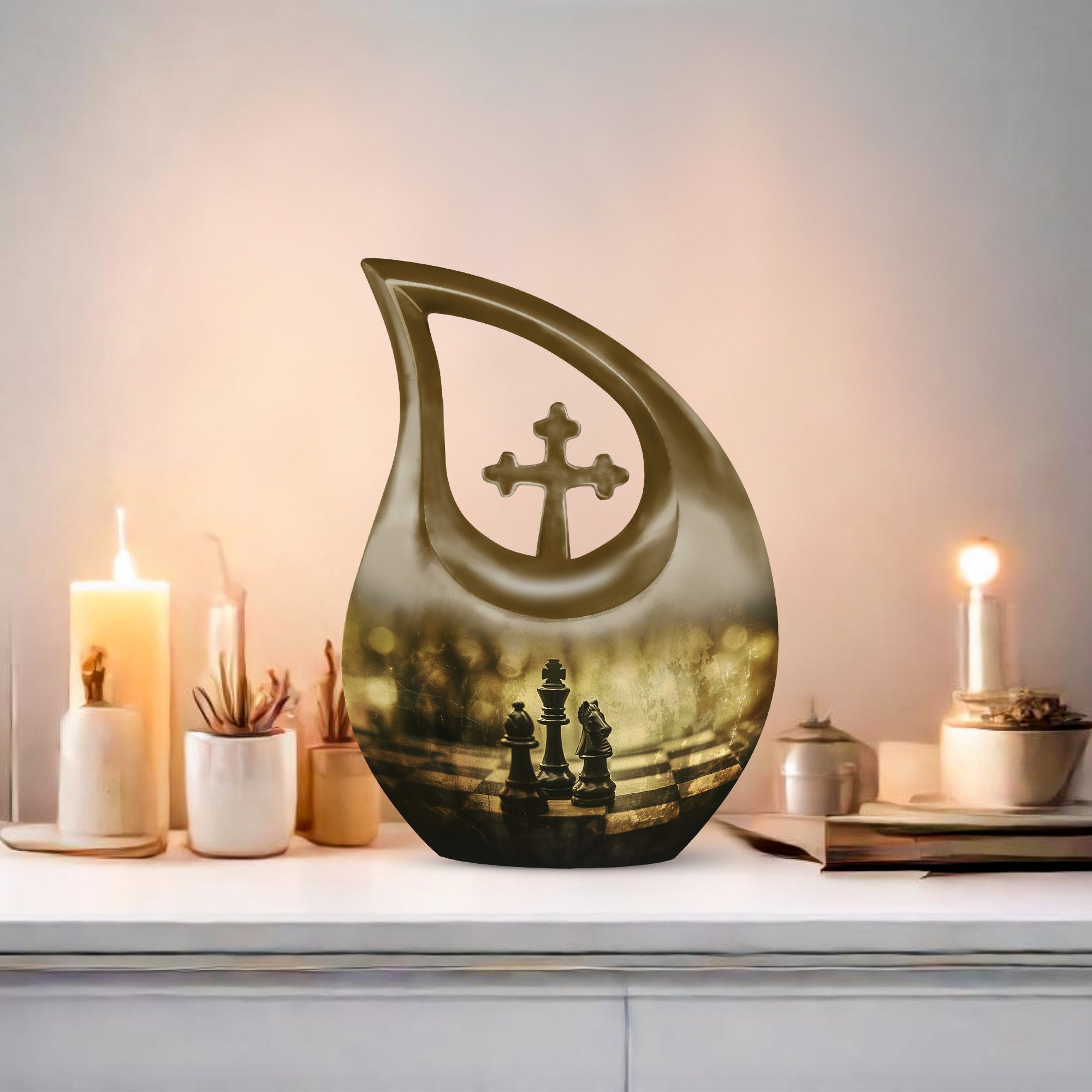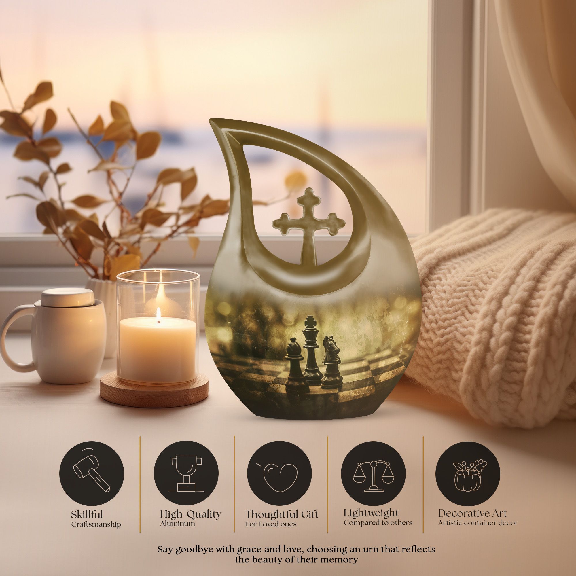 Cherish the memory of a loved one with our exquisite Chess Urn, a wonderful tribute to any table or mantel. Cast from high quality Aluminium, the Urn stands at 10 inches in height and weighs 3.3 pounds. This imposing urn draws its inspiration from the Chess theme, presenting a tangible memorial to an avid mind-thinker. It carries a Cross-Drop URN DESIGN that makes it an appealing addition to your memorabilia. It provides a capacity of 200 cubic inches. This large urn can be personalized with engraved names, allowing you to honor your departed loved one in a special and unique way. It comes with a velvet pouch for containment of ashes, ensuring discreet and safe storage. The Chess Urn is more than an object; it's a vessel that holds treasured memories, making it an essential urn for dad and a symbolic statement piece. Common keywords are 'Cremation Containers, Small Urn, Miniature Urns, Box Urns For Human Ashes'.