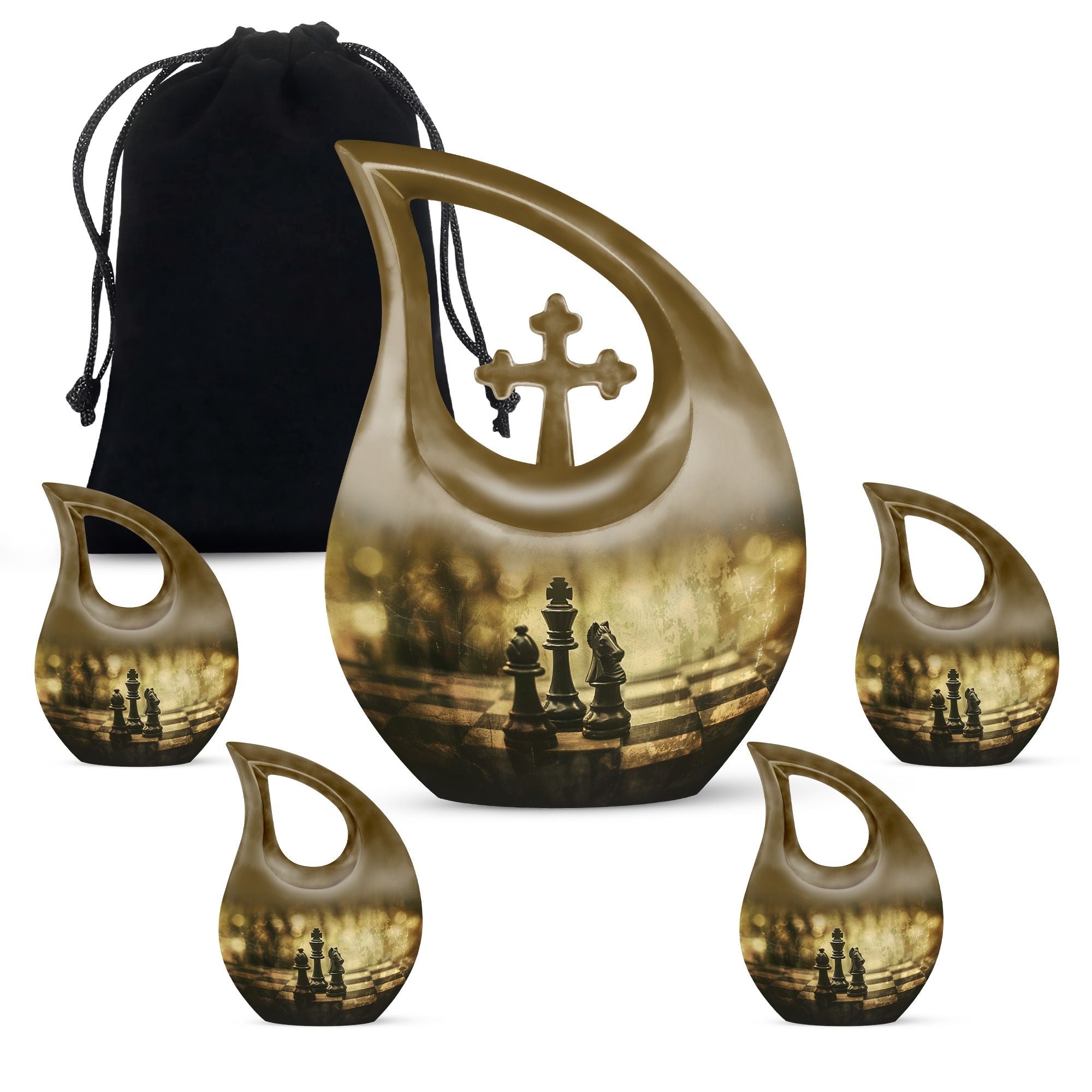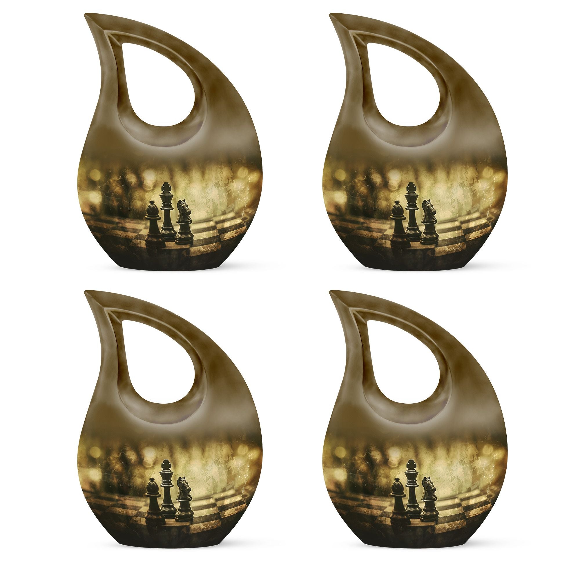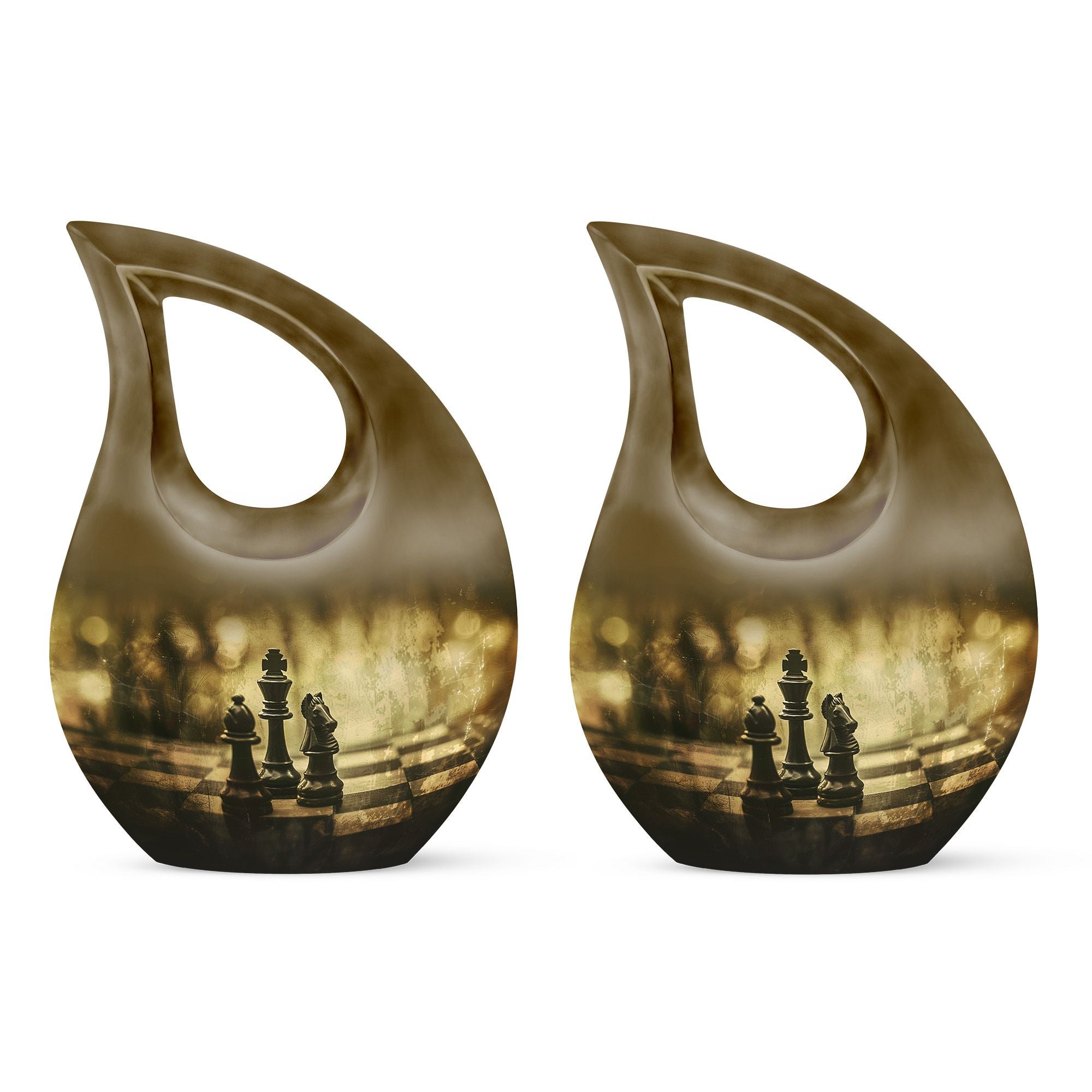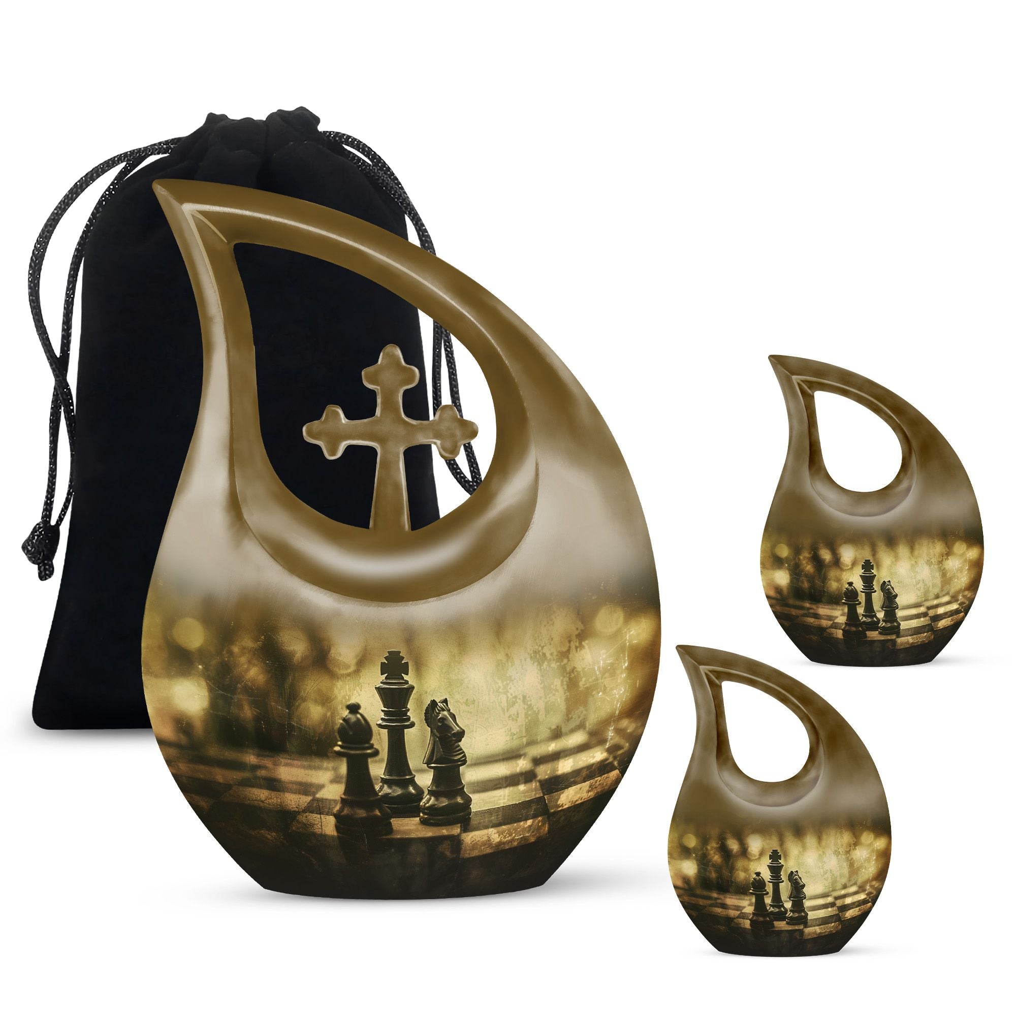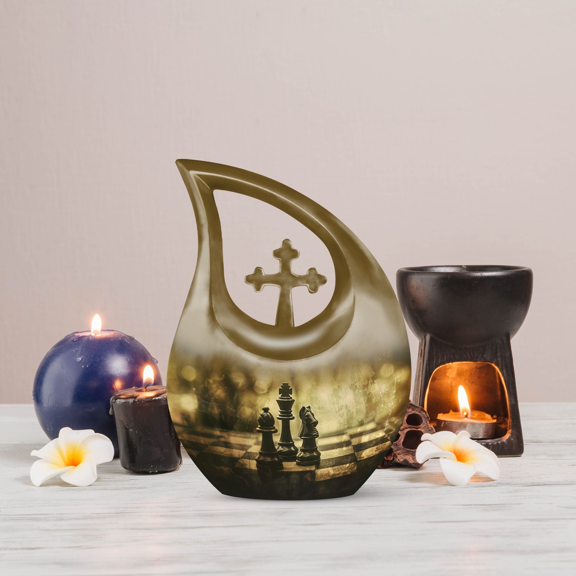 Cherish the memory of a loved one with our exquisite Chess Urn, a wonderful tribute to any table or mantel. Cast from high quality Aluminium, the Urn stands at 10 inches in height and weighs 3.3 pounds. This imposing urn draws its inspiration from the Chess theme, presenting a tangible memorial to an avid mind-thinker. It carries a Cross-Drop URN DESIGN that makes it an appealing addition to your memorabilia. It provides a capacity of 200 cubic inches. This large urn can be personalized with engraved names, allowing you to honor your departed loved one in a special and unique way. It comes with a velvet pouch for containment of ashes, ensuring discreet and safe storage. The Chess Urn is more than an object; it's a vessel that holds treasured memories, making it an essential urn for dad and a symbolic statement piece. Common keywords are 'Cremation Containers, Small Urn, Miniature Urns, Box Urns For Human Ashes'.
