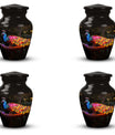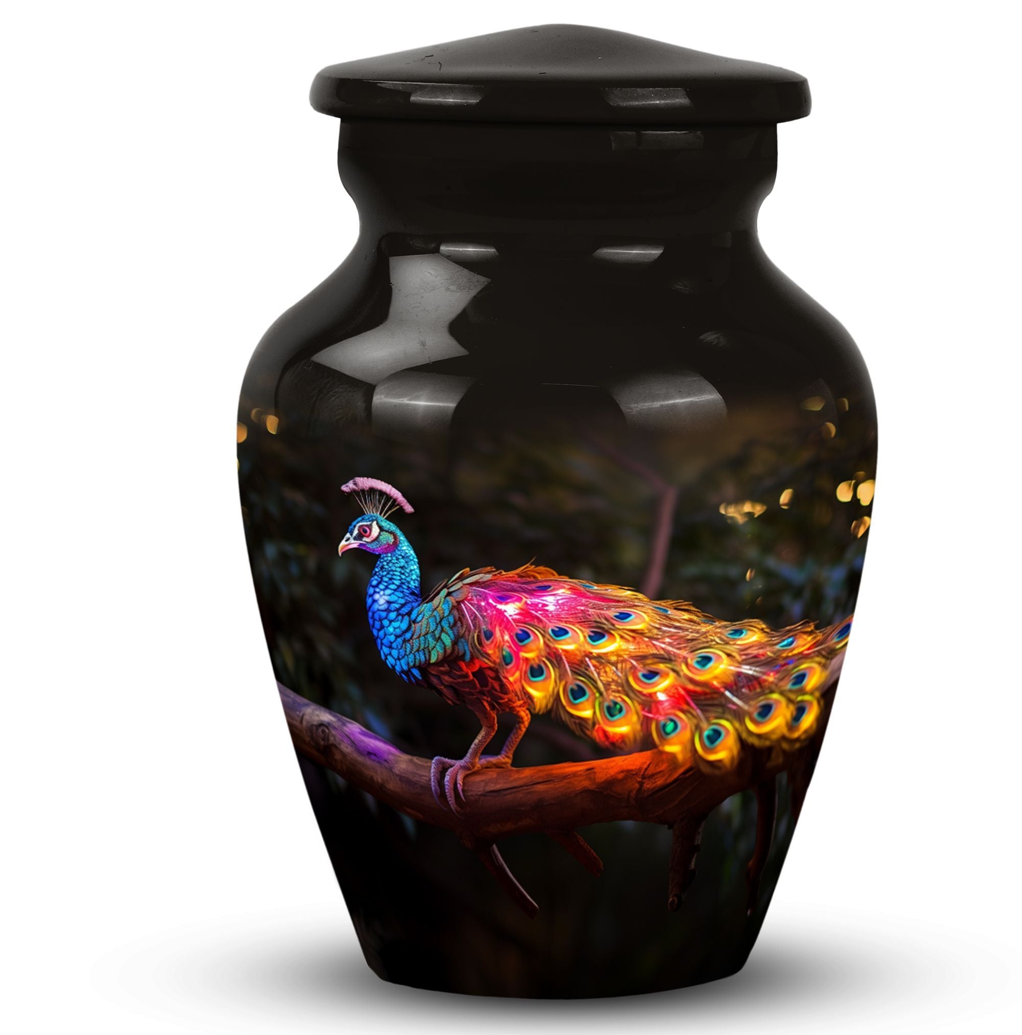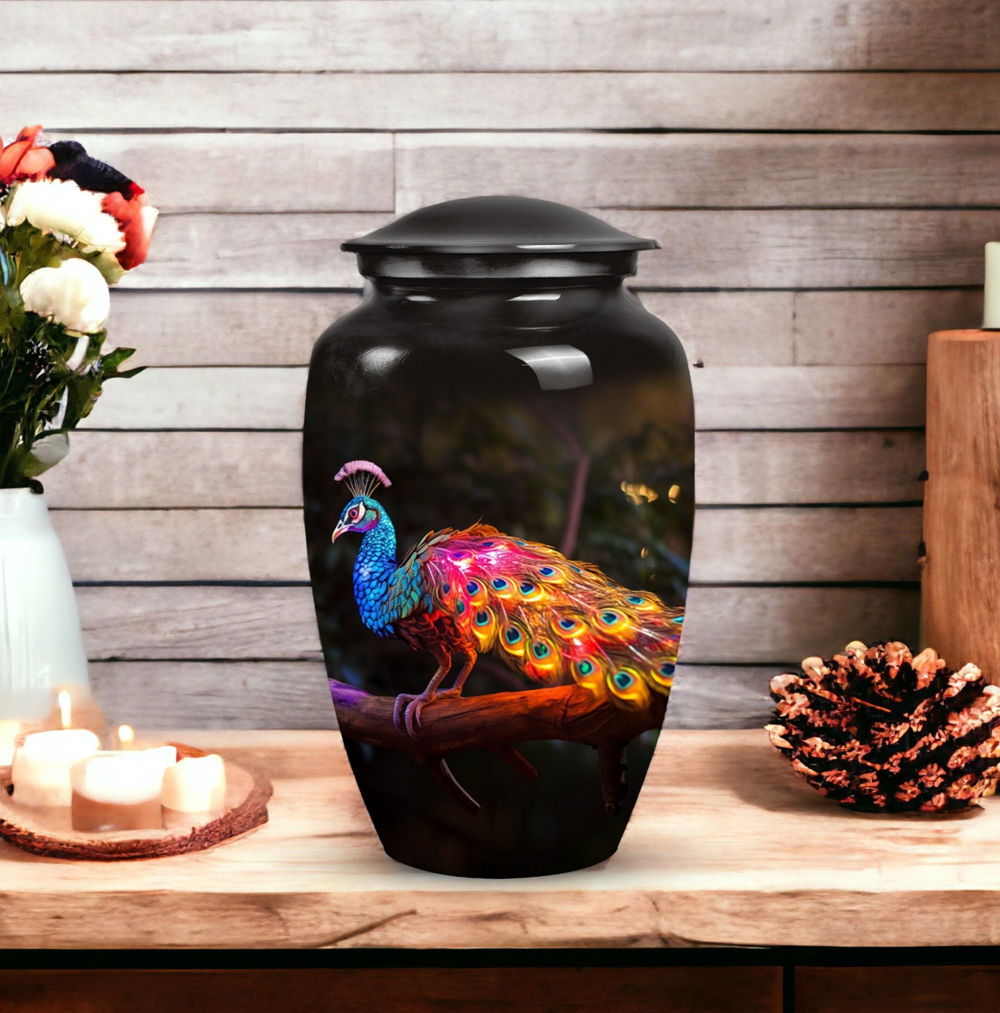 Elegantly crafted, our Peacock Urn is a thoughtful and dignified way to honor the memory of your loved ones. This comforting urn for ashes is made of high-quality aluminium, offering longevity and durability. The large size of the urn means it can hold up to 200 cubic inches, making it perfect for adults. Measuring 3 inches in size and weighing 3.3 pounds, the urn is easily manageable. Standing 10 inches in height, it's an eye-catching memorial urn that can fit into any space. Able to personalize with engraved names, this urn truly becomes a bespoke piece for remembering your cherished family member or friend. Packaged with a velvet pouch for containment of ashes, the level of thought and detail accounted for is unmatched. Ideal for various uses such as burial urns for adults, urn containers or can be a special urn for dad. The classic design and personalization feature make it one of the most searched custom cremation urns. Remember your loved ones in a way that is as unique as they were.