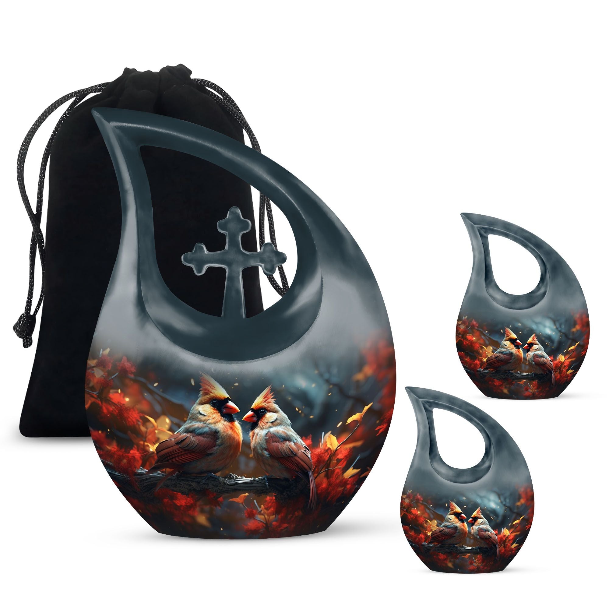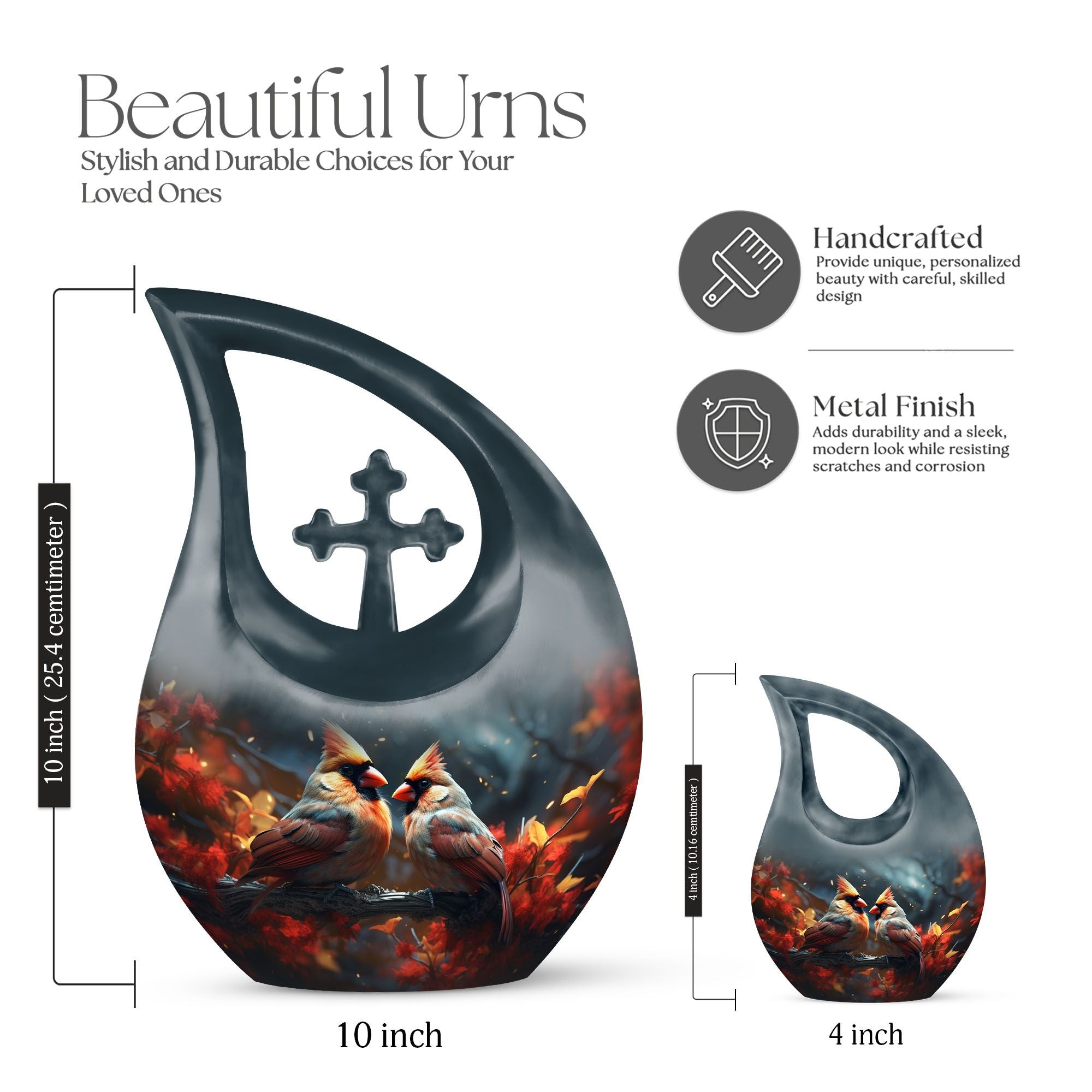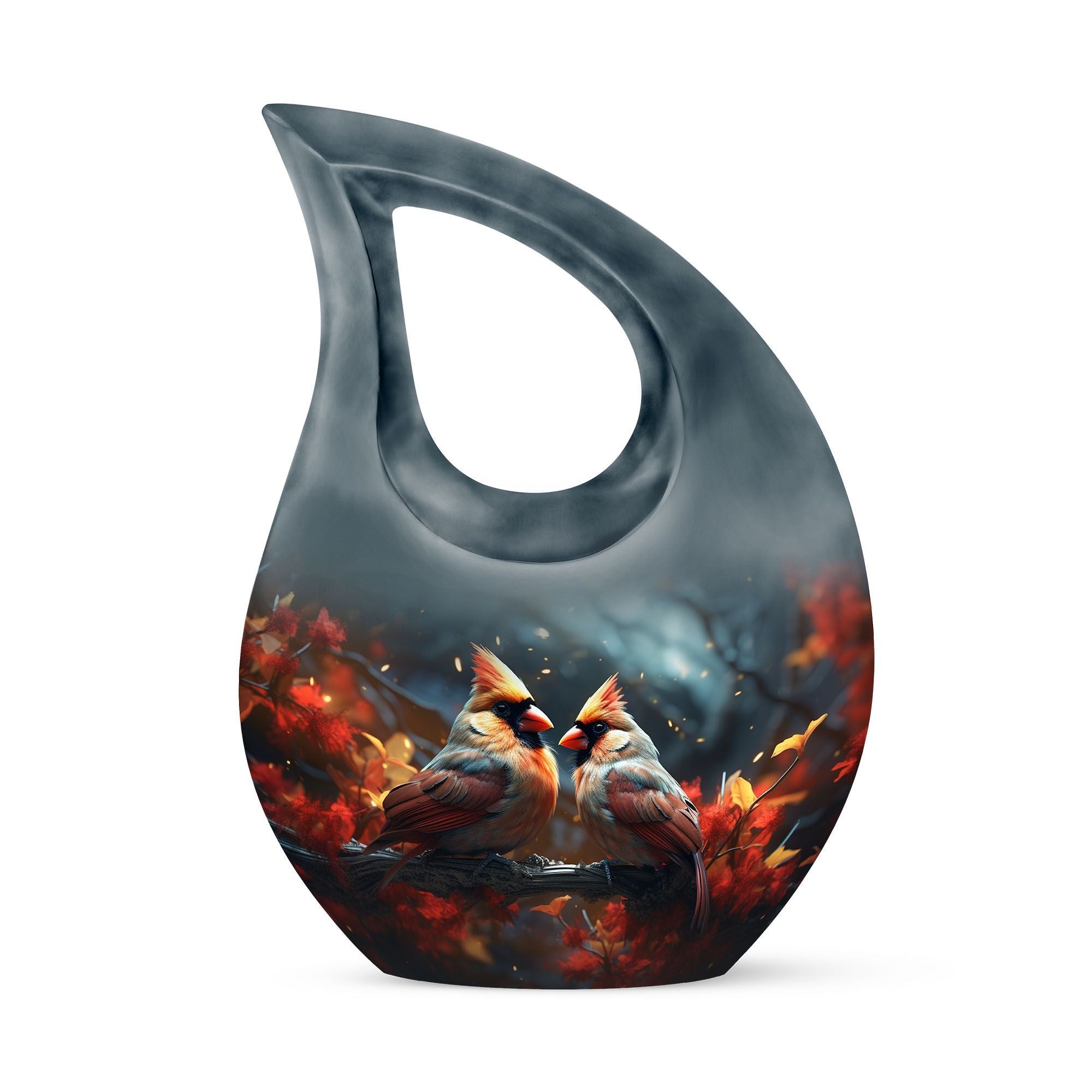 Celebrate everlasting love and togetherness with the Orange Cardinal Bird Cremation Urn for Couples, a stunning symbol of devotion and peace. Designed for both men and women, this urn embodies warmth and remembrance, ideal for urns for ashes adult female mom or human urns for ashes adult male. Expertly crafted from premium aluminum, this large and keepsake urn set features a radiant orange and gold cardinal motif — representing faith and eternal love. The fine artistry and protective lacquer finish ensure that these urns for adult male and urns for adult female ashes remain beautiful for generations. The secure screw-top lid keeps the ashes safe and preserved with dignity. Perfect for display or burial, this urn set can serve as ash urns for humans male or urns for ashes adult female mother, offering families the option to share and cherish memories through matching keepsakes. Features: Material: Premium handcrafted aluminum Dimensions: Height 10 inches (large urn), 3 inches (keepsake urns) Capacity: Large urn holds 200 cubic inches; keepsakes hold a portion of ashes Lid: Secure screw-top lid for safe closure Design: Orange cardinal birds on floral backdrop — symbolizing love and remembrance Use: Suitable adult male urn, urn for adult female ashes, or couple memorial keepsakes The Orange Cardinal Bird Cremation Urn Set is a heartfelt tribute — a radiant reflection of shared love that continues to soar, even beyond life itself.