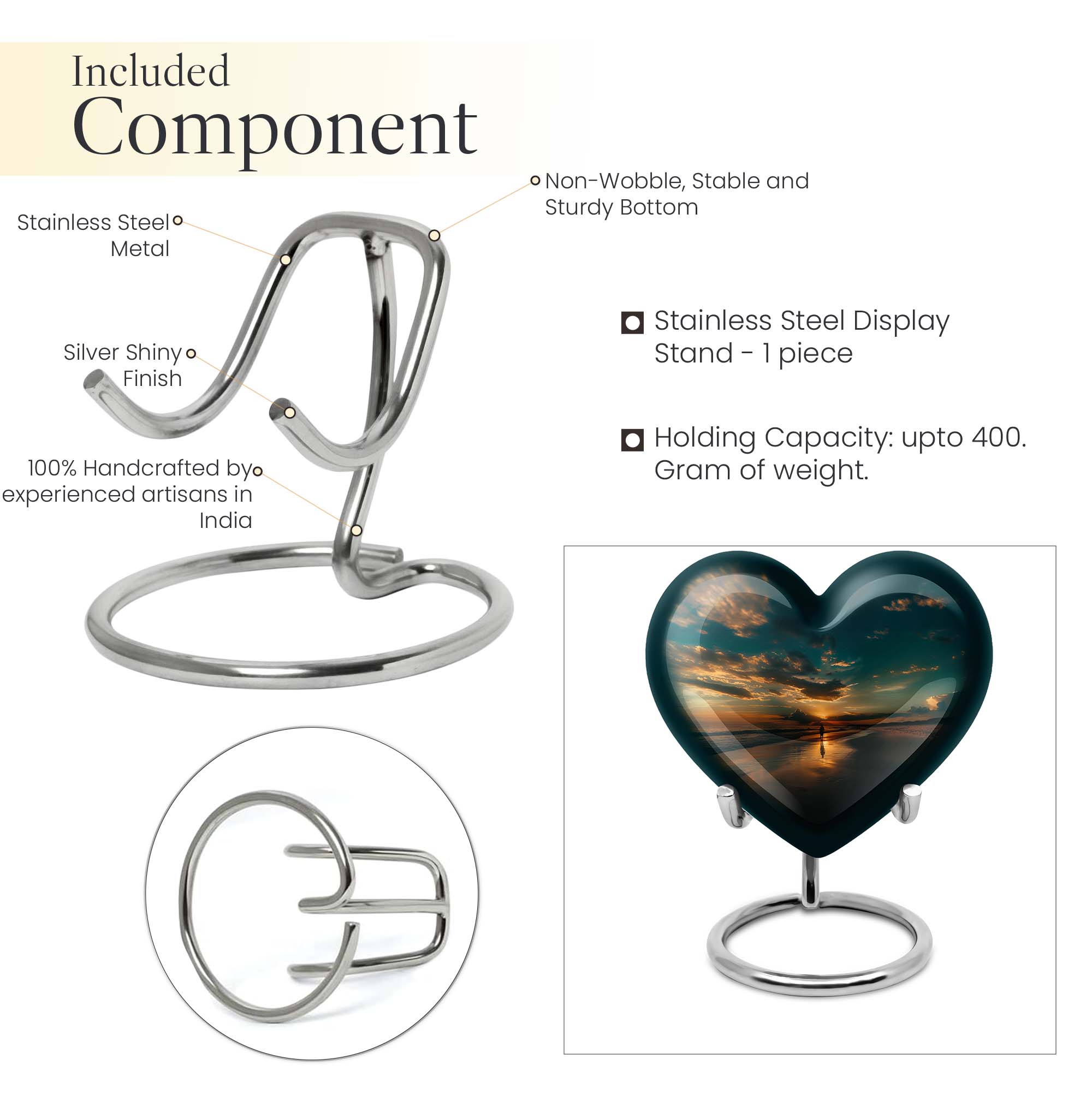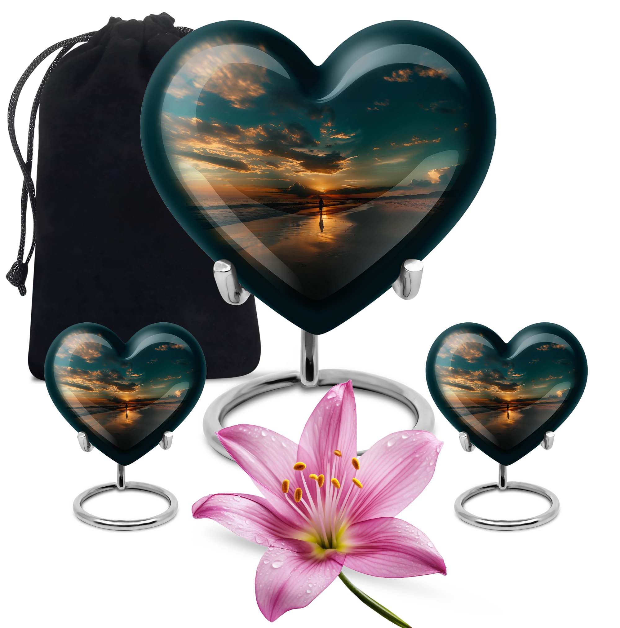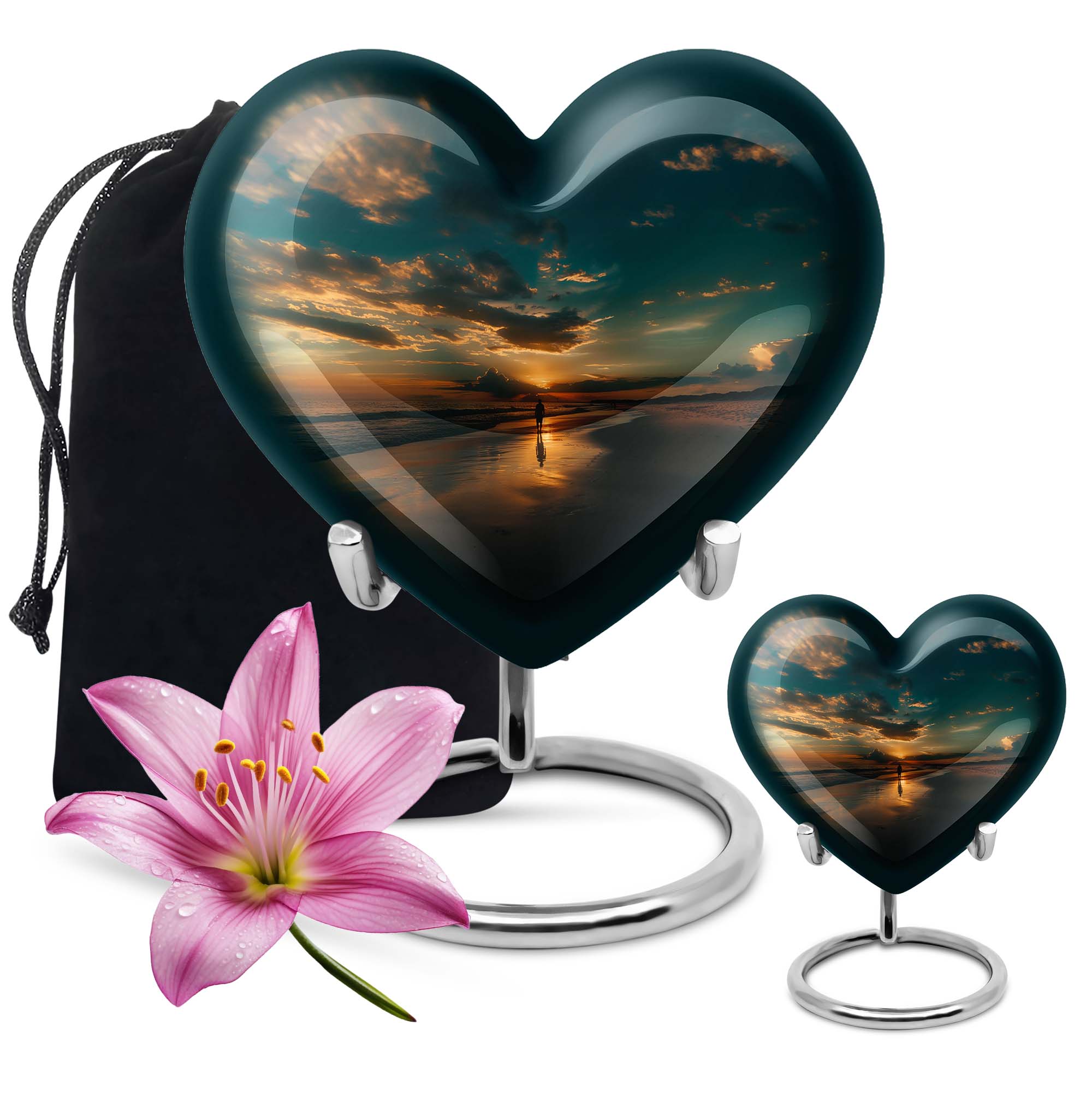 Celebrate and remember the life of your loved one with the Beach Urn. This large, durable memorial funeral urn for ashes is crafted from high-quality aluminium for long lasting durability. Measuring a respectful 10 inches in height and weighing 3.3 pounds, it embodies a serene, beach theme with a heart urn centerpiece and a display of sophisticated flowers. With a generous capacity of 200 cubic inches, this urn is perfect to safeguard the ashes of mother and father as a perfect memorial item. Additionally, the package comes with a companion velvet pouch for gentle yet secure containment of the precious contents. An option to personalize the urn with engraved names adds an intimate touch to this unique beatific work of art. Symbolizing eternal love, the Beach Urn captures the essence of individual life to honor and keep them close to the heart, always. Perfect for home or columbarium, it features a secured bottom compartment. Rediscover comfort in memories with our selection of decorative, memorial urns.