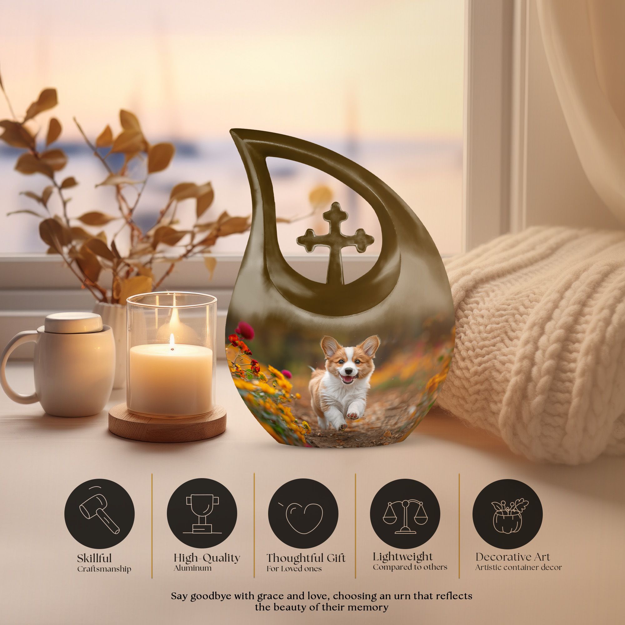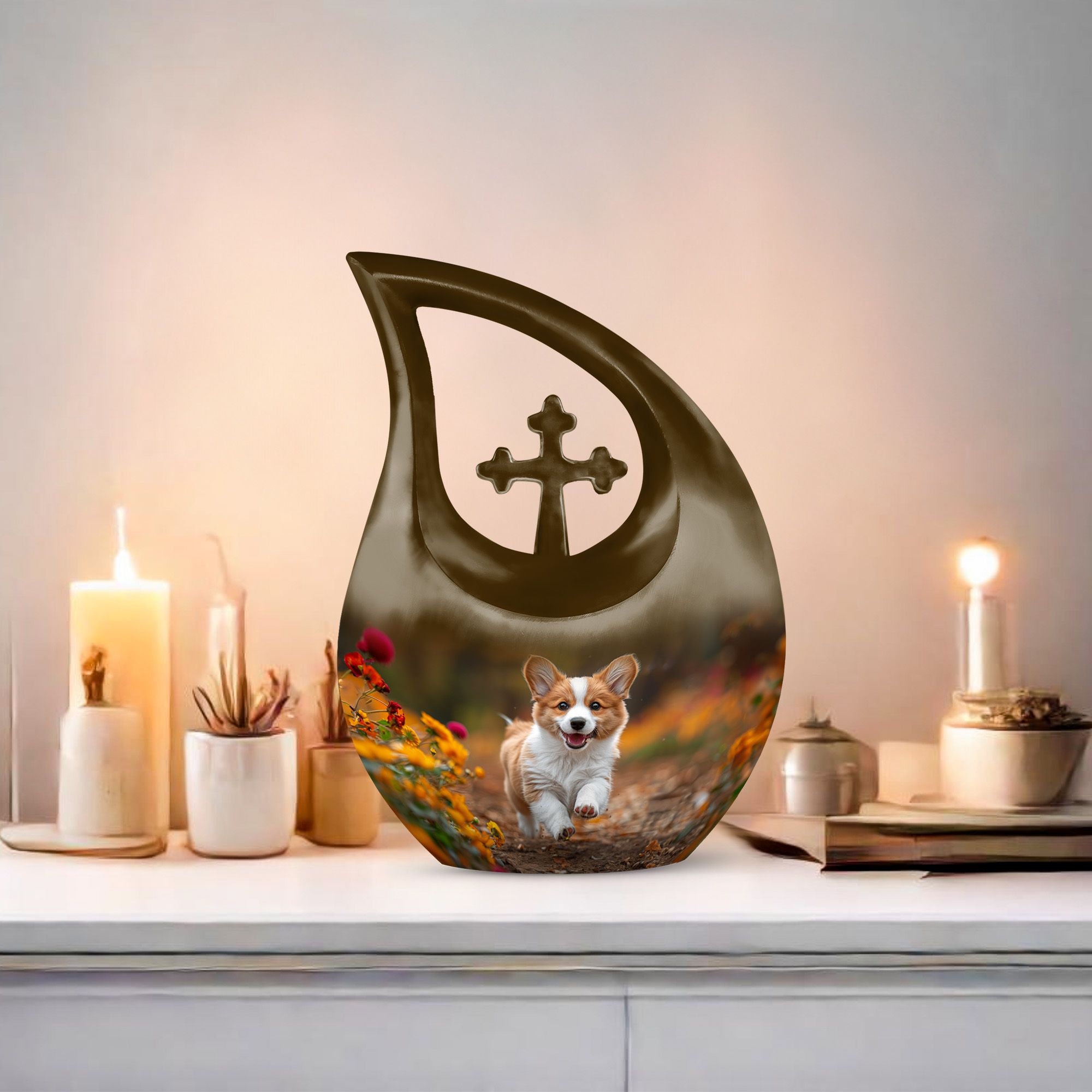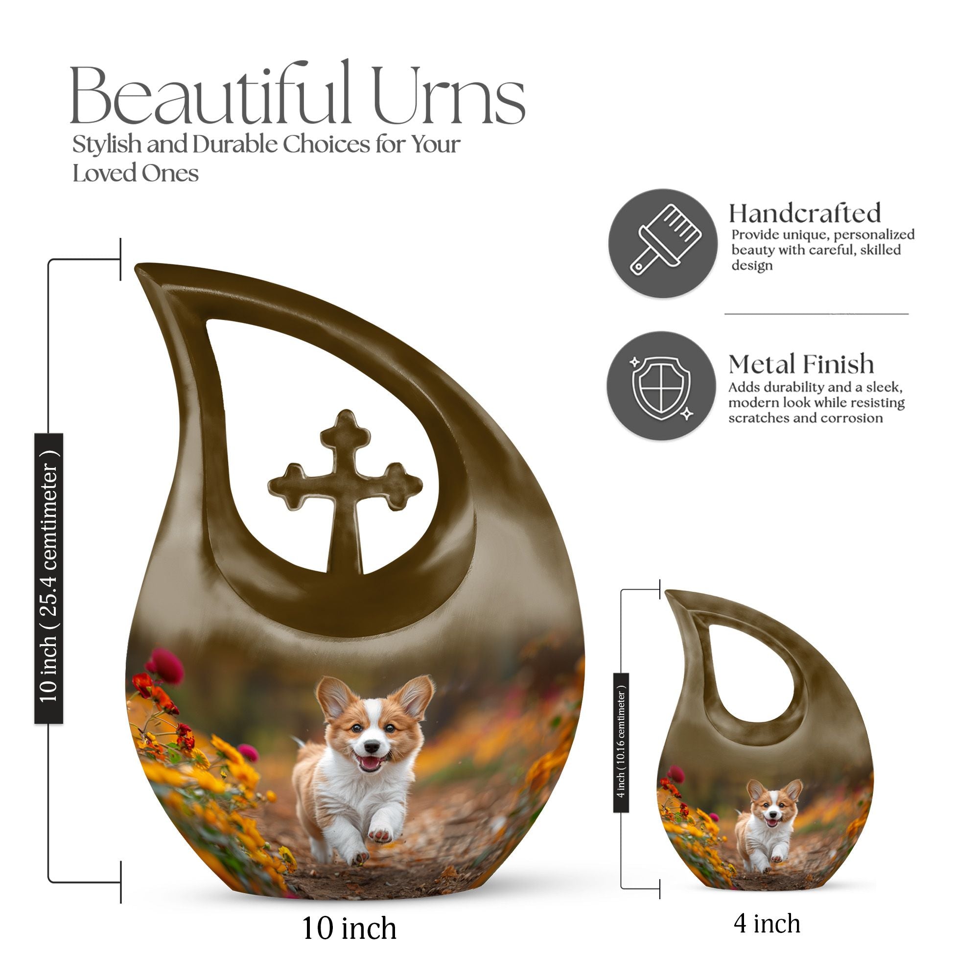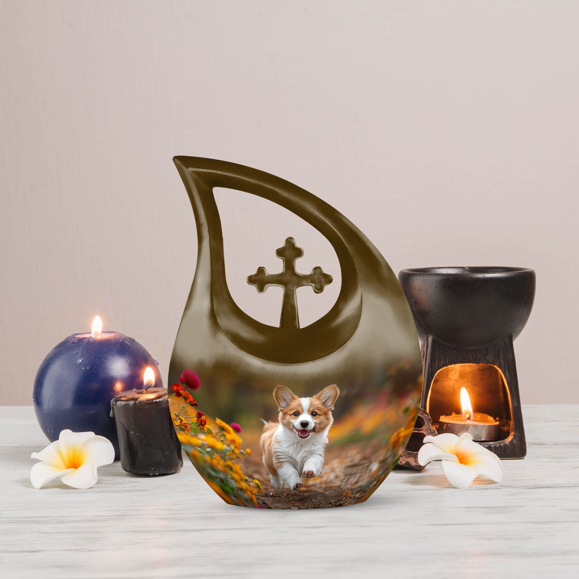 Showcase your love and respect for your cherished one with our Cheerful Corgi Capers Urn. This large urn, crafted skillfully from durable aluminium, has a unique 'Cross Drop' design lending it a serene elegance. This urn for keepsakes, a heartfelt pitch towards memorial urns, stands 10 inches tall and weighs a steady 3.3 pounds, exuding substantial physical presence. Despite its compact form, it's surprisingly spacious with a capacity to hold 200 cubic inches of your loved one's ashes. Each purchase includes a plush velvet pouch for the dignified containment of ashes. We understand the importance of individuality; to cater to this, we offer customization options – add an engraving of your dear one's name for a deeply personal touch. Our Cheerful Corgi Capers Urn doesn't merely serve as a memorial, but a testament to a life well-lived, making it a grand symbol of remembrance. Perfect for those on the hunt for urns for sale, particularly adults and seniors looking to honor their dearly departed.