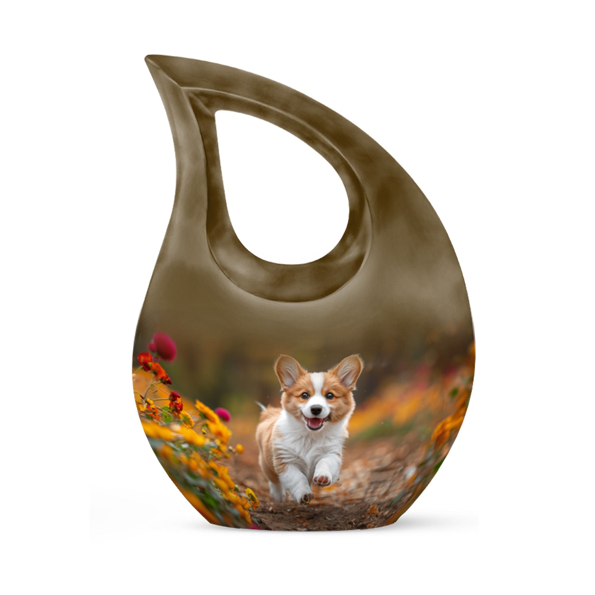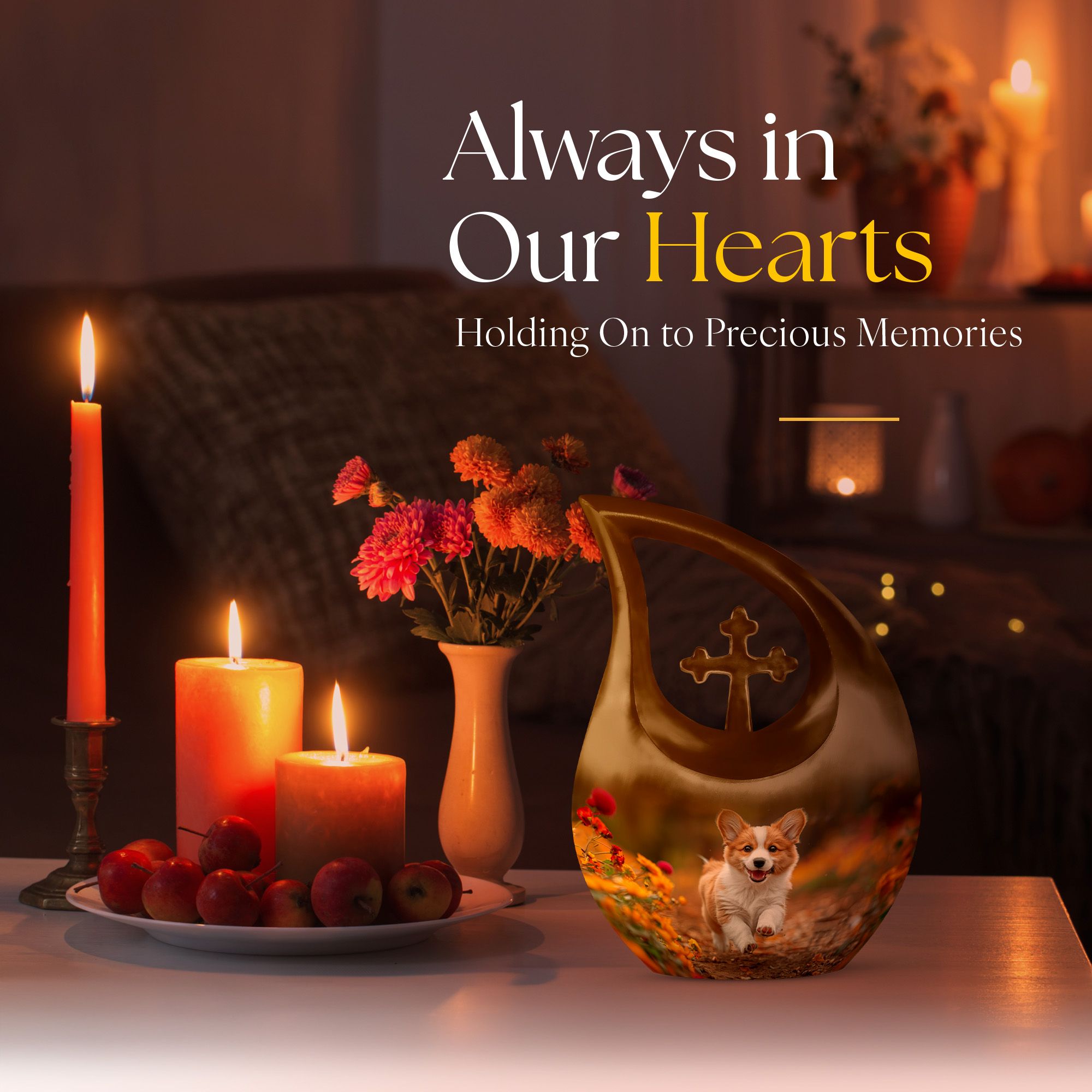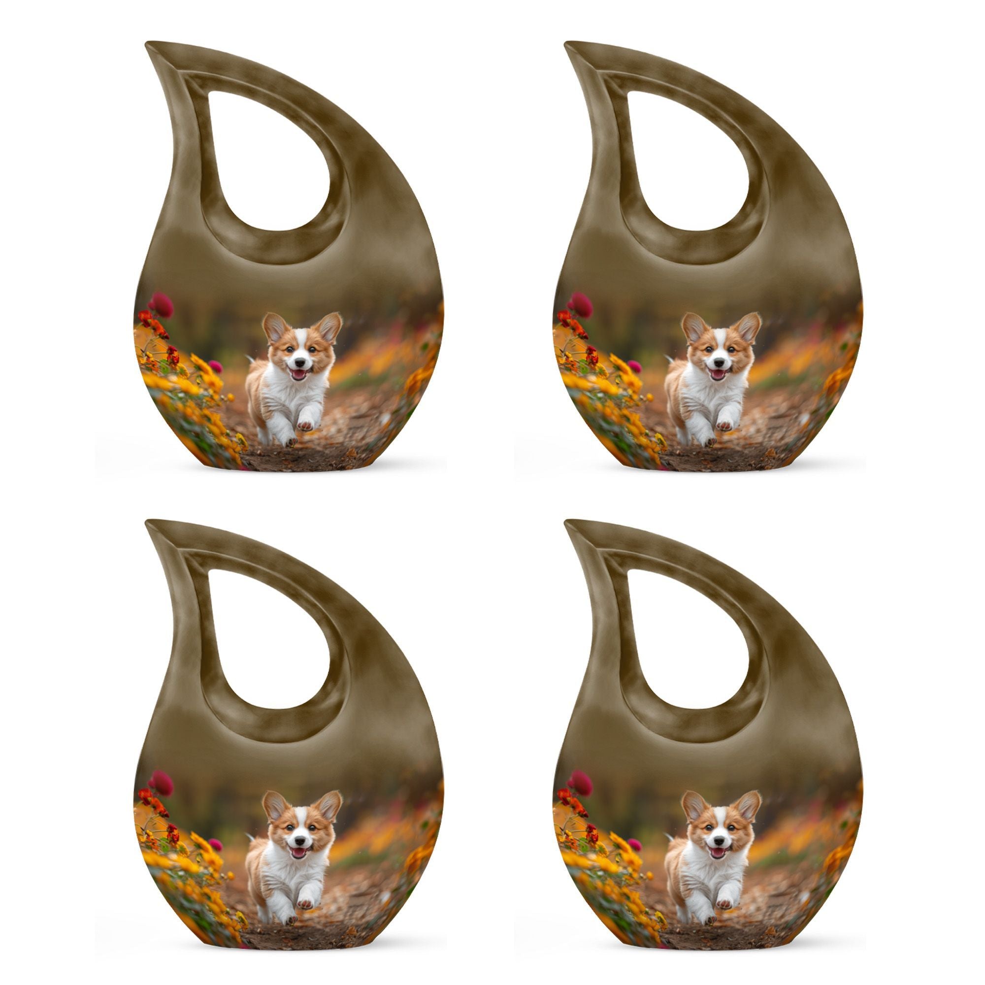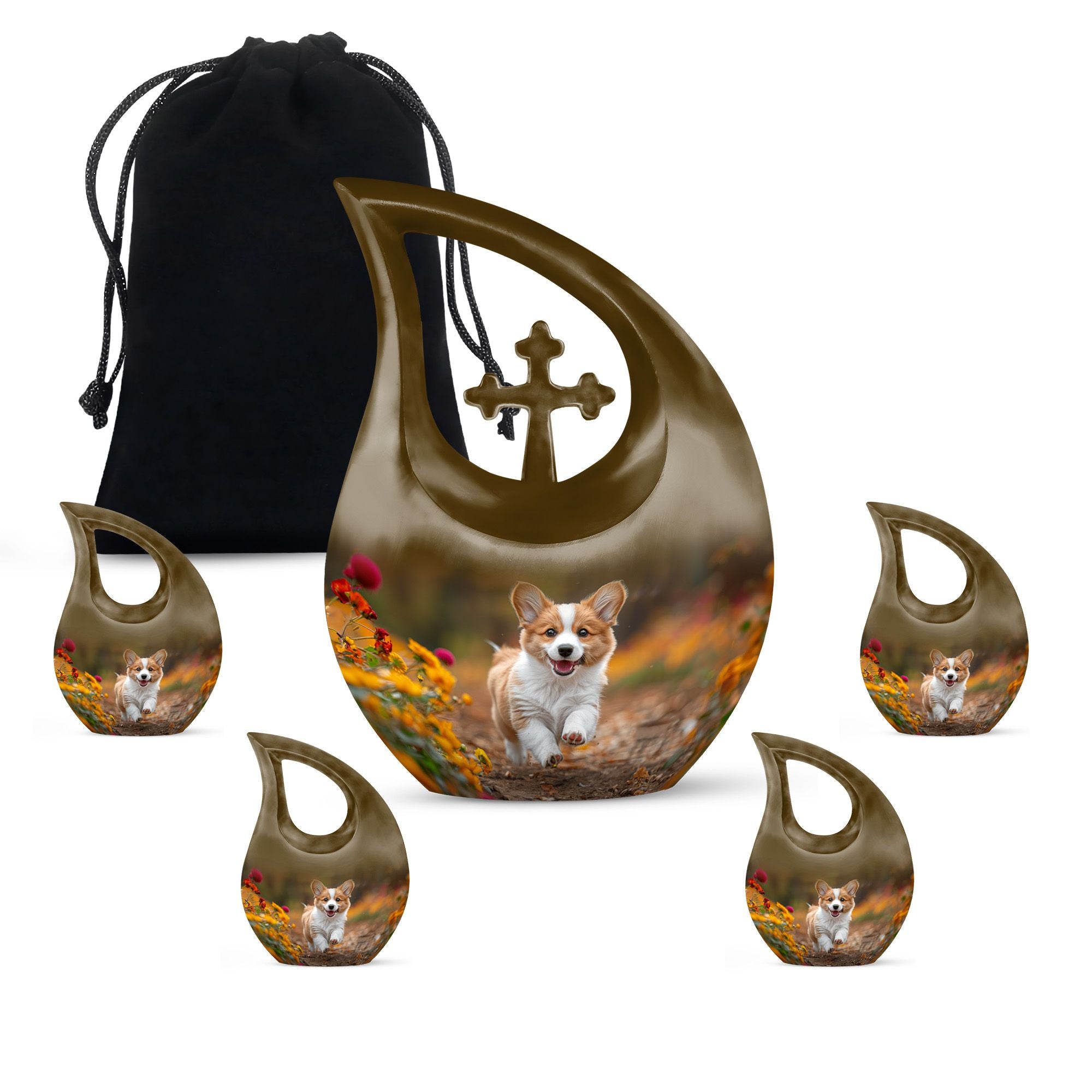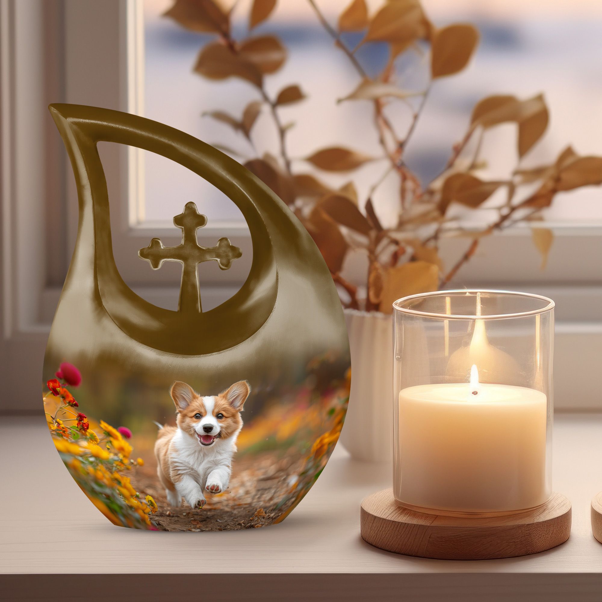 Showcase your love and respect for your cherished one with our Cheerful Corgi Capers Urn. This large urn, crafted skillfully from durable aluminium, has a unique 'Cross Drop' design lending it a serene elegance. This urn for keepsakes, a heartfelt pitch towards memorial urns, stands 10 inches tall and weighs a steady 3.3 pounds, exuding substantial physical presence. Despite its compact form, it's surprisingly spacious with a capacity to hold 200 cubic inches of your loved one's ashes. Each purchase includes a plush velvet pouch for the dignified containment of ashes. We understand the importance of individuality; to cater to this, we offer customization options – add an engraving of your dear one's name for a deeply personal touch. Our Cheerful Corgi Capers Urn doesn't merely serve as a memorial, but a testament to a life well-lived, making it a grand symbol of remembrance. Perfect for those on the hunt for urns for sale, particularly adults and seniors looking to honor their dearly departed.