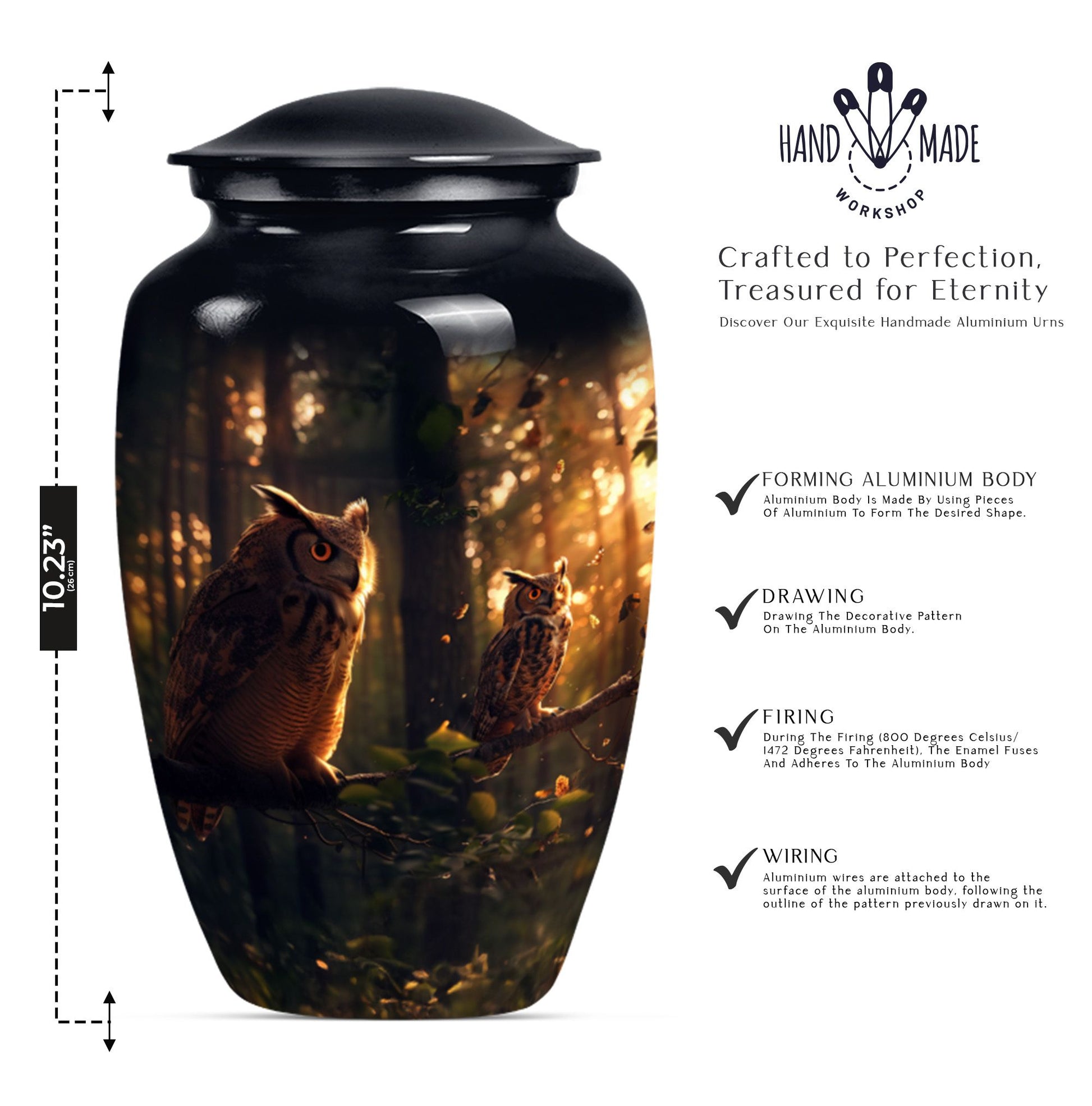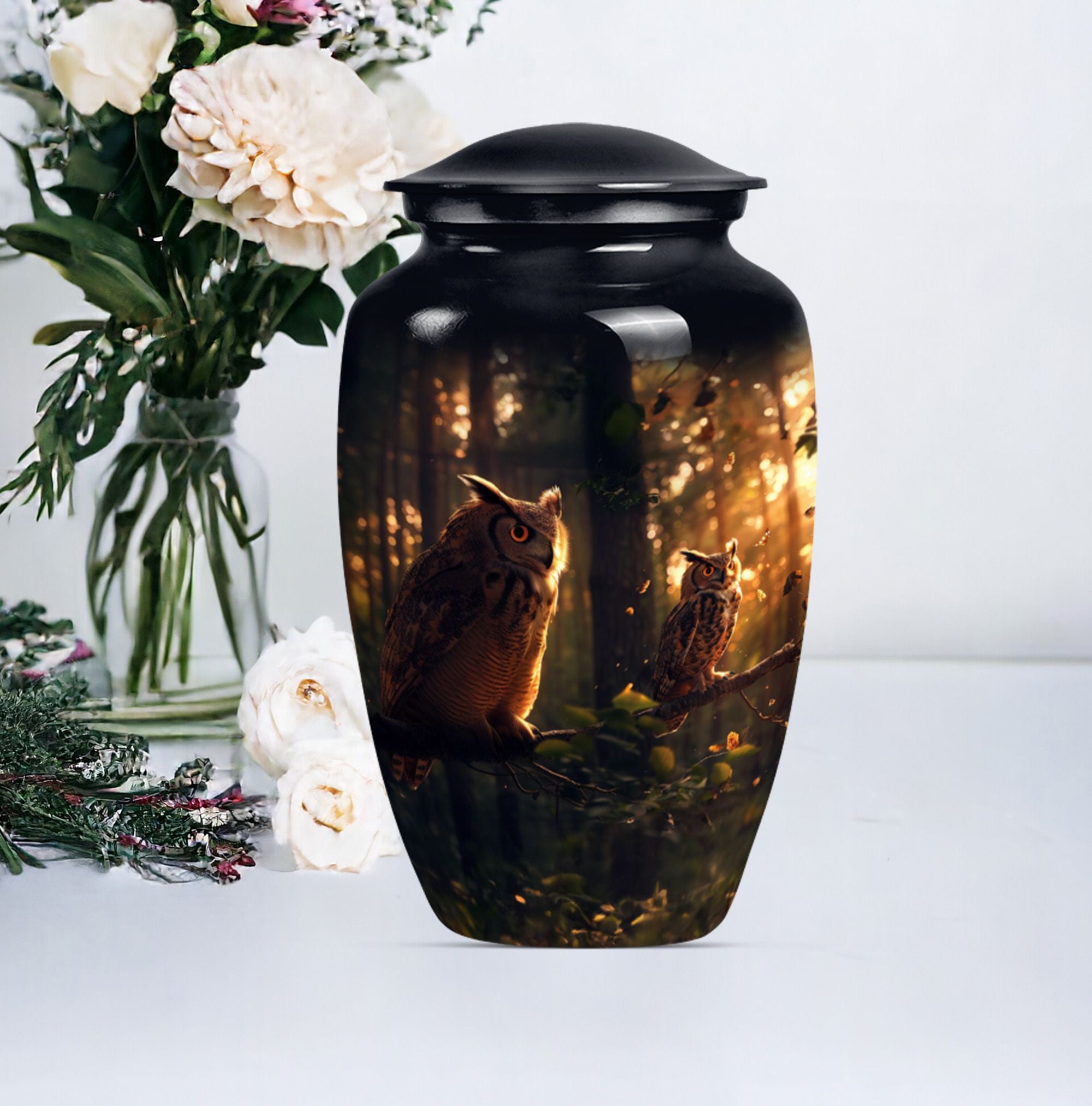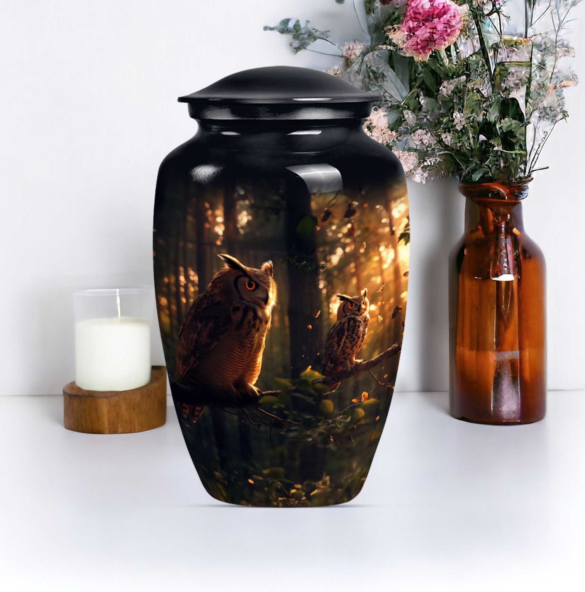 Honor your loved one with our elegant and enigmatic Wolf Howling themed Owl Urn. This memorial urn for human ashes resonates with the grandeur of life and subtle whispers of the eternity and beyond. It's meticulously crafted from high-grade aluminium, ensuring a lasting sheen and resilience. The large urn stands majestically at 10 inches, weighing only about 3.3 pounds. Able to hold up to 200 cubic inches, it's ideal for preserving the remains of an adult female or a man. Customization is available; you can choose to personalize the urn with engraved names – a touching way to remember and cherish your loved ones. The package includes a soft velvet pouch for safe containment of ashes. This cremation urn combines artistic finesse with a deeply spiritual theme, bringing you a serene yet poignant way to memorialize your dear ones. Ideal for those seeking funeral urns for human ashes admirers of the sublime wolf howling theme. Each owl urn signifies a unique journey and commemorates the indomitable spirit of life.