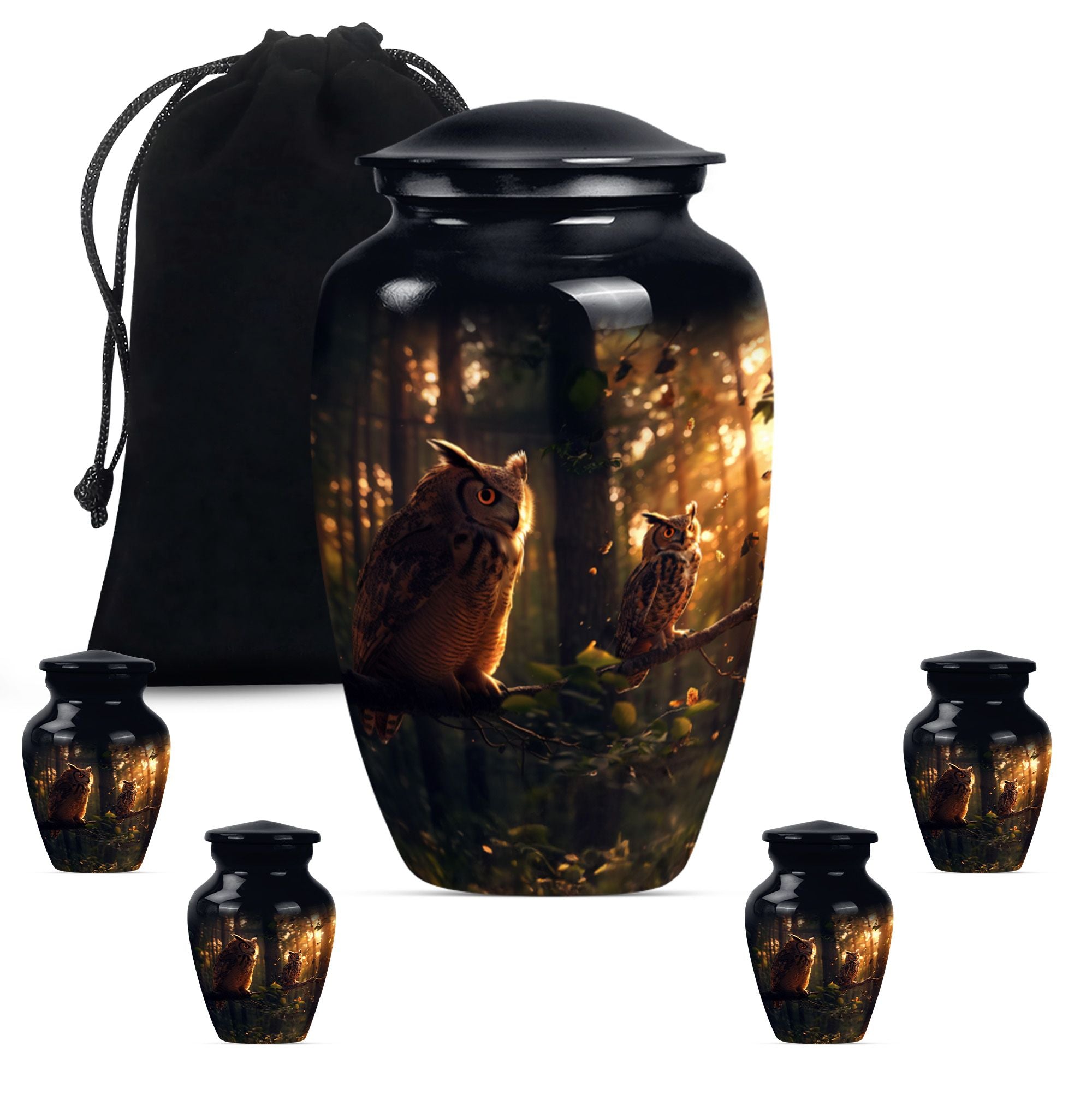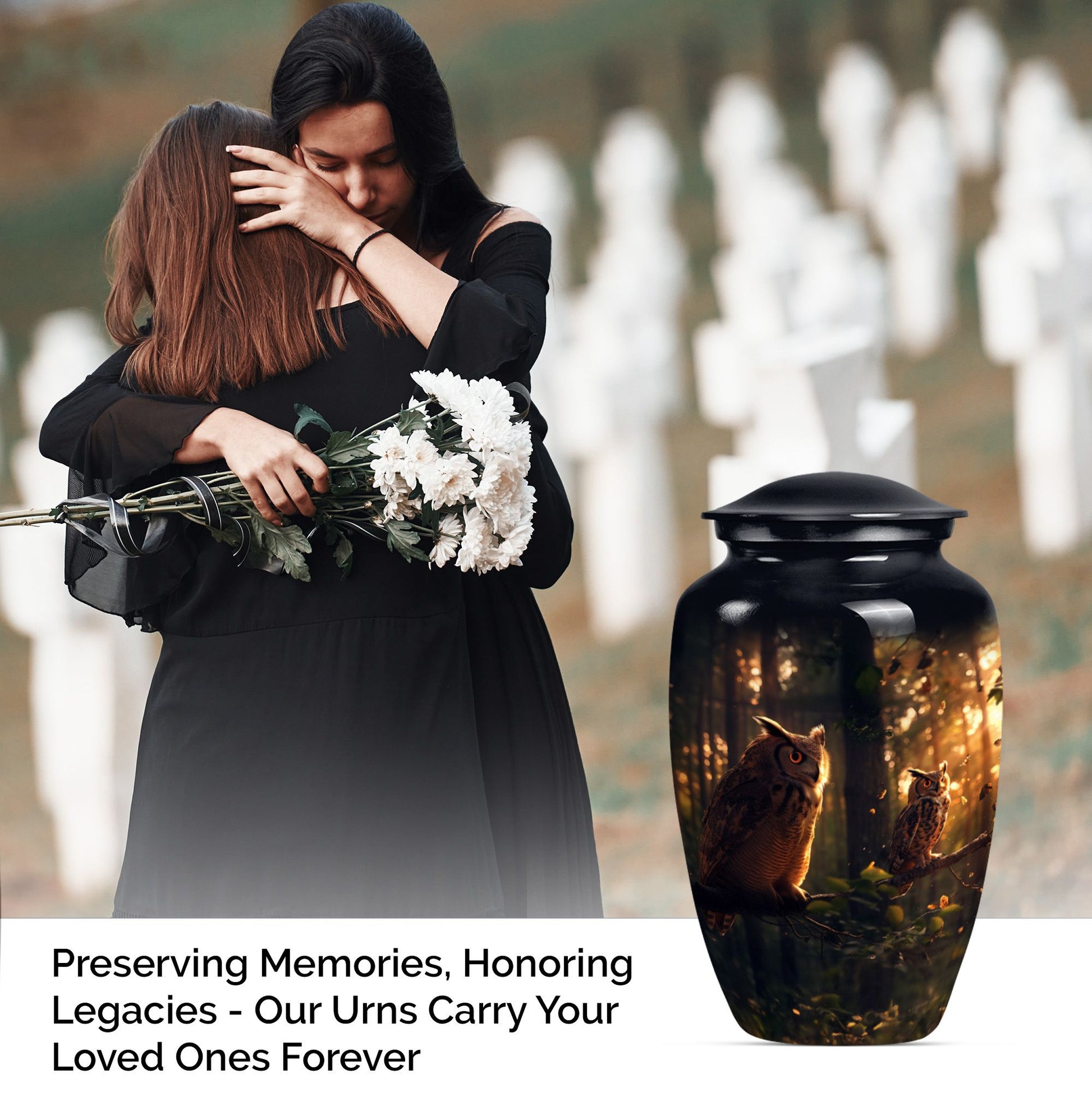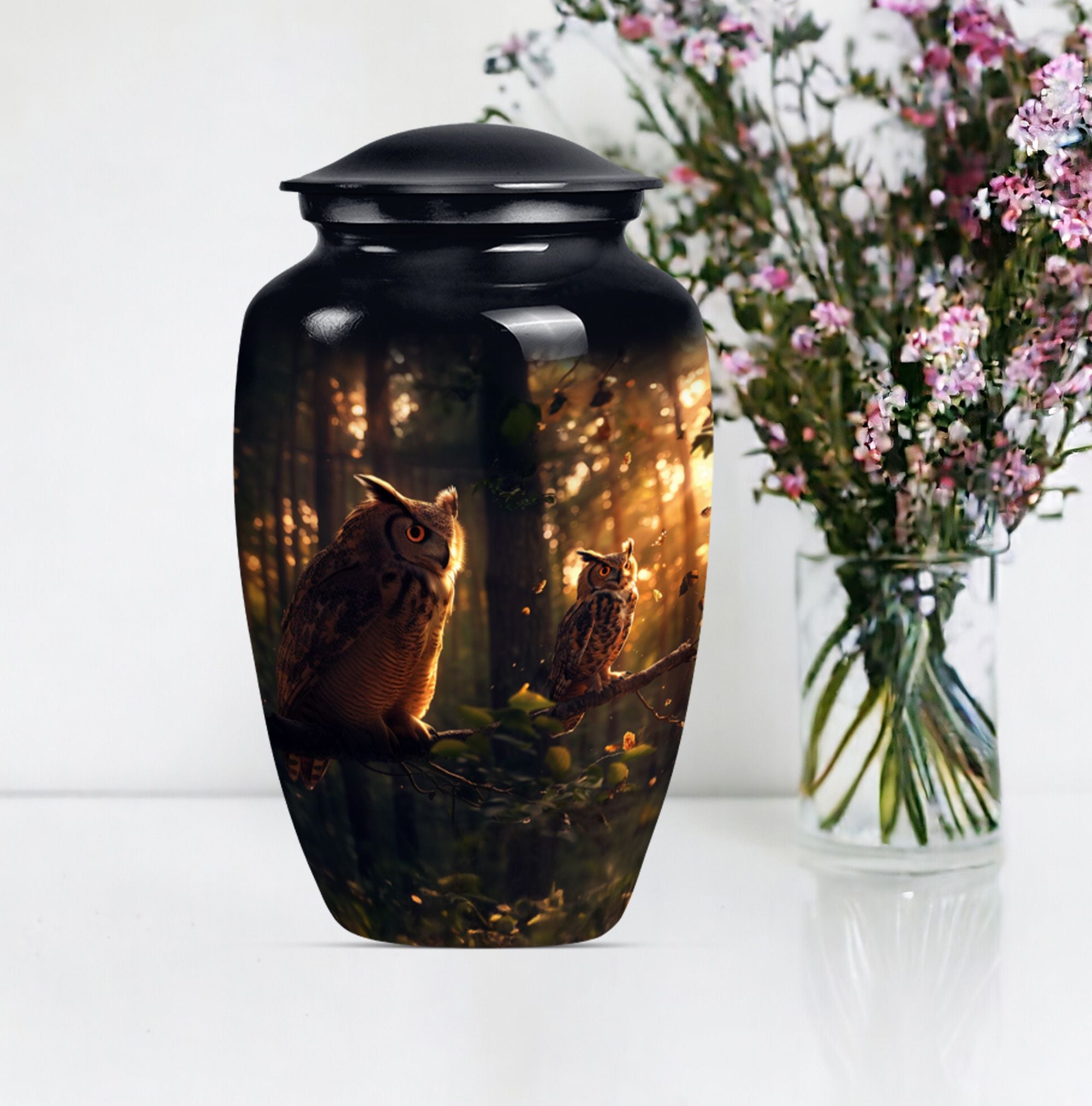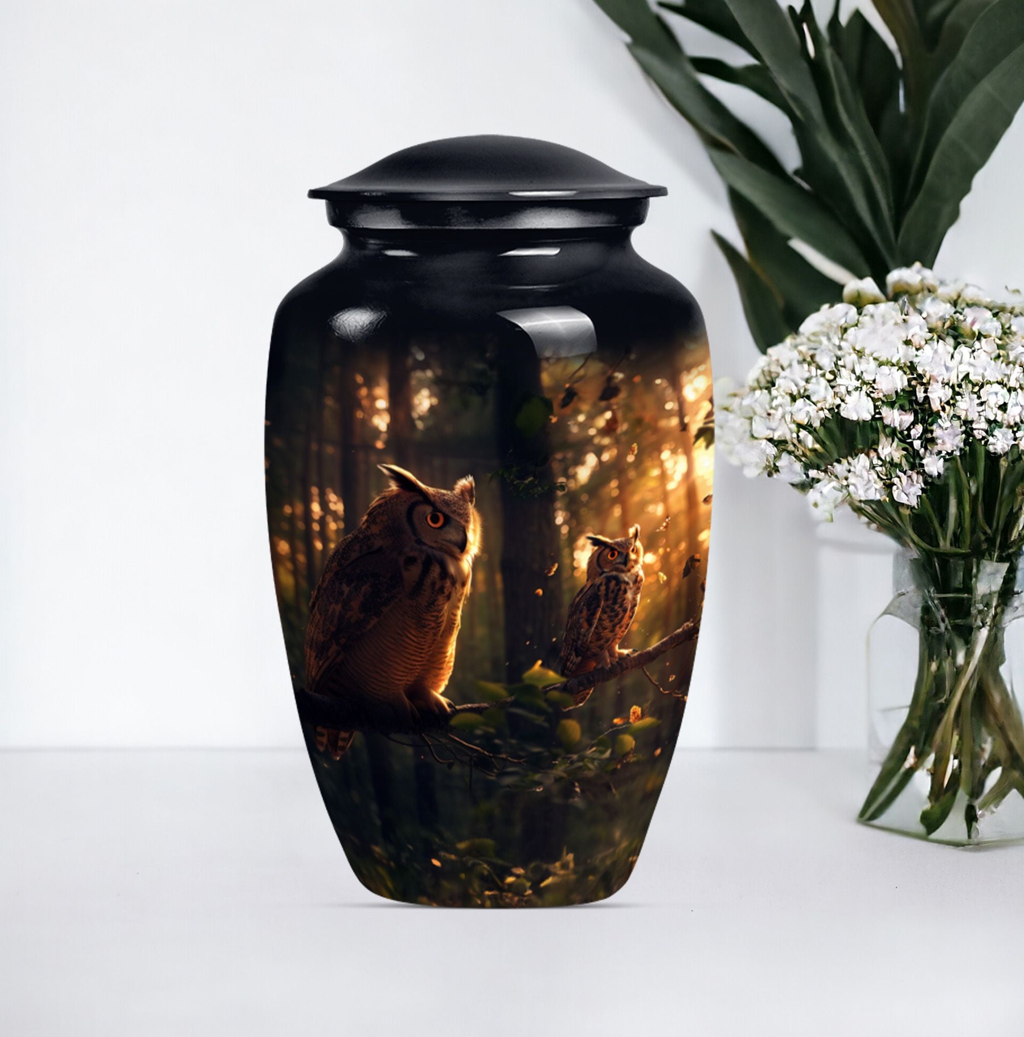Honor your loved one with our elegant and enigmatic Wolf Howling themed Owl Urn. This memorial urn for human ashes resonates with the grandeur of life and subtle whispers of the eternity and beyond. It's meticulously crafted from high-grade aluminium, ensuring a lasting sheen and resilience. The large urn stands majestically at 10 inches, weighing only about 3.3 pounds. Able to hold up to 200 cubic inches, it's ideal for preserving the remains of an adult female or a man. Customization is available; you can choose to personalize the urn with engraved names – a touching way to remember and cherish your loved ones. The package includes a soft velvet pouch for safe containment of ashes. This cremation urn combines artistic finesse with a deeply spiritual theme, bringing you a serene yet poignant way to memorialize your dear ones. Ideal for those seeking funeral urns for human ashes admirers of the sublime wolf howling theme. Each owl urn signifies a unique journey and commemorates the indomitable spirit of life.