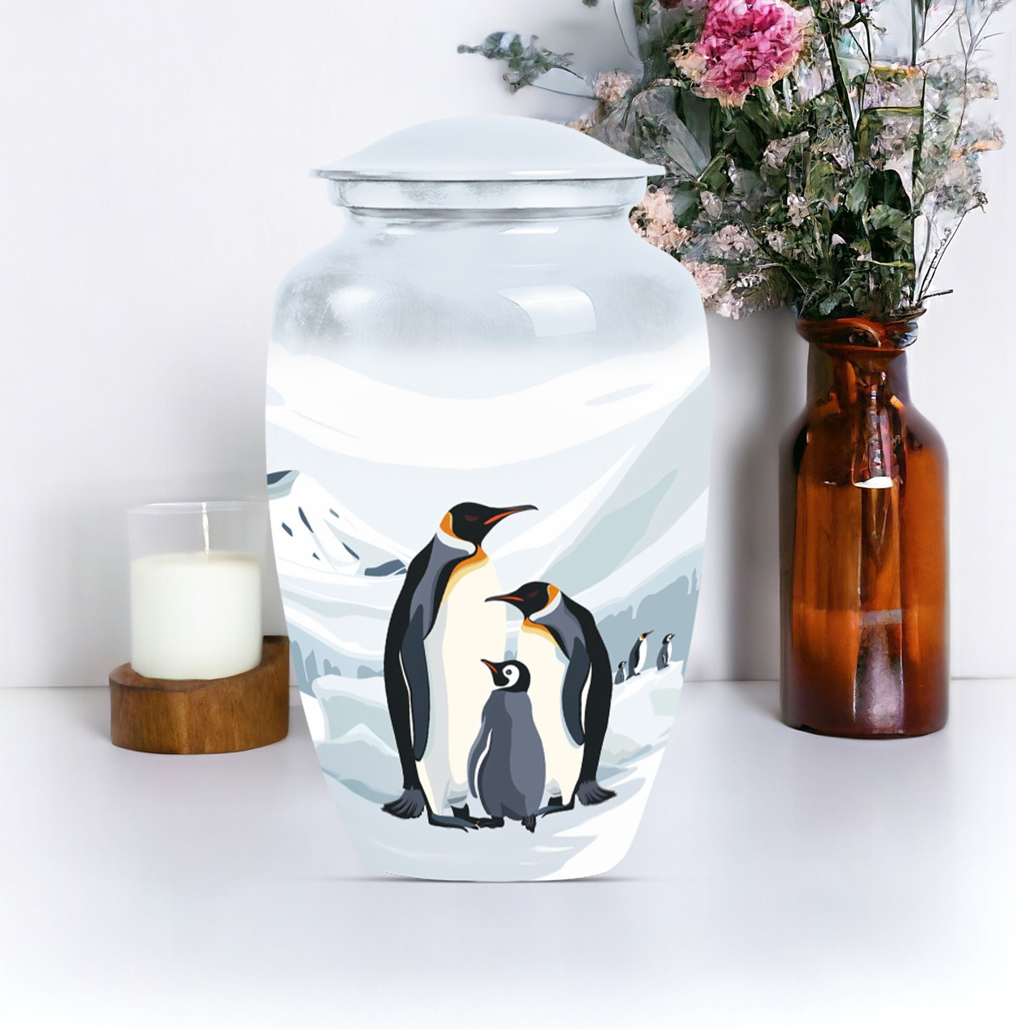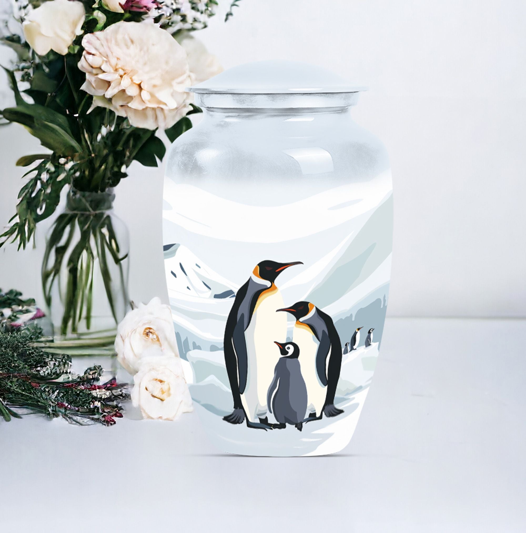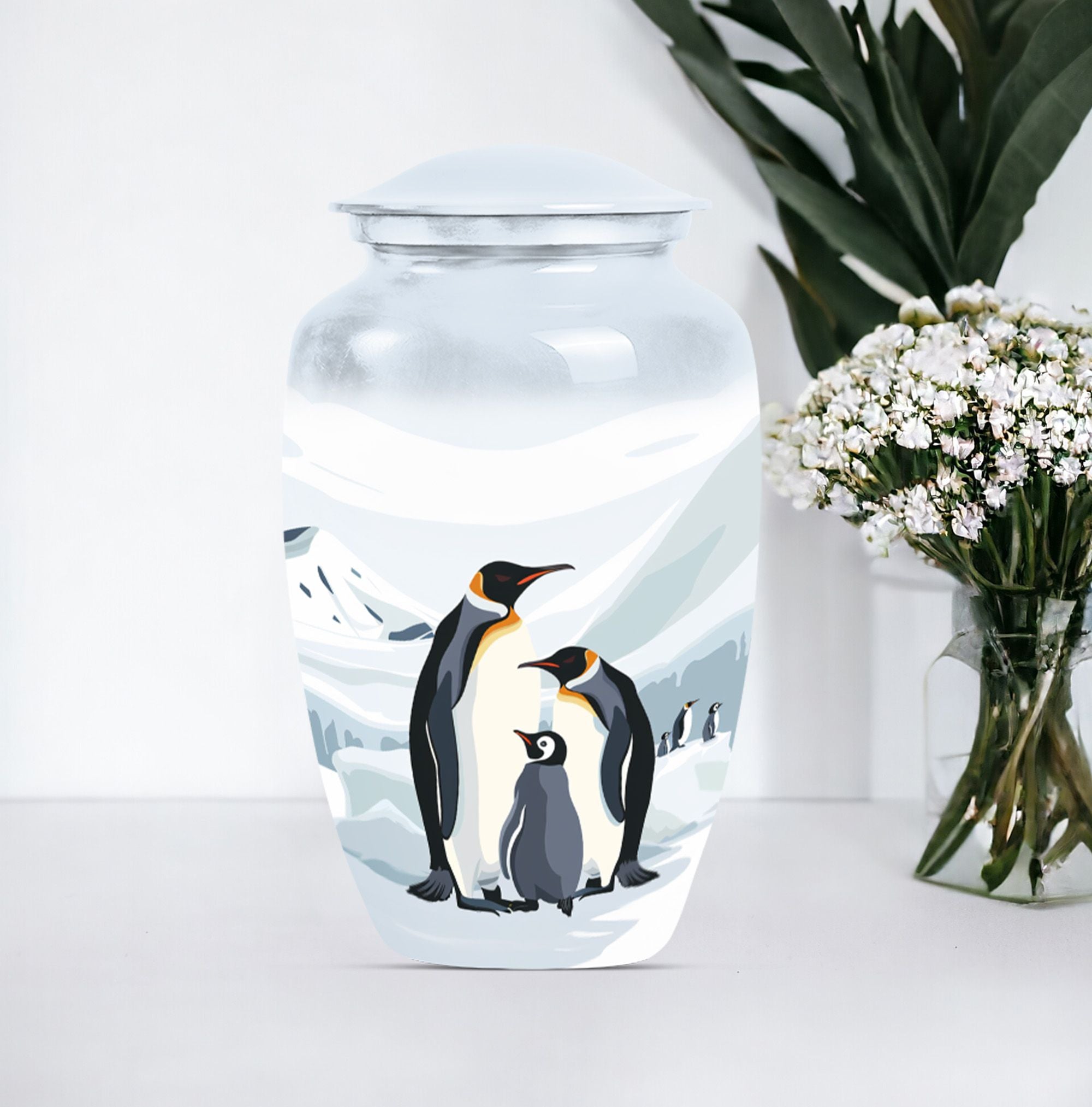 Our 'Penguin Urn', a cremation piece is not just a urn but a beautifully crafted piece of art which stands 10 inches tall. Made of durable aluminium, it exhibits quality that lasts over time. Weighing 3.3 pounds, this substantial urn offers a capacity of up to 200 cubic inches, capable of holding ashes securely. It comes with a corresponding velvet pouch, providing a dignified and soft enclosure for the ashes. This large urn for adult female or human ashes elegantly combines function and aesthetics. Personalize it with engraved names, adding a thoughtful touch that embraces the essence of customization. Complementing the modern interiors, it also makes a respectful addition to any metal mandir at home. It carries a gentle butterfly theme symbolizing transformation and a promise of life beyond. This Penguin Memorial Urn, skillfully curated with meticulous attention to detail, encapsulates affectionate memories and the spirit of a loved one, offering peace and closure.
