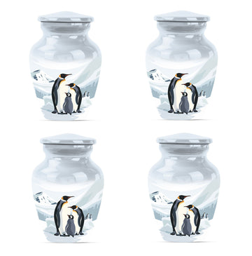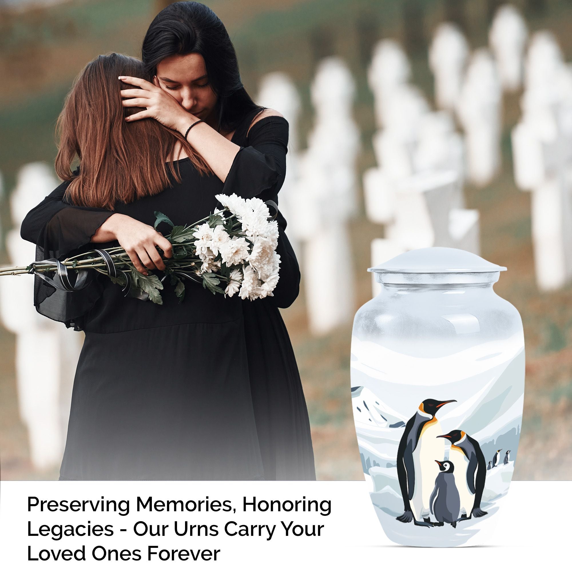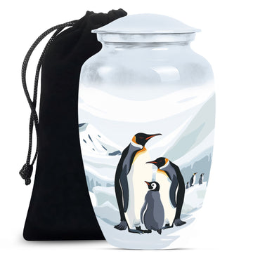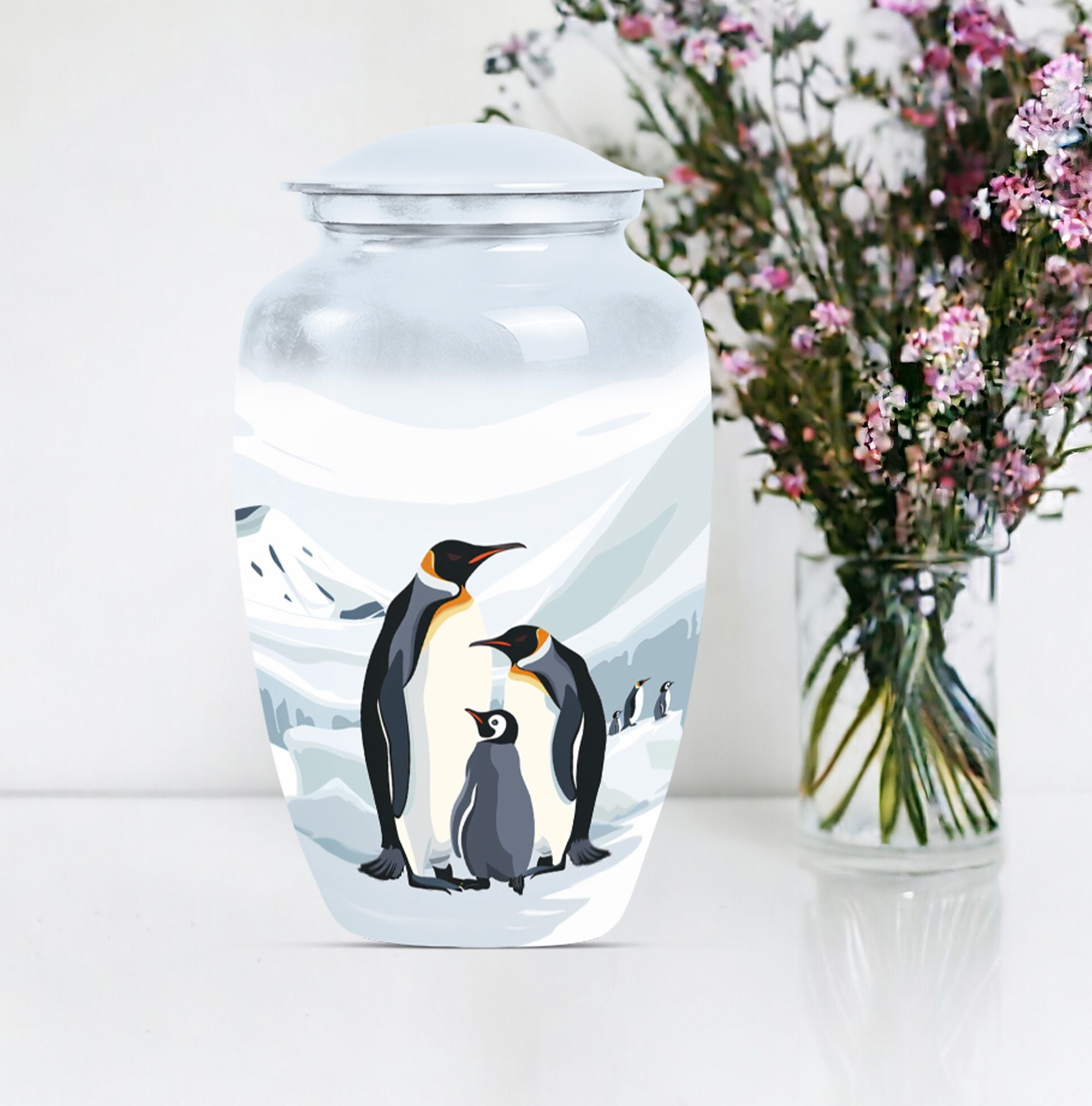 Our 'Penguin Urn', a cremation piece is not just a urn but a beautifully crafted piece of art which stands 10 inches tall. Made of durable aluminium, it exhibits quality that lasts over time. Weighing 3.3 pounds, this substantial urn offers a capacity of up to 200 cubic inches, capable of holding ashes securely. It comes with a corresponding velvet pouch, providing a dignified and soft enclosure for the ashes. This large urn for adult female or human ashes elegantly combines function and aesthetics. Personalize it with engraved names, adding a thoughtful touch that embraces the essence of customization. Complementing the modern interiors, it also makes a respectful addition to any metal mandir at home. It carries a gentle butterfly theme symbolizing transformation and a promise of life beyond. This Penguin Memorial Urn, skillfully curated with meticulous attention to detail, encapsulates affectionate memories and the spirit of a loved one, offering peace and closure.