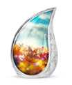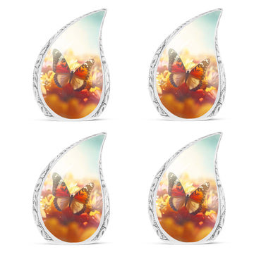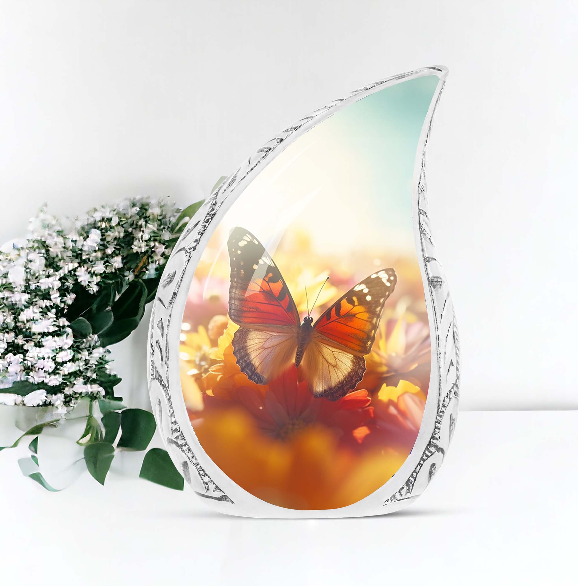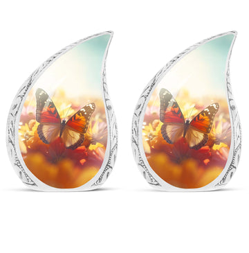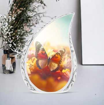 Embrace a timeless way to commemorate loved ones with this Colorful Butterflies Memorial Urn. Crafted from enduring aluminium, it is highly robust and designed to last. Measuring at 10 inches in height, it is a sizable and significant piece. With a weight of 3.3 pounds, its substantial feel provides a comforting symbol of presence. Subtle enough to blend in with any decor yet captivating enough to serve as a conversation piece, this urn truly marks an ideal memorial gift. The urn features a capacity of 200 cubic inches, ensuring ample space for containment and reverence. Indeed, every aspect of this large urn, from its classic design to its rich, personalized engraving, speaks of affectionate remembrance. It comes with a velvet pouch, providing not only a luxe touch but also a practical solution for containment of ashes.