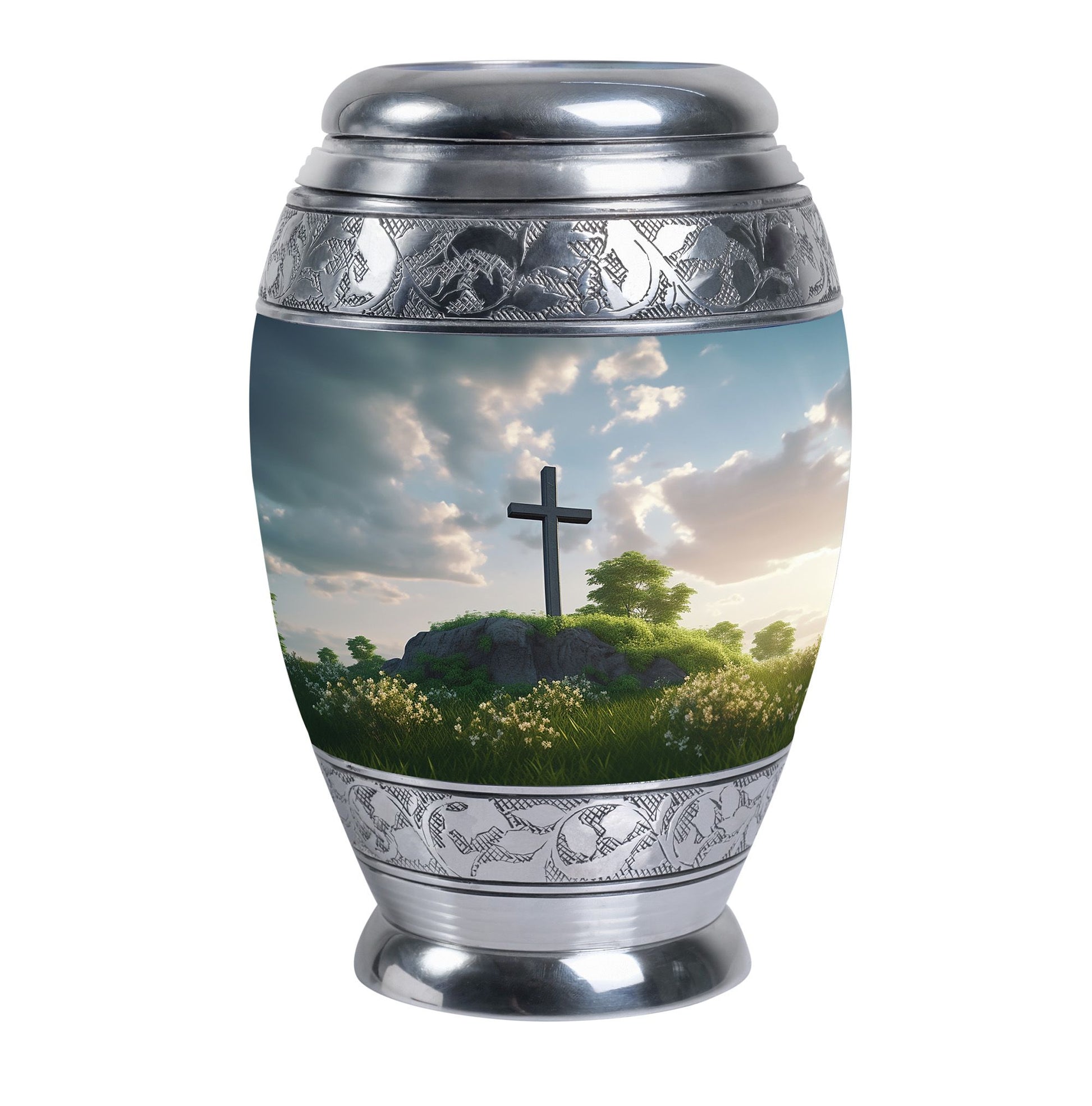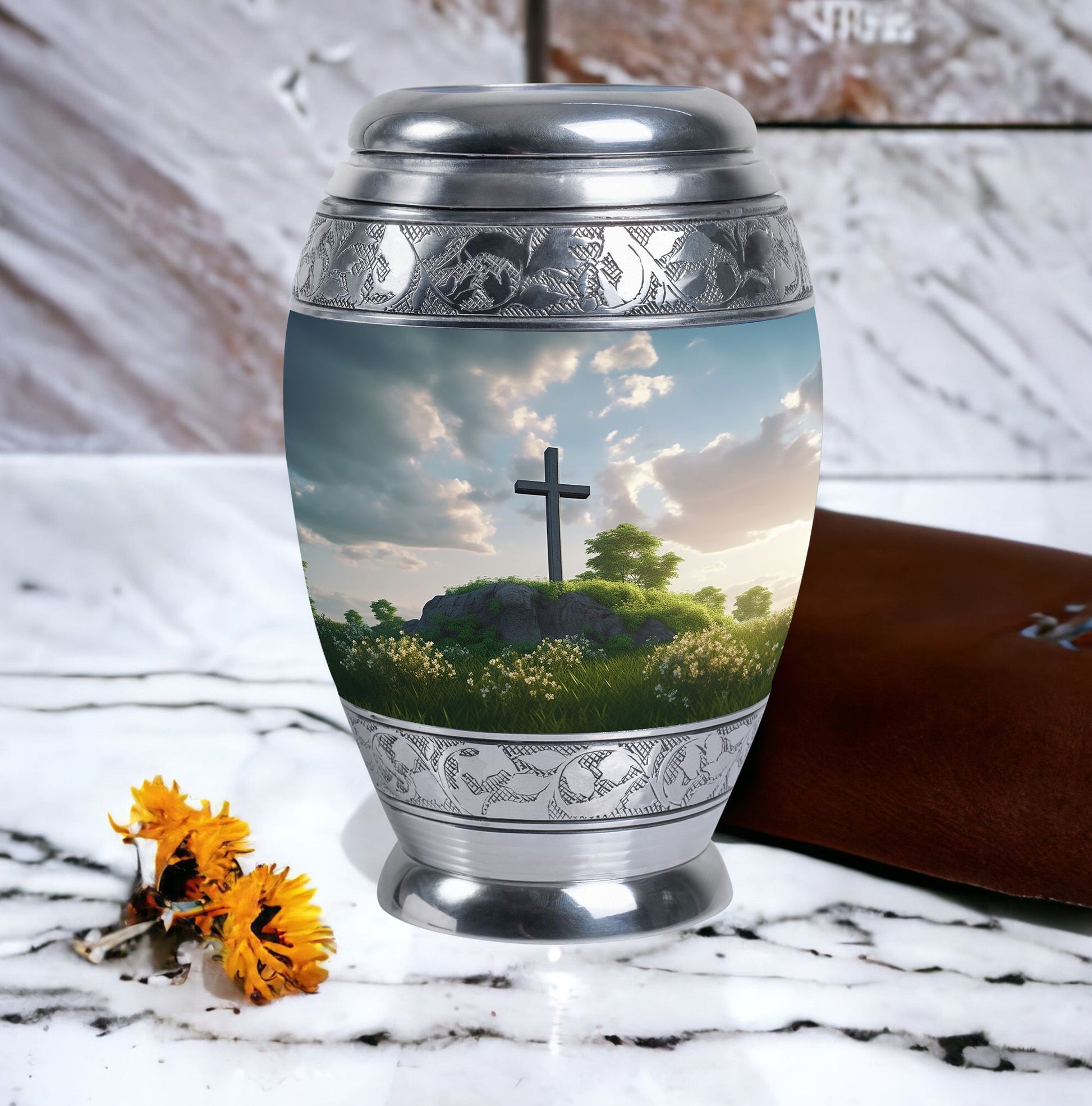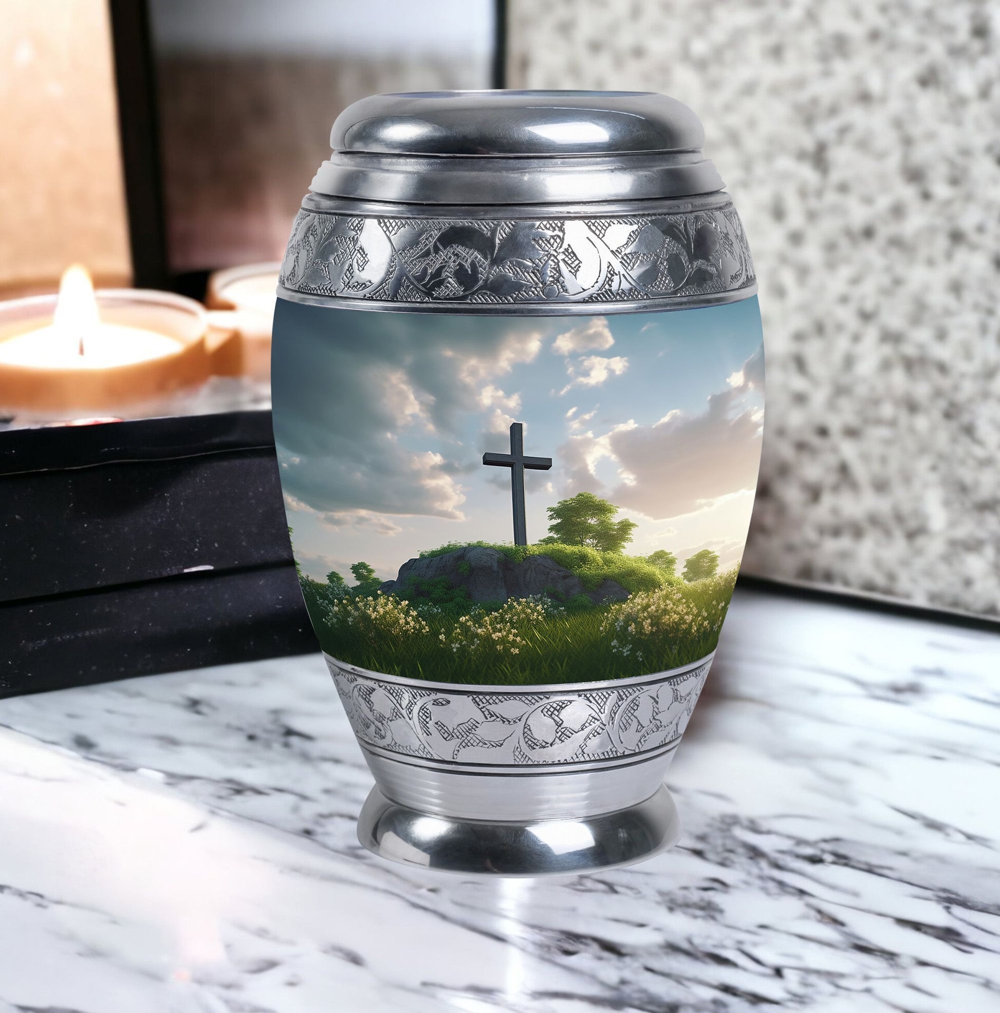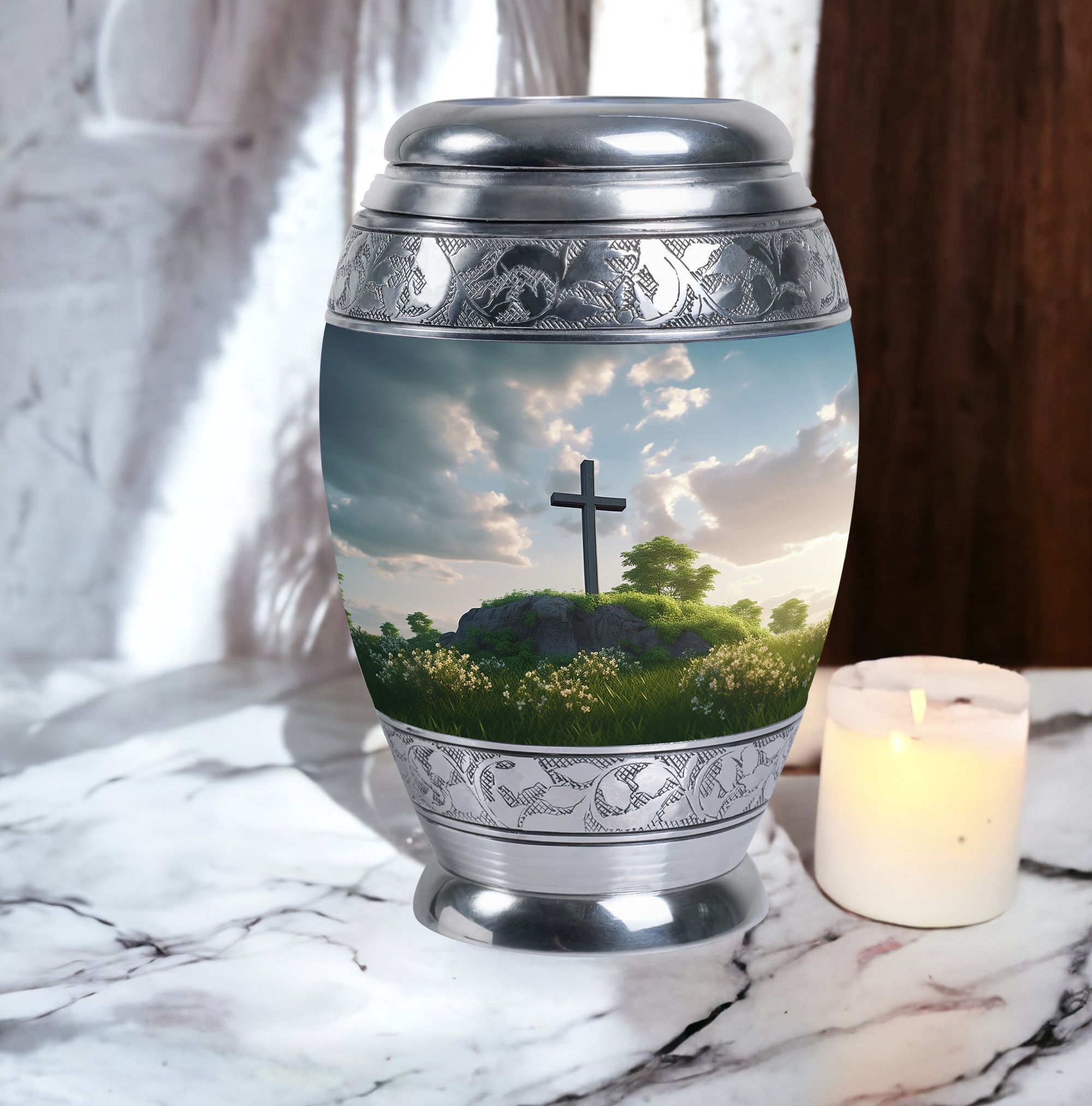 Honor your departed loved ones with our elegantly crafted 'Jesus Christ Cross Urn.' Crafted meticulously with Aluminium, this large urn is not merely an urn but a beautifully designed tribute for your beloved. Sized at a convenient 3 inches and weighing 3.3 pounds, it's constructed with a capacity of 200 cubic inches, making it an ideal choice for adult human ashes. Resilience, strength and longevity are what aluminium allows, meaning this urn is made to last, a perfect resting place for the dearly departed. Adding a unique touch, we even offer personalization; you can honor your loved one with engraved names. The urn comes along with a velvet pouch, ensuring the ashes are safely contained. So, when choosing cremation urns for human ashes, choose not just a burial urn but a dignified tribute. Graced with a classic design, our 'Jesus Christ Cross Urn' truly makes it a cherished memorial.