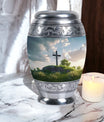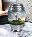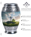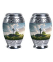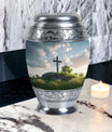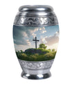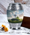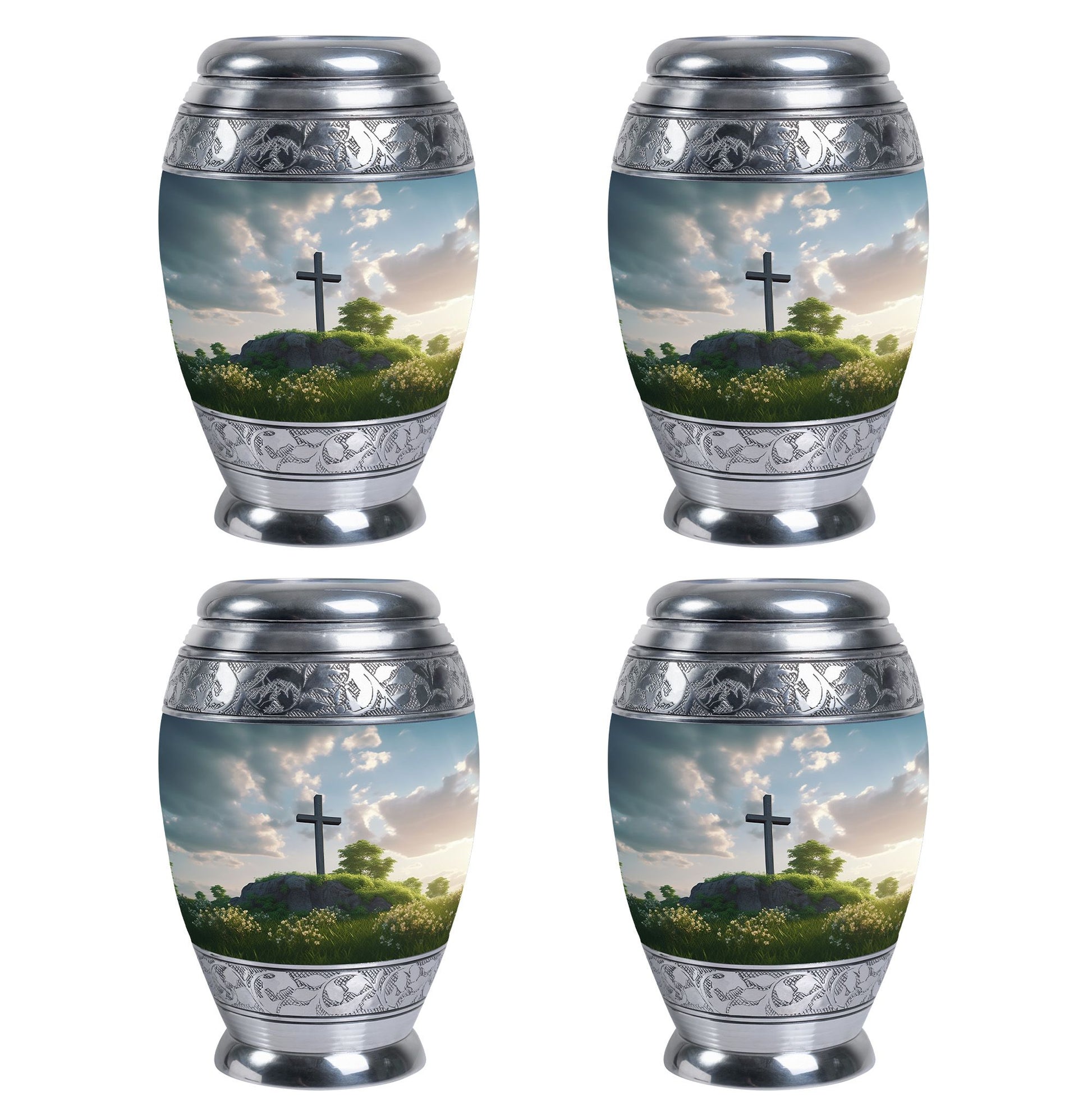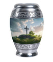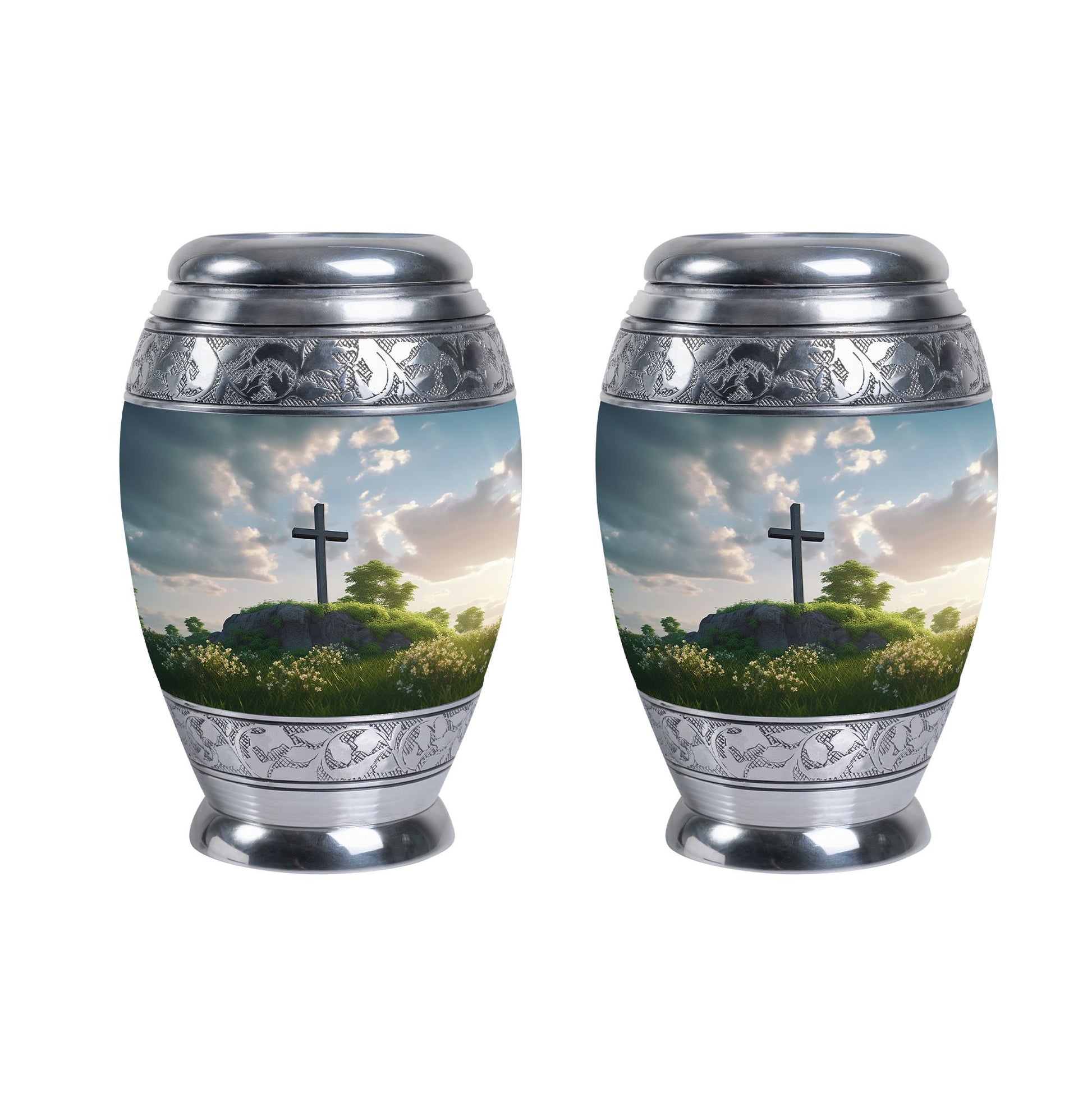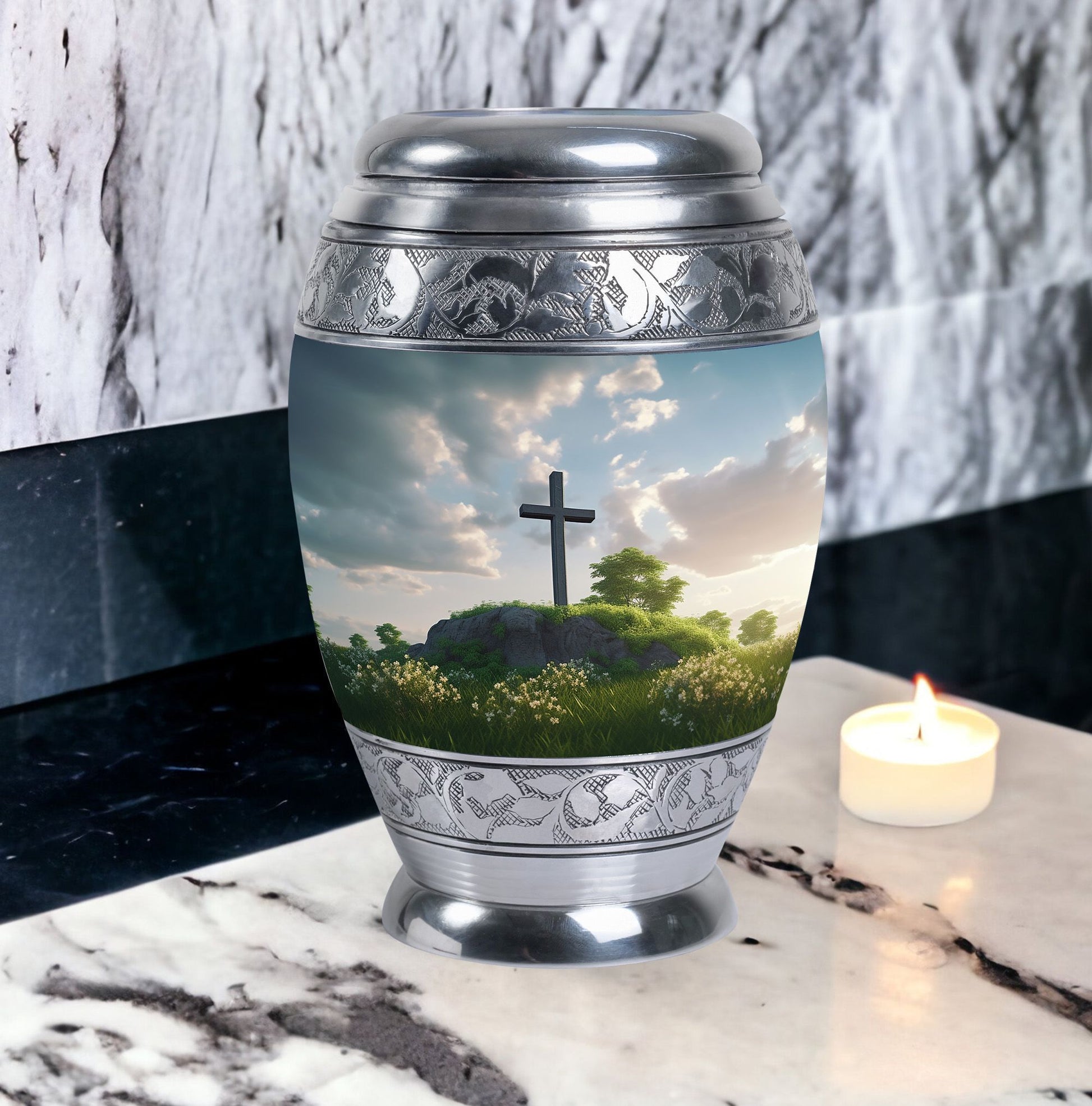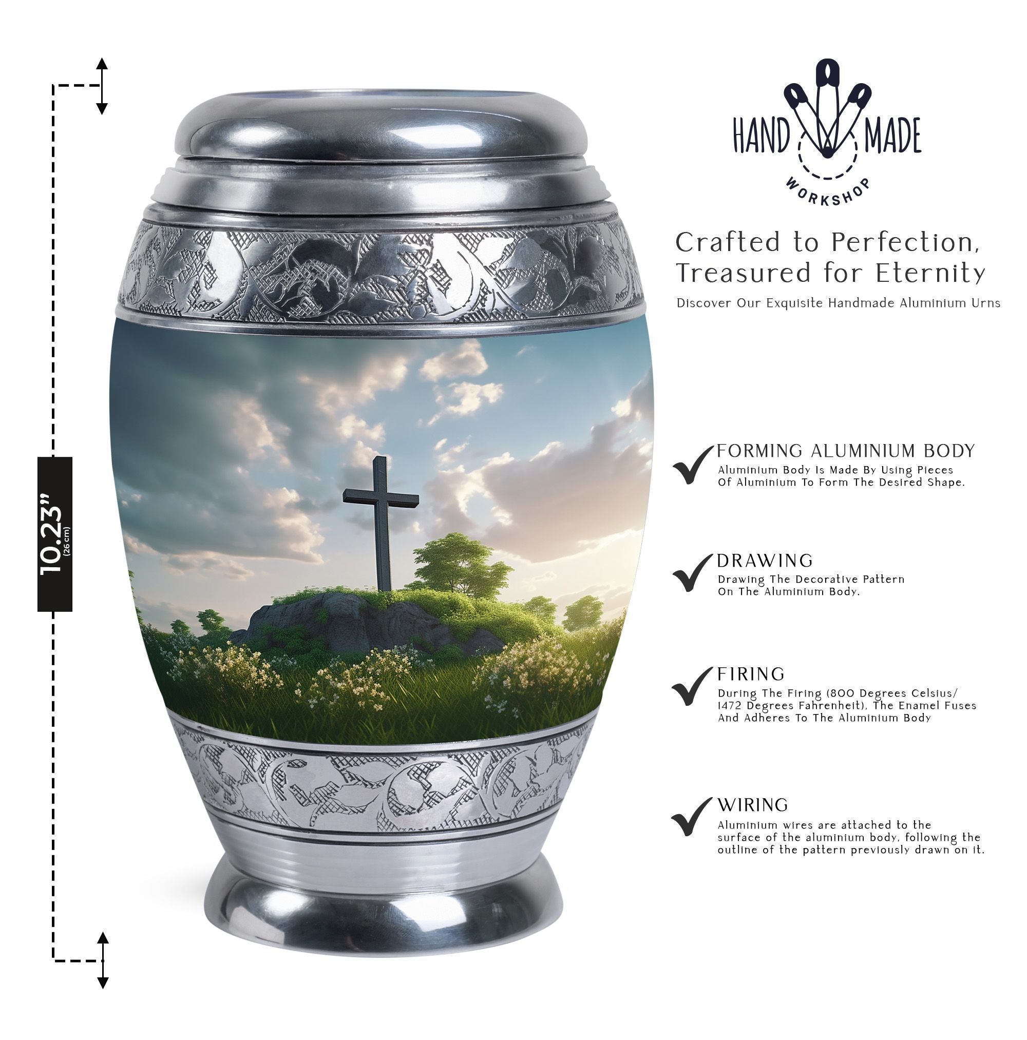 Honor your departed loved ones with our elegantly crafted 'Jesus Christ Cross Urn.' Crafted meticulously with Aluminium, this large urn is not merely an urn but a beautifully designed tribute for your beloved. Sized at a convenient 3 inches and weighing 3.3 pounds, it's constructed with a capacity of 200 cubic inches, making it an ideal choice for adult human ashes. Resilience, strength and longevity are what aluminium allows, meaning this urn is made to last, a perfect resting place for the dearly departed. Adding a unique touch, we even offer personalization; you can honor your loved one with engraved names. The urn comes along with a velvet pouch, ensuring the ashes are safely contained. So, when choosing cremation urns for human ashes, choose not just a burial urn but a dignified tribute. Graced with a classic design, our 'Jesus Christ Cross Urn' truly makes it a cherished memorial.