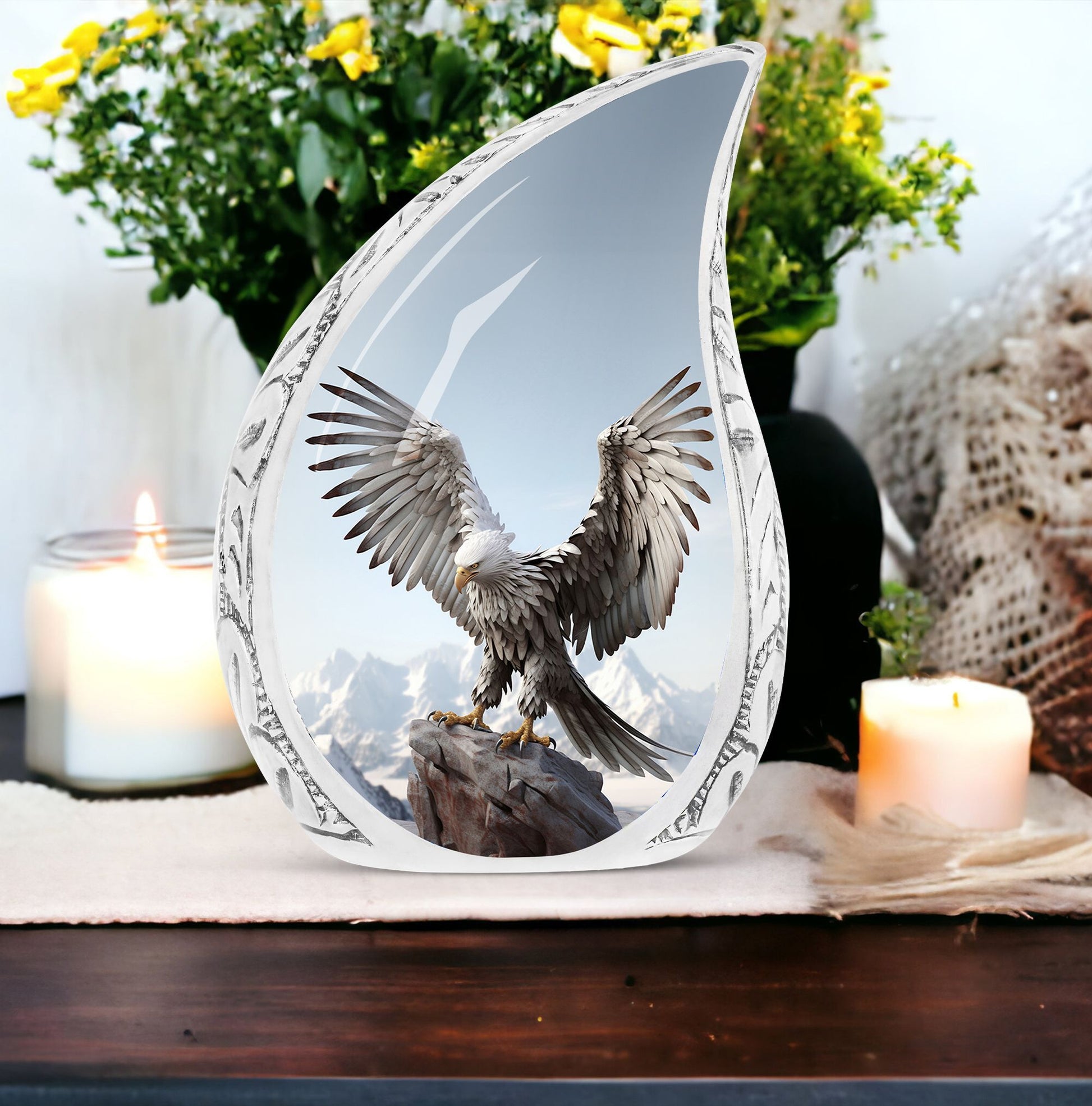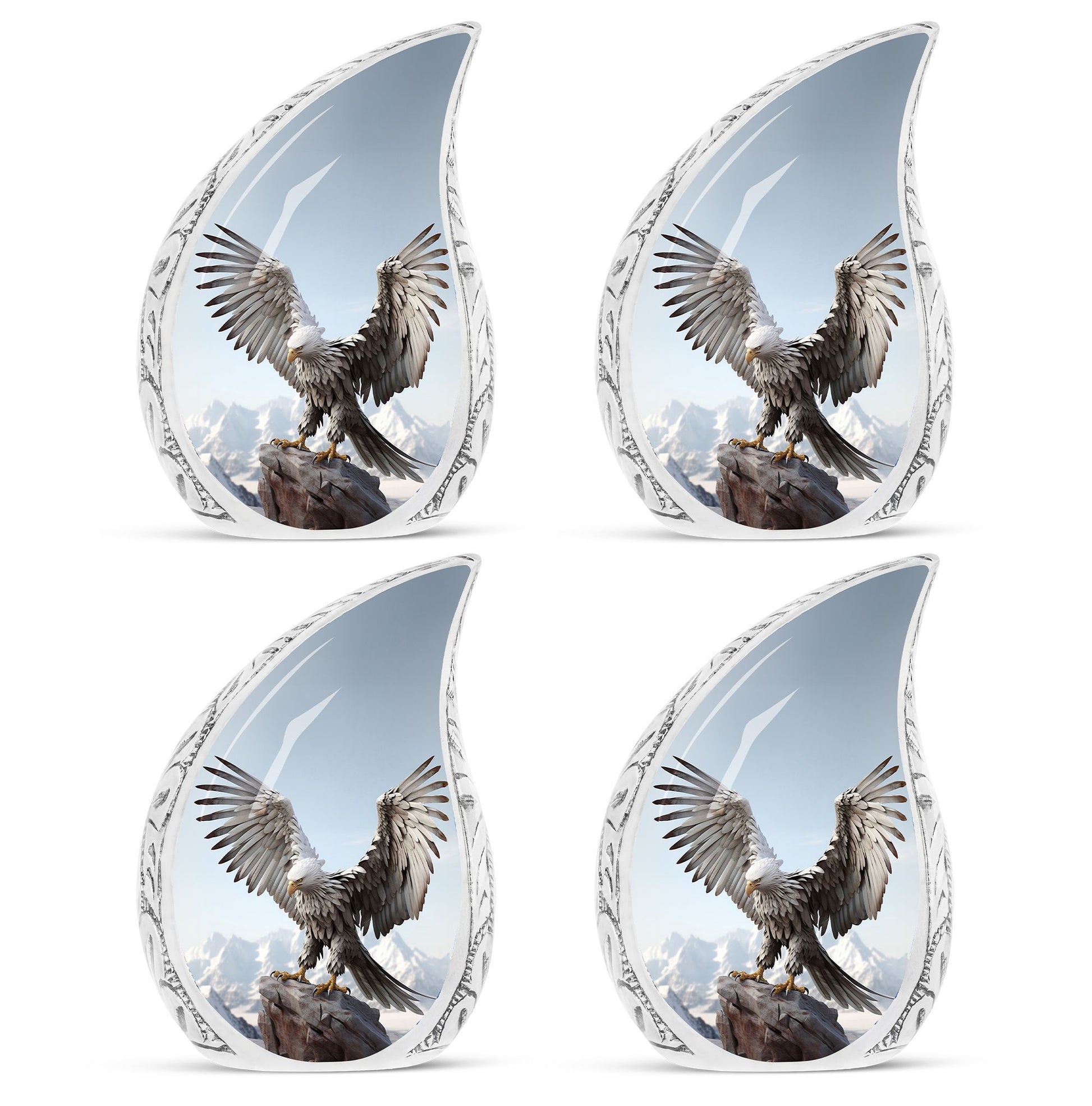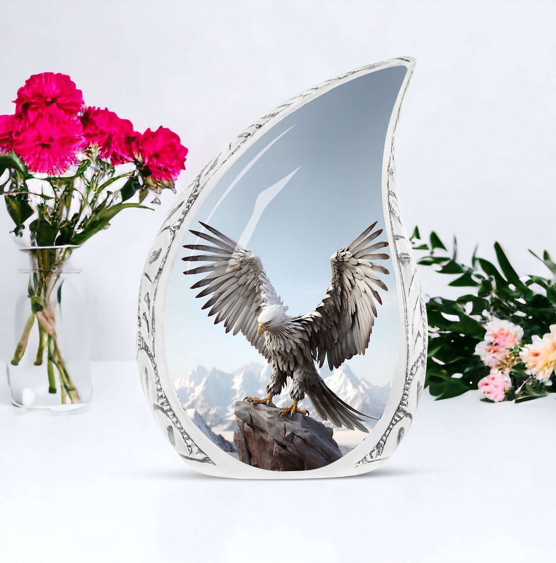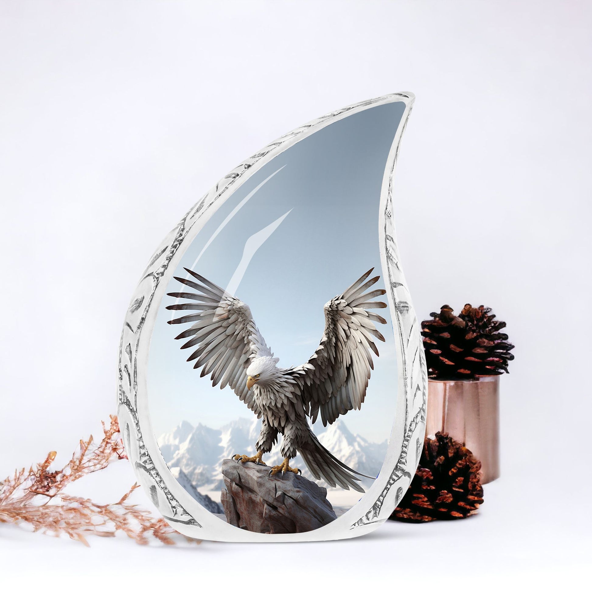 Adorn your beloved's final resting place with one of our Traditional Eagle Urns for Ashes. Exclusively for cherished adults or seniors, this heirloom quality product falls under the Memorial Ceremony Supplies category. Standing 10 inches tall, this cremation urn weighs a sturdy 3.3 pounds, signifying its robust construction. Composed of high-grade Aluminium, this Large Urn comes with a touching feature of personalization; you can choose to honor your loved ones by engraving their names. The capacity of the urn is around 200 cubic inches, ensuring enough space for most human remains. It comes neatly packaged with a velvet pouch for containment and safekeeping of ashes.