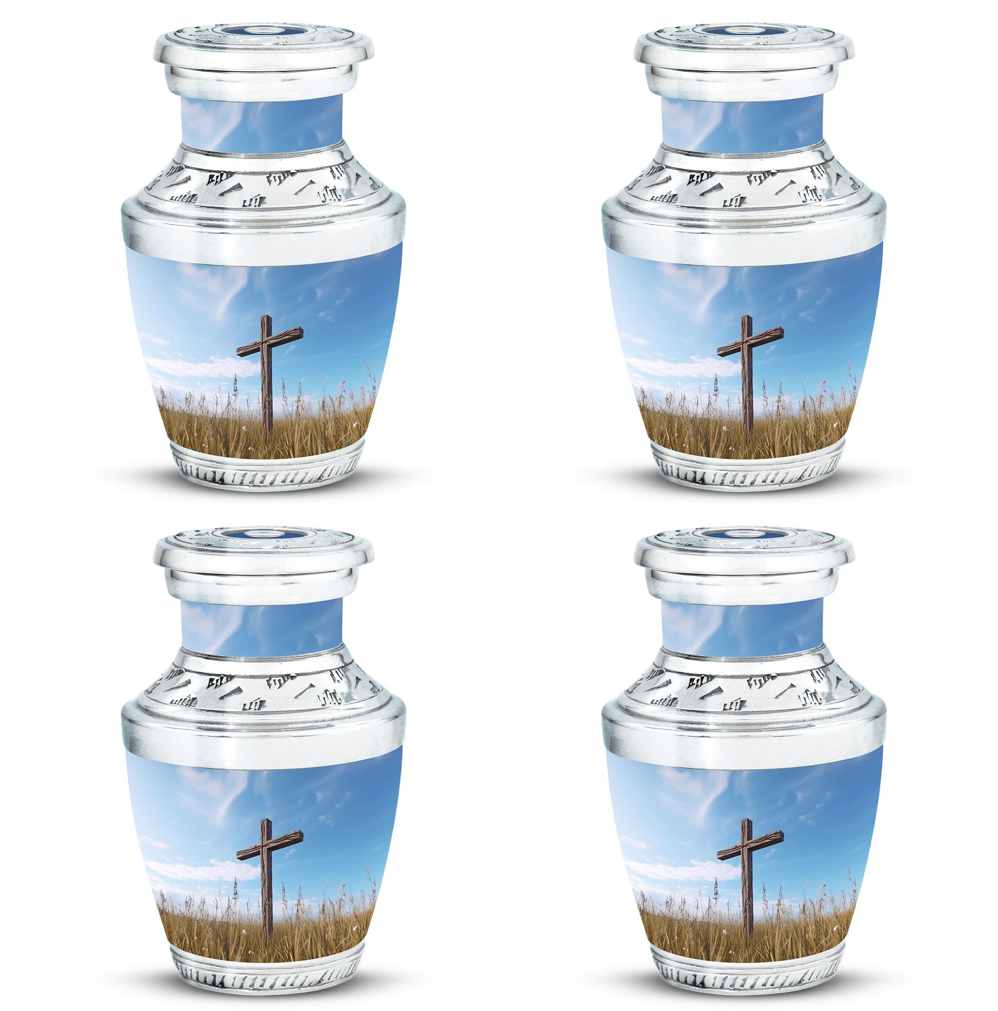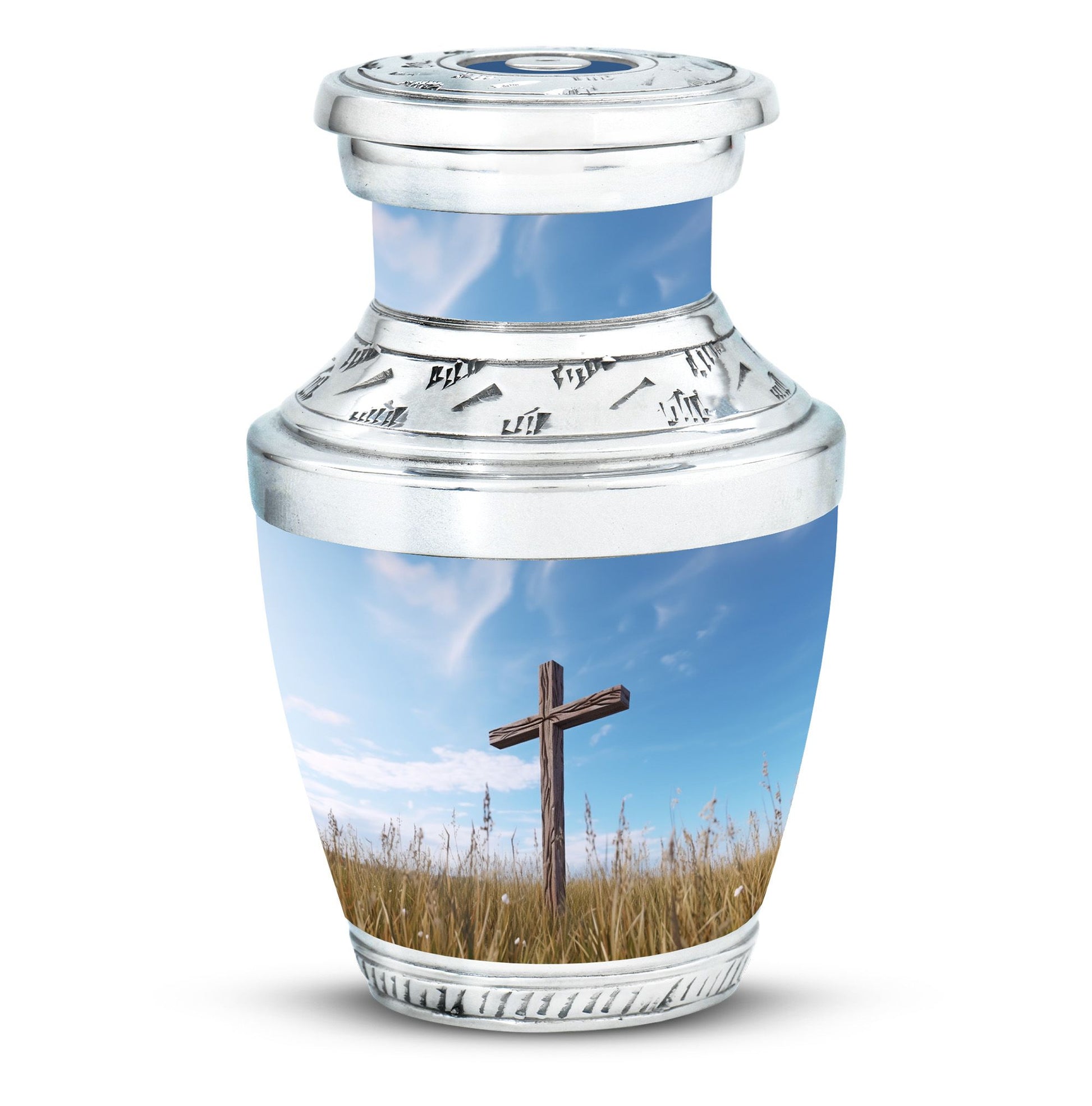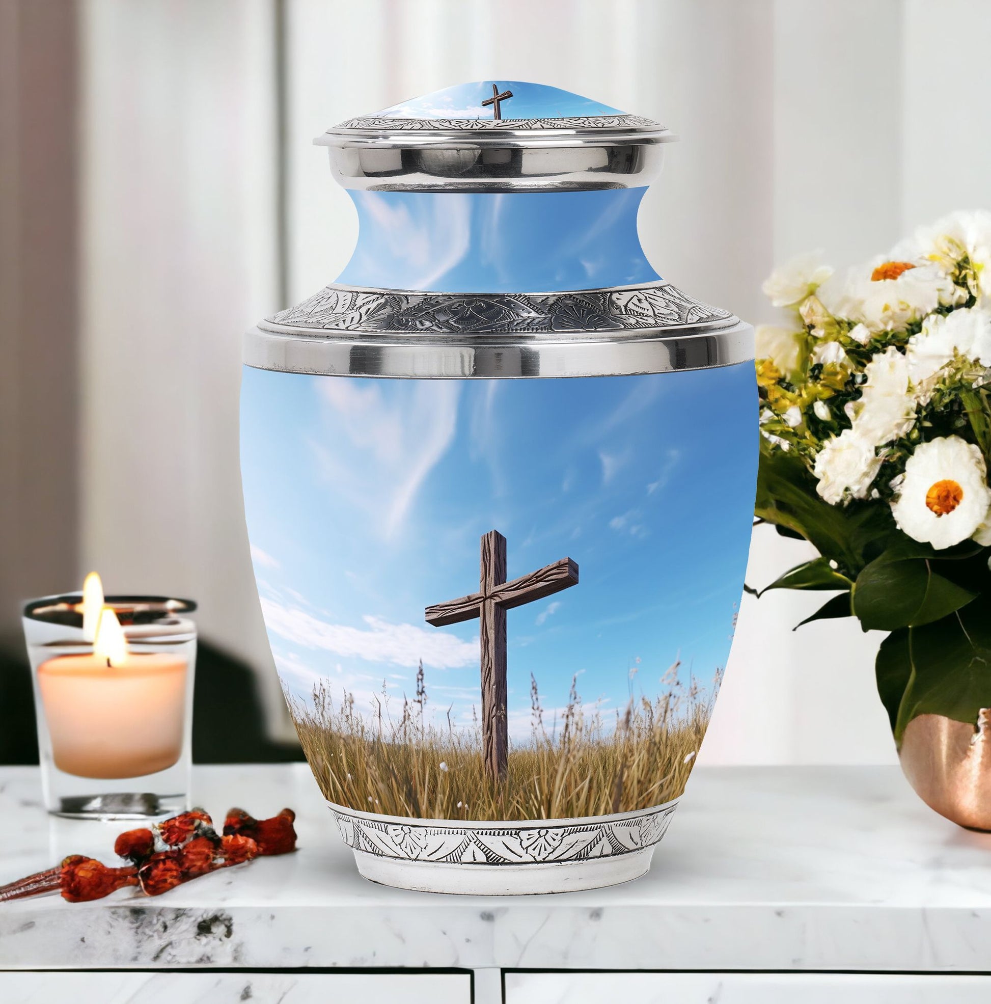Impeccably crafted, the Jesus Christ Cross Cremation Urn represents a dignified and soulful way to honor a life lived with faith. This large urn, built with high-quality aluminium, reflects a comforting solidity at an approximate weight of 3.3 pounds. Its classic design stands at a decent size of 10 inches in height, with an ability to contain approximately 200 cubic inches of ashes. Perfect for any resting place, this urn features a 3-inch size that is both compact and emblematical. Personalized Urns like this offer an additional unique service: the option to customize this sacred memorial with engraved names. Furthermore, its packaging is just as serene and respectful, arriving with a velvet pouch to gently house the ashes. This Memorial Ceremony Supplies product makes a fitting tribute for ceremonial needs or as a Decorative Urn for Ashes. Recognize a spiritual journey, remembrance and love with this heartwarming cremation urn.