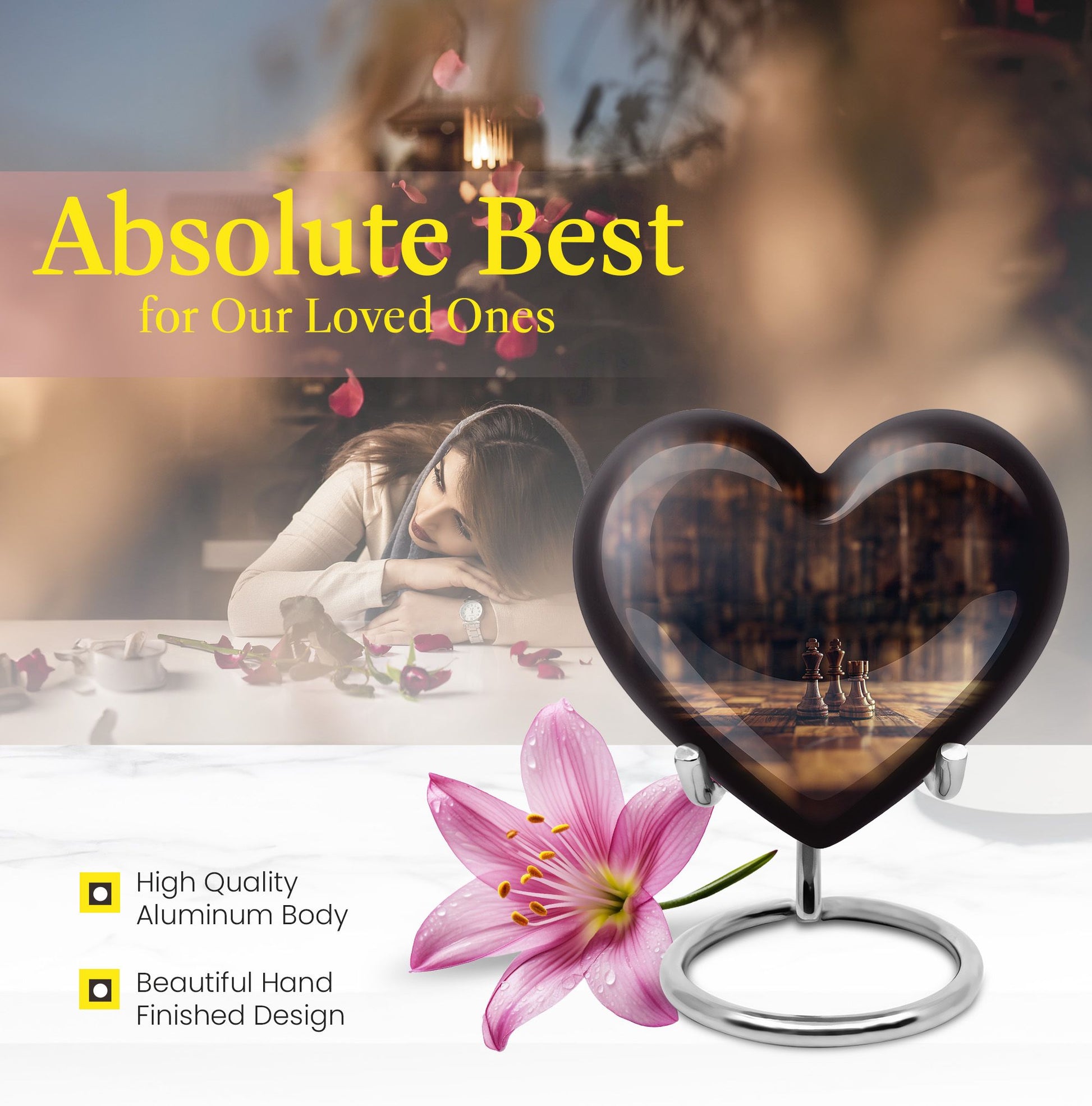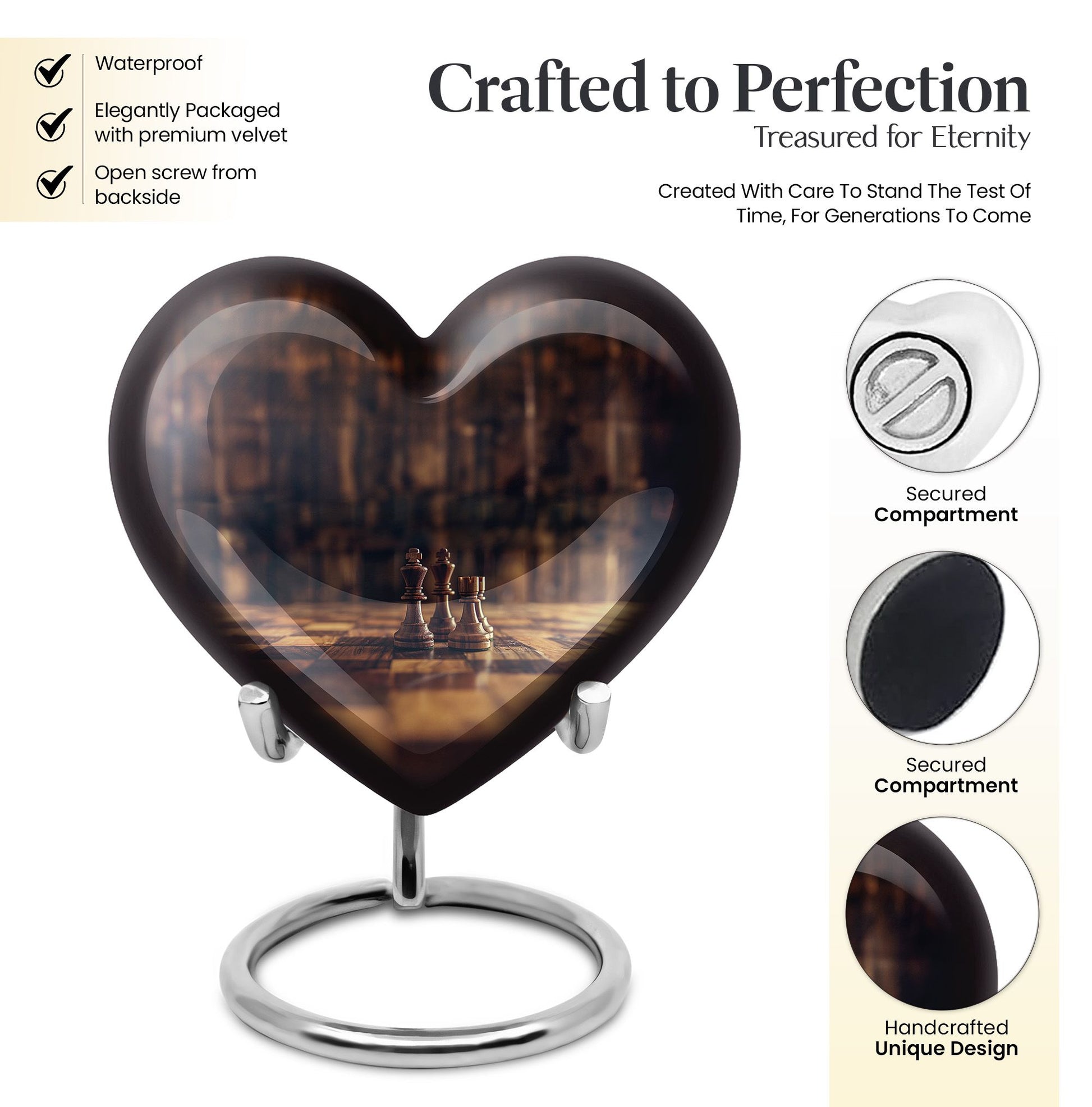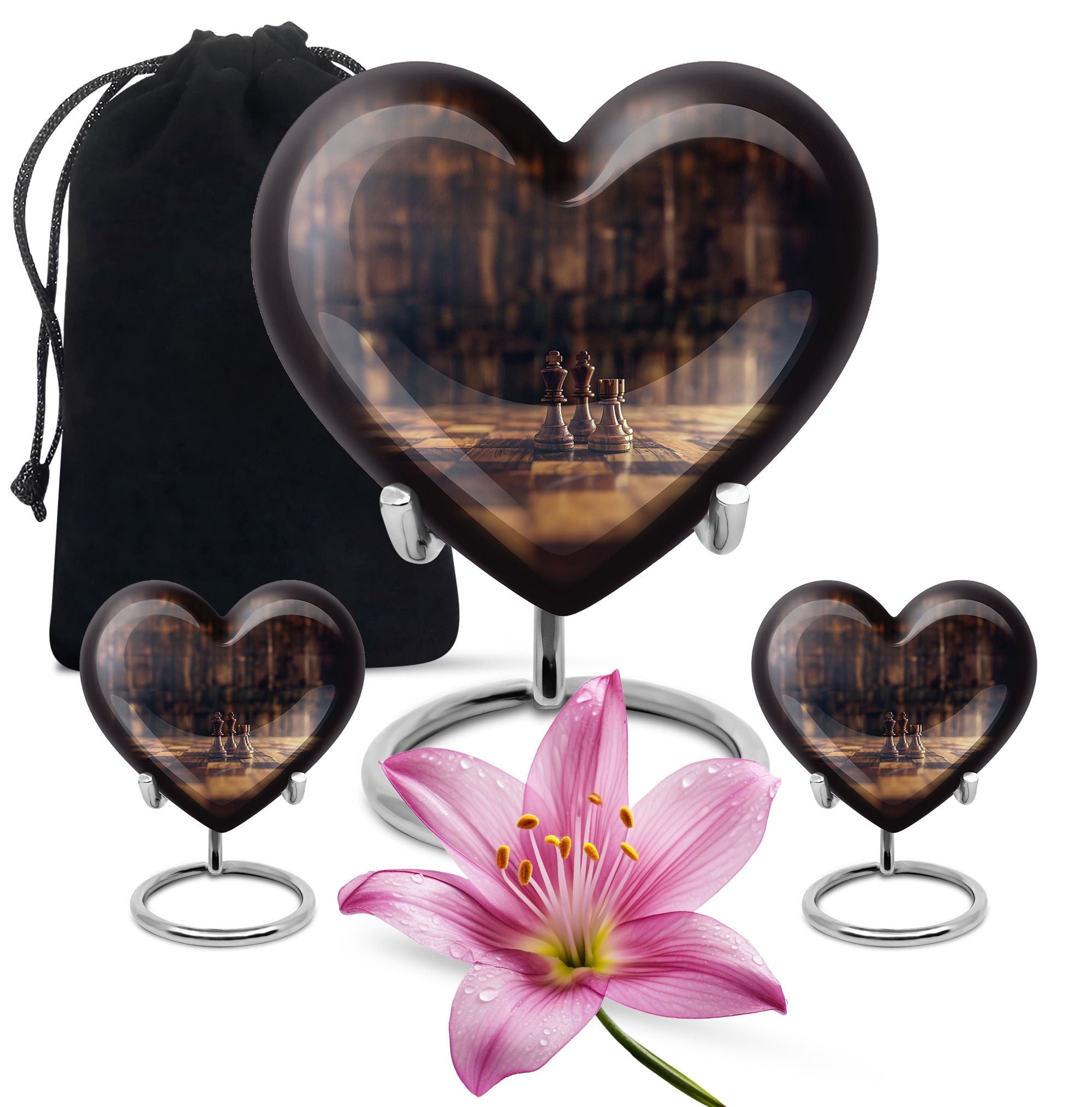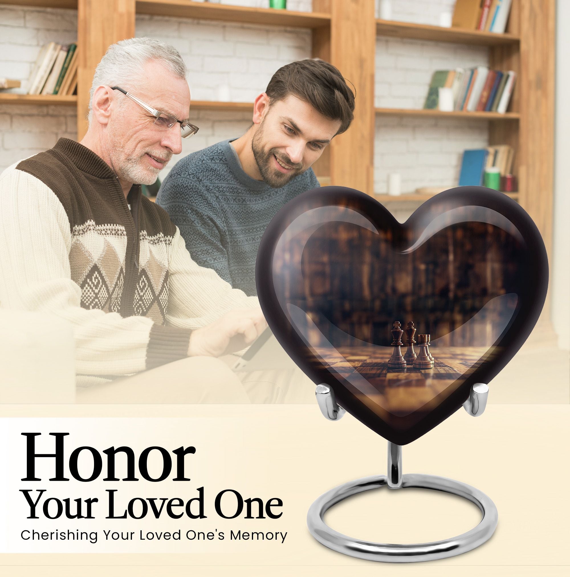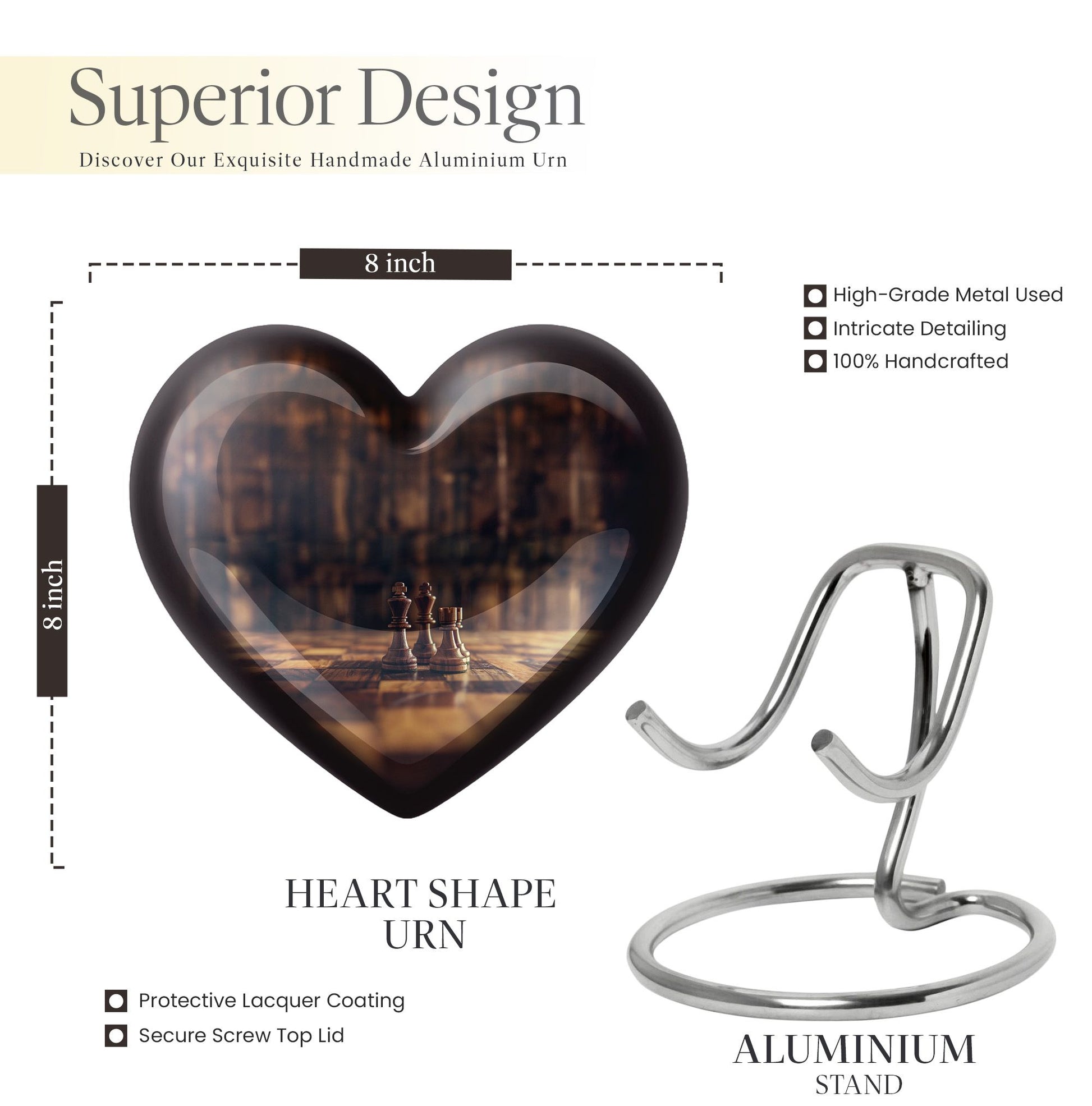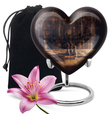 This 10-inch Chess Urn is an elegantly crafted memorial urn perfect for male or female adults. Its dignified size and weight, at 10 inches in height and 3.3 pounds, provide a distinct and honorable memento for your loved one's ashes. With a generous capacity of 200 cubic inches, this is an ideal large urn for honoring the memory of a cherished family member. The prominent chess theme adds a unique, personal touch, resonating with those who appreciate the intricate play of this age-old game. This heart urn is artfully crafted using durable aluminium, ensured to stand the tests of time. For more personalized memorial ceremony supplies, this urn facilitates customization through engraving names on it. Each Chess Urn purchase includes a velvet pouch, providing a soft, respectful containment for the ashes. Our unique urns are not explicitly found in standard searches like 'memorial urns' or 'urns for ashes' but are nestled within the niche category of 'Companion Urns for Two Adults' and 'large metal urn for ashes.' If you are seeking a special, nuanced way to remember your loved one, choose our venerable Chess Urn.