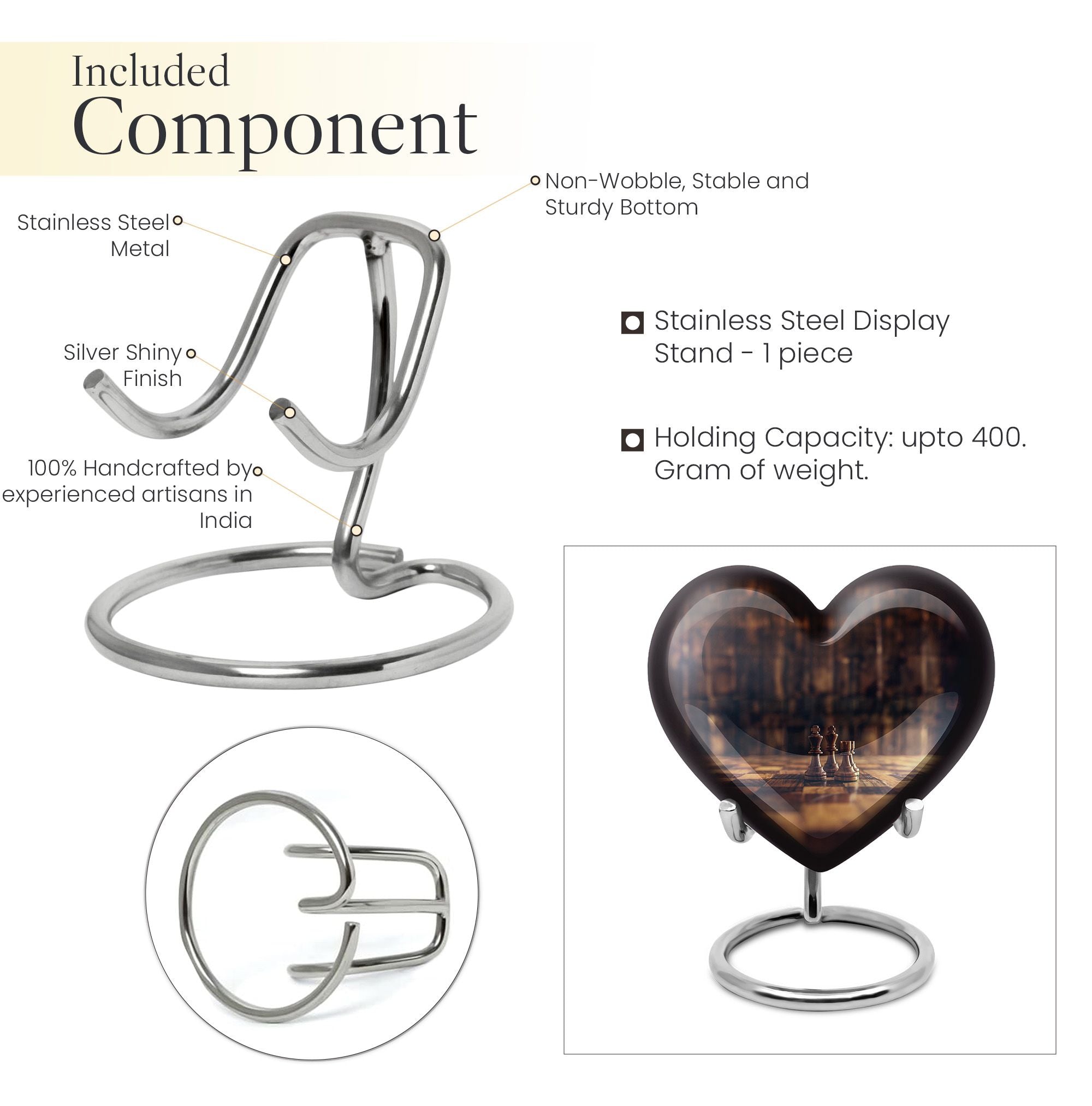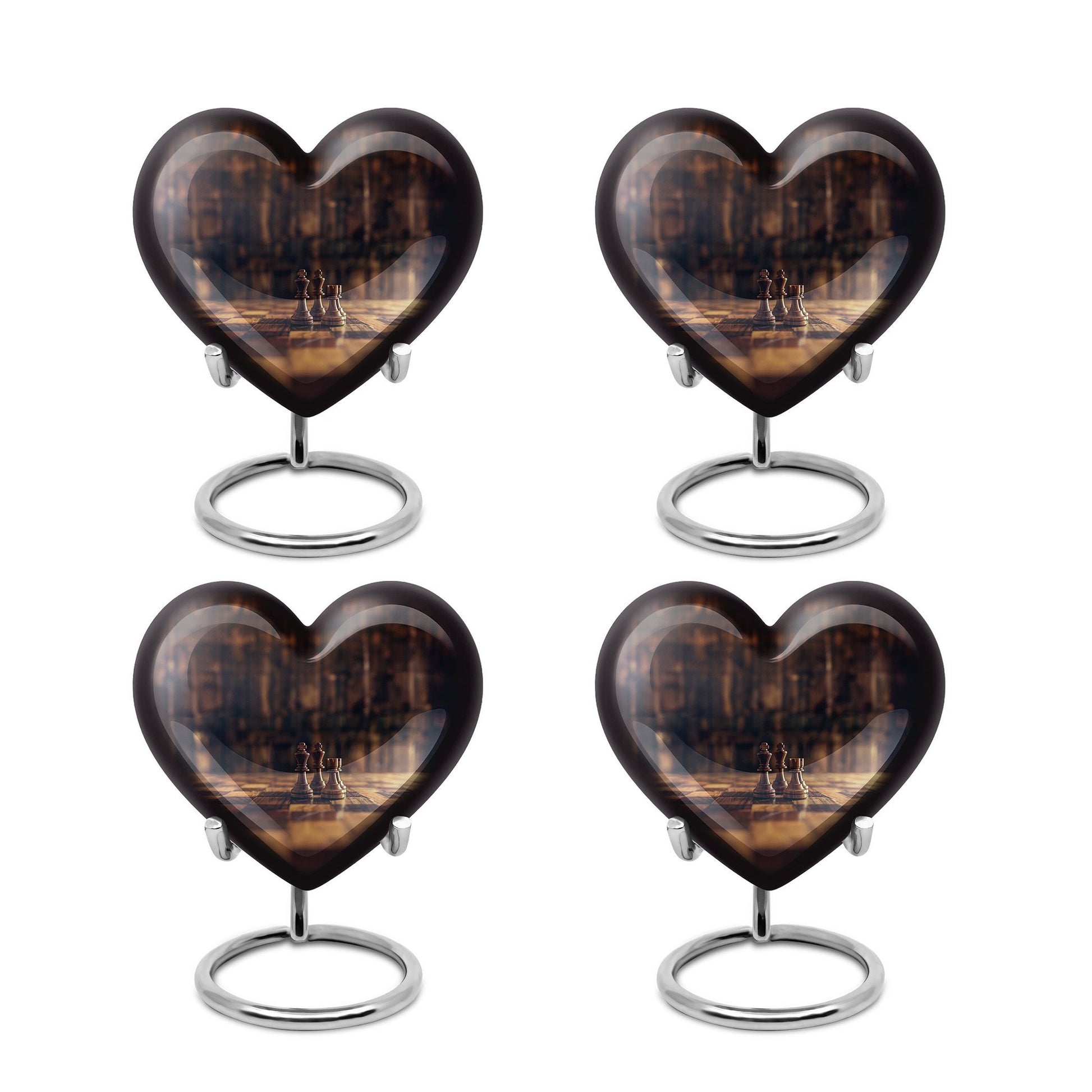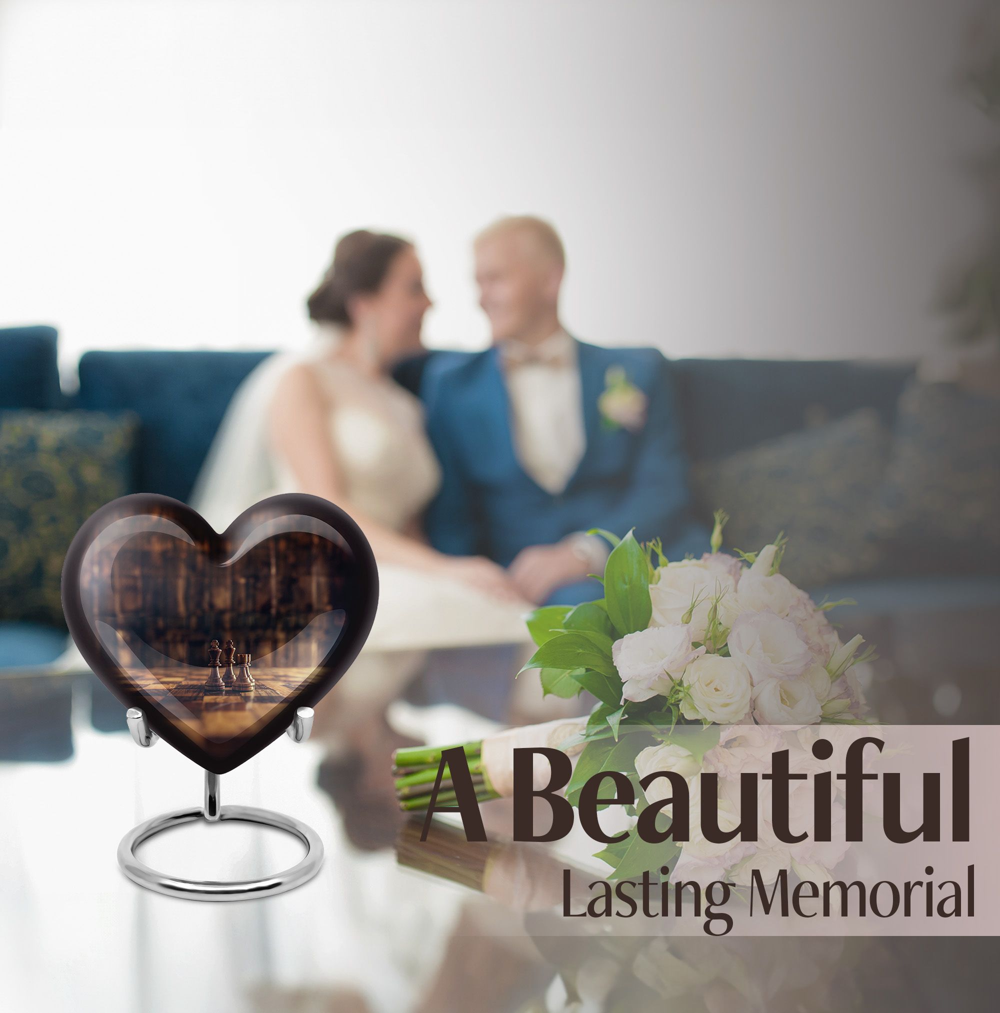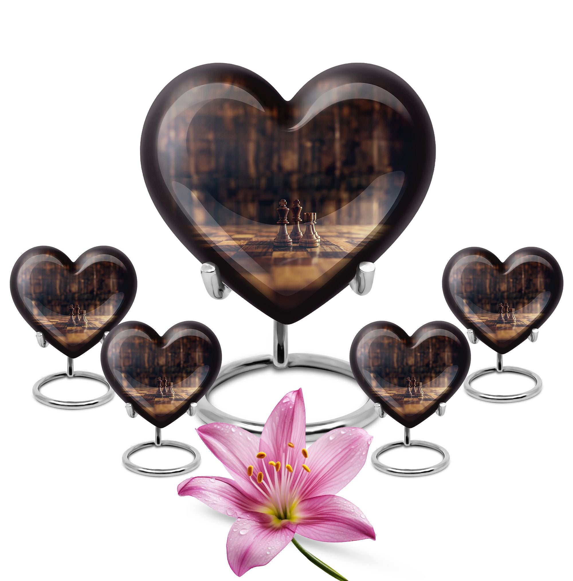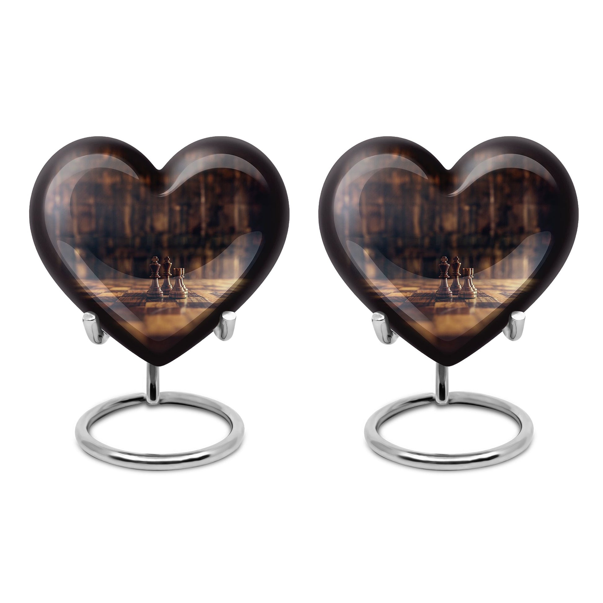 This 10-inch Chess Urn is an elegantly crafted memorial urn perfect for male or female adults. Its dignified size and weight, at 10 inches in height and 3.3 pounds, provide a distinct and honorable memento for your loved one's ashes. With a generous capacity of 200 cubic inches, this is an ideal large urn for honoring the memory of a cherished family member. The prominent chess theme adds a unique, personal touch, resonating with those who appreciate the intricate play of this age-old game. This heart urn is artfully crafted using durable aluminium, ensured to stand the tests of time. For more personalized memorial ceremony supplies, this urn facilitates customization through engraving names on it. Each Chess Urn purchase includes a velvet pouch, providing a soft, respectful containment for the ashes. Our unique urns are not explicitly found in standard searches like 'memorial urns' or 'urns for ashes' but are nestled within the niche category of 'Companion Urns for Two Adults' and 'large metal urn for ashes.' If you are seeking a special, nuanced way to remember your loved one, choose our venerable Chess Urn.