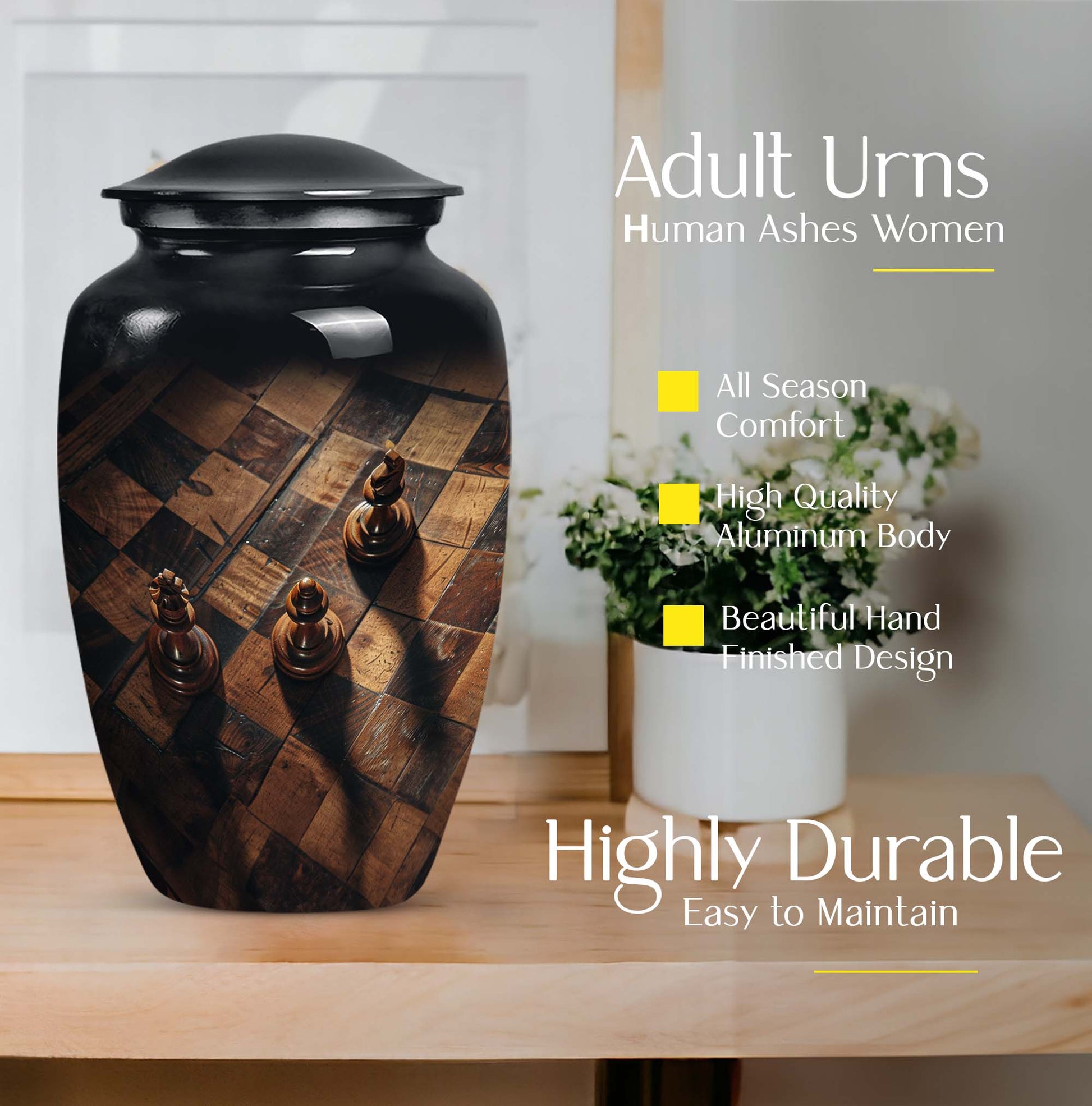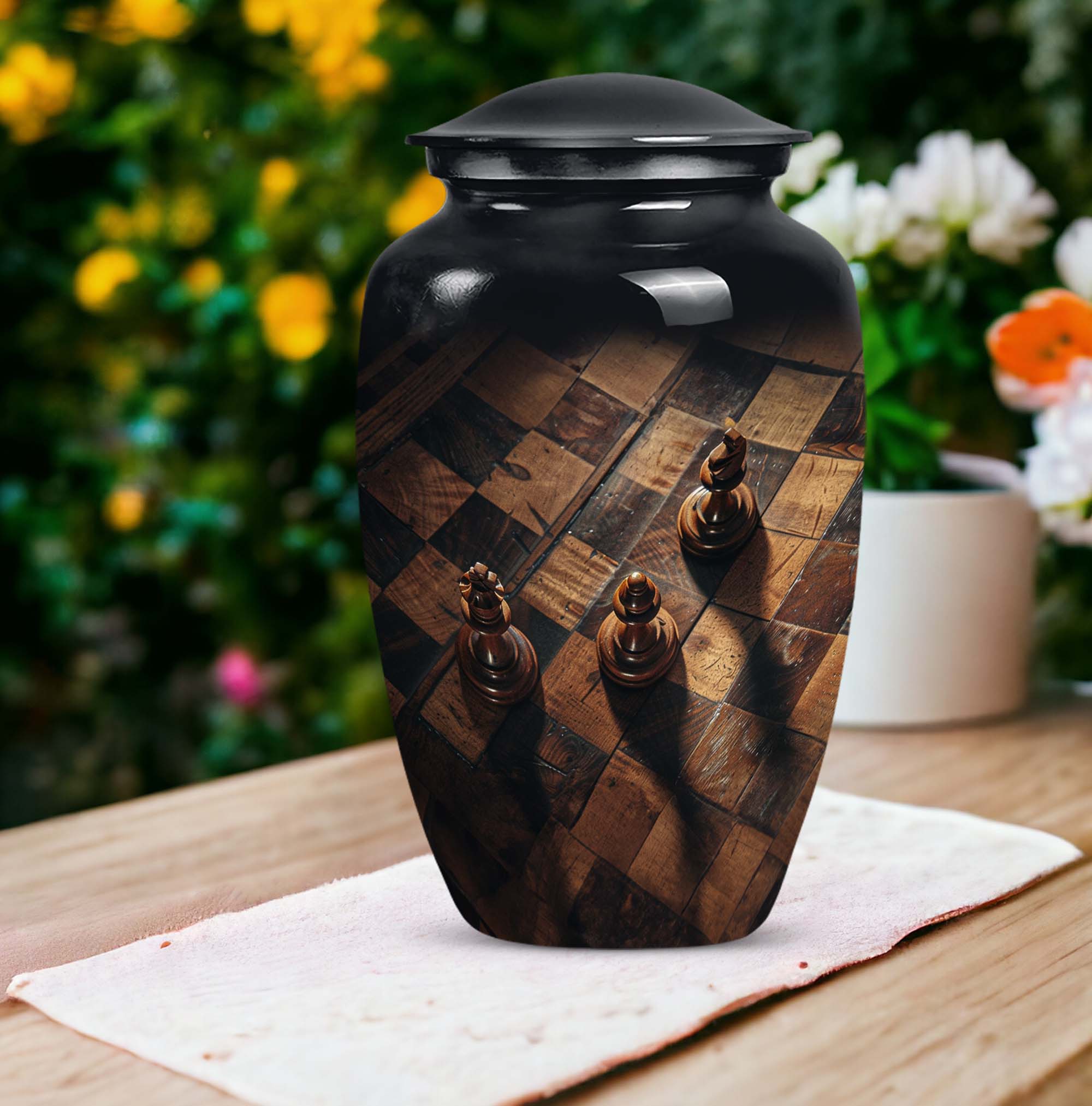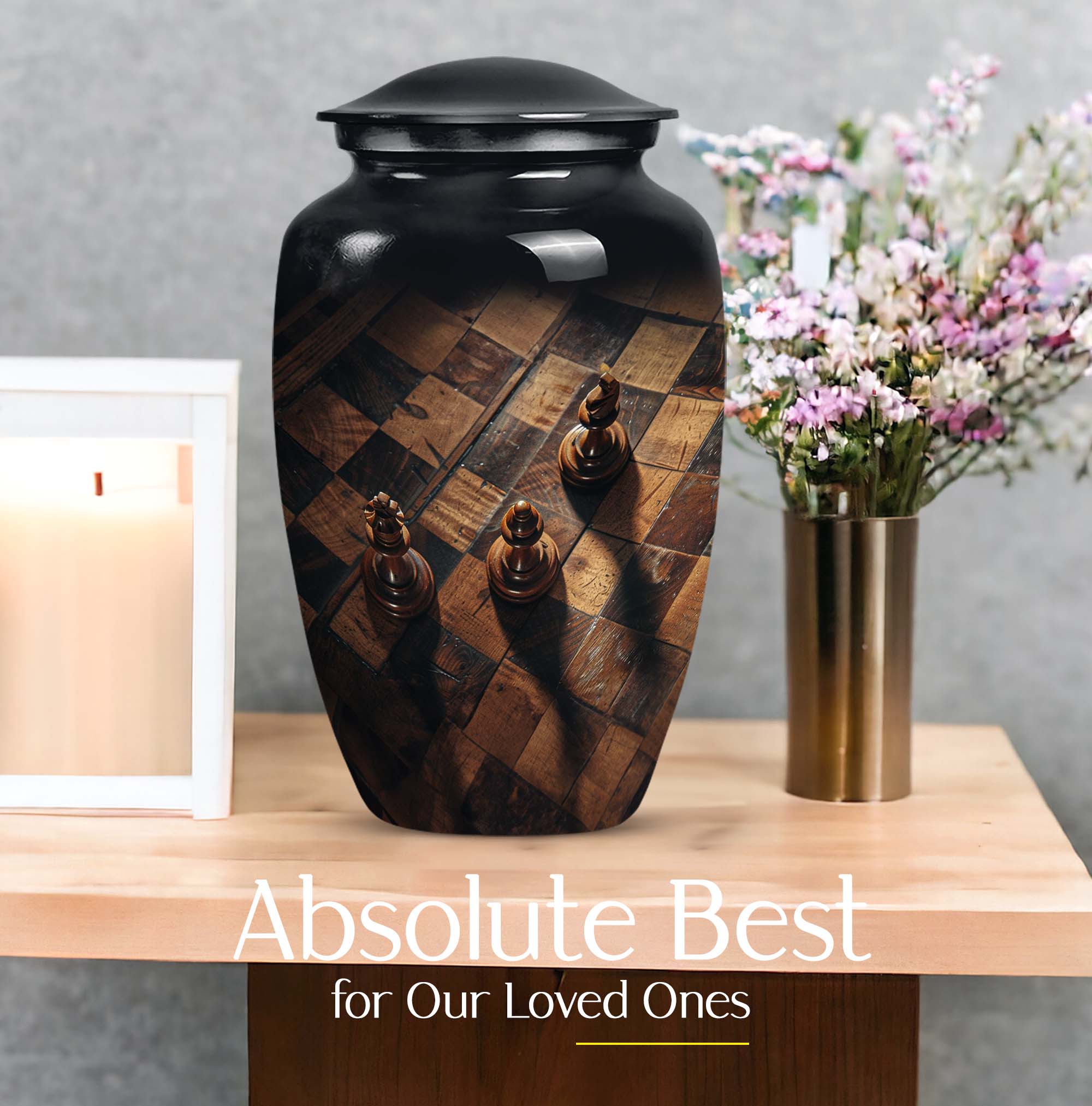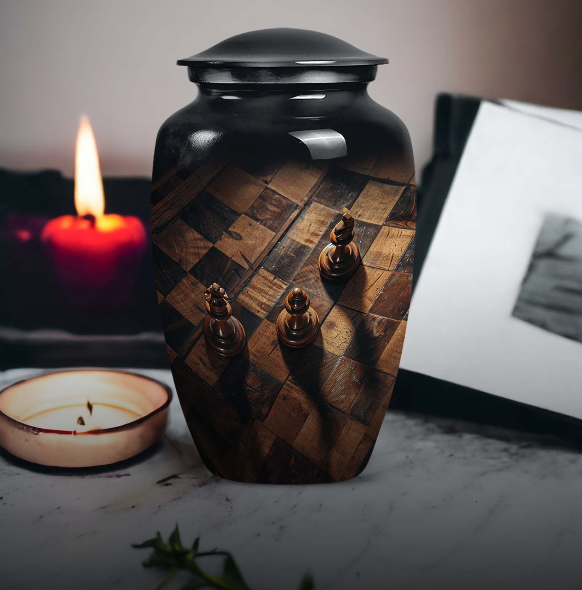 Introducing our Chess Urn - a timeless tribute to your loved one. This 10-inch artifact draws its design repertoire from the classic urn aesthetics, elegantly finished in an abstract theme that whispers serenity. Made from sturdy and lightweight aluminium, this cremation urn is not just a Memorial Burial Urn, but a piece of art that elegantly blends with your interior decor. With a weight of 3.3 pounds and dimensions measuring 10 inches in height, the cremation urn conveniently fits 200 cubic inches of ashes, catering for most adults. Guard your precious memories with our cremation urns for humans, which comes with a velvet pouch to securely contain the ashes. Add an affectionate touch to evoke timeless memories with our funeral burial urn by personalizing it with engraved names. Make your funeral urns for adults' ashes more than just a vessel, but a testament of love and cherishing fond memories, without the noise of mainstream designs found everywhere. Our funeral ash urn ingeniously refrains from screaming for attention, yet quietly demands it.