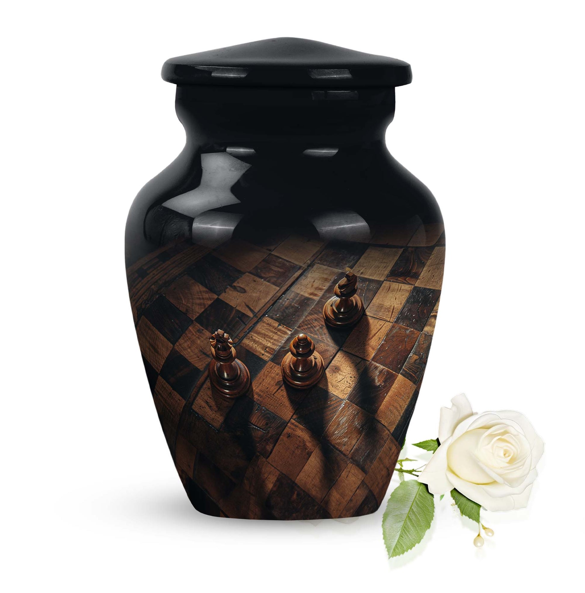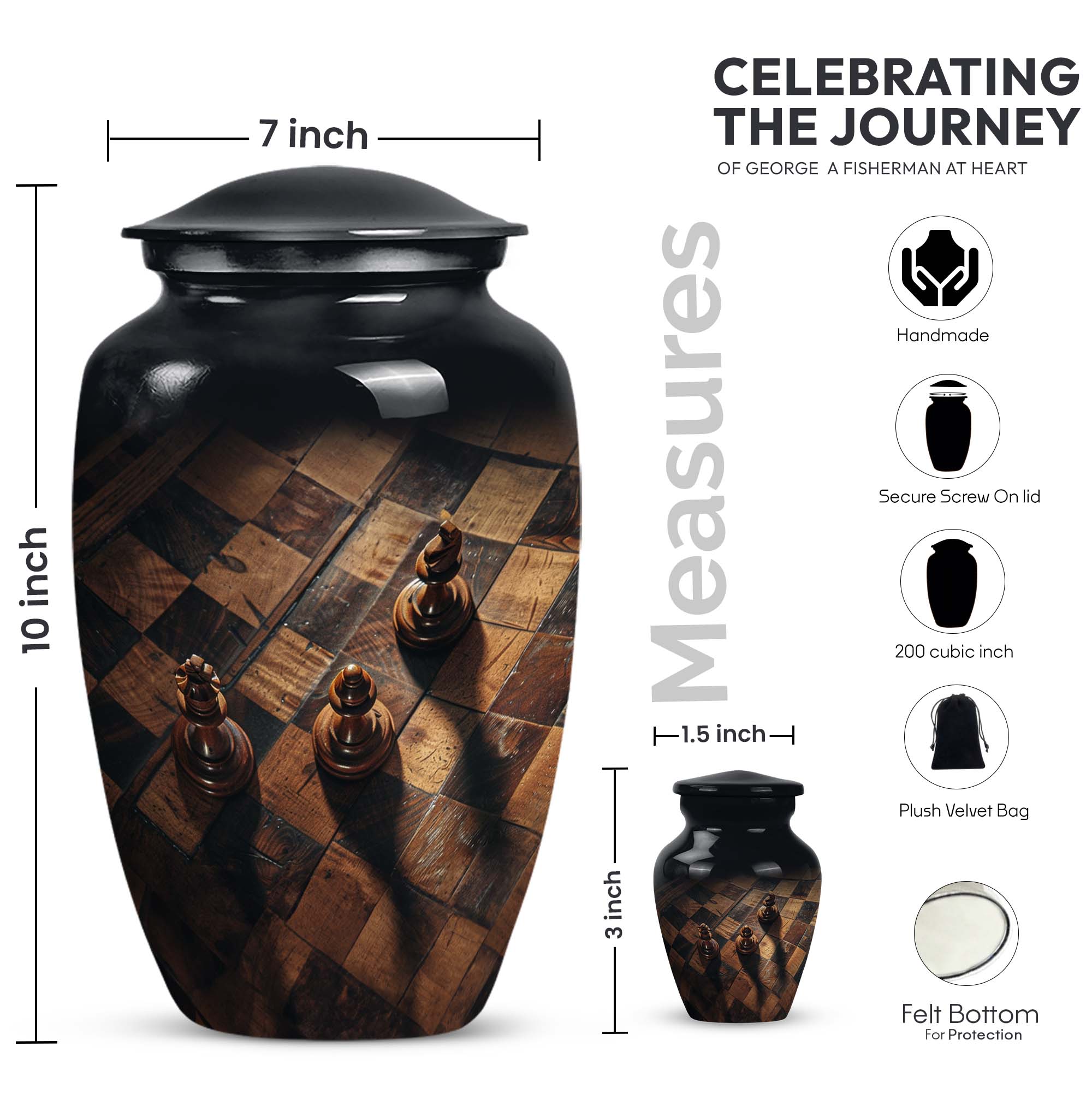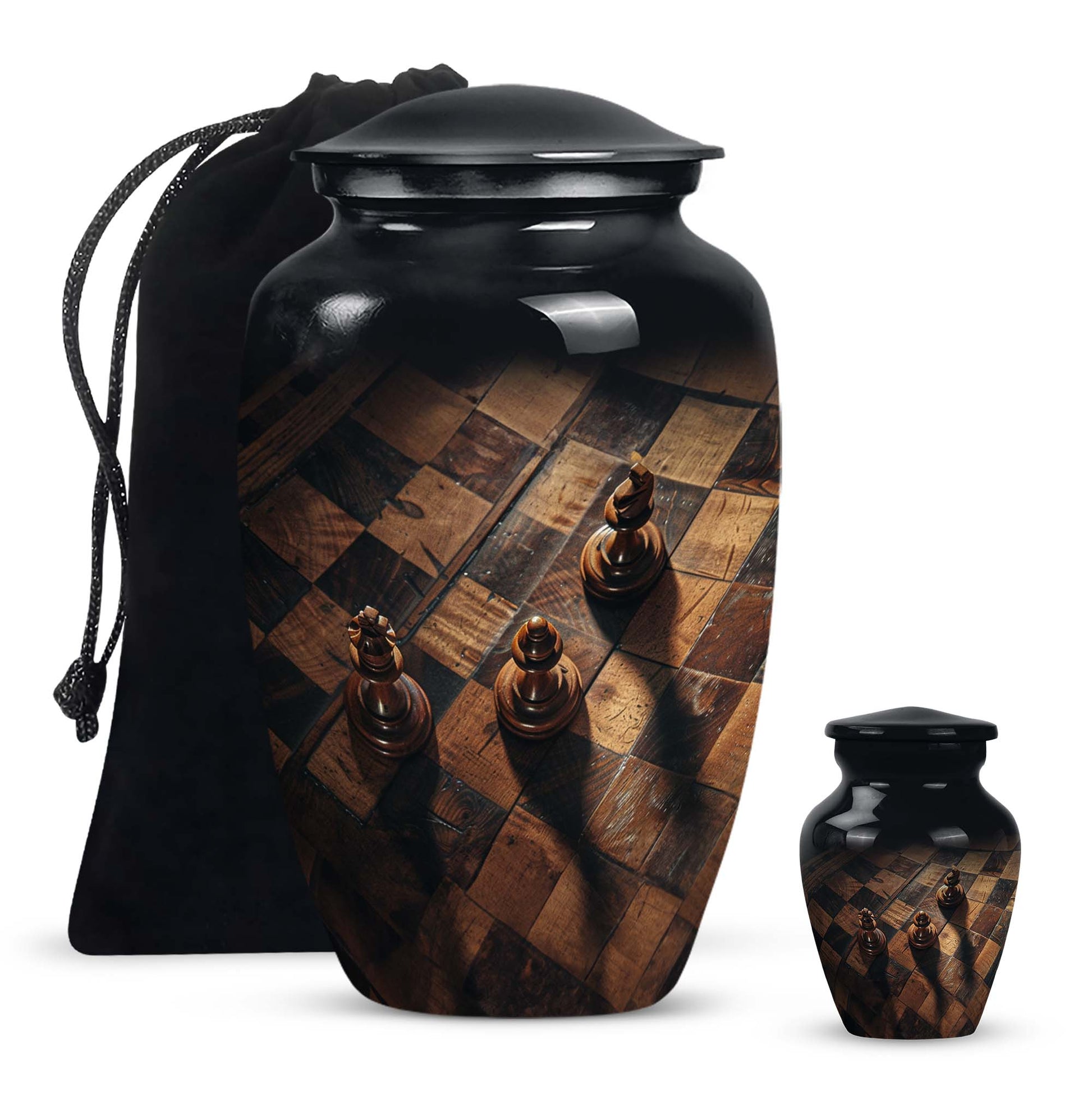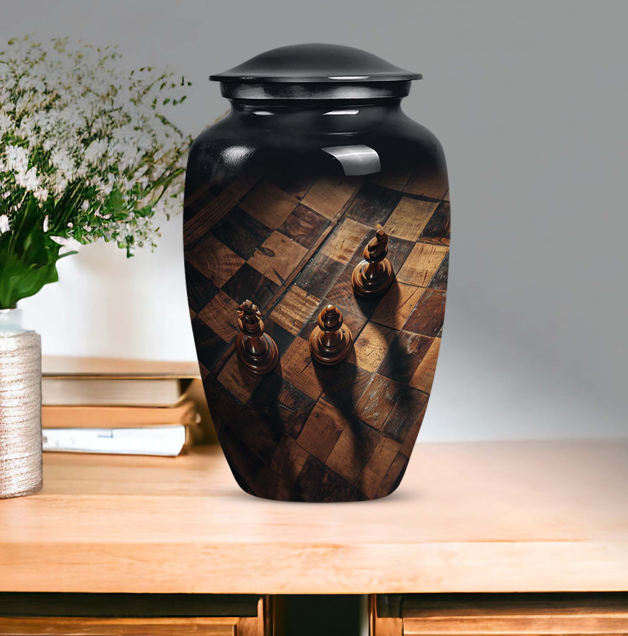 Introducing our Chess Urn - a timeless tribute to your loved one. This 10-inch artifact draws its design repertoire from the classic urn aesthetics, elegantly finished in an abstract theme that whispers serenity. Made from sturdy and lightweight aluminium, this cremation urn is not just a Memorial Burial Urn, but a piece of art that elegantly blends with your interior decor. With a weight of 3.3 pounds and dimensions measuring 10 inches in height, the cremation urn conveniently fits 200 cubic inches of ashes, catering for most adults. Guard your precious memories with our cremation urns for humans, which comes with a velvet pouch to securely contain the ashes. Add an affectionate touch to evoke timeless memories with our funeral burial urn by personalizing it with engraved names. Make your funeral urns for adults' ashes more than just a vessel, but a testament of love and cherishing fond memories, without the noise of mainstream designs found everywhere. Our funeral ash urn ingeniously refrains from screaming for attention, yet quietly demands it.