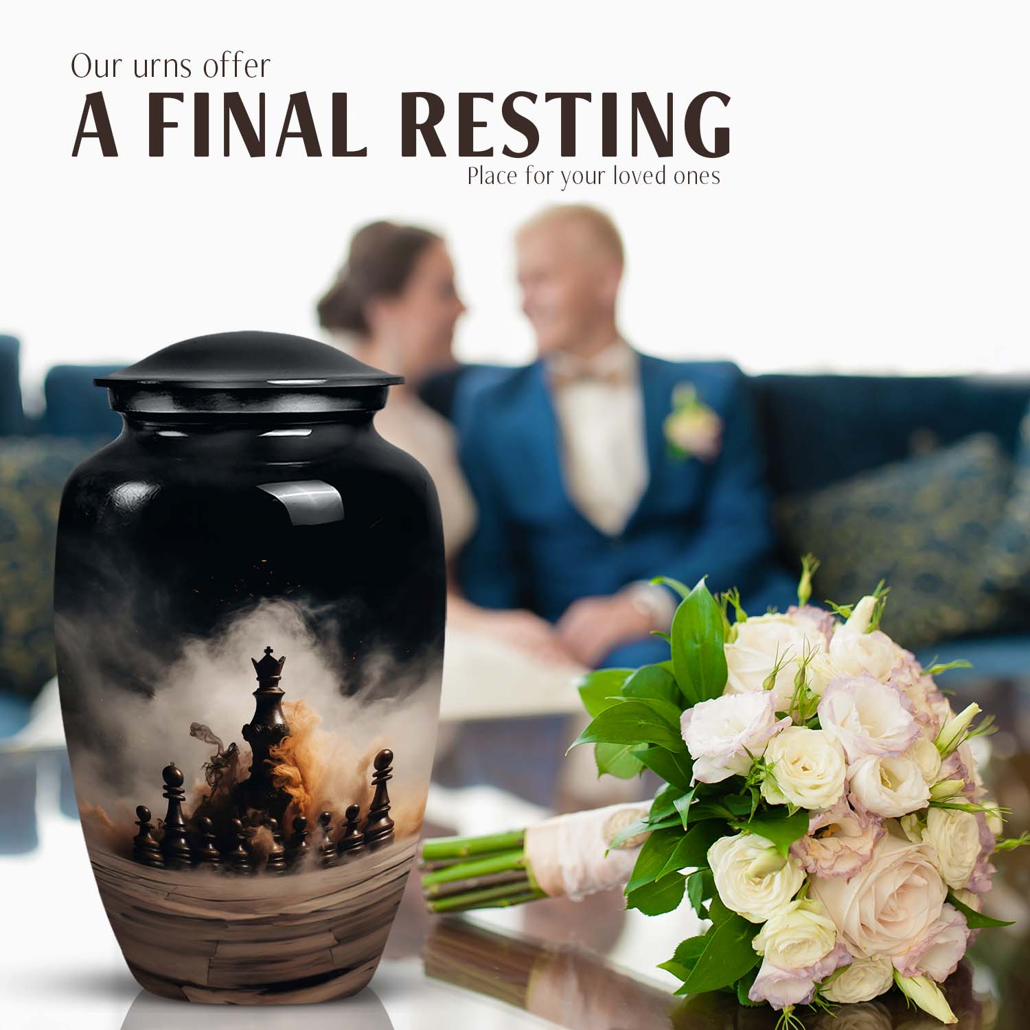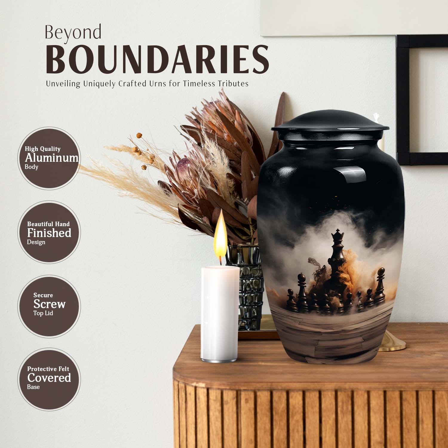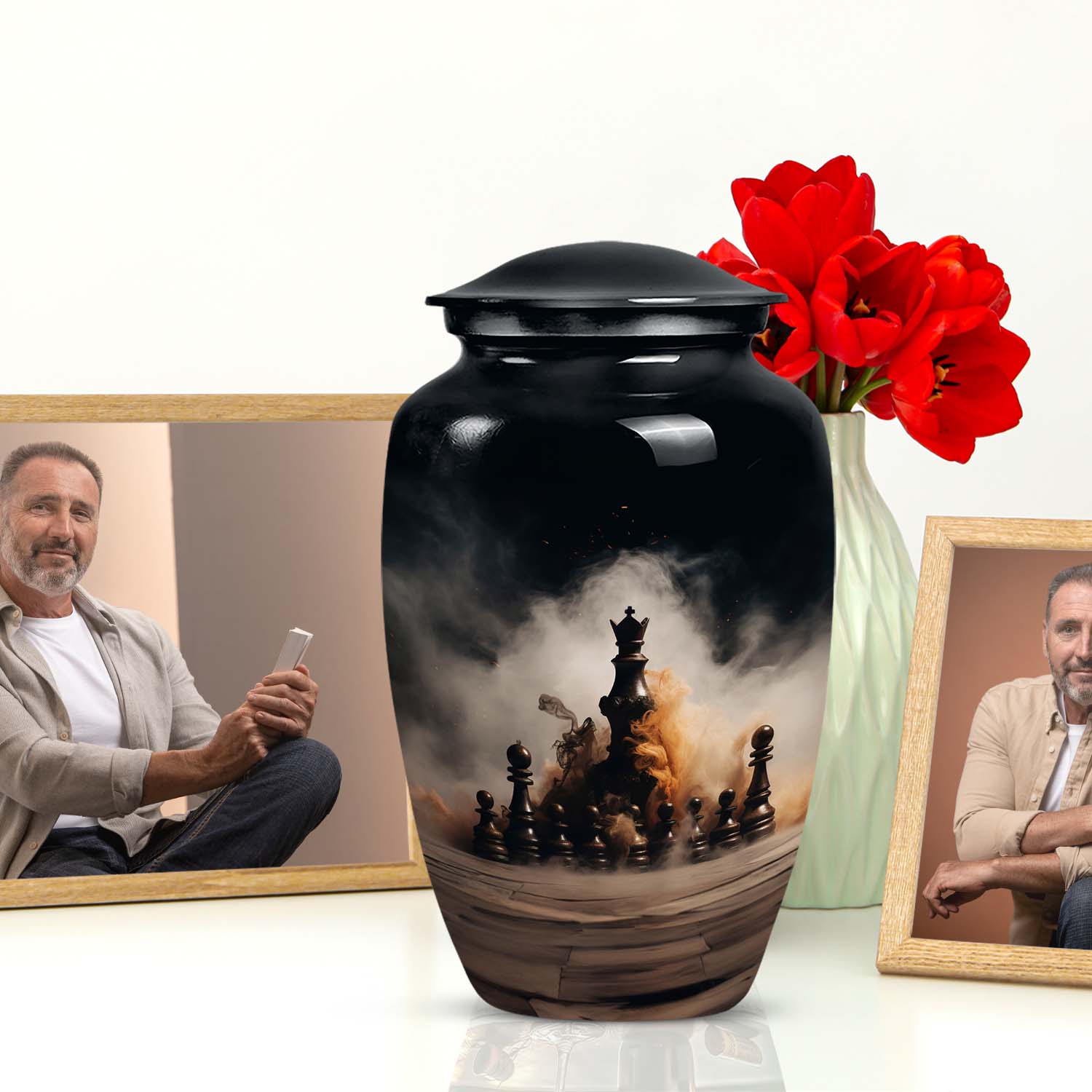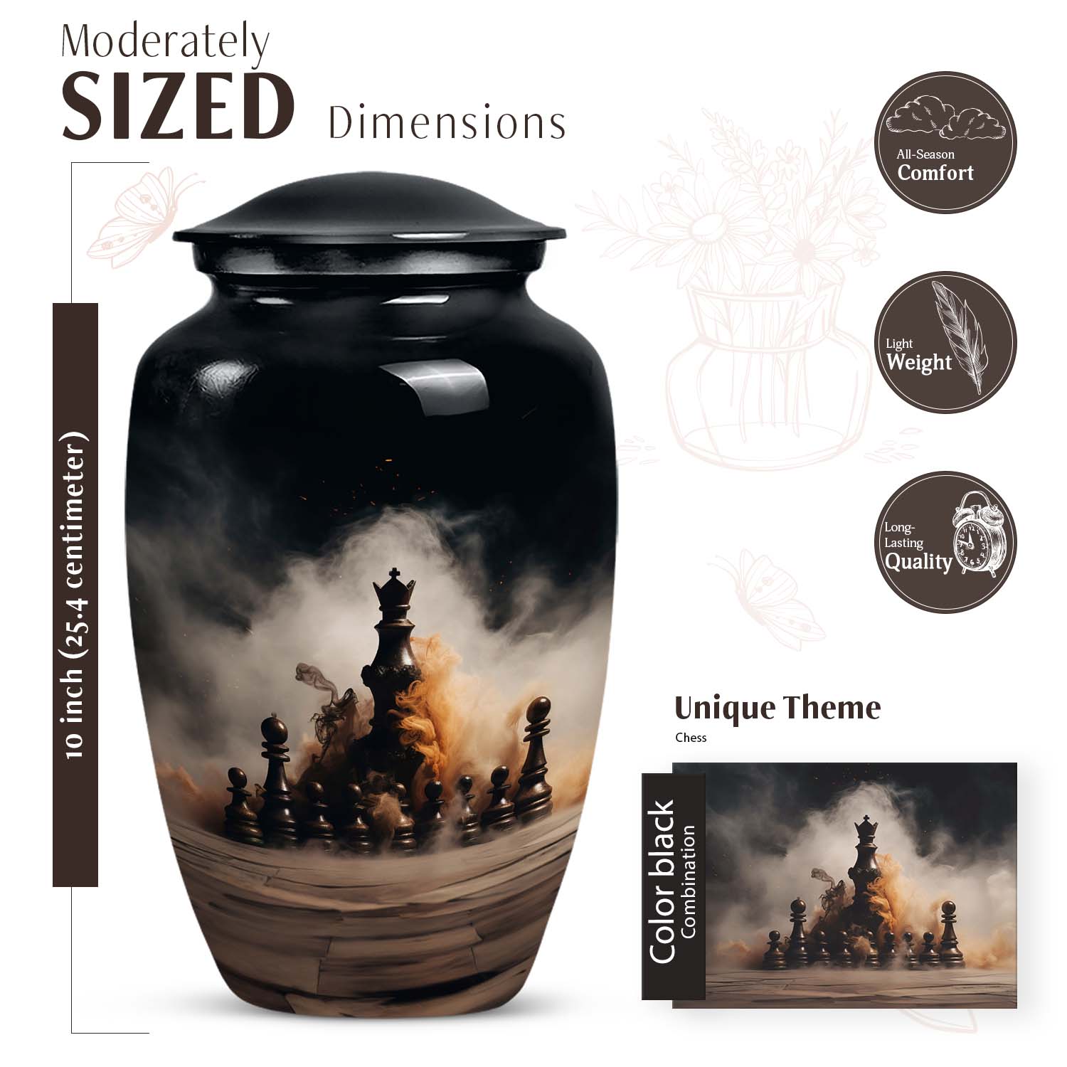 Impressively designed, this 'Chess Theme Urn' is a poignant and luxurious choice for those seeking distinctive and personalized memorial urns. Measuring 10 inches in height and weighing 3.3 pounds, this aluminium urn is robust, uniquely reflecting a combination of strength and enigmatic elegance. Its generous capacity can securely conserve up to 200 cubic inches of ashes, perfect as a large urn for human ashes adult. Each Chess Urn comes with a velvet pouch for the dignified containment of ashes, ensuring a suitable final resting place for your loved ones. Adding a unique touch to this cremation urn is the given option of engraving names, presenting an emotional connection through this more personal tribute. This cremation large urn stands out as truly special among urns for cremation ashes for men and women. Its traditional classic urn design, combined with the unique chess theme, adds a fulfilling sense of depth to its character. In search of urn ash burial urns or personalized urns for cremation ashes mother? This Chess Urn provides a remarkable option worth considering.