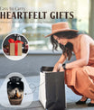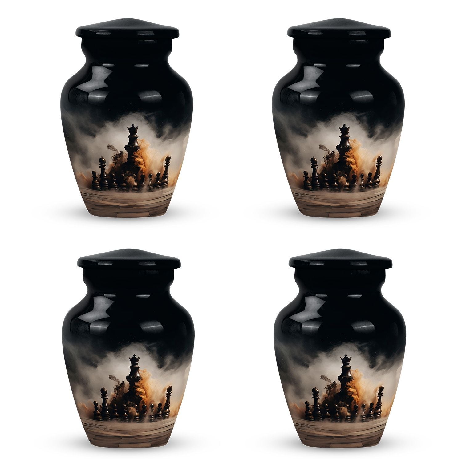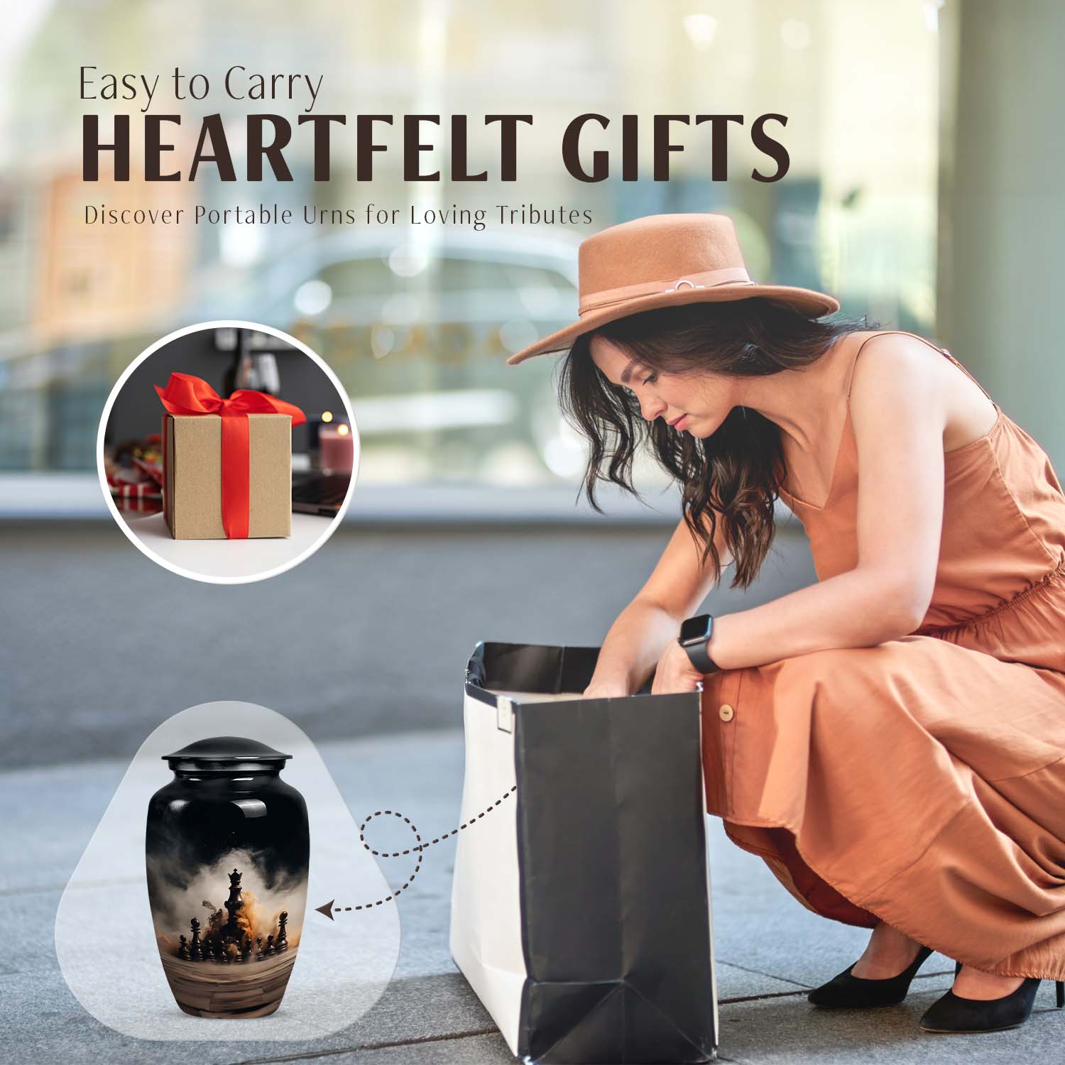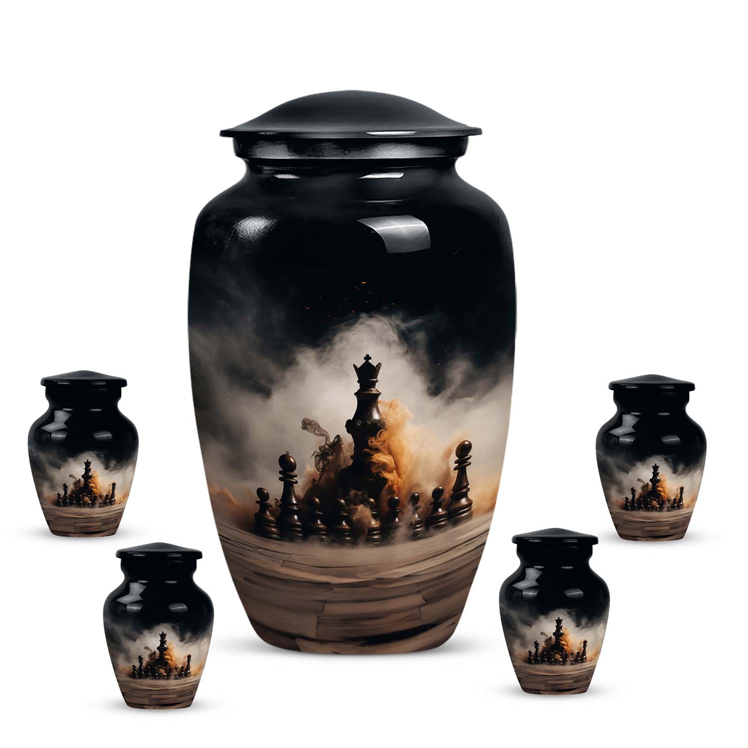 Impressively designed, this 'Chess Theme Urn' is a poignant and luxurious choice for those seeking distinctive and personalized memorial urns. Measuring 10 inches in height and weighing 3.3 pounds, this aluminium urn is robust, uniquely reflecting a combination of strength and enigmatic elegance. Its generous capacity can securely conserve up to 200 cubic inches of ashes, perfect as a large urn for human ashes adult. Each Chess Urn comes with a velvet pouch for the dignified containment of ashes, ensuring a suitable final resting place for your loved ones. Adding a unique touch to this cremation urn is the given option of engraving names, presenting an emotional connection through this more personal tribute. This cremation large urn stands out as truly special among urns for cremation ashes for men and women. Its traditional classic urn design, combined with the unique chess theme, adds a fulfilling sense of depth to its character. In search of urn ash burial urns or personalized urns for cremation ashes mother? This Chess Urn provides a remarkable option worth considering.