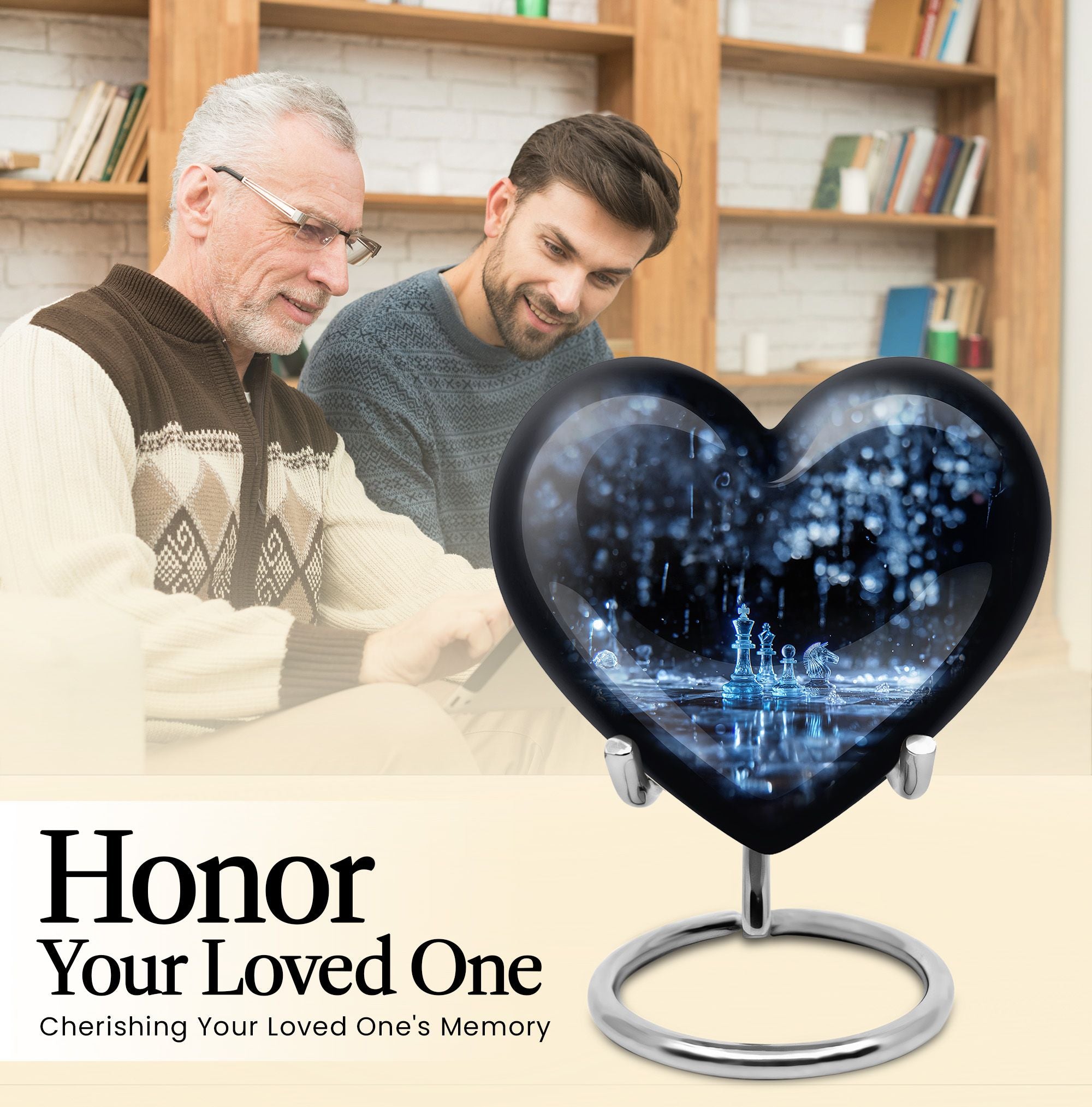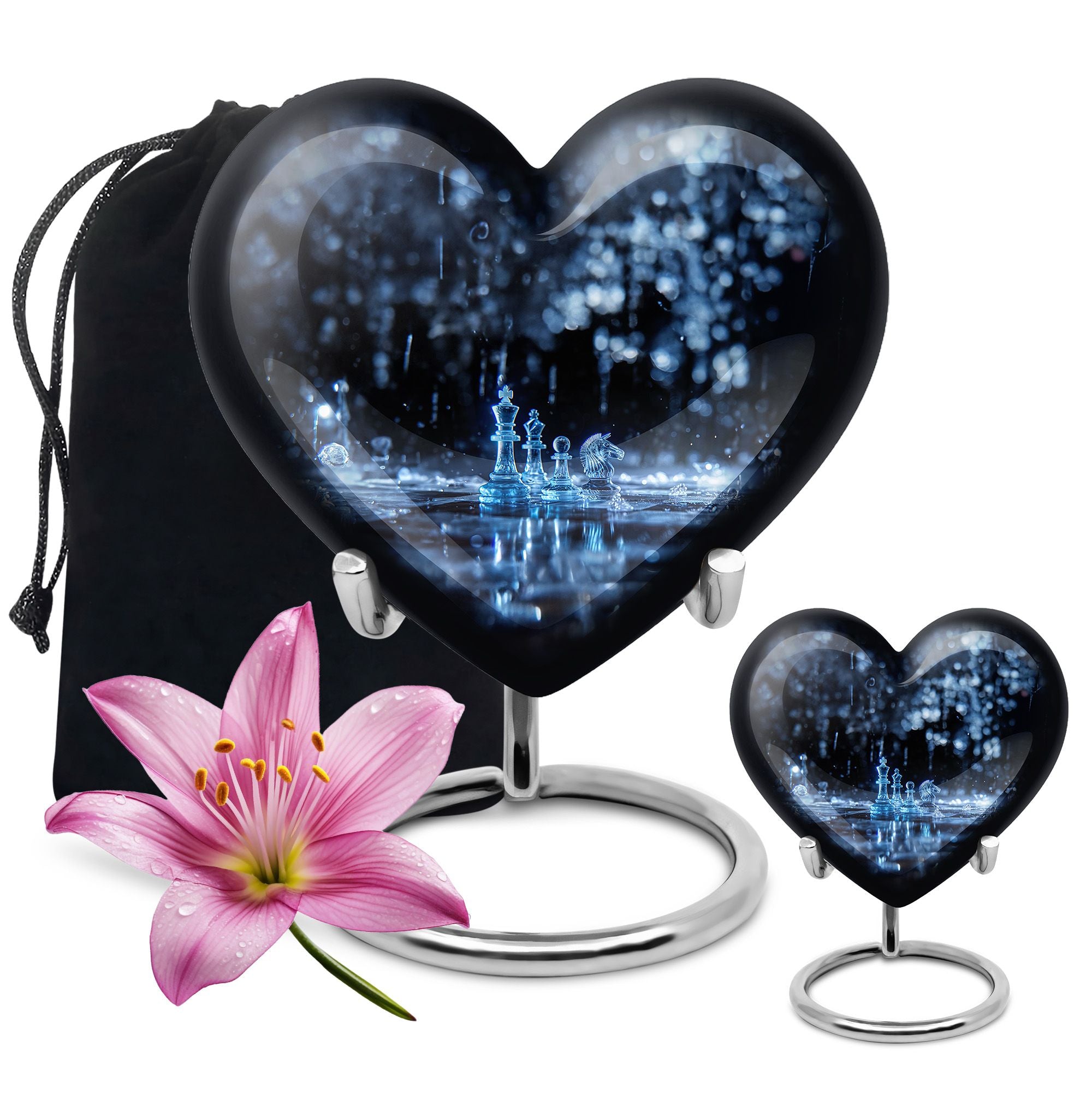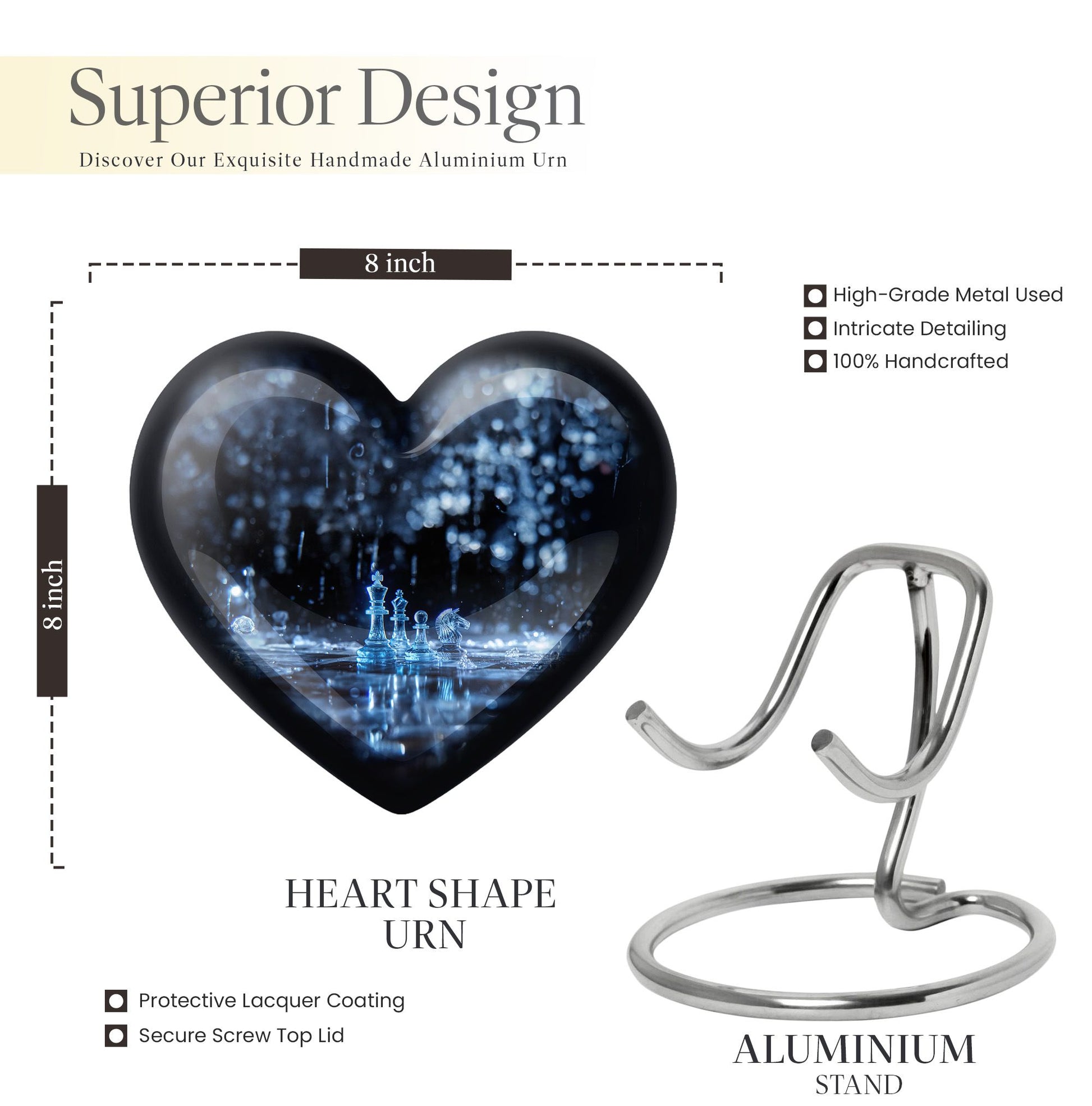 Experience a unique blend of sorrowful remembrance and fond memories with this exquisite Chess Urn. Crafted from resilient aluminium, this cremation urn weighs a solid 3.3 pounds and stands regally at 10 inches, echoing the dignified presence of your beloved man. Our cremation urns for males are large urns with an impressive capacity of 200 cubic inches, perfect for adult males. This distinct Chess themed Heart Urn is featured in a refined matte finish, encapsulating your cherished moments delicately. The urn's thoughtful packaging includes a velvet pouch, catering to the containment and conservation of ashes. For a truly unique memorial, you can personalize this cremation urn by engraving names, bestowing a touch of individuality to your heartfelt memento. A unique piece from our collection that seamlessly marries functionality and spiritual comfort, ideal for seniors and adults engaging with memorial ceremony supplies. This Chess urn - a reliable choice in funeral ashes urns - celebrates the memory of your loved one in the most dignified way.