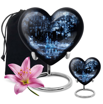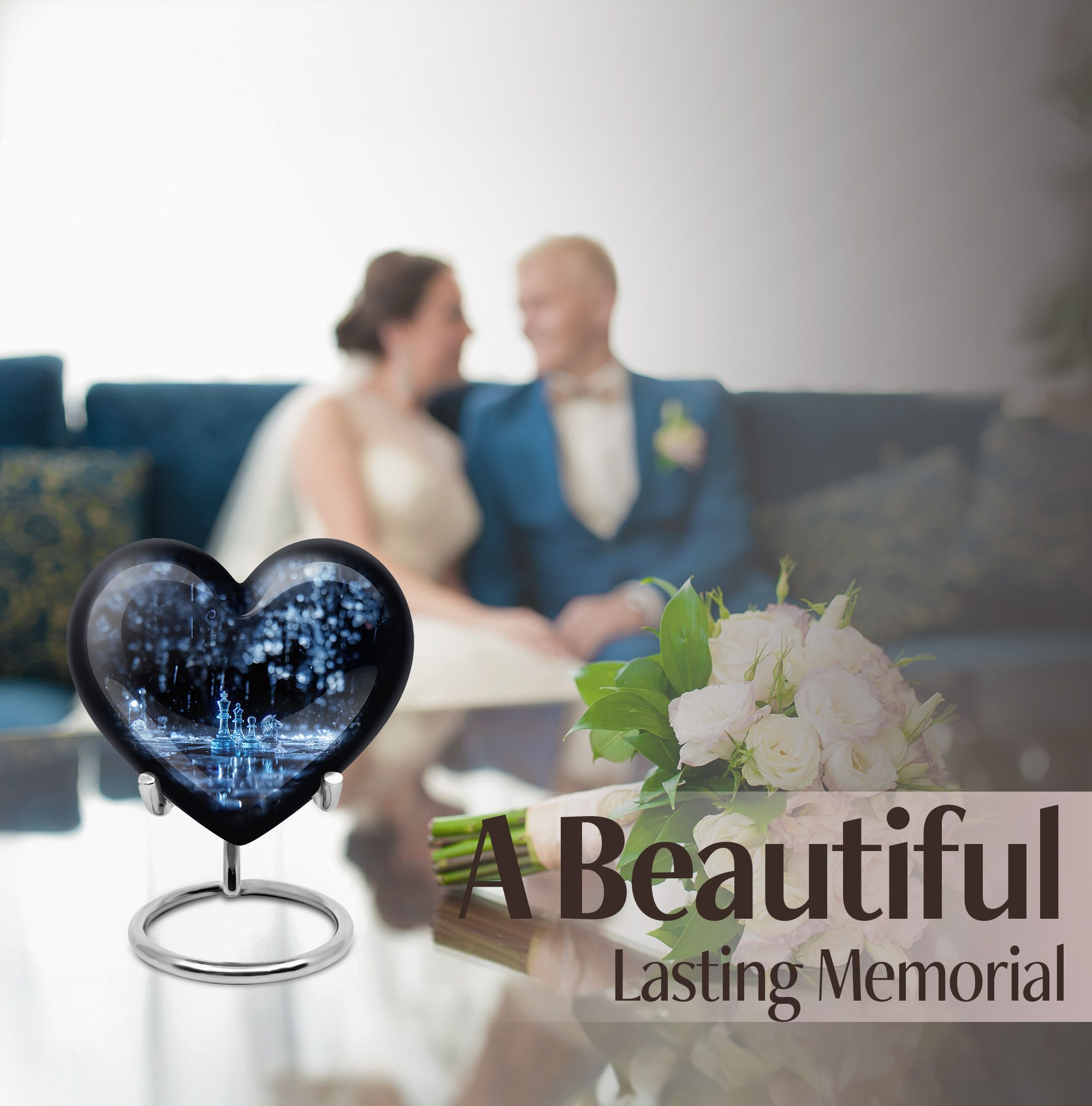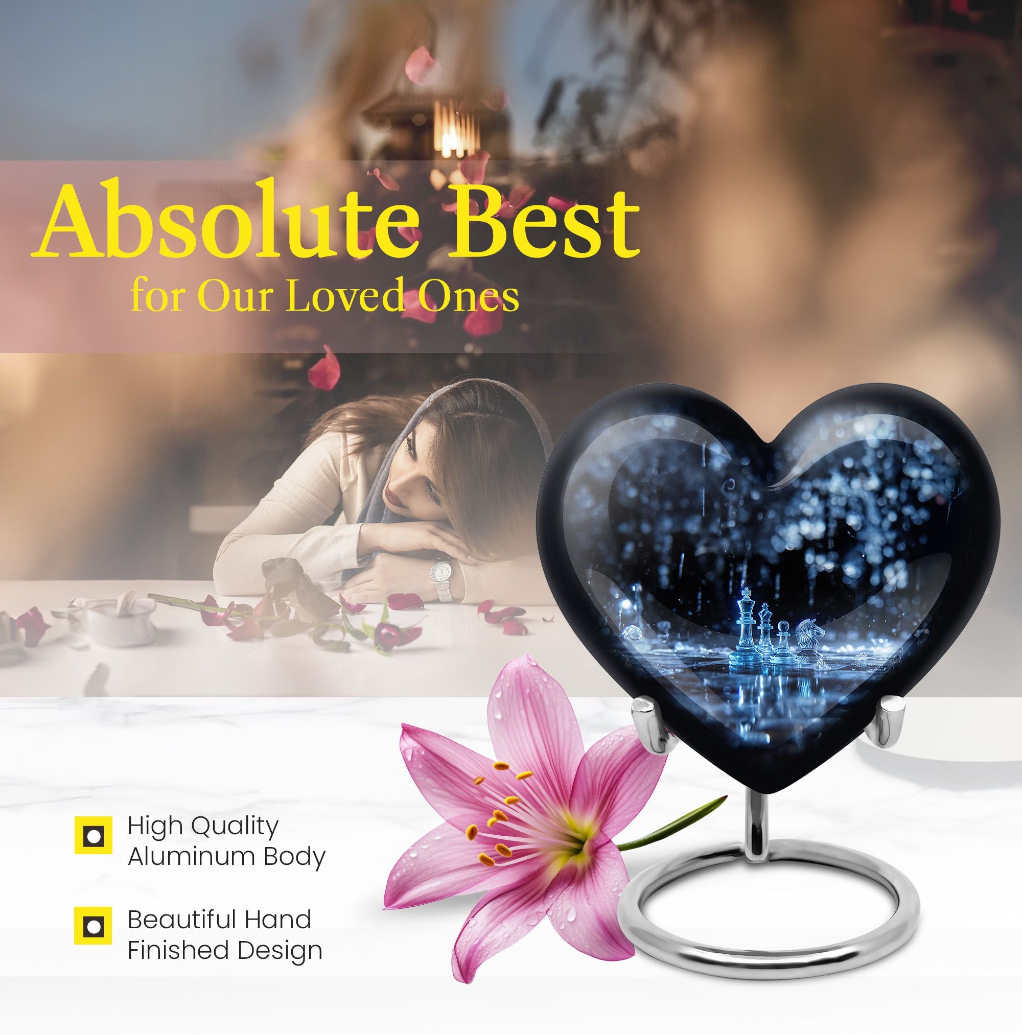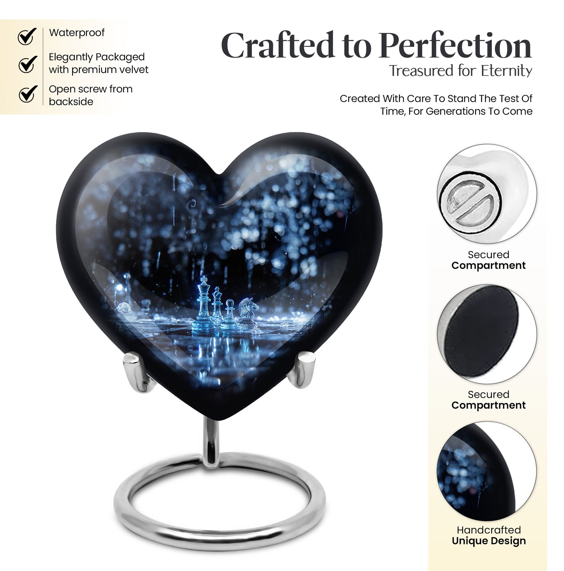 Experience a unique blend of sorrowful remembrance and fond memories with this exquisite Chess Urn. Crafted from resilient aluminium, this cremation urn weighs a solid 3.3 pounds and stands regally at 10 inches, echoing the dignified presence of your beloved man. Our cremation urns for males are large urns with an impressive capacity of 200 cubic inches, perfect for adult males. This distinct Chess themed Heart Urn is featured in a refined matte finish, encapsulating your cherished moments delicately. The urn's thoughtful packaging includes a velvet pouch, catering to the containment and conservation of ashes. For a truly unique memorial, you can personalize this cremation urn by engraving names, bestowing a touch of individuality to your heartfelt memento. A unique piece from our collection that seamlessly marries functionality and spiritual comfort, ideal for seniors and adults engaging with memorial ceremony supplies. This Chess urn - a reliable choice in funeral ashes urns - celebrates the memory of your loved one in the most dignified way.
