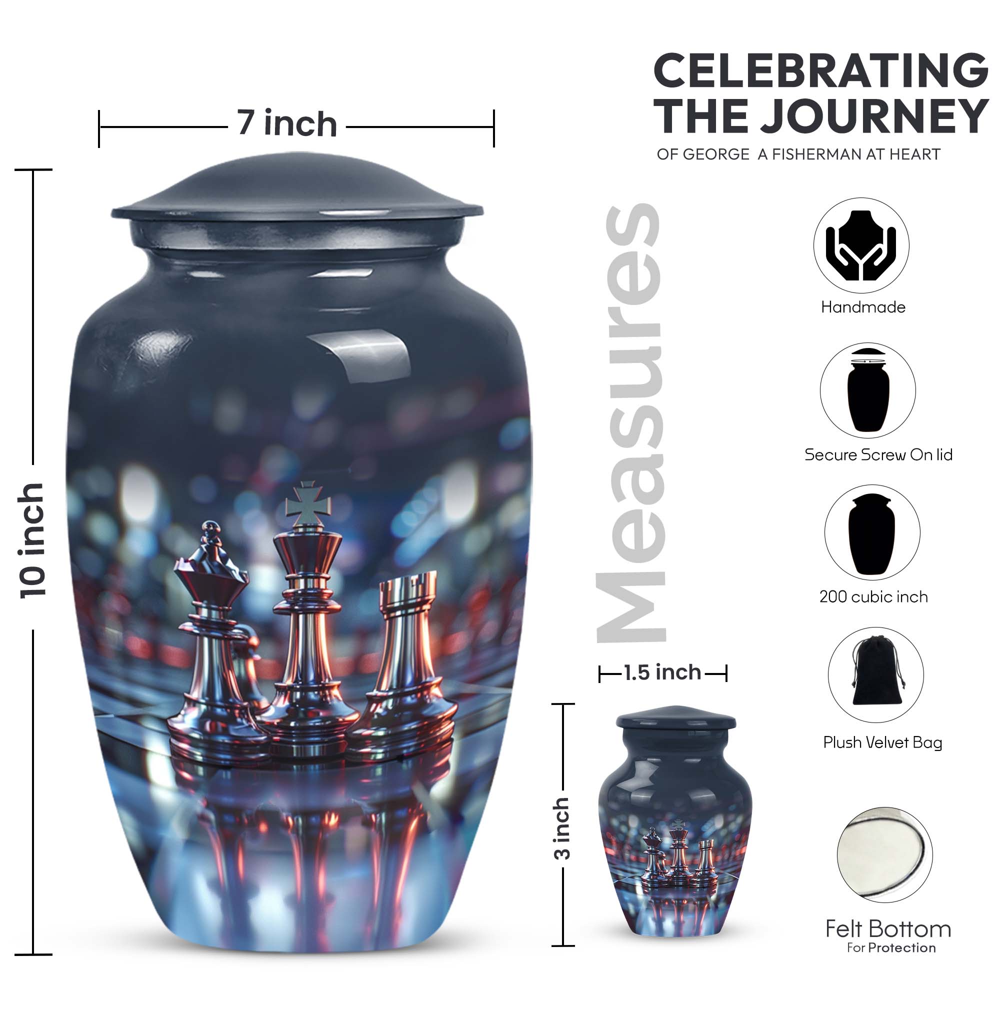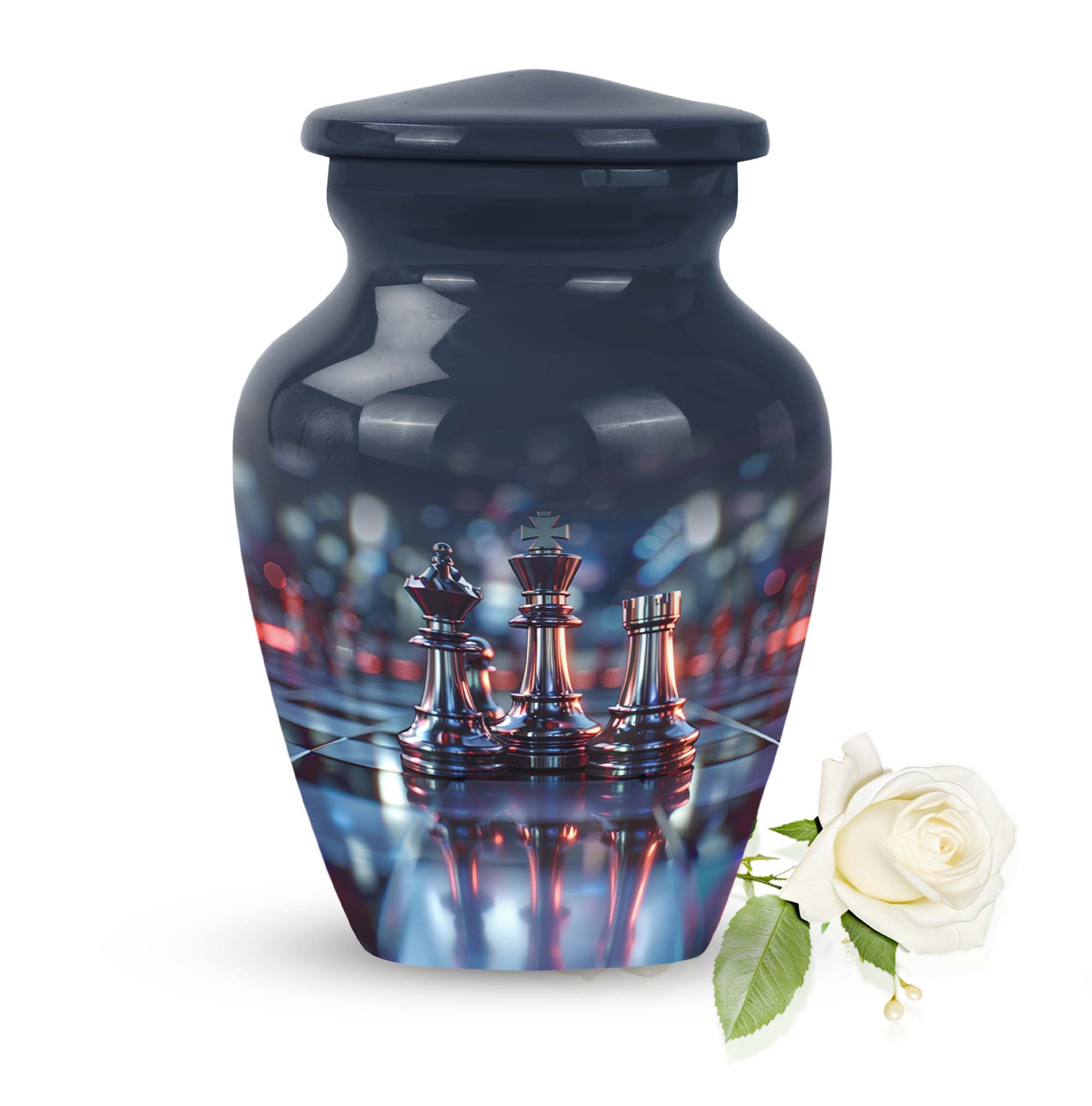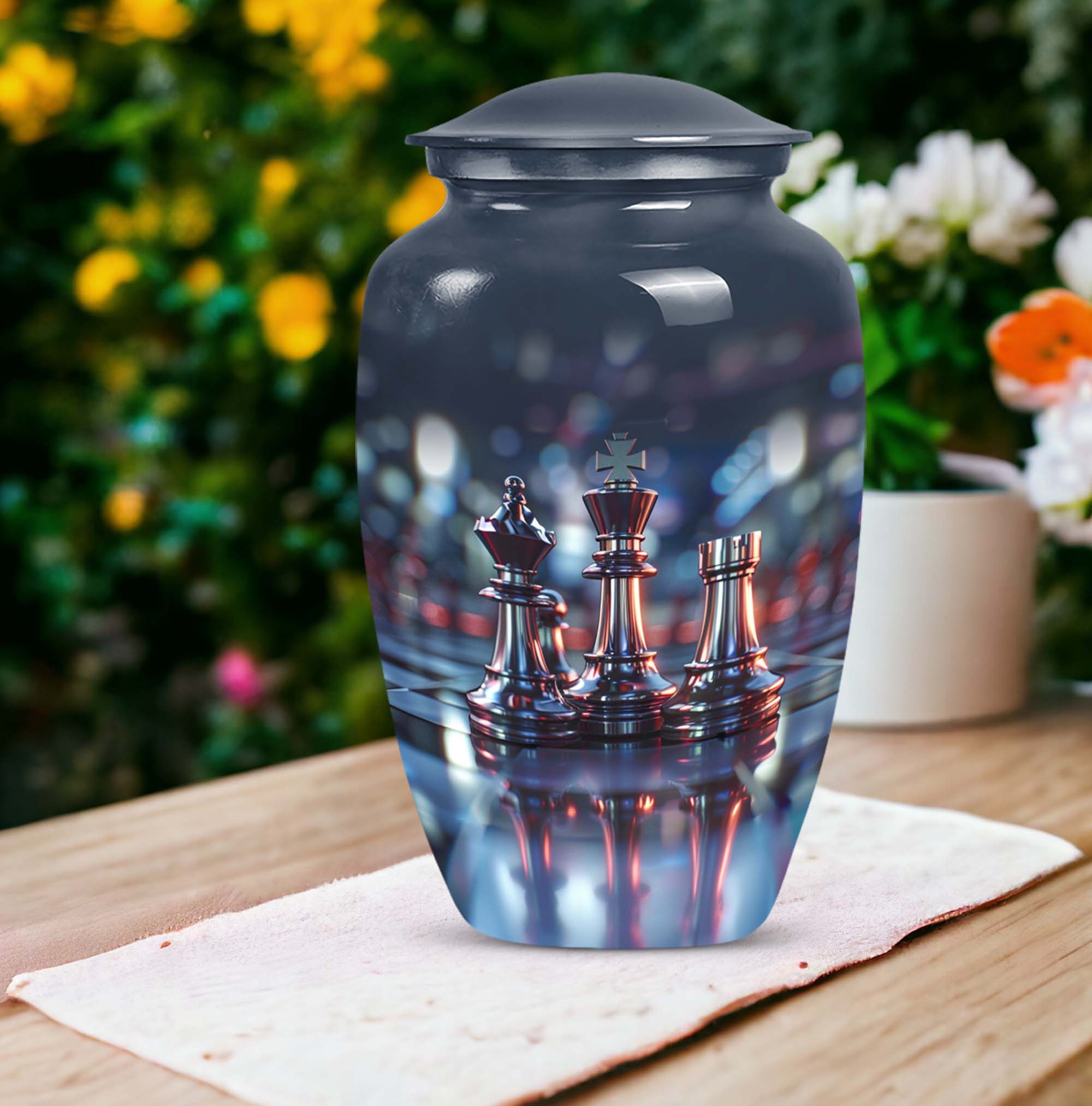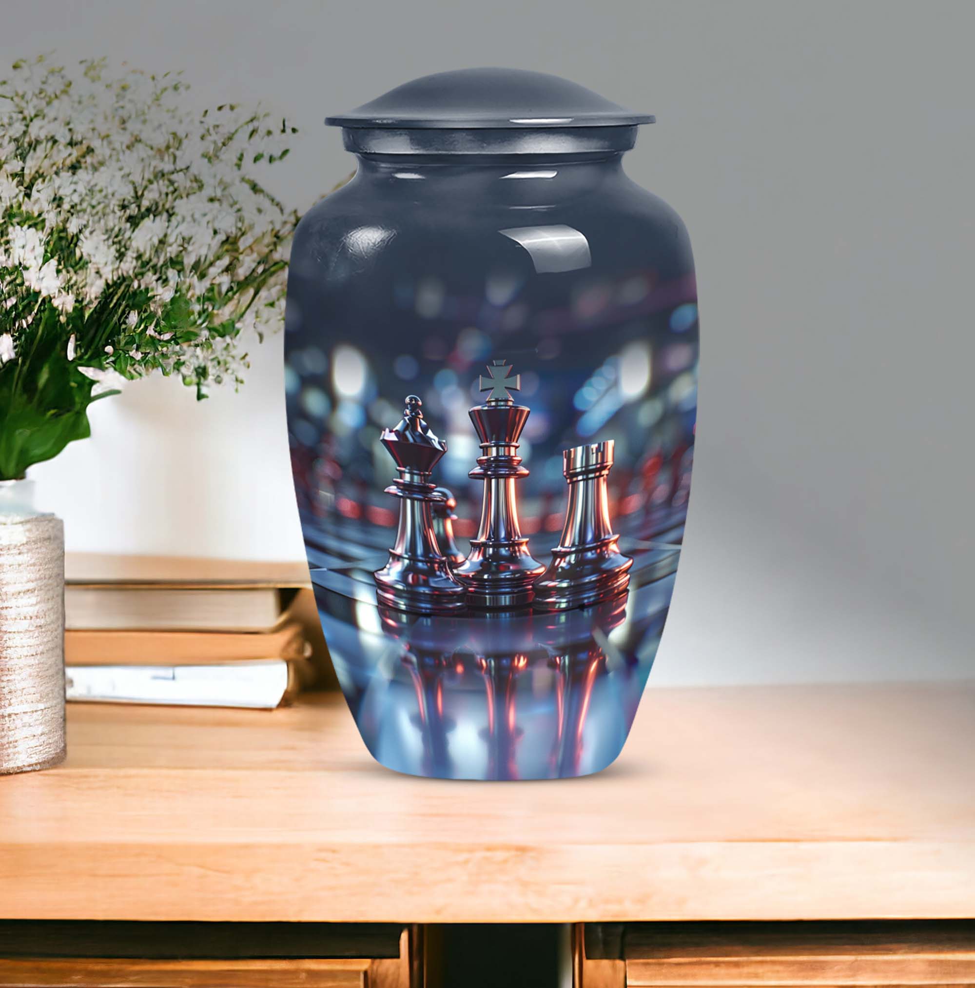 Cherish an irreplaceable memory with our Classic Chess Urn, a distinguished memorial urn for ashes, skillfully crafted from high-quality Aluminium. This large urn measuring a generous 10 inches in height, and weighing 3.3 pounds is perfect for accommodating significant volumes, up to 200 cubic inches. Its sterling design is complemented by an Abstract theme offering an elegant avenue to honour your loved ones. Strategically designed in a universal 10 Inch size, this cremation urn is conveniently portable and fits comfortably in any chosen space. To enhance the product's overall sentiment, opt for our 'Personalize with engraved names' customization feature adding an intimate touch to your memento. The urn comes with a complimentary velvet pouch for suitable containment of the ashes. In your search for 'urns for burial', 'funeral metal urn', 'shaped ashes urn', or 'urns metal', select our Classic Chess Urn as an emblem of unique remembrance.