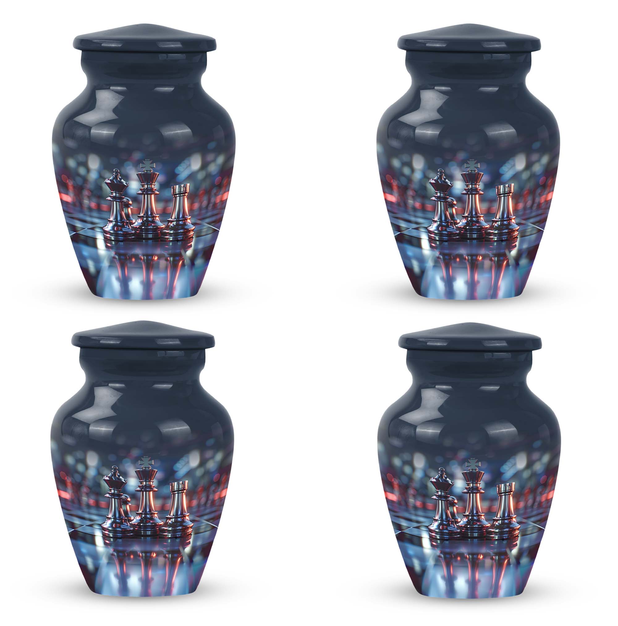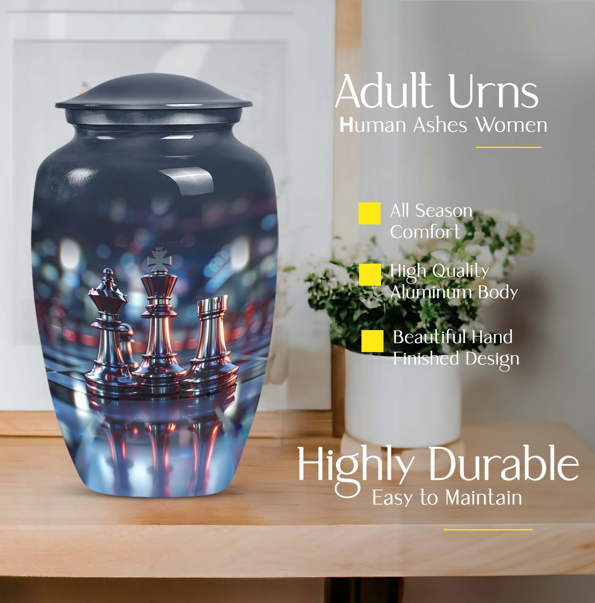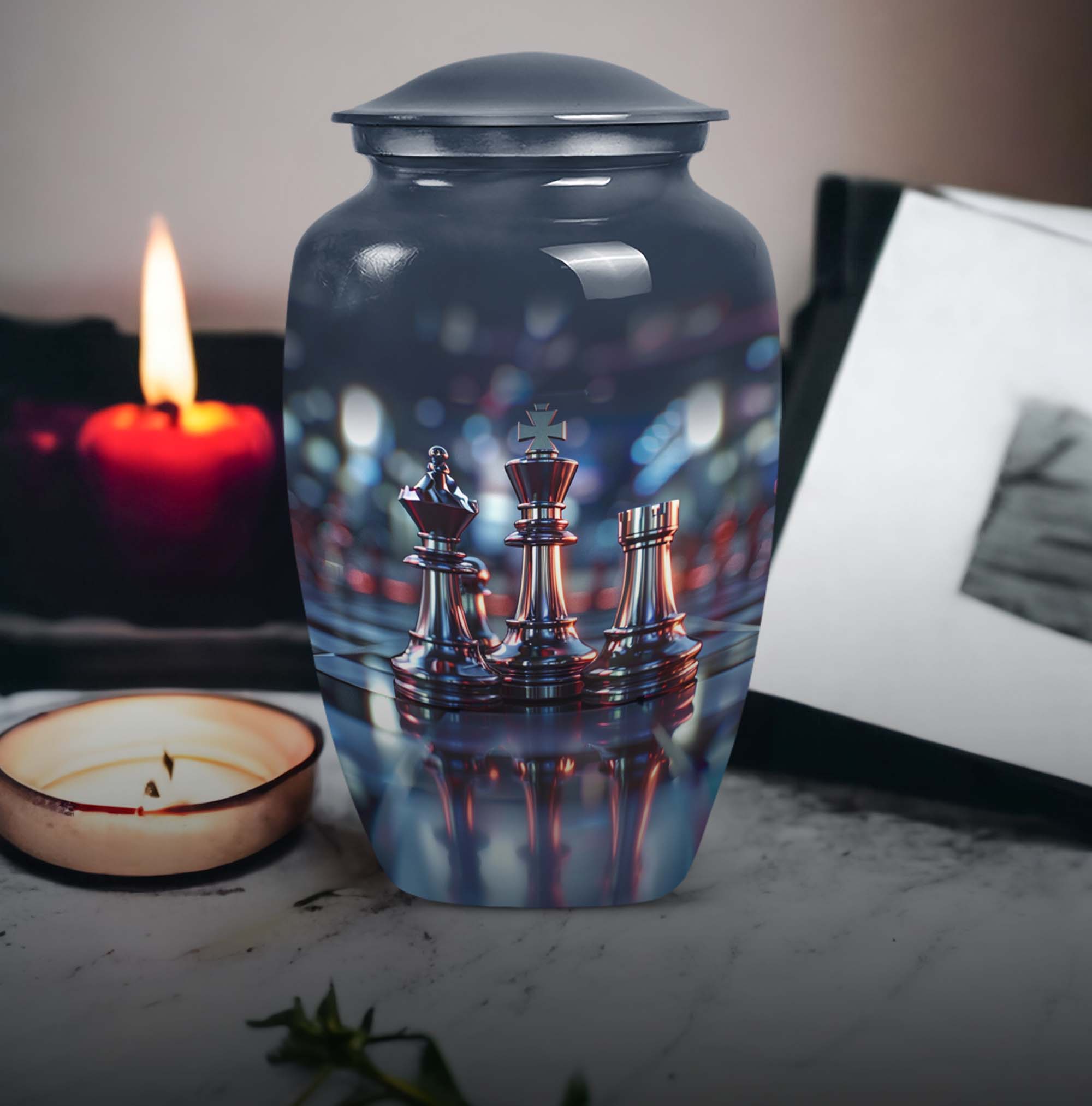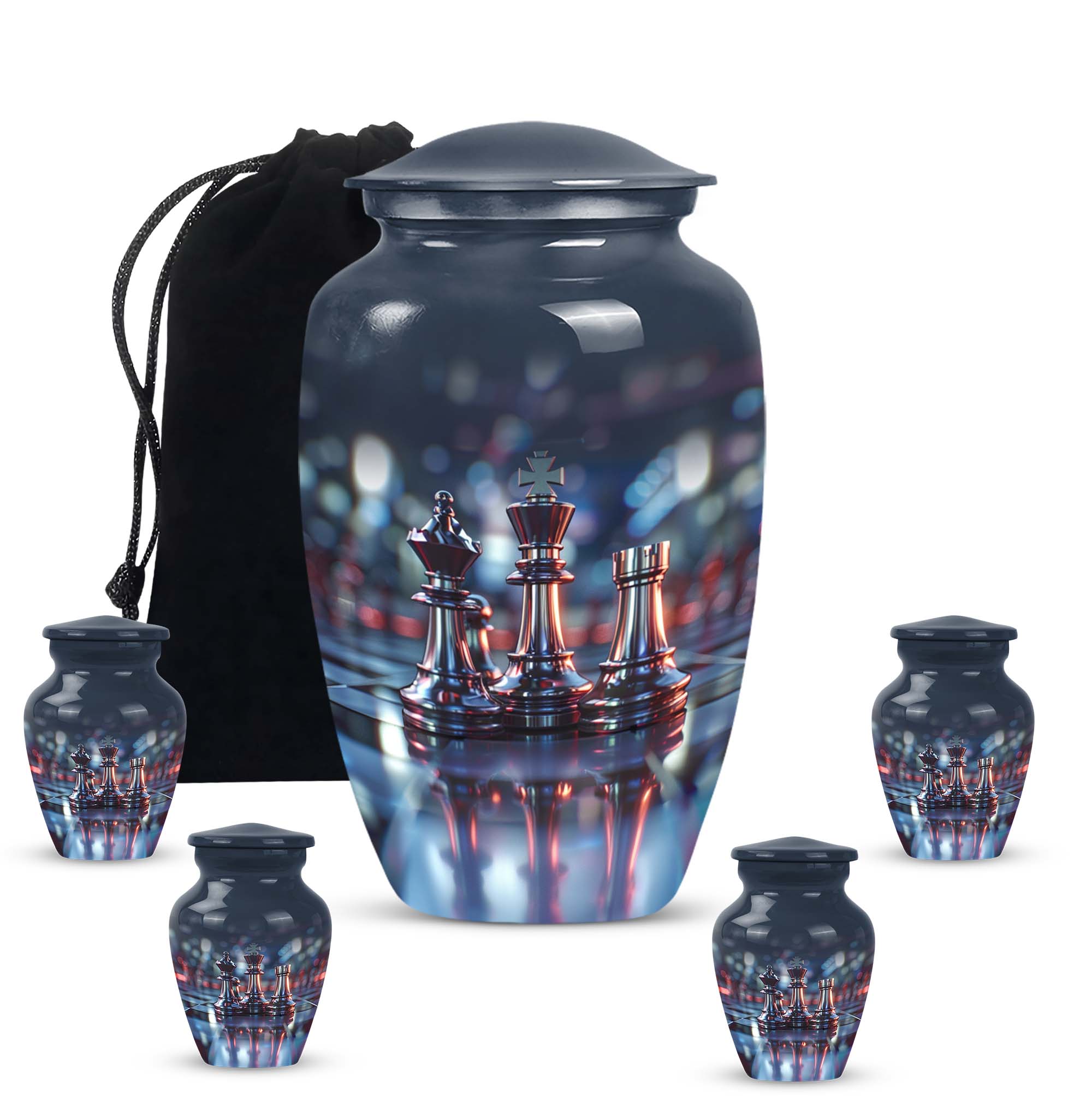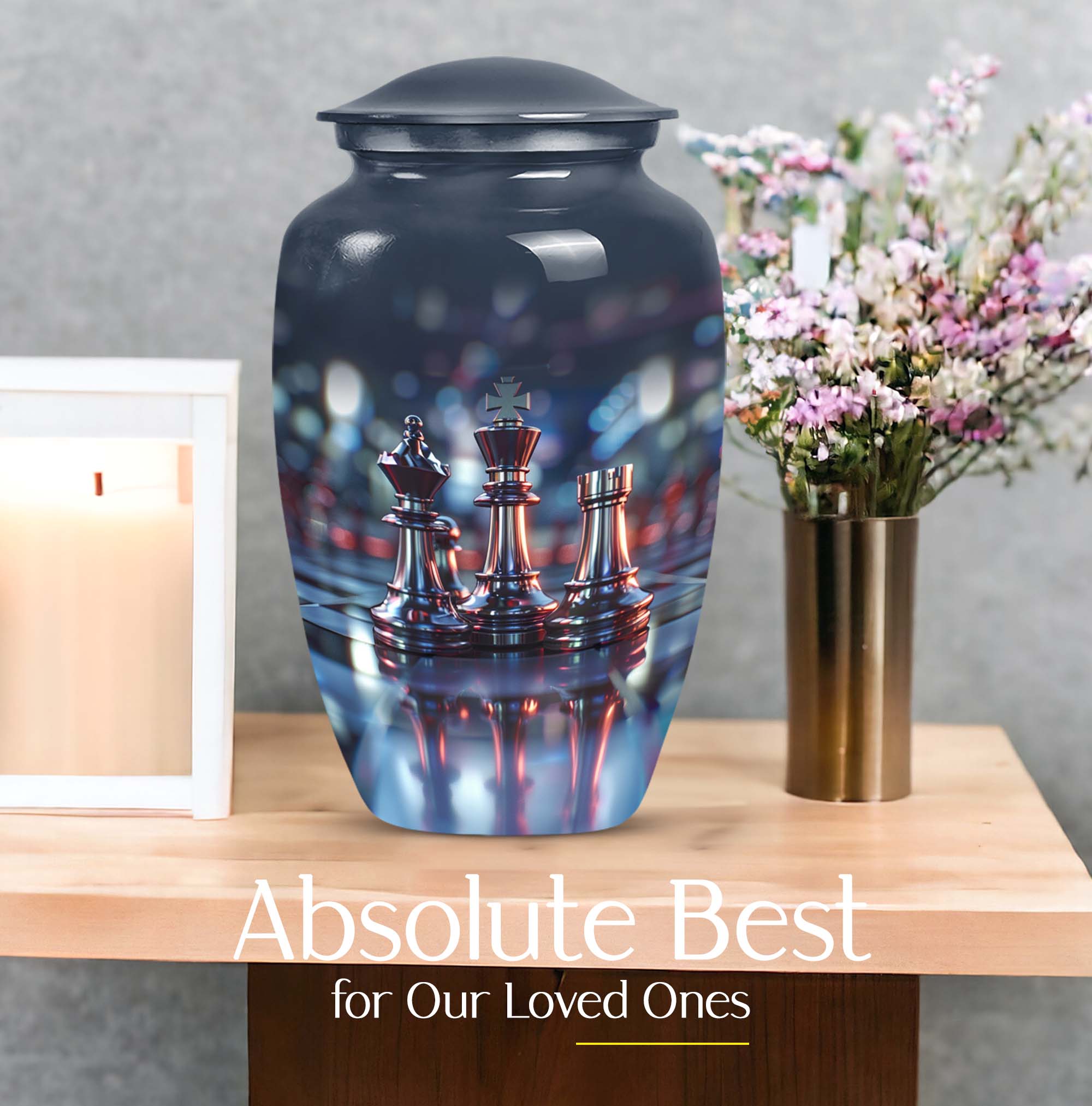 Cherish an irreplaceable memory with our Classic Chess Urn, a distinguished memorial urn for ashes, skillfully crafted from high-quality Aluminium. This large urn measuring a generous 10 inches in height, and weighing 3.3 pounds is perfect for accommodating significant volumes, up to 200 cubic inches. Its sterling design is complemented by an Abstract theme offering an elegant avenue to honour your loved ones. Strategically designed in a universal 10 Inch size, this cremation urn is conveniently portable and fits comfortably in any chosen space. To enhance the product's overall sentiment, opt for our 'Personalize with engraved names' customization feature adding an intimate touch to your memento. The urn comes with a complimentary velvet pouch for suitable containment of the ashes. In your search for 'urns for burial', 'funeral metal urn', 'shaped ashes urn', or 'urns metal', select our Classic Chess Urn as an emblem of unique remembrance.