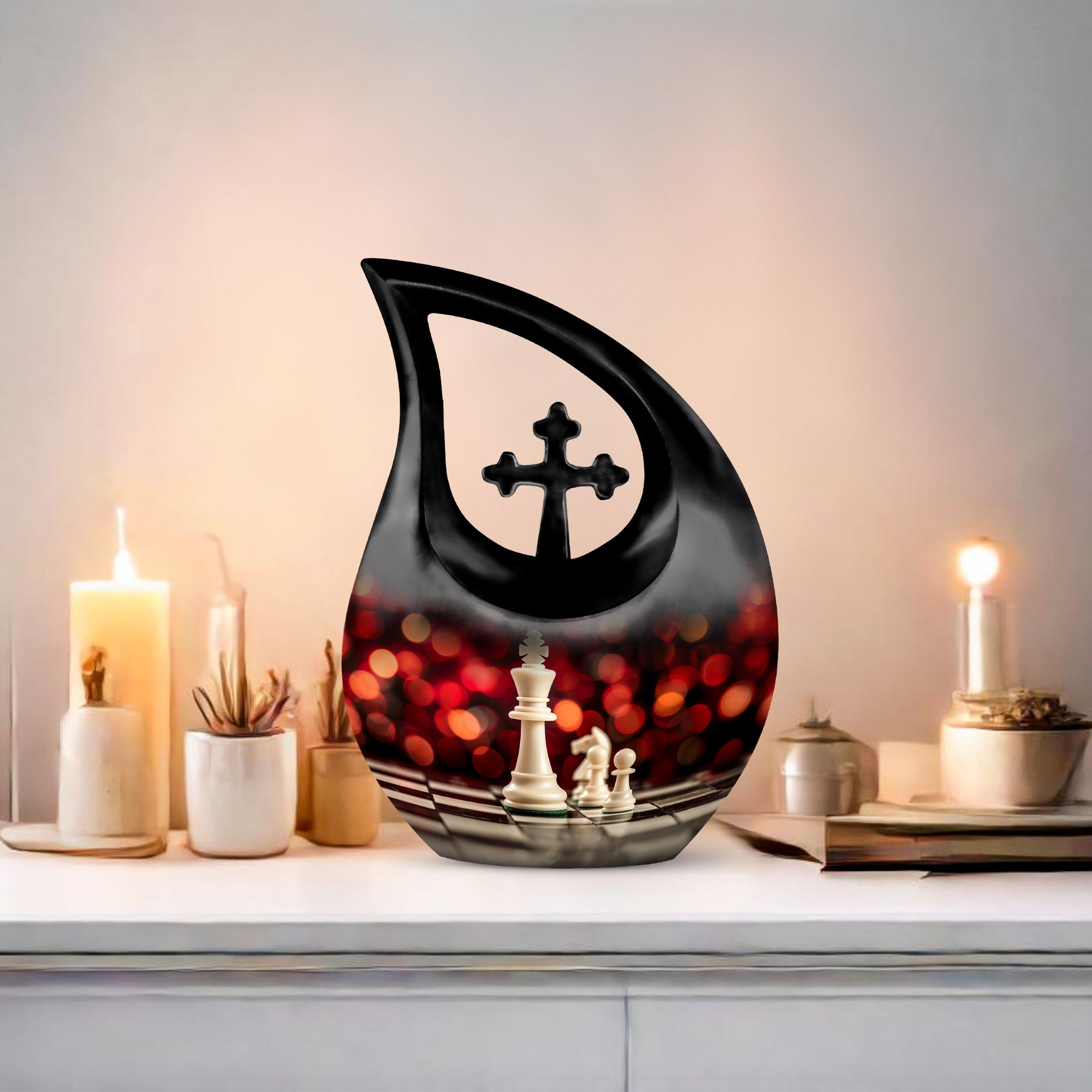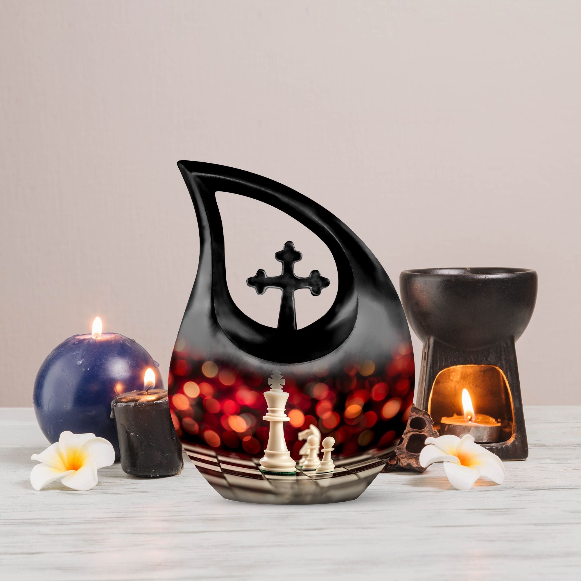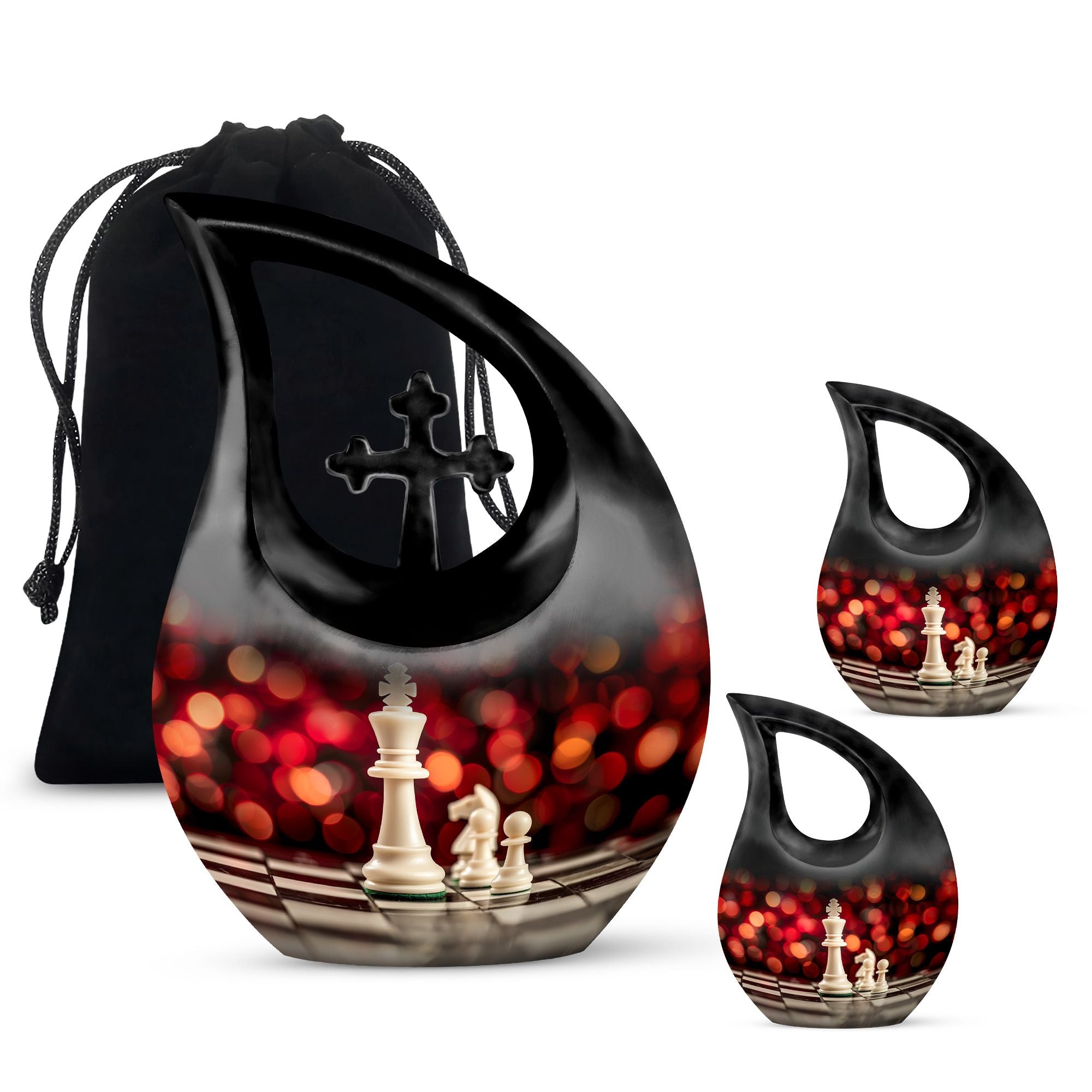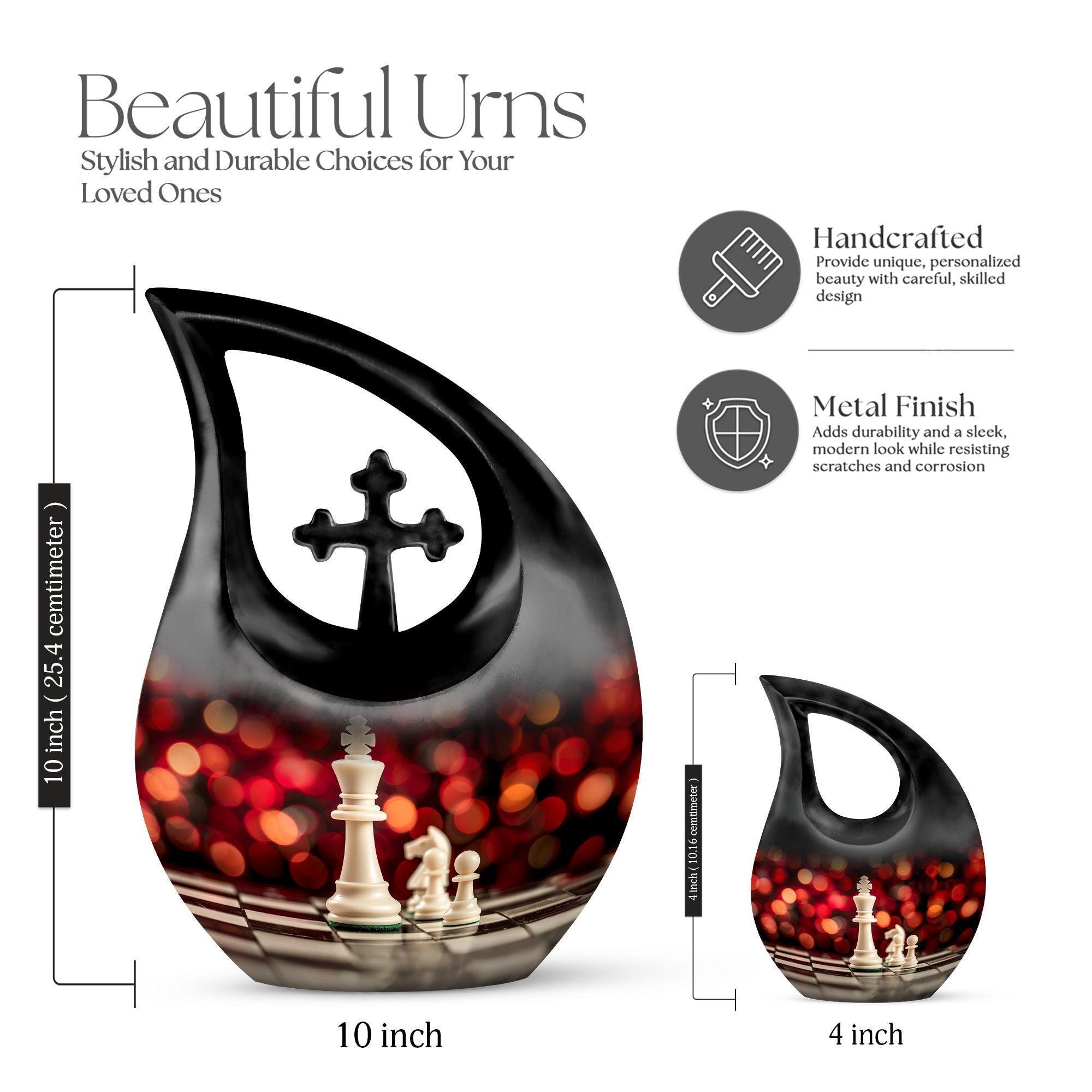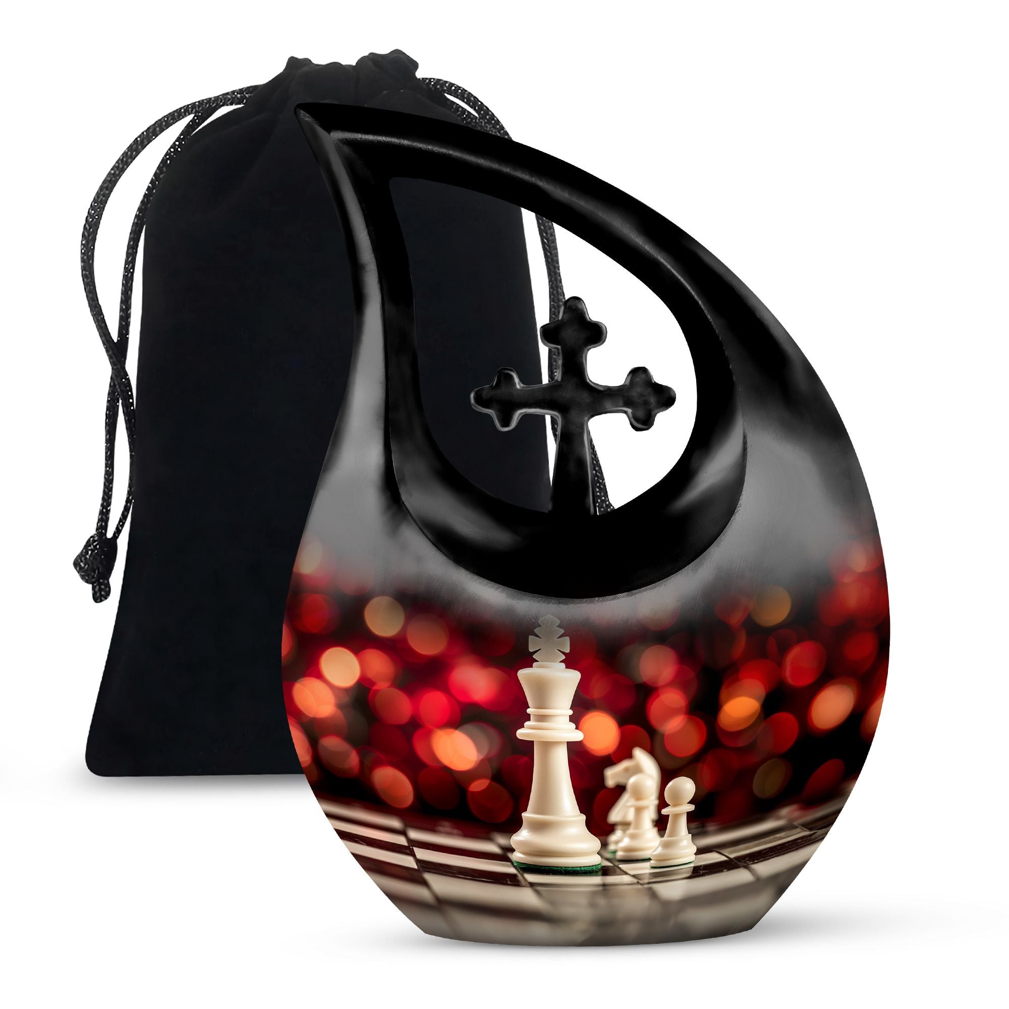 Honor the memory of your departed loved one with this 10-inch Chess Urn called 'Cross Drop'. This oversized urn, a part of our Double Cremation Urns collection, represents a touching symbol of everlasting love and remembrance. Crafted from resilient aluminium, it weighs 3.3 pounds and stands 10 inches tall. With a capacity of 200 cubic inches, it can contain ashes safely and respectfully. The urn comes with a velvet pouch, making it ideal for both preservation and display. What sets this urn apart is the option for personalization - you can engrave names to make it even more special and personal. As concrete as your love, and as timeless as your memories, this Chess Urn will serve as a moving remembrance. Besides, it is a fitting addition to your memorial ceremony supplies.
