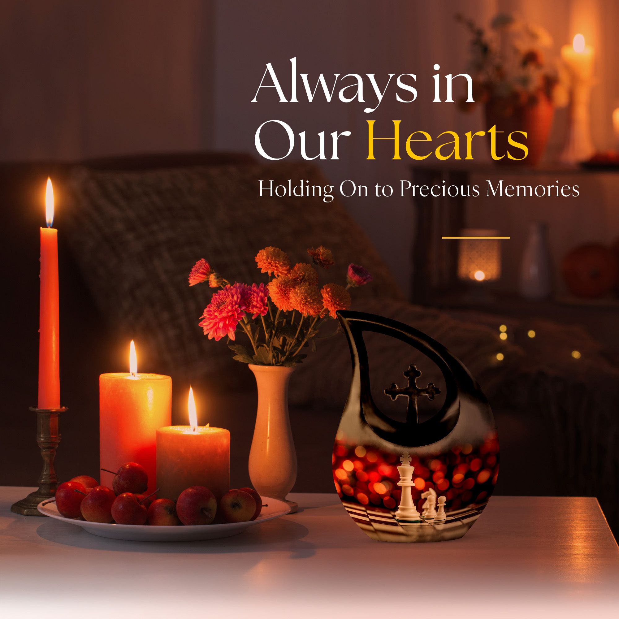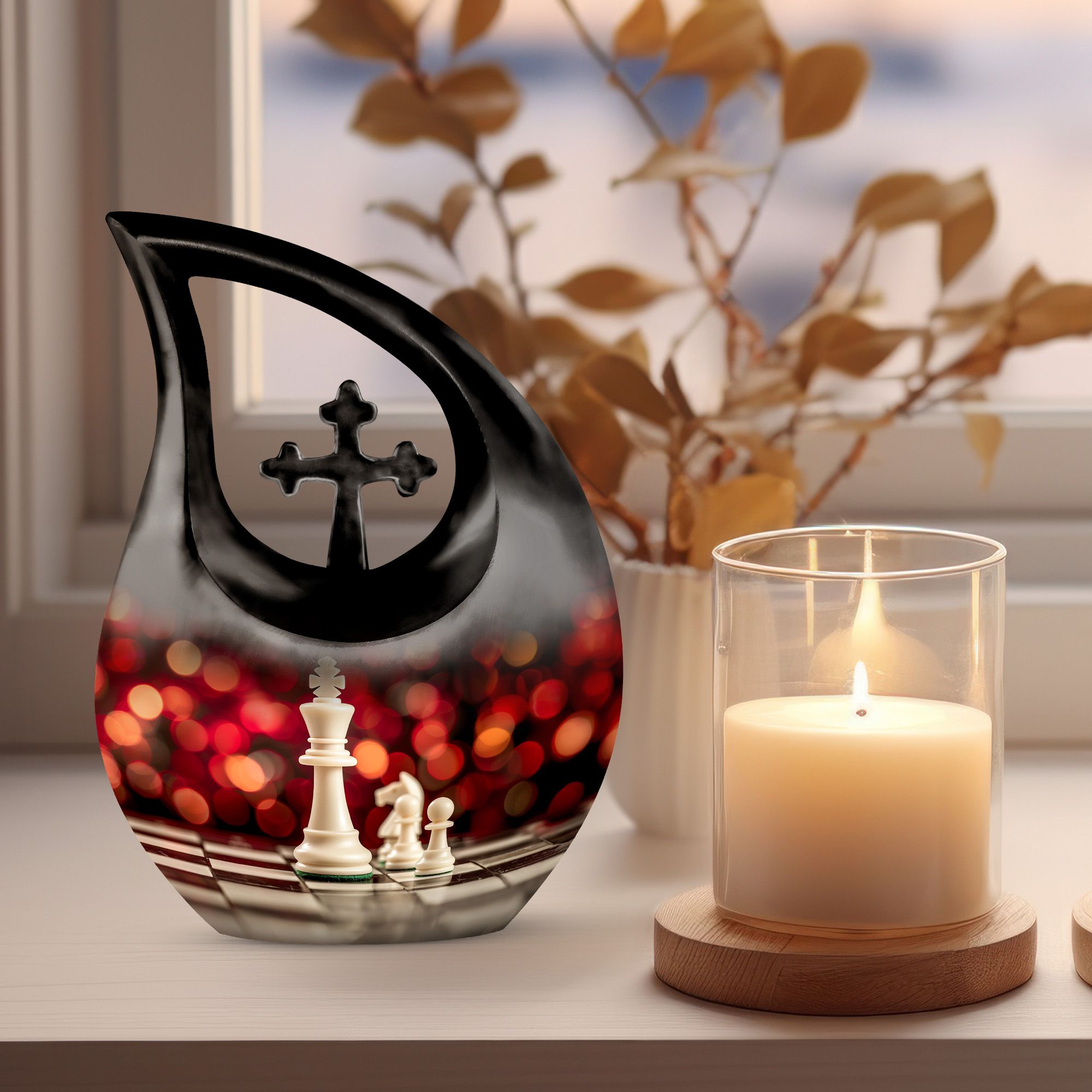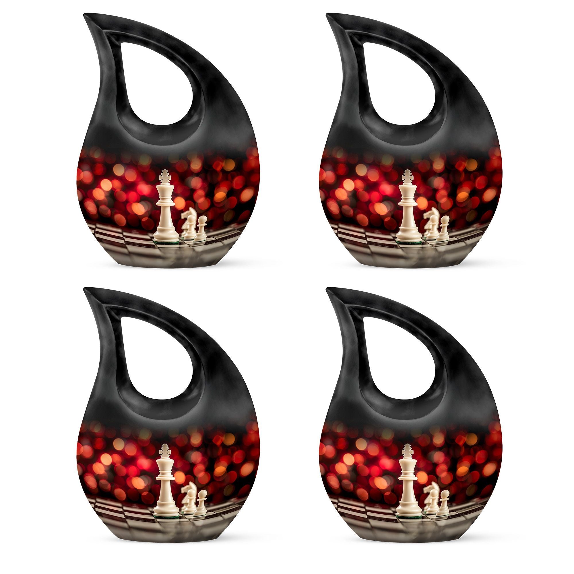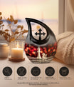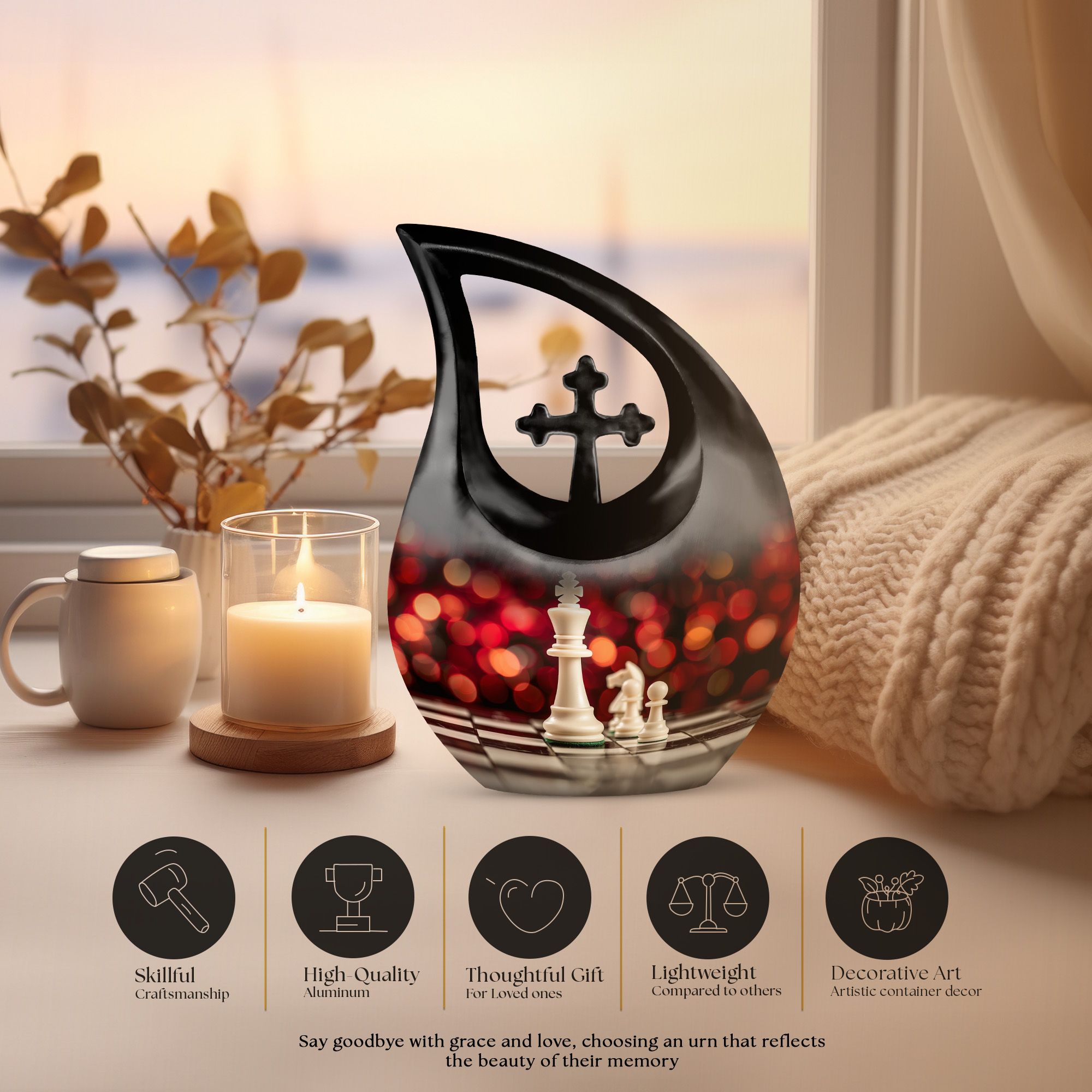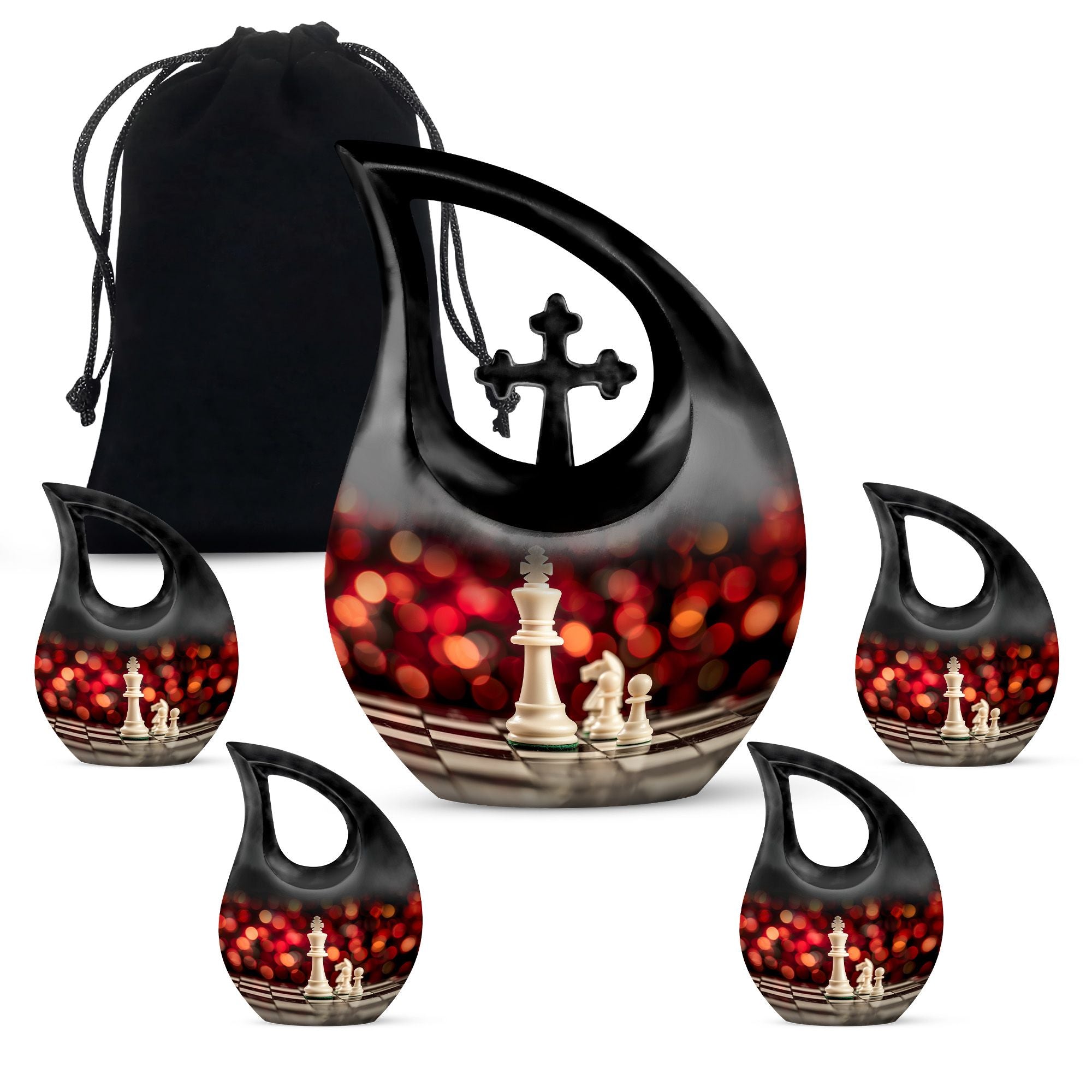 Honor the memory of your departed loved one with this 10-inch Chess Urn called 'Cross Drop'. This oversized urn, a part of our Double Cremation Urns collection, represents a touching symbol of everlasting love and remembrance. Crafted from resilient aluminium, it weighs 3.3 pounds and stands 10 inches tall. With a capacity of 200 cubic inches, it can contain ashes safely and respectfully. The urn comes with a velvet pouch, making it ideal for both preservation and display. What sets this urn apart is the option for personalization - you can engrave names to make it even more special and personal. As concrete as your love, and as timeless as your memories, this Chess Urn will serve as a moving remembrance. Besides, it is a fitting addition to your memorial ceremony supplies.